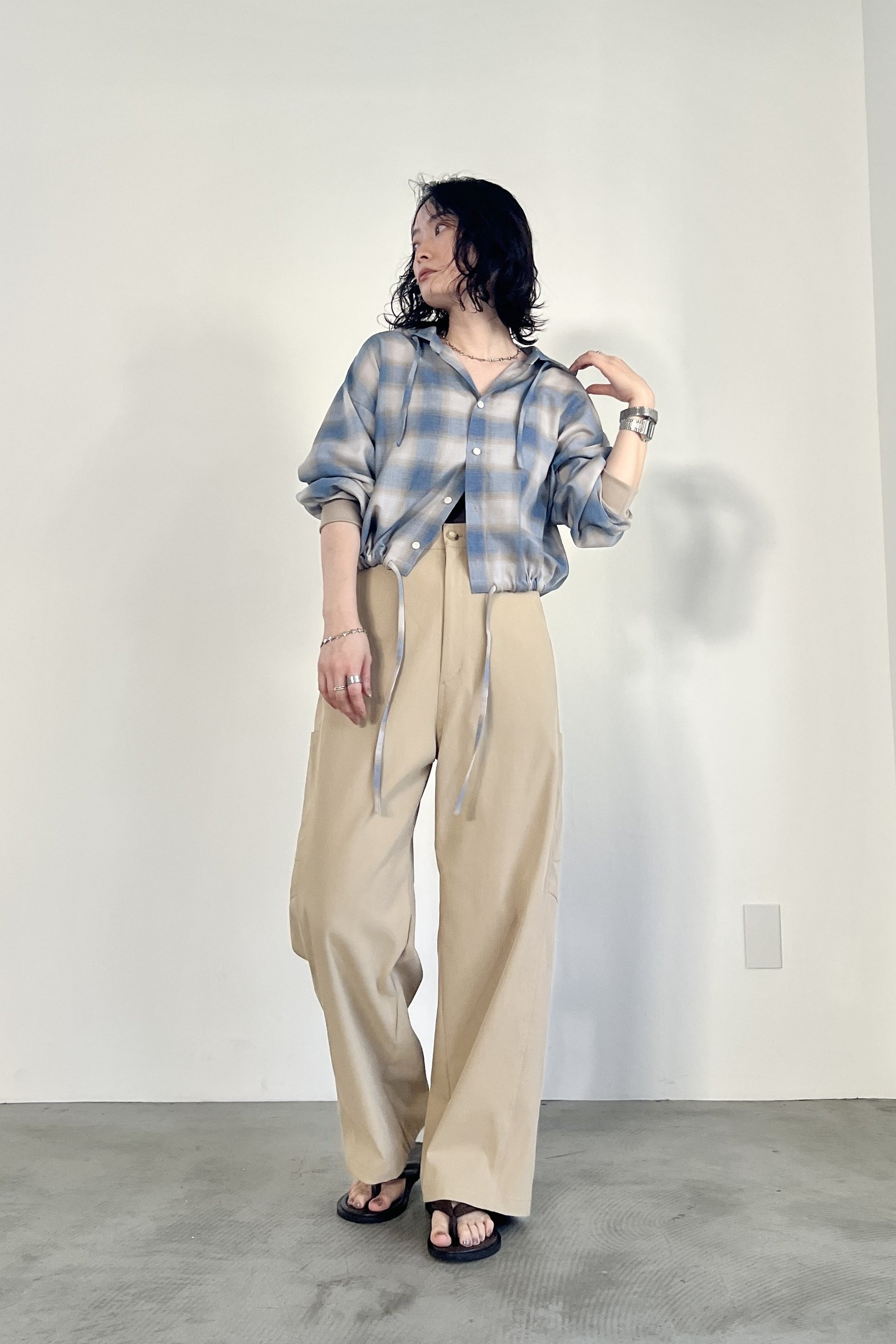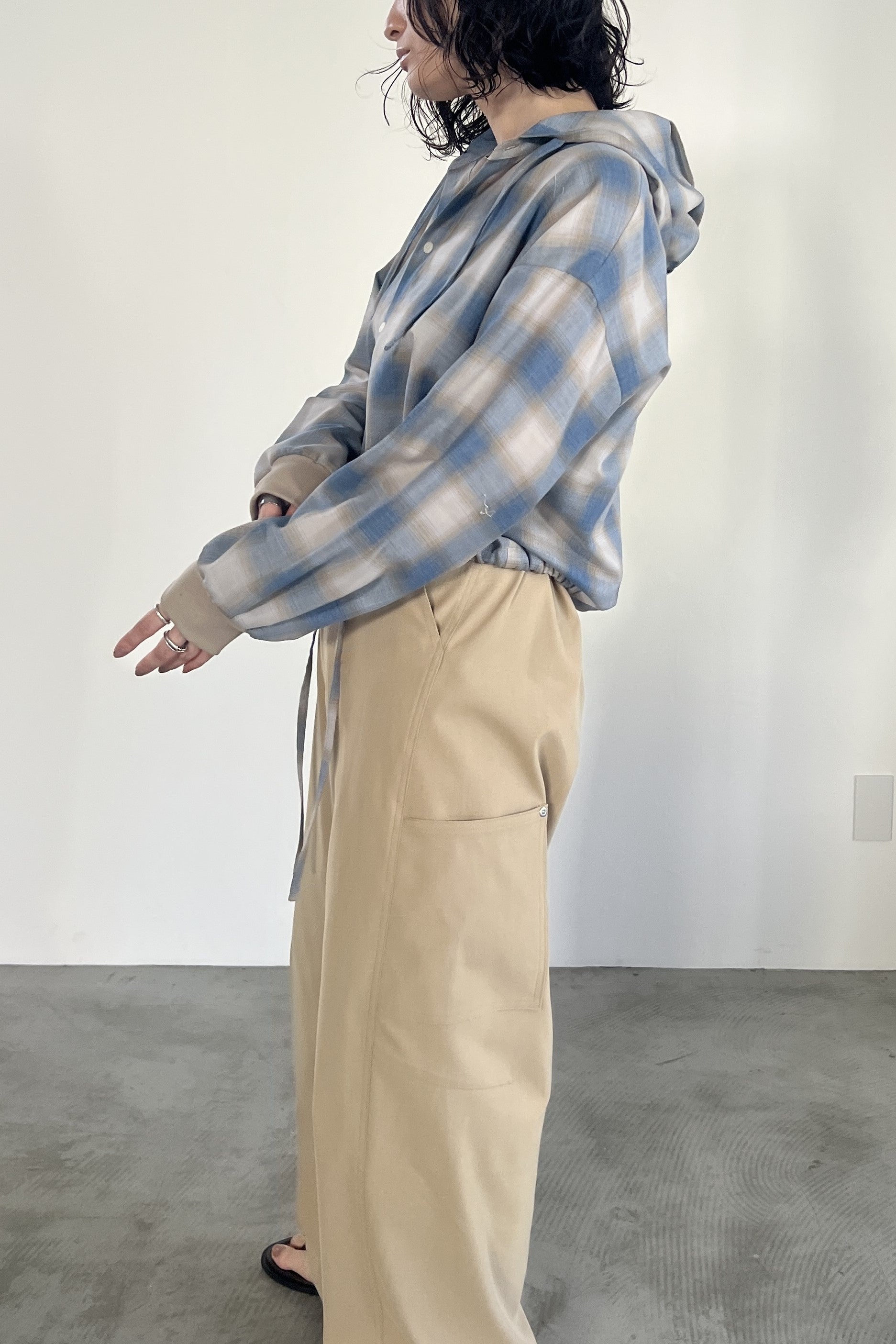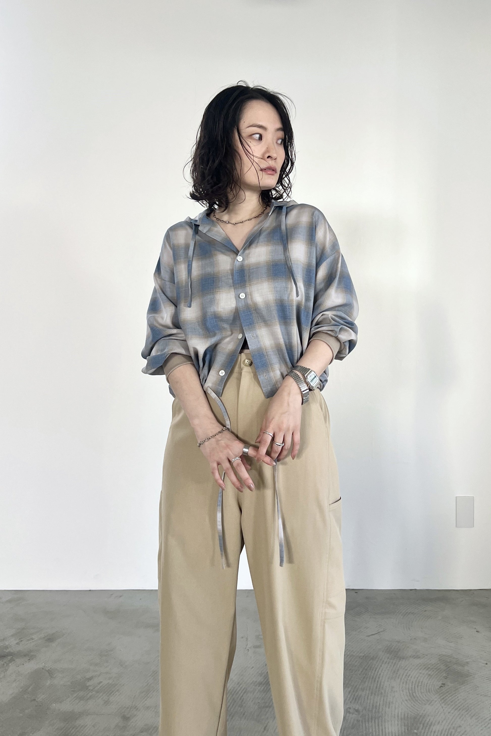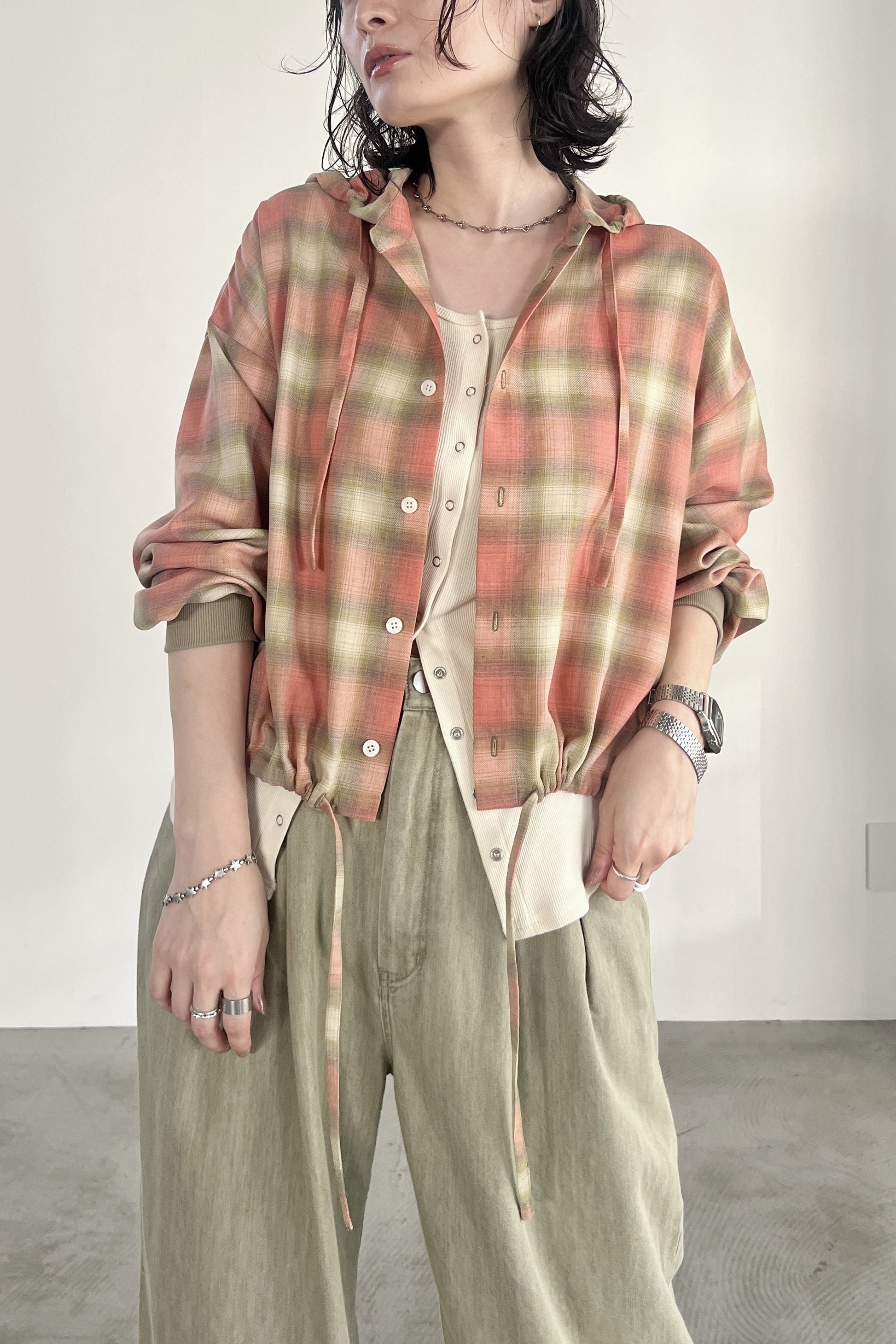 ドライタッチのオンブレーチェックを使用したフードシャツ。ポリエステル混の素材なので、綿100%の素材と比べてシワになりにくく、清涼感があります。トレンドのボリュームボトムとの相性が良いショート丈にし、袖口はたくし上げやすいリブ仕様でカジュアルに仕上げました。フードと裾のコーデもアクセントになっています。
