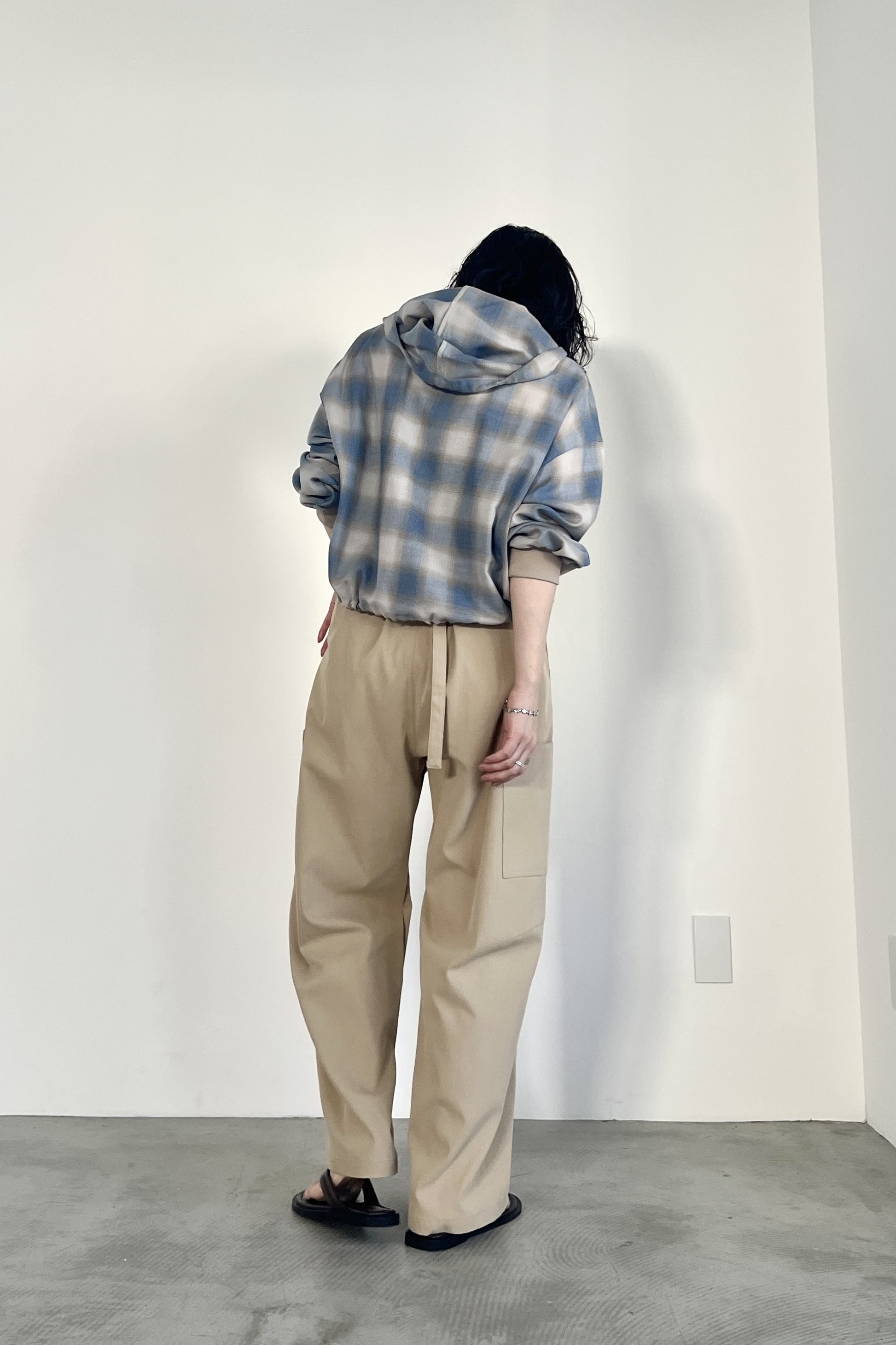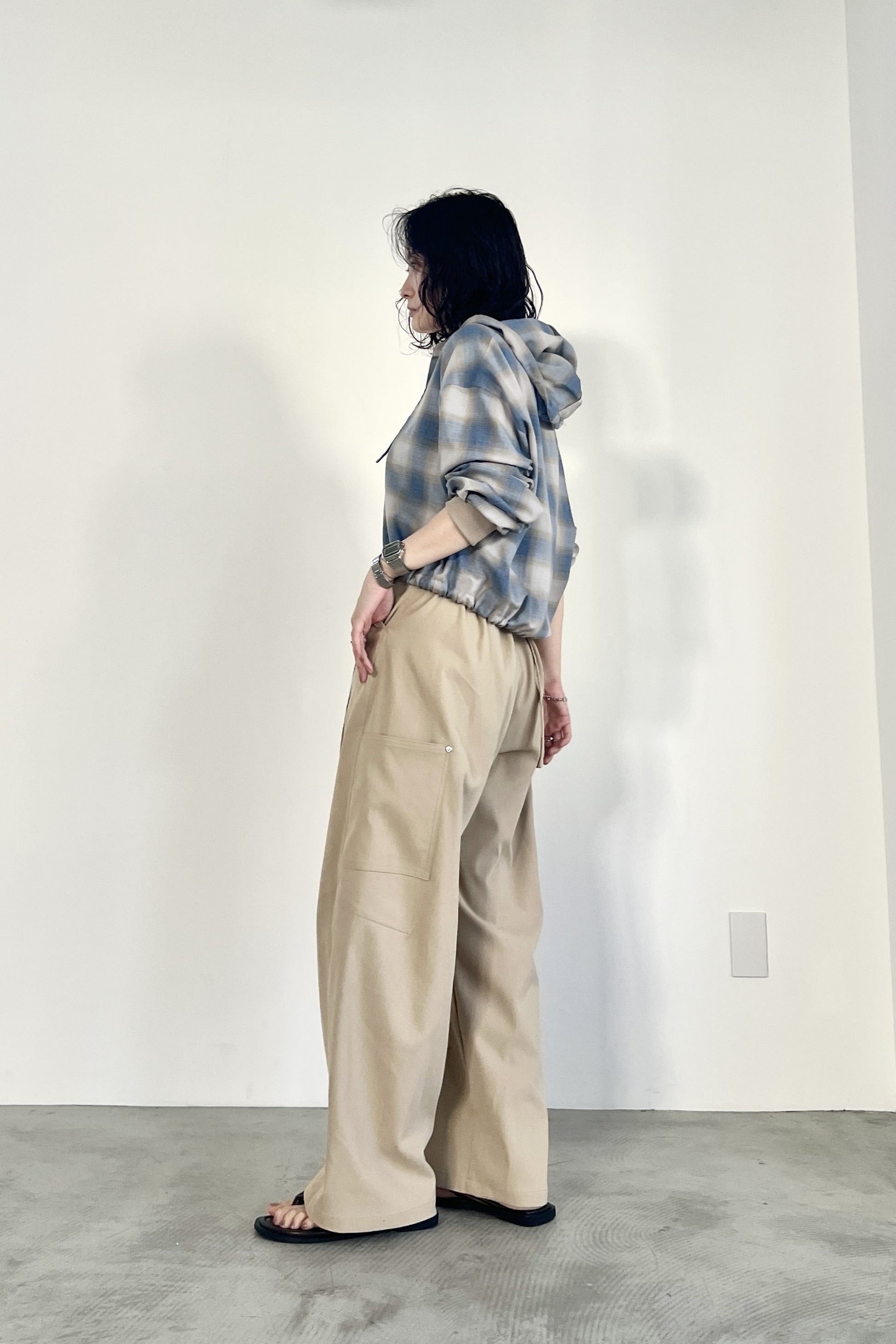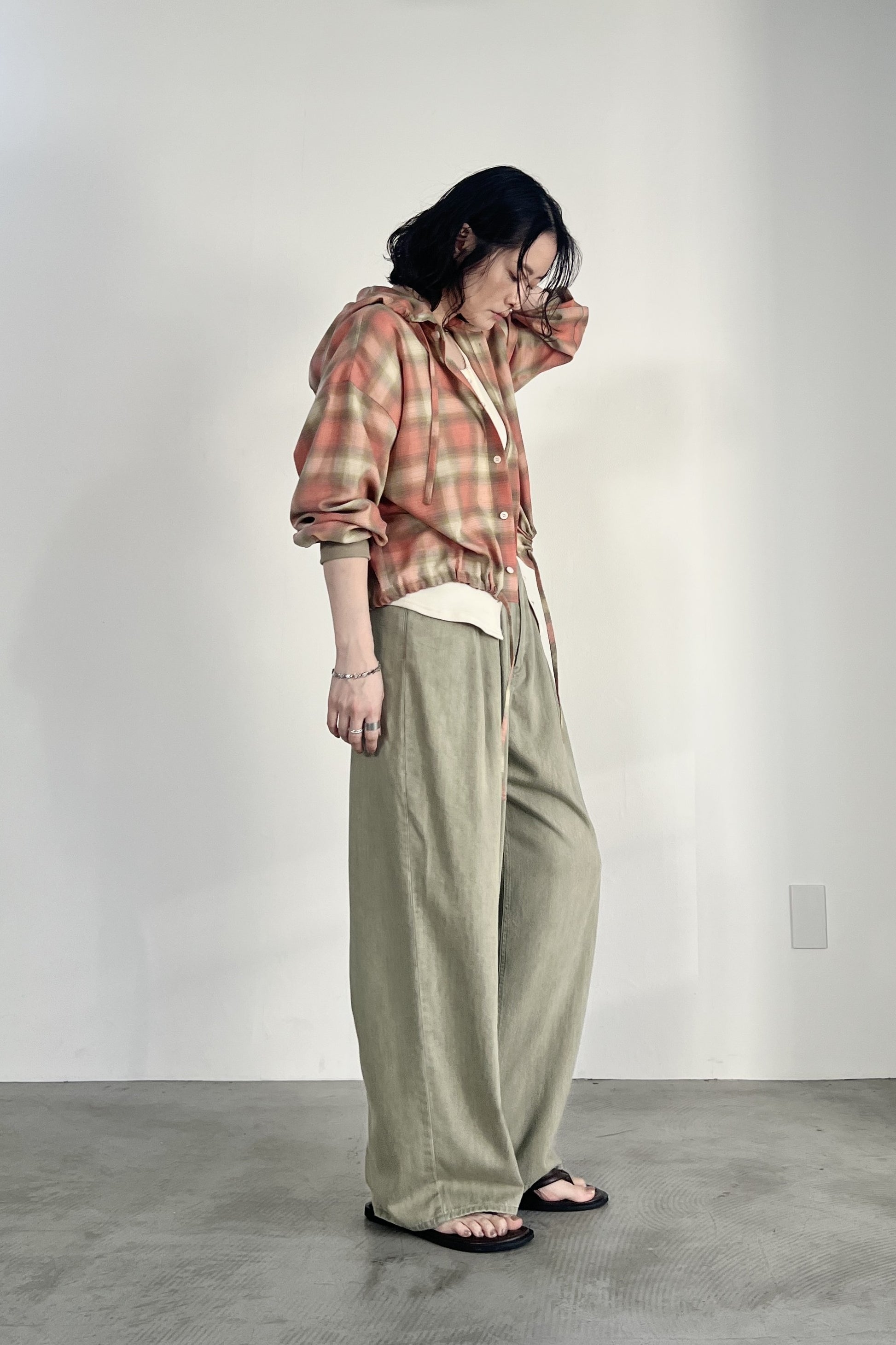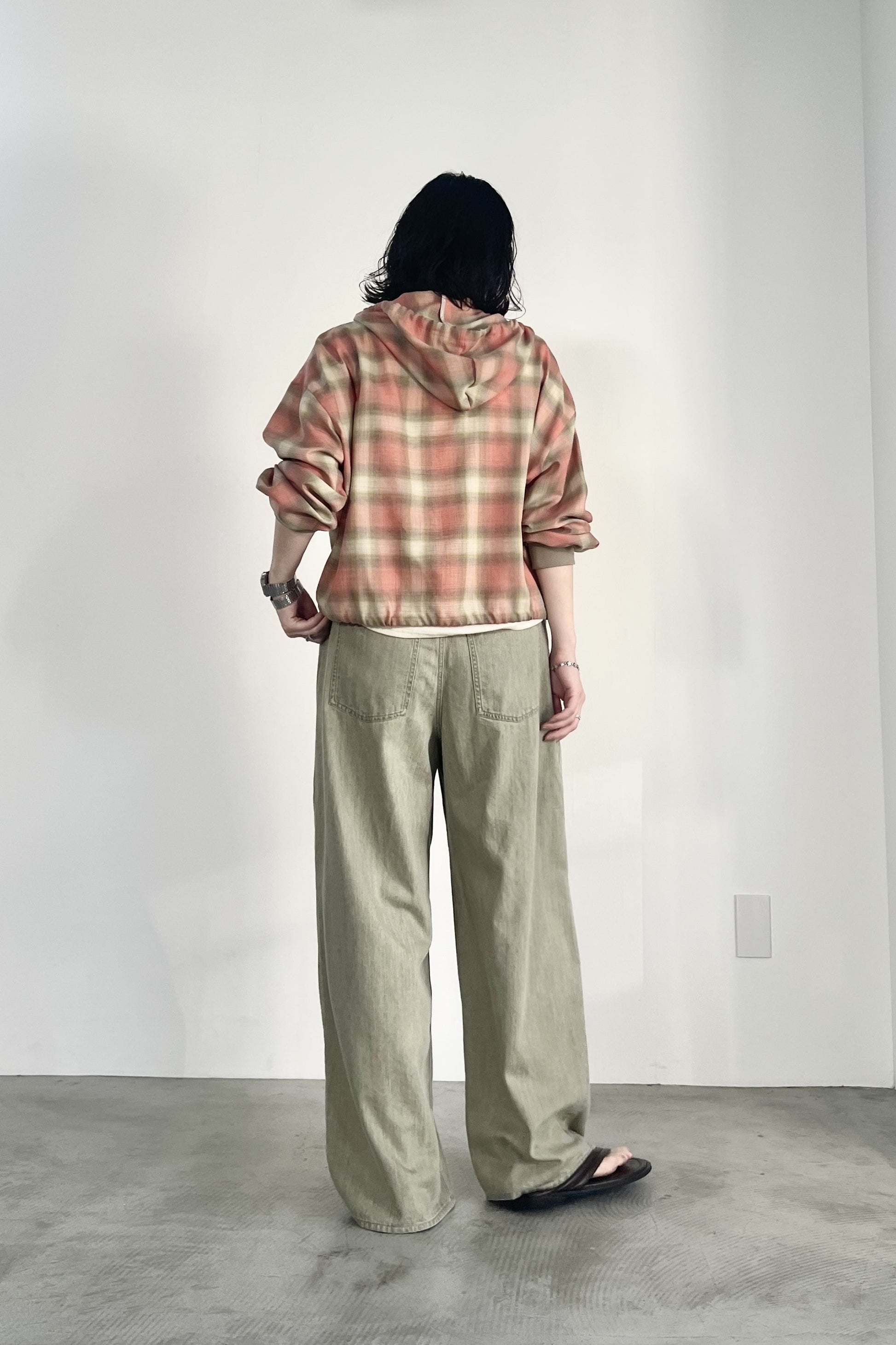 ドライタッチのオンブレーチェックを使用したフードシャツ。ポリエステル混の素材なので、綿100%の素材と比べてシワになりにくく、清涼感があります。トレンドのボリュームボトムとの相性が良いショート丈にし、袖口はたくし上げやすいリブ仕様でカジュアルに仕上げました。フードと裾のコーデもアクセントになっています。