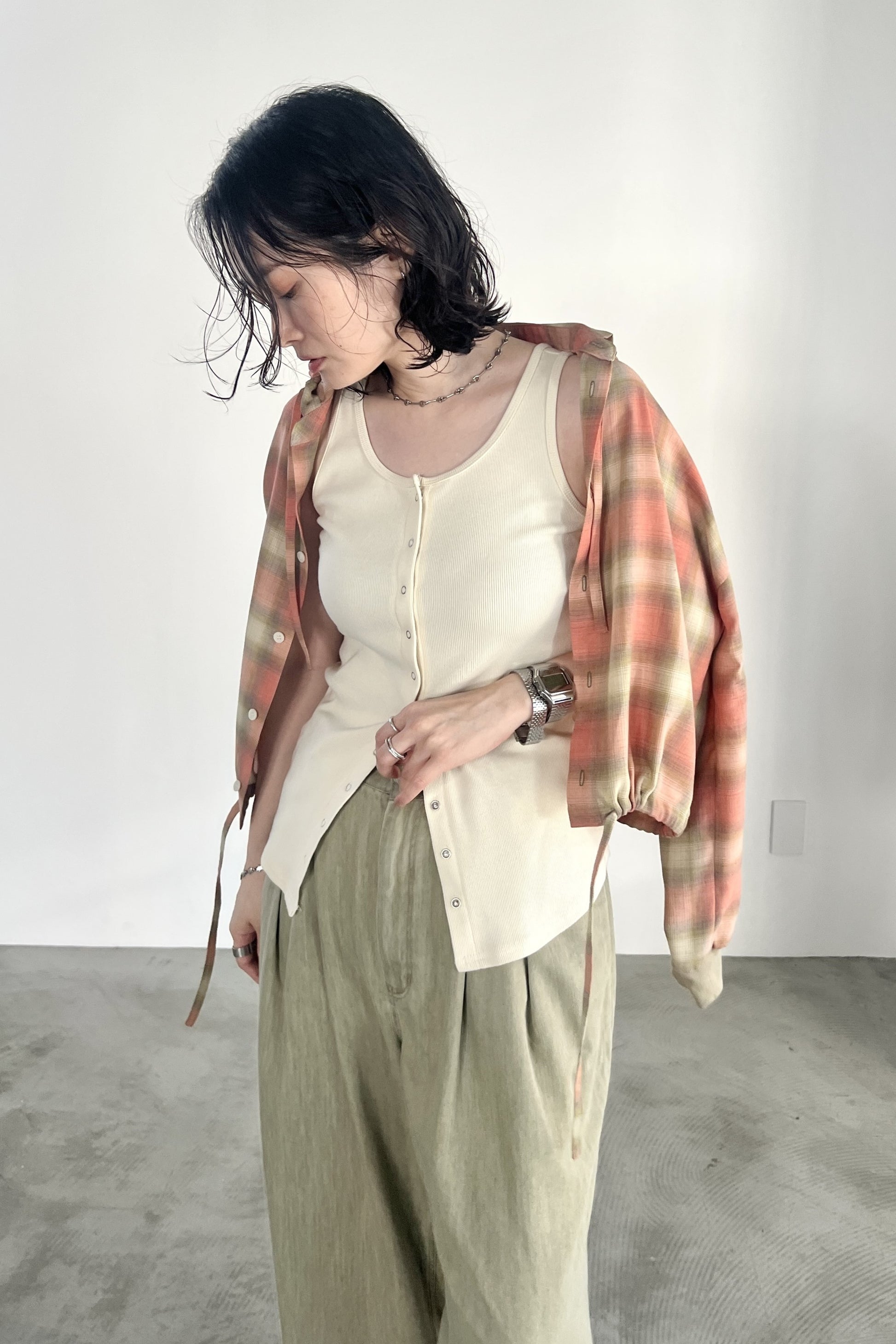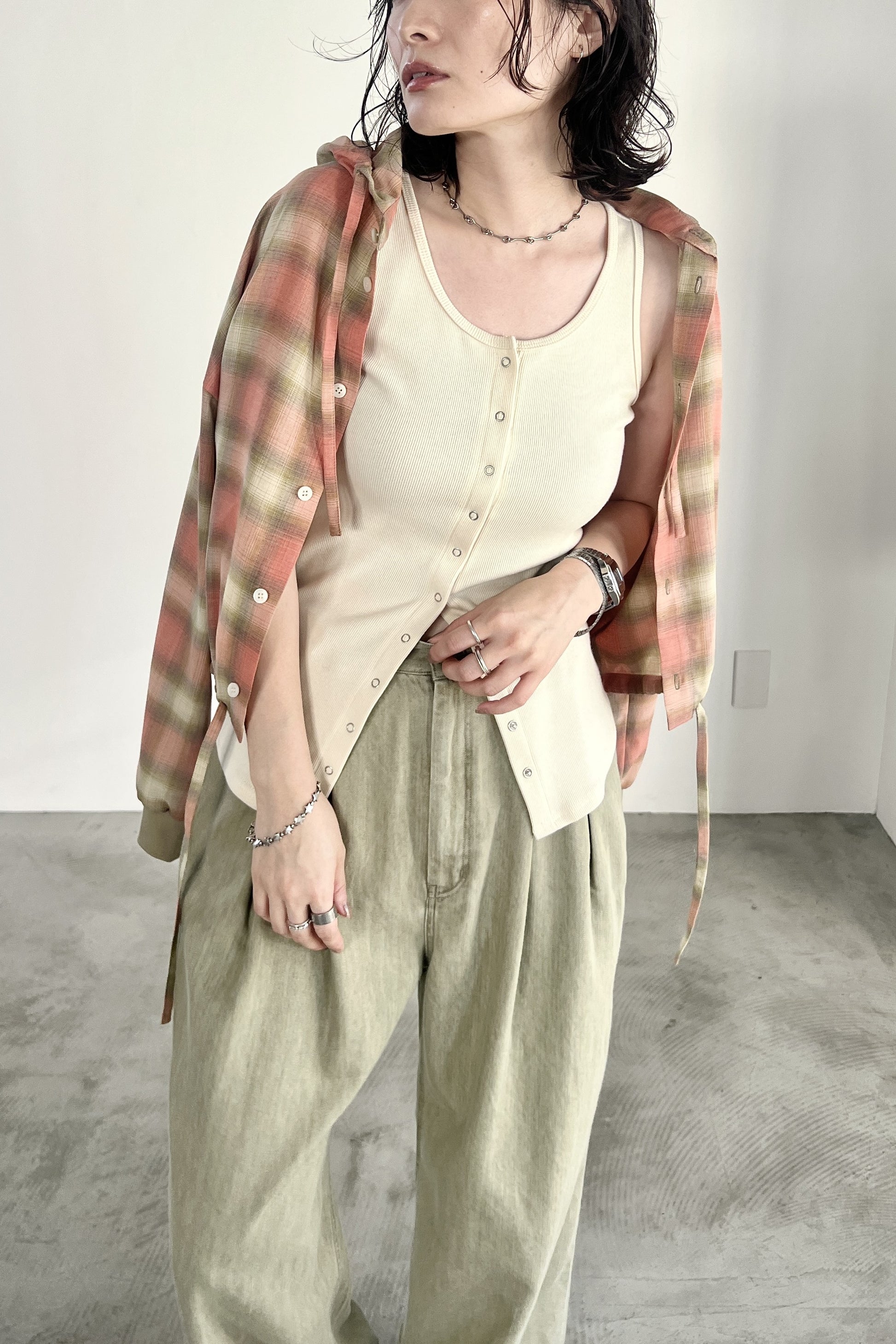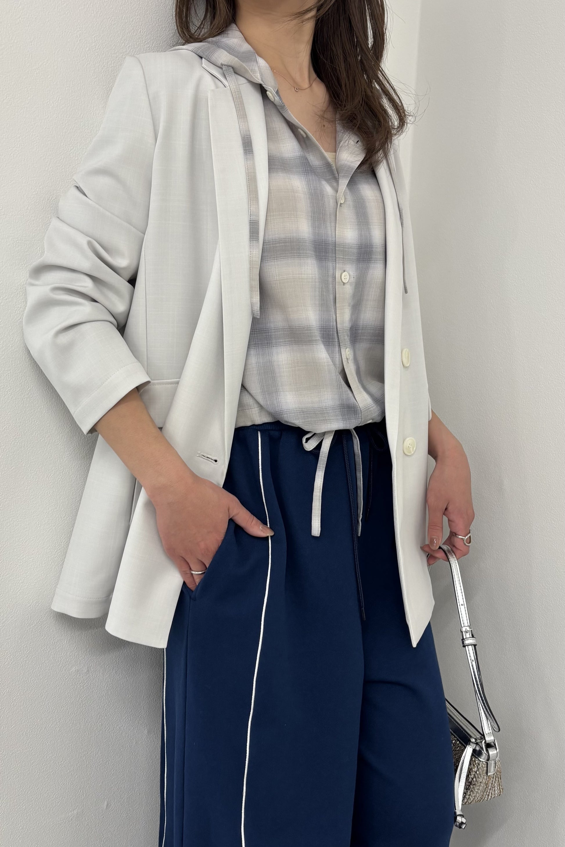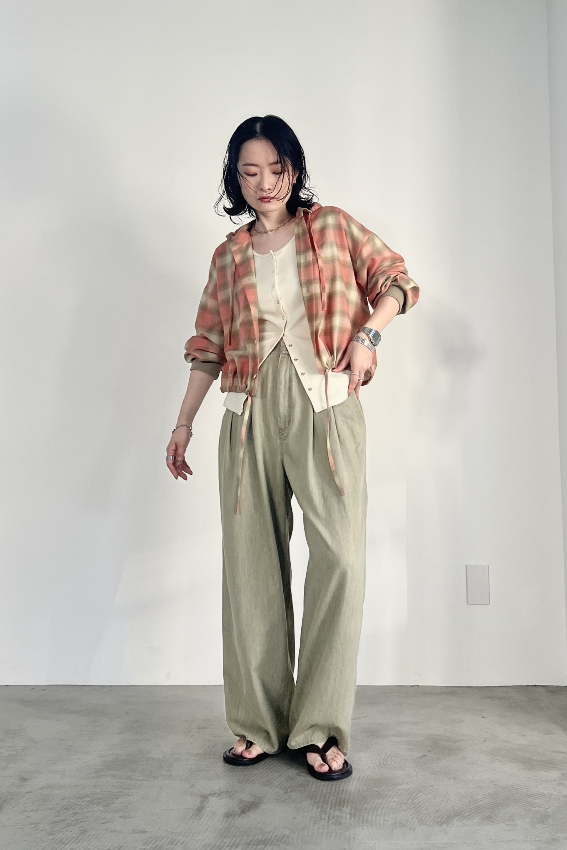 ドライタッチのオンブレーチェックを使用したフードシャツ。ポリエステル混の素材なので、綿100%の素材と比べてシワになりにくく、清涼感があります。トレンドのボリュームボトムとの相性が良いショート丈にし、袖口はたくし上げやすいリブ仕様でカジュアルに仕上げました。フードと裾のコーデもアクセントになっています。