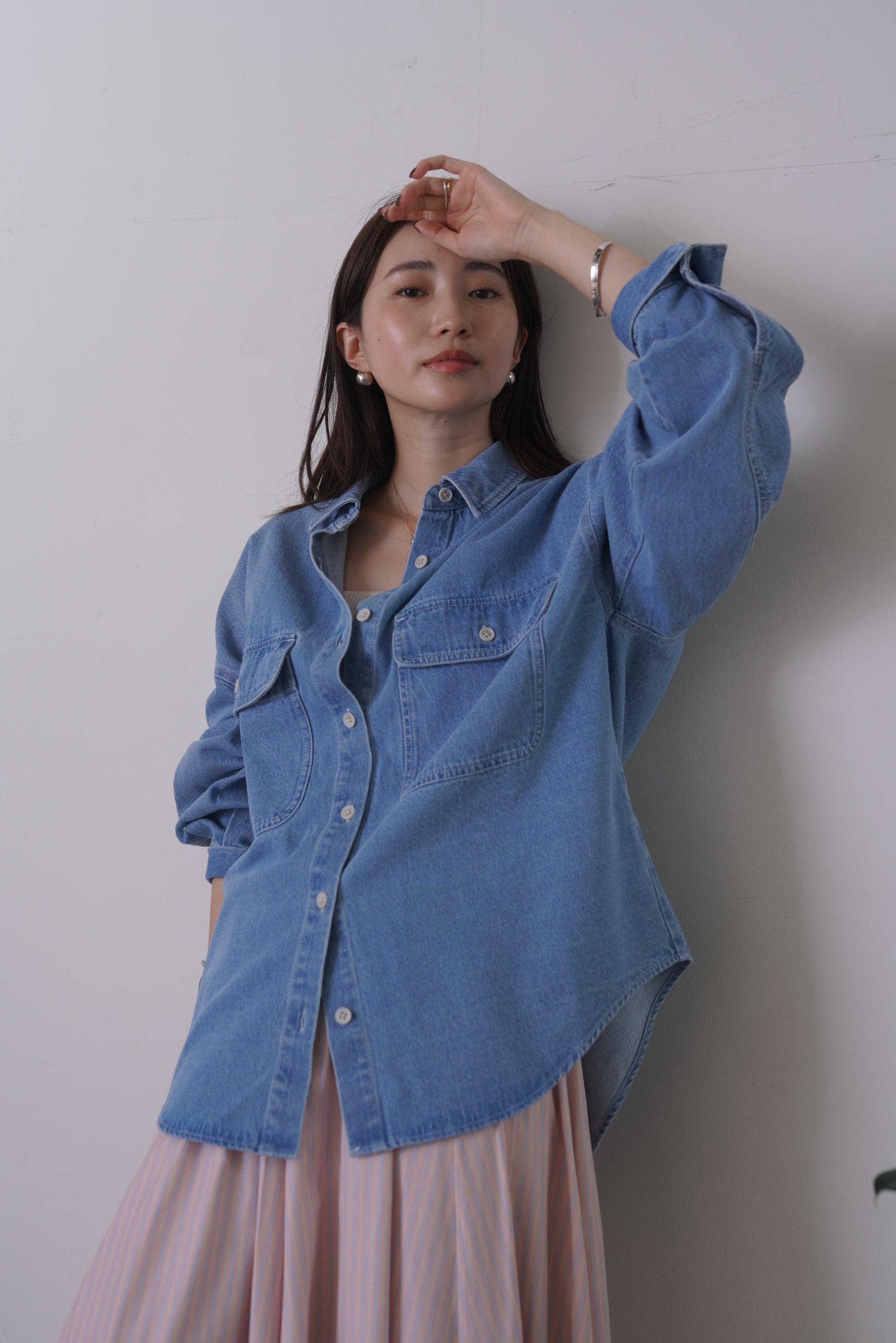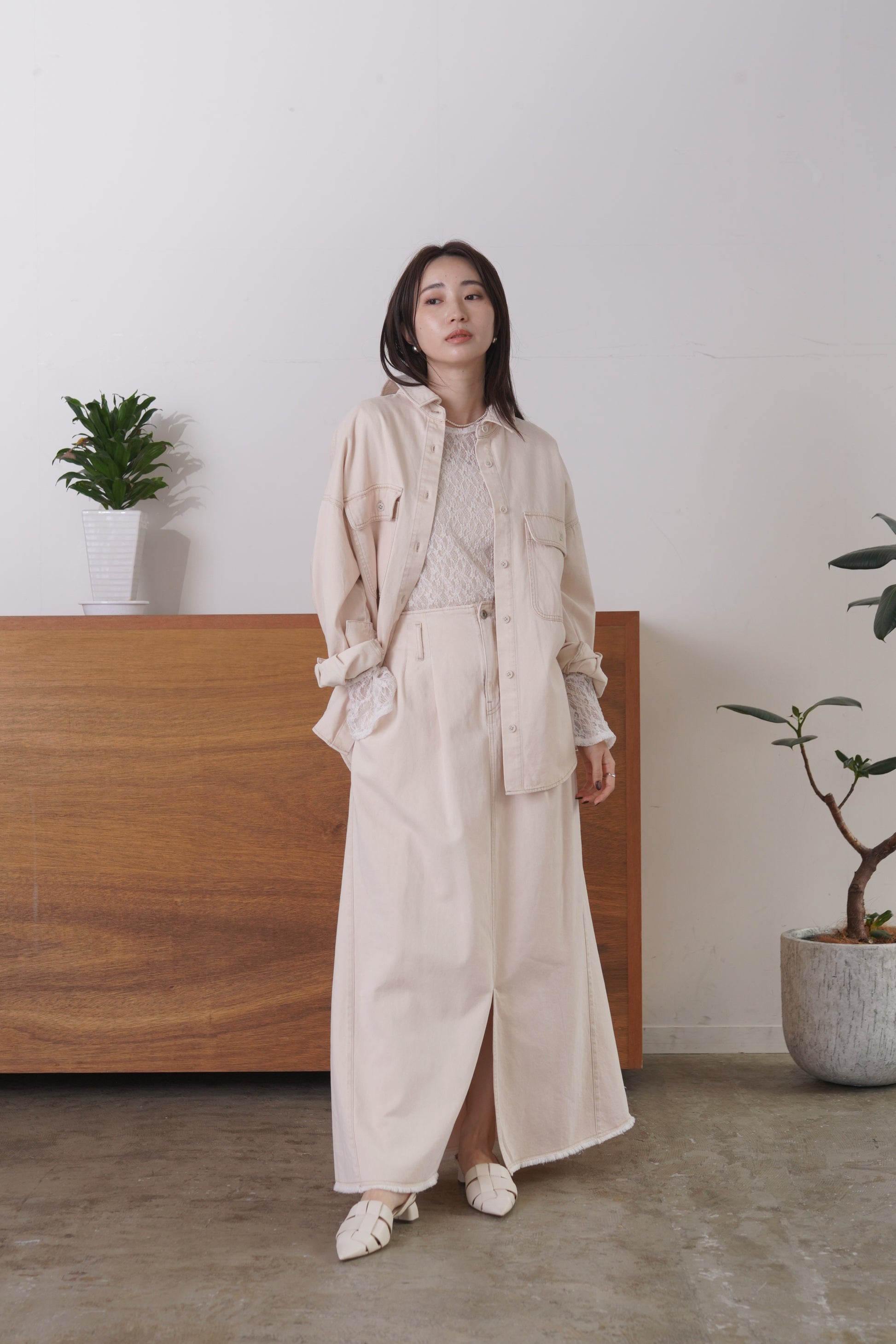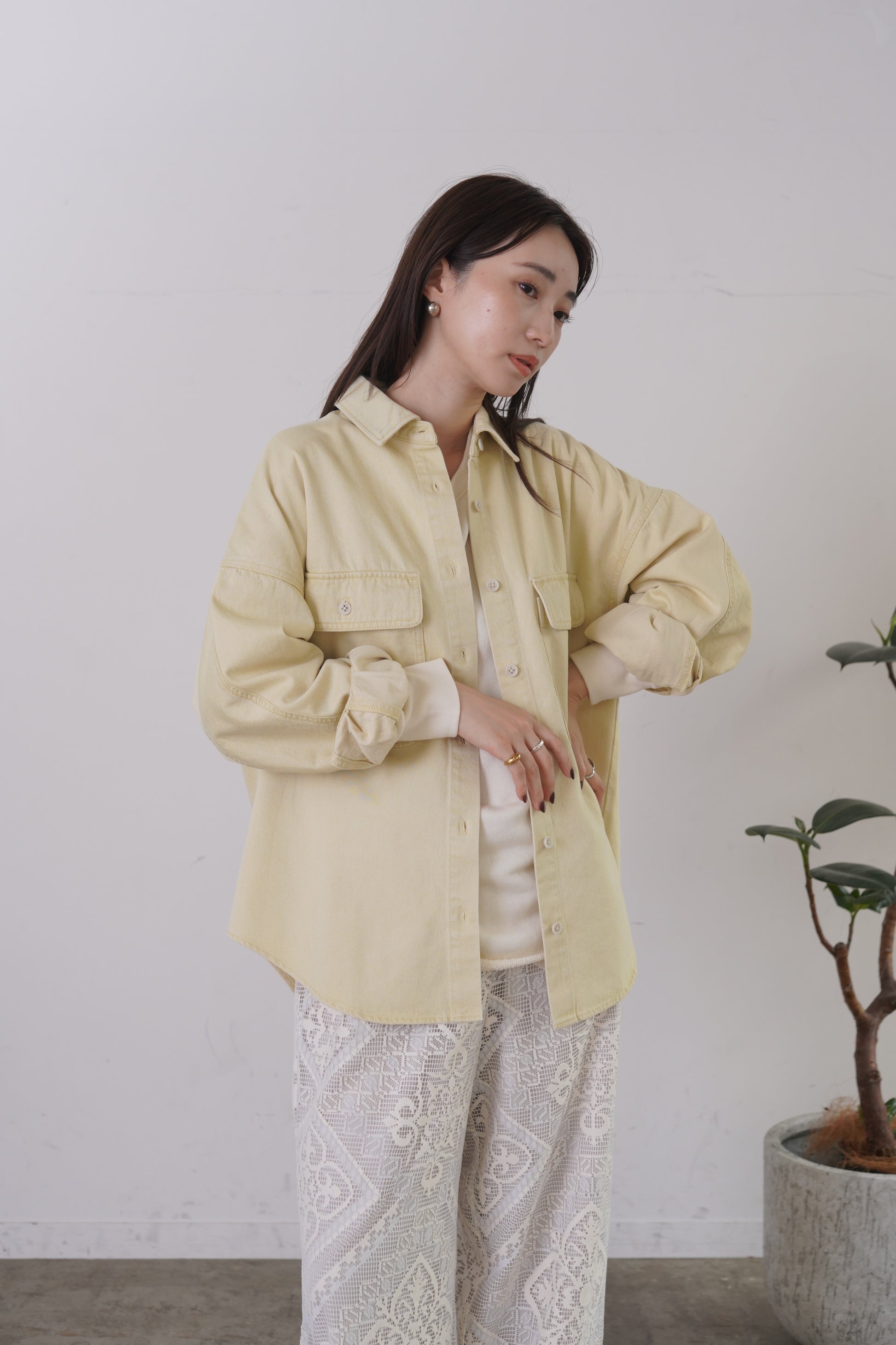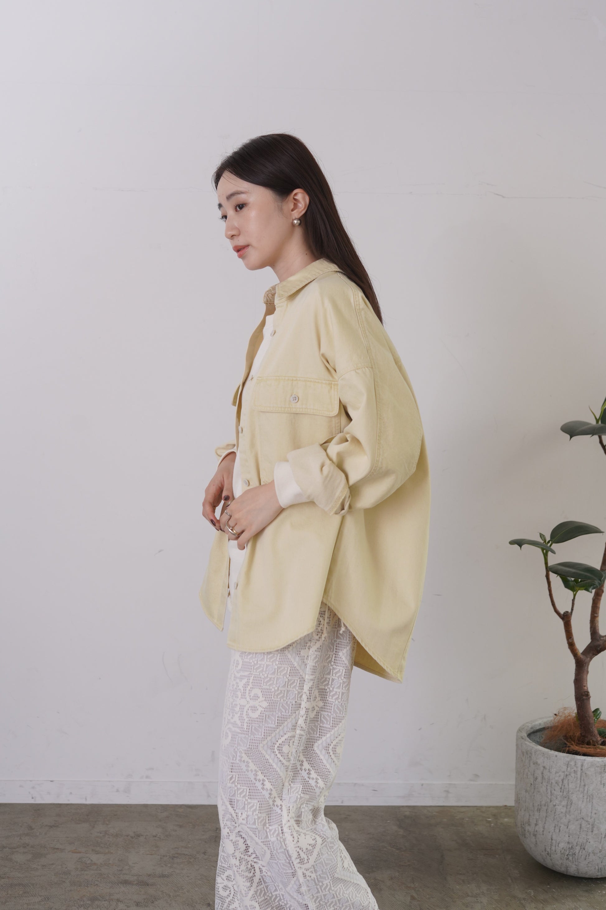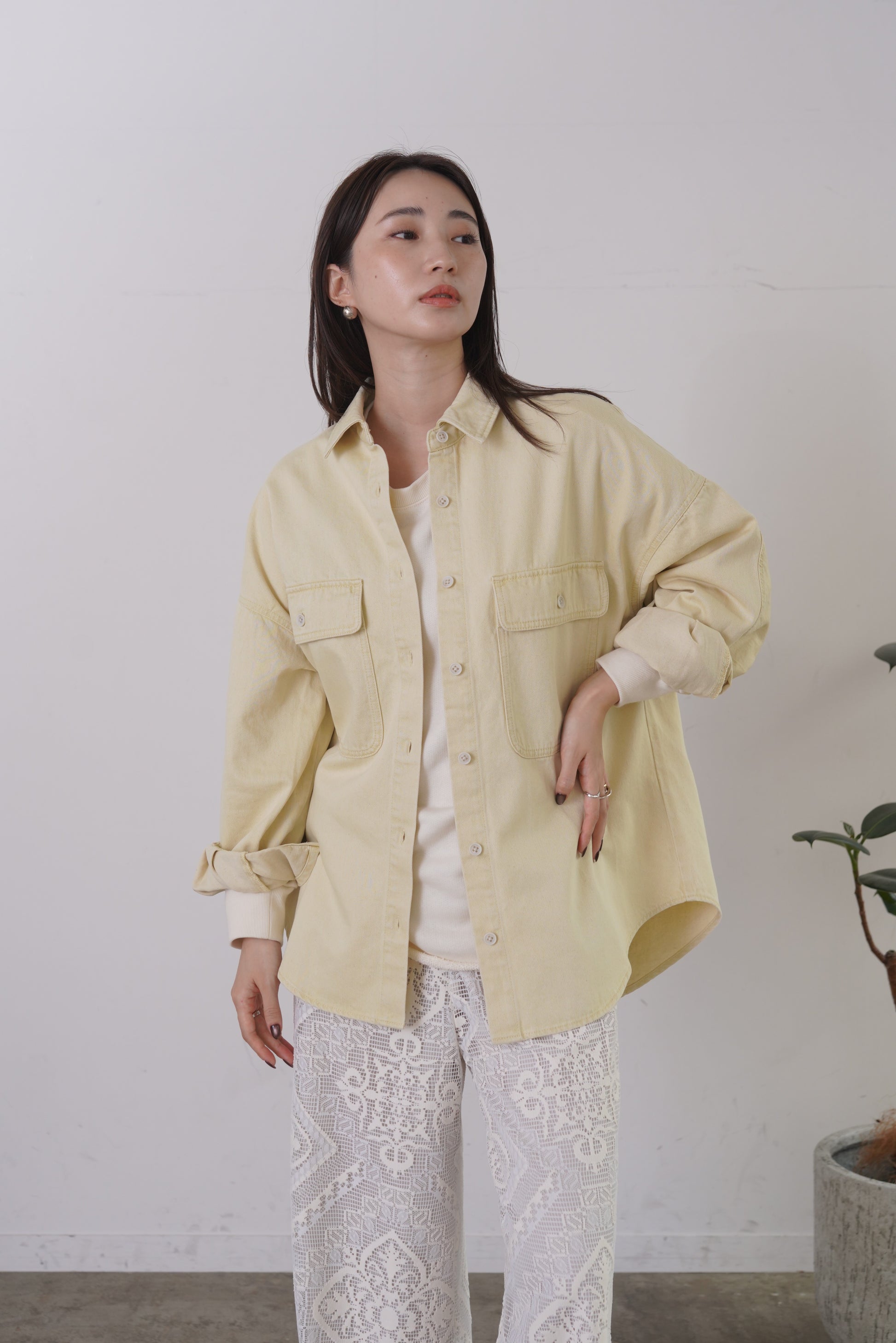 ややオーバーサイズでシャツとしても軽いブルゾンとしても着回しのきく優しい風合いのカラーデニム。柔らかいデニムなのでオーバーサイズでも落ち感があり、羽織るだけでこなれたムードに仕上がります。同素材スカートとのセットアップもおすすめです。