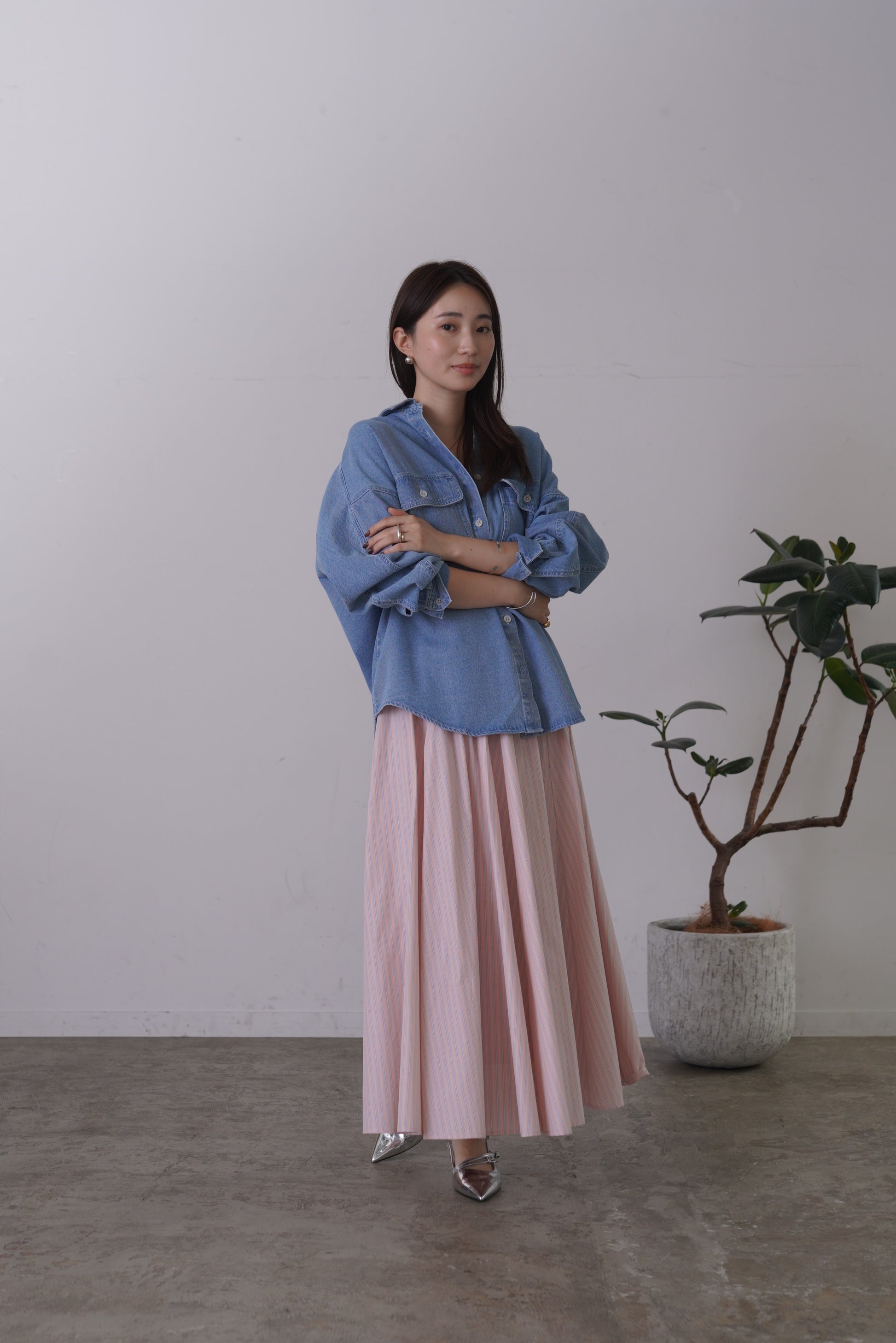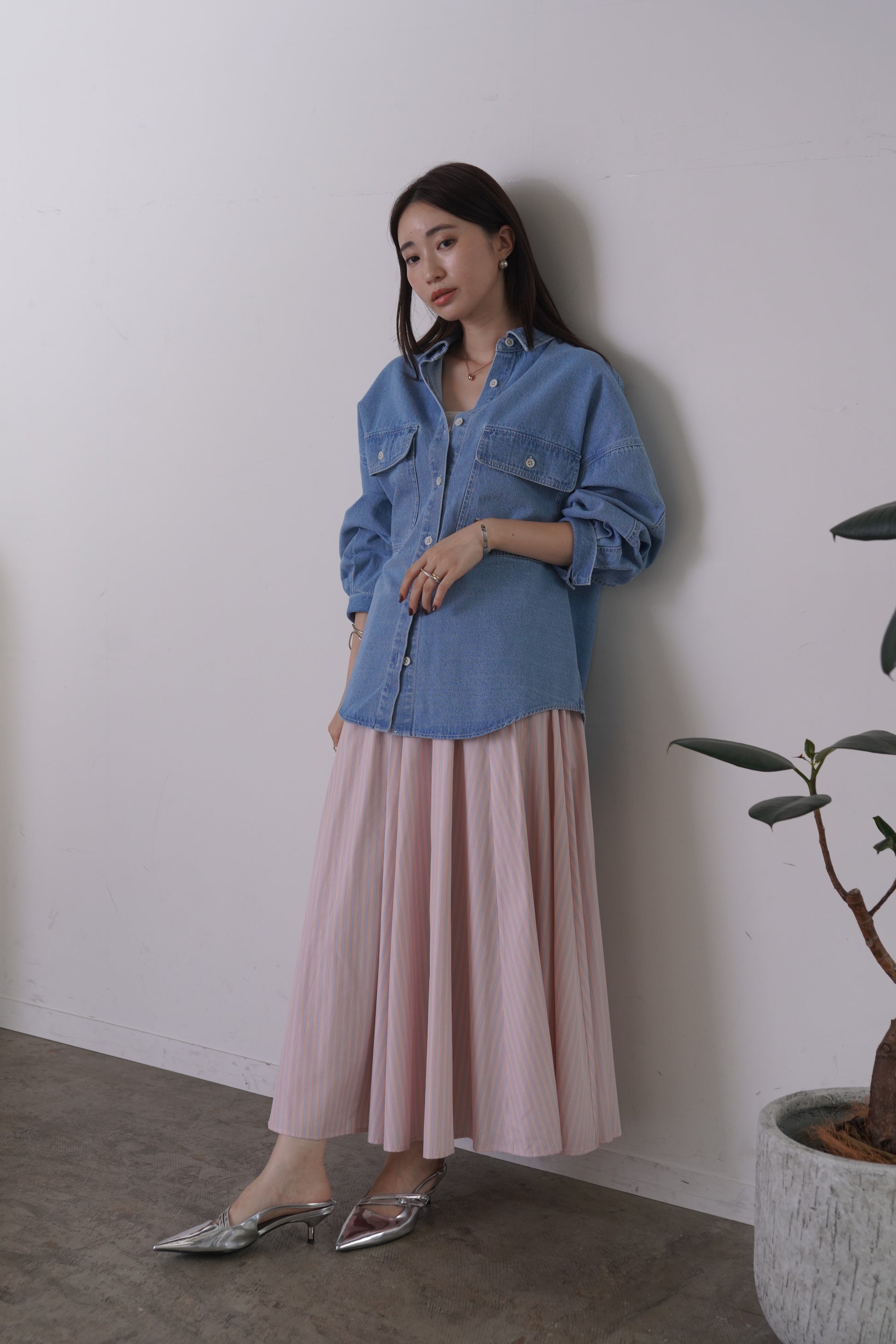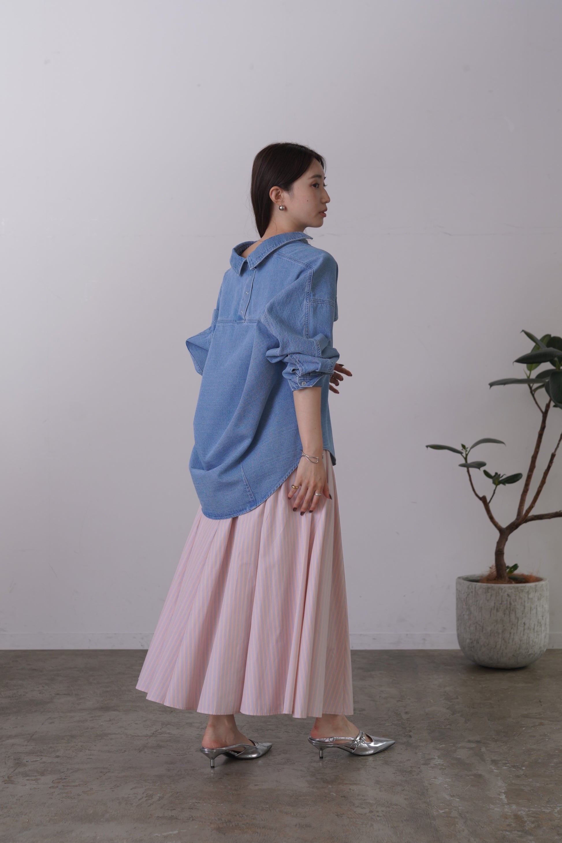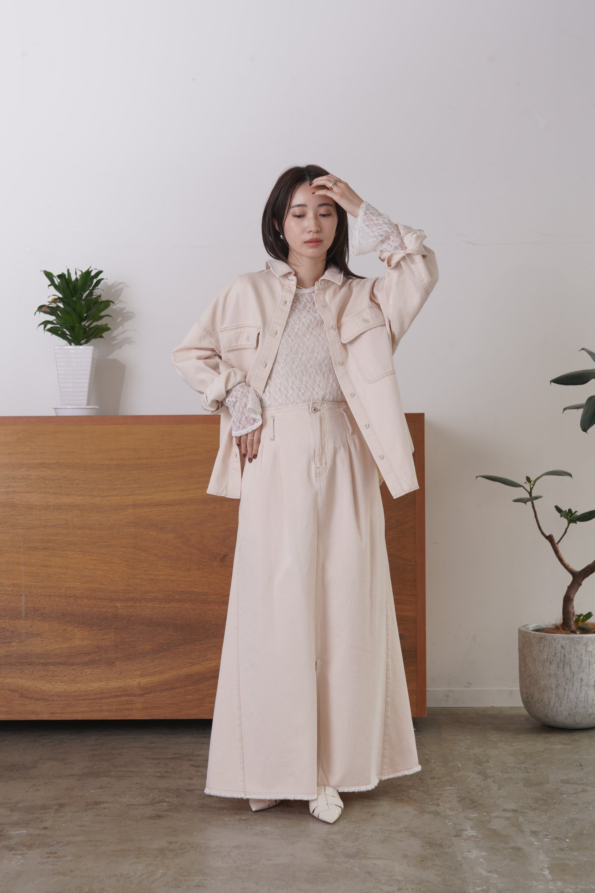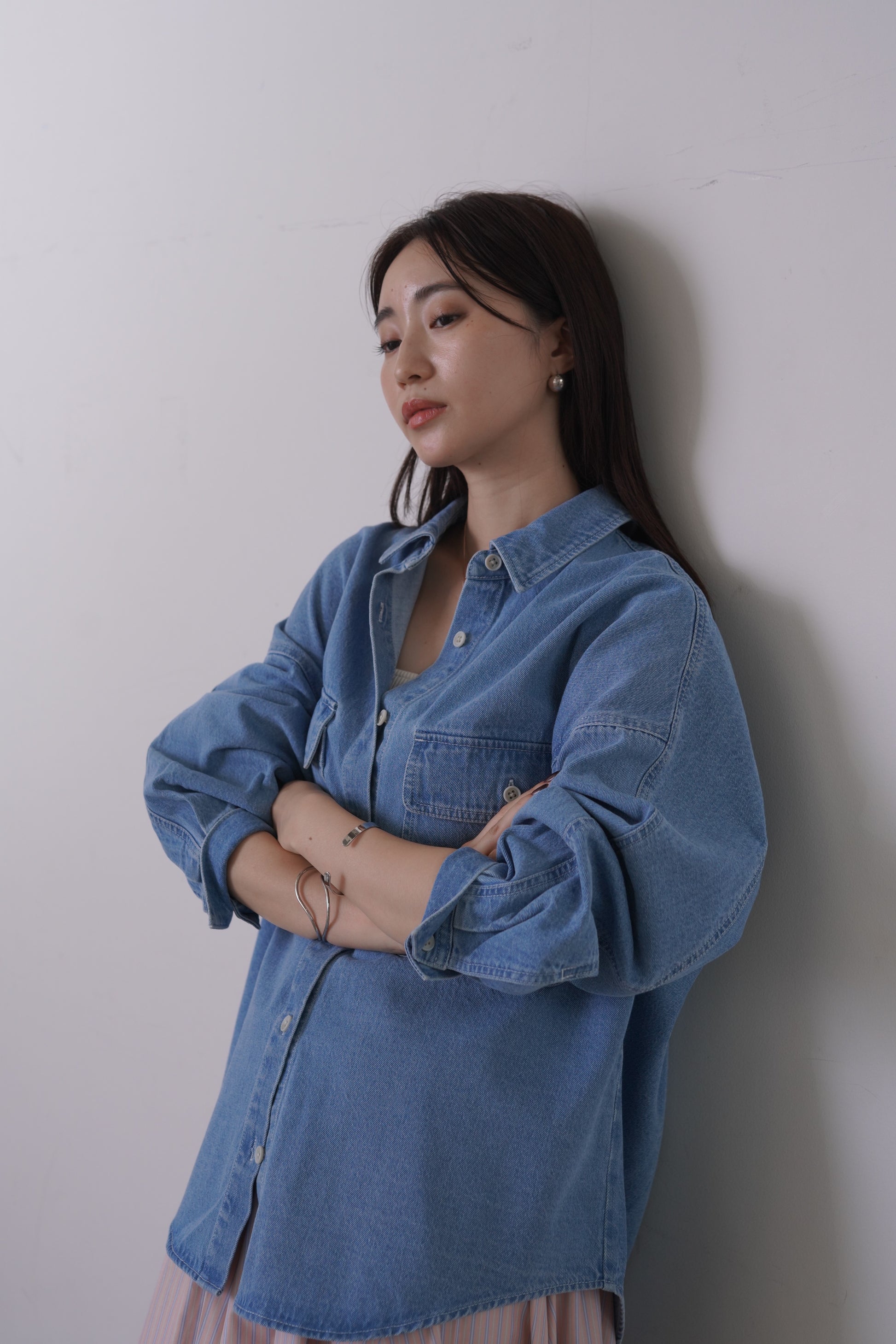 ややオーバーサイズでシャツとしても軽いブルゾンとしても着回しのきく優しい風合いのカラーデニム。柔らかいデニムなのでオーバーサイズでも落ち感があり、羽織るだけでこなれたムードに仕上がります。同素材スカートとのセットアップもおすすめです。