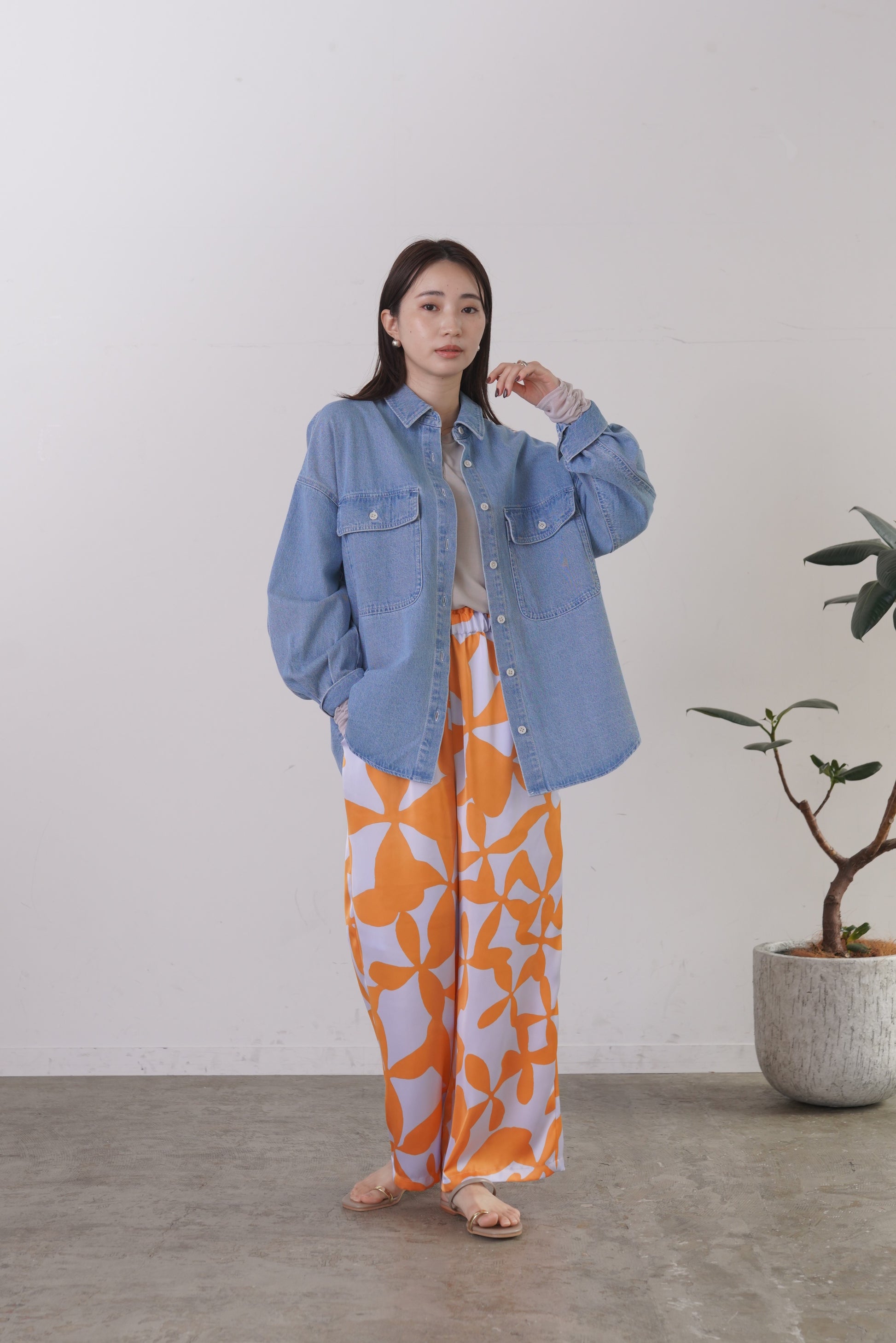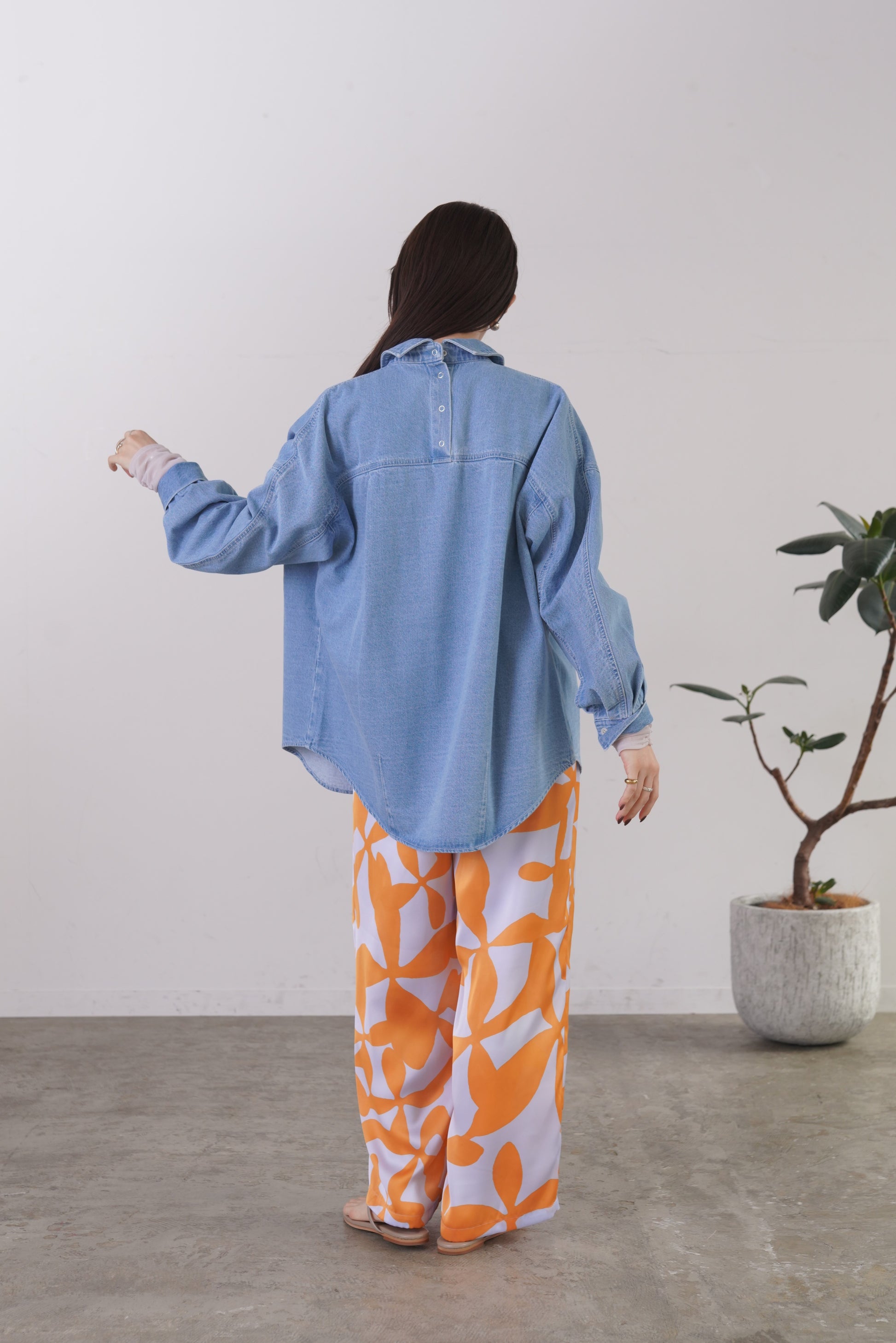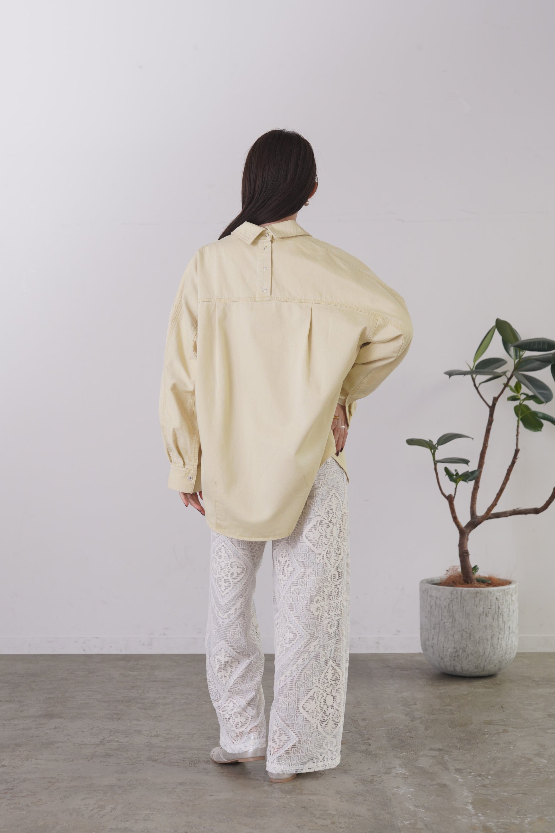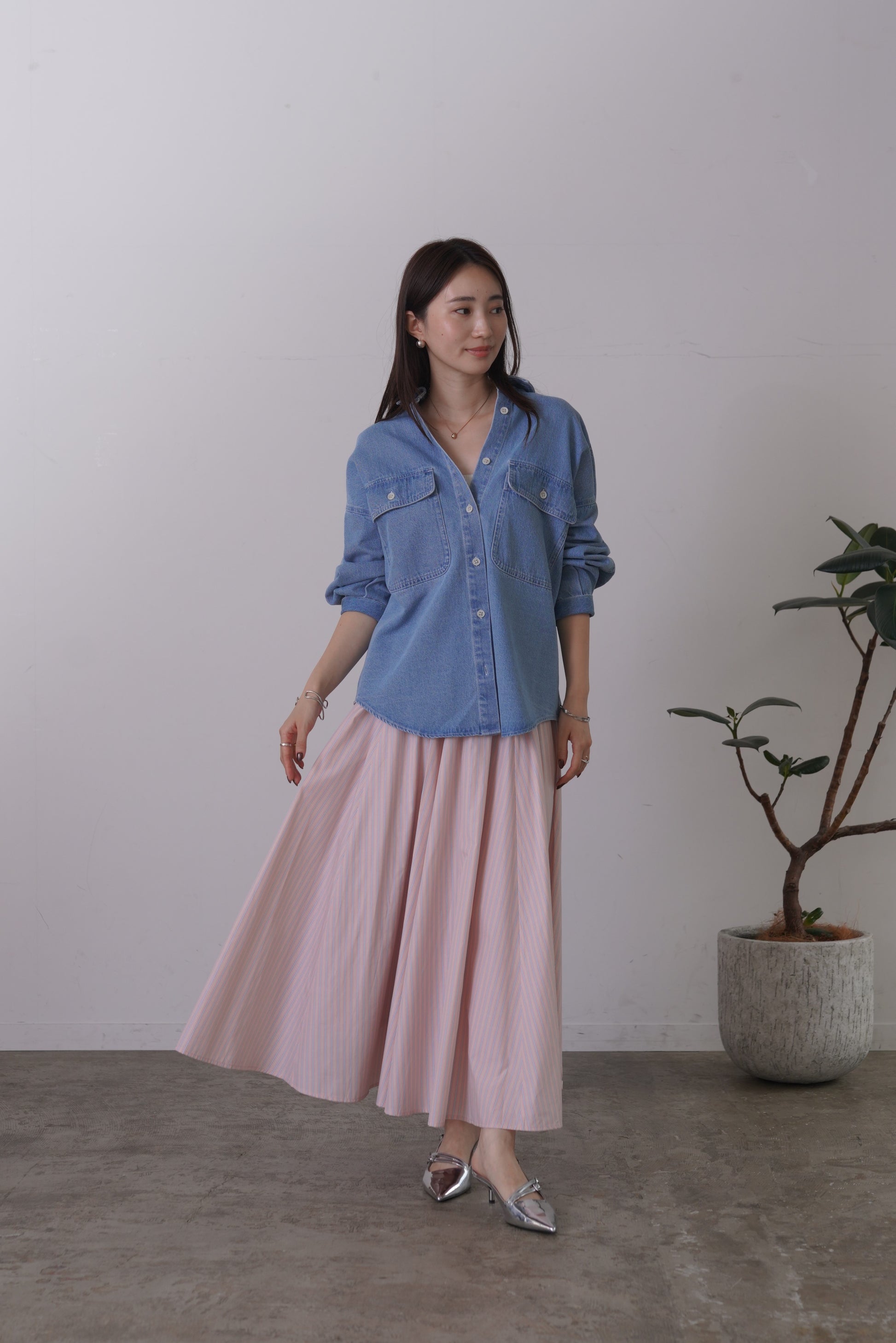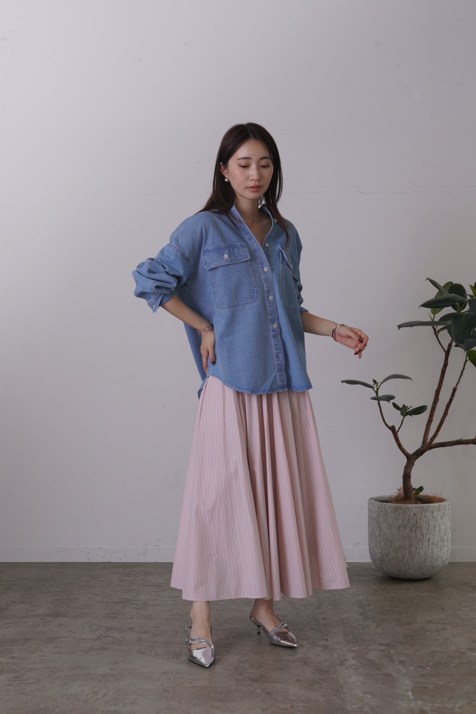 ややオーバーサイズでシャツとしても軽いブルゾンとしても着回しのきく優しい風合いのカラーデニム。柔らかいデニムなのでオーバーサイズでも落ち感があり、羽織るだけでこなれたムードに仕上がります。同素材スカートとのセットアップもおすすめです。