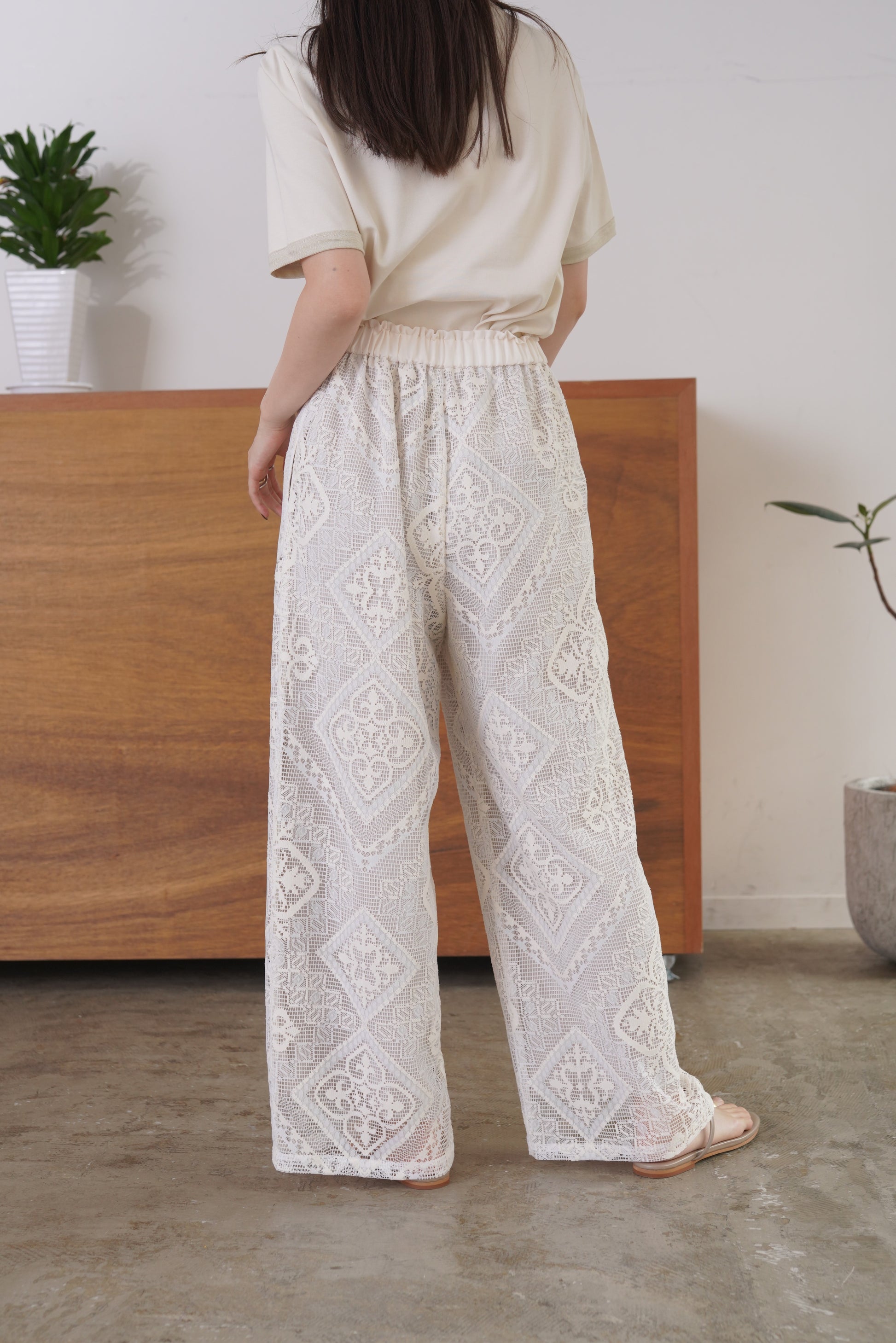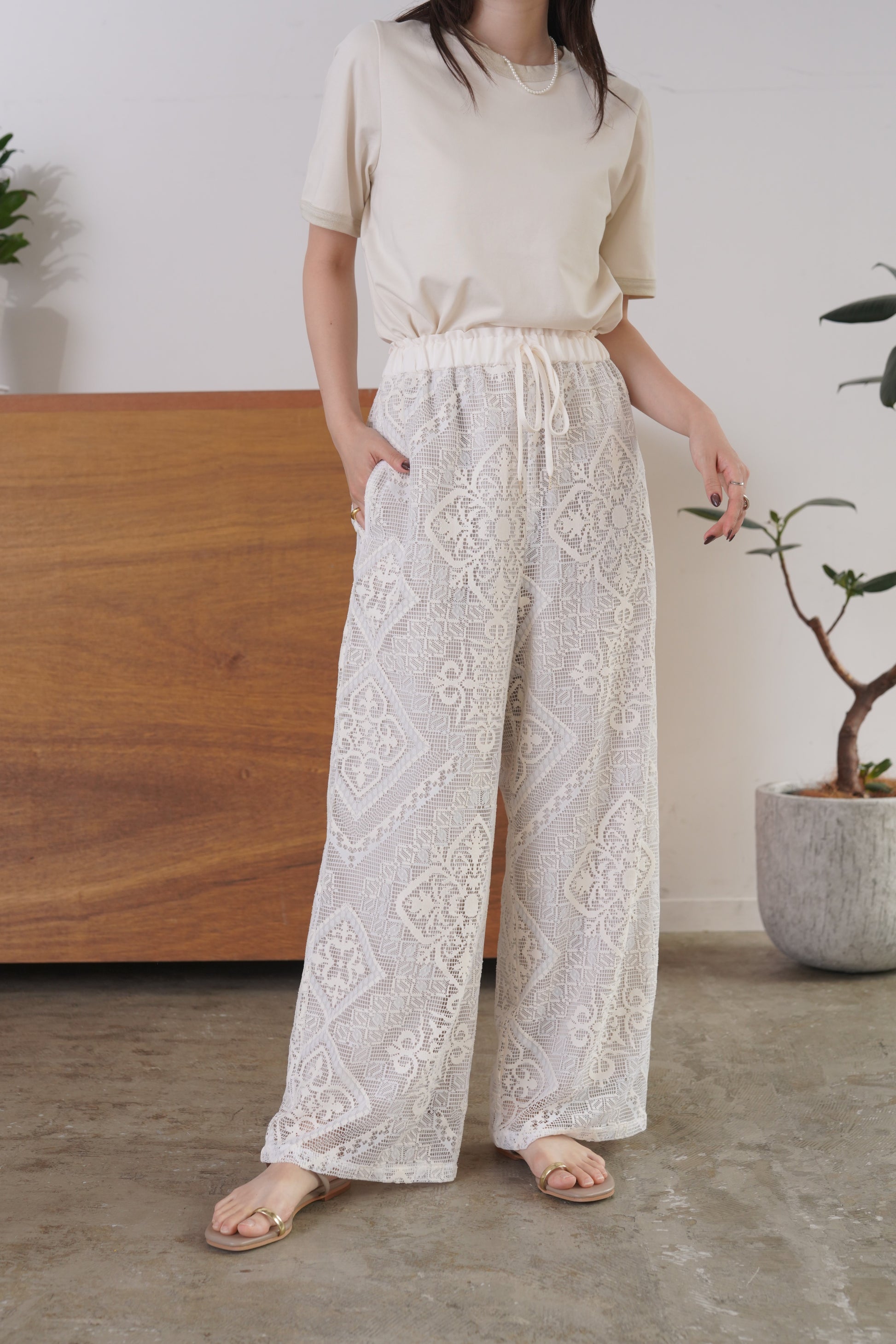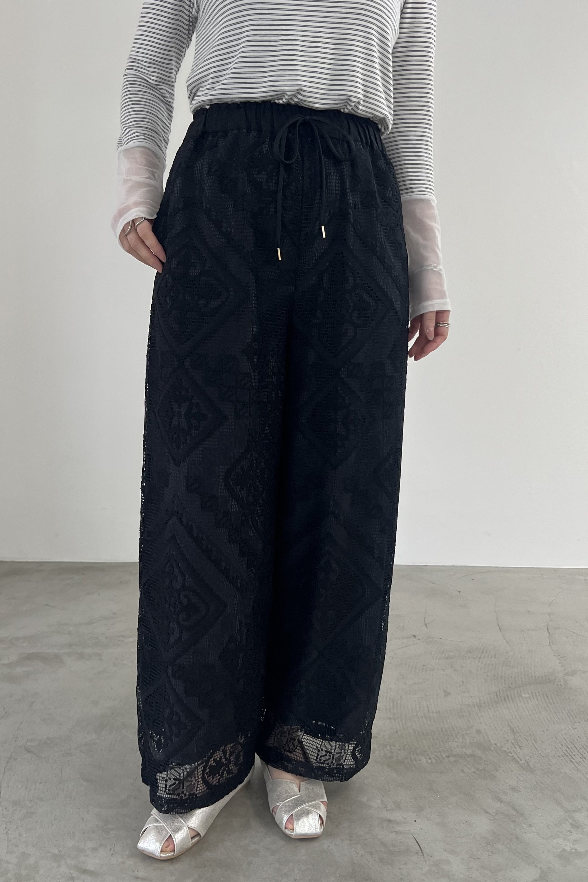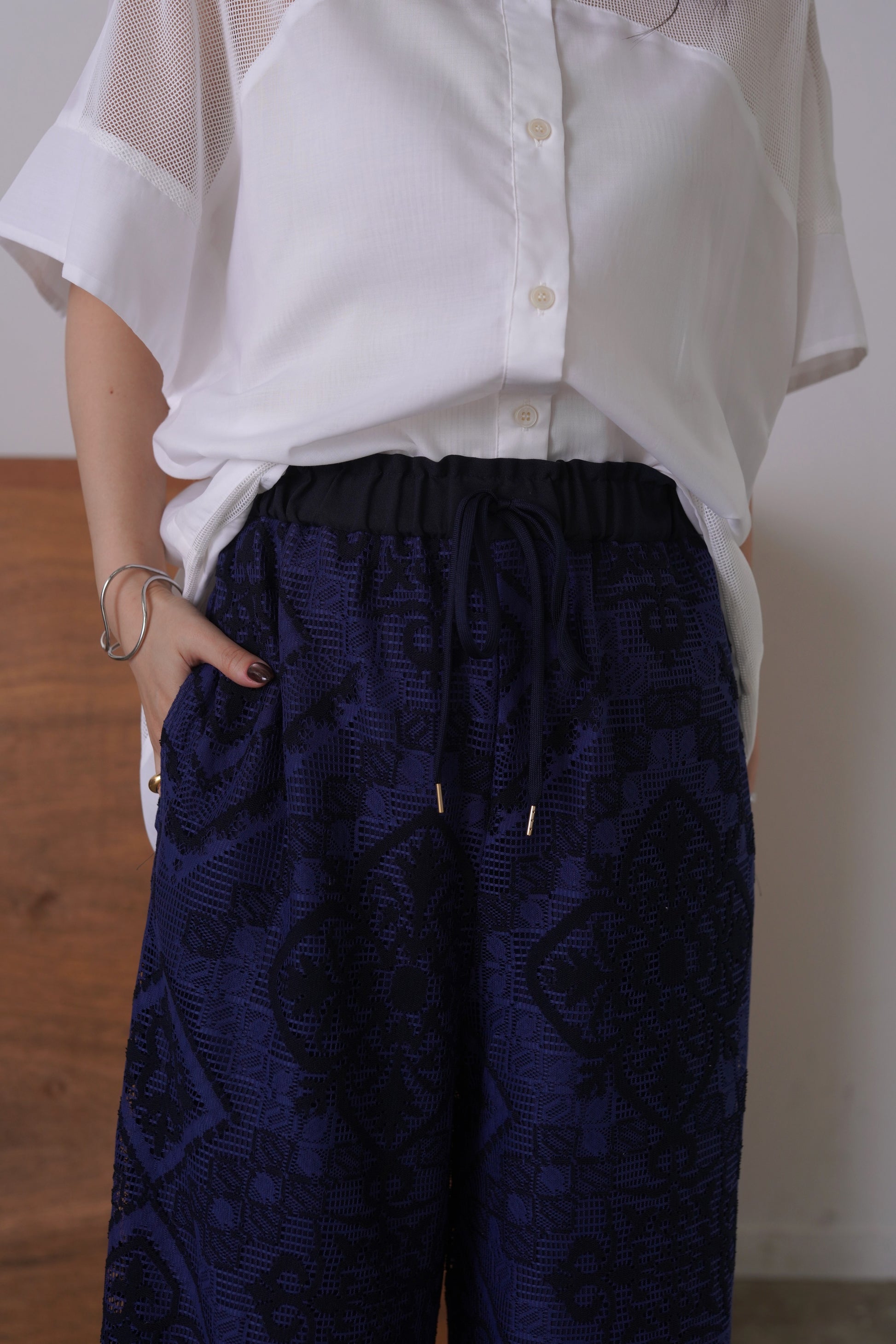 COMMENT▼ クラフト感がある大柄のラッセルレースパンツ。ストレッチ裏地が裾までついており、透けの心配はありません。ウエストは総ゴムで、ドローコードでサイズ調節ができます。同素材ビスチェとのセットアップもおすすめです。