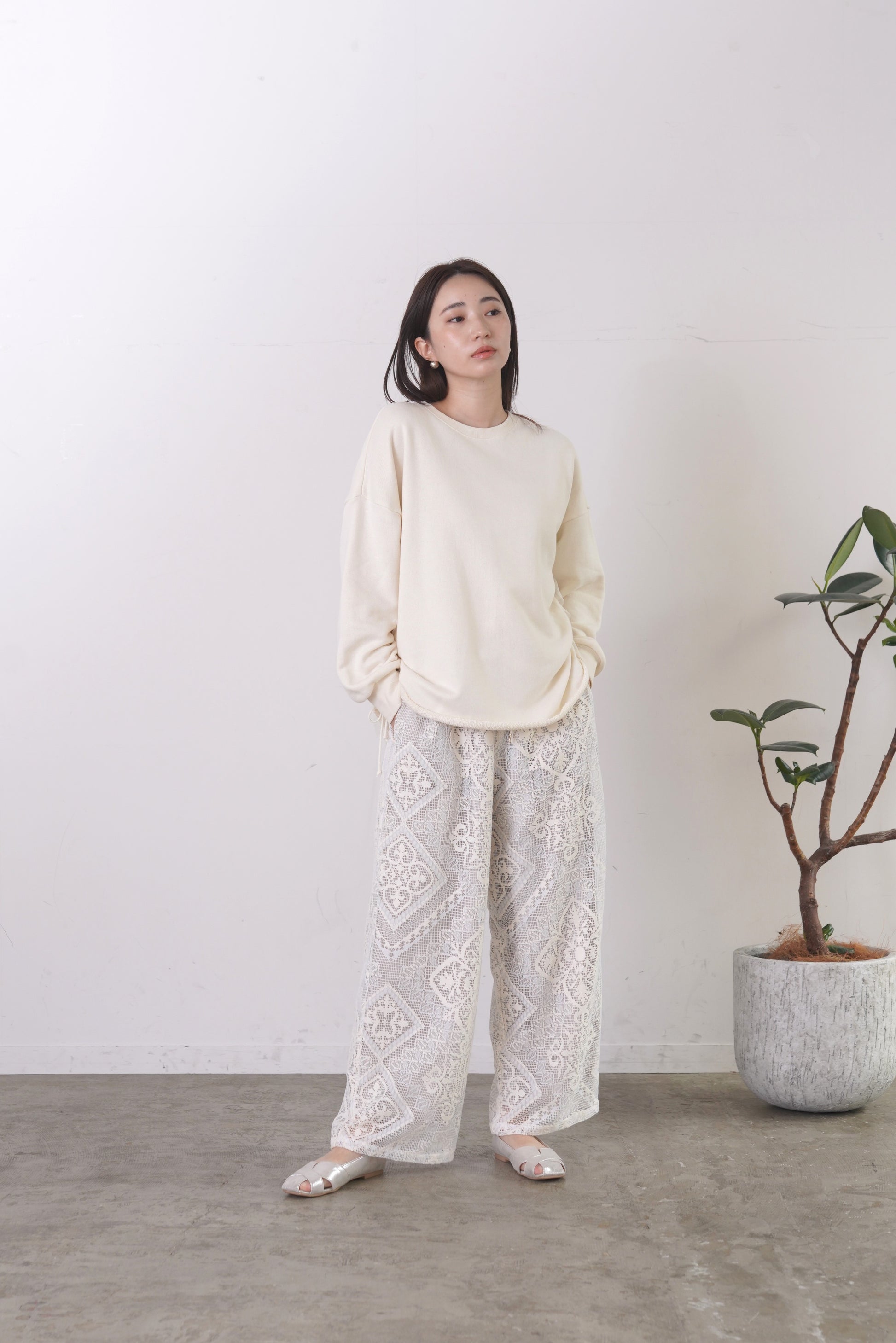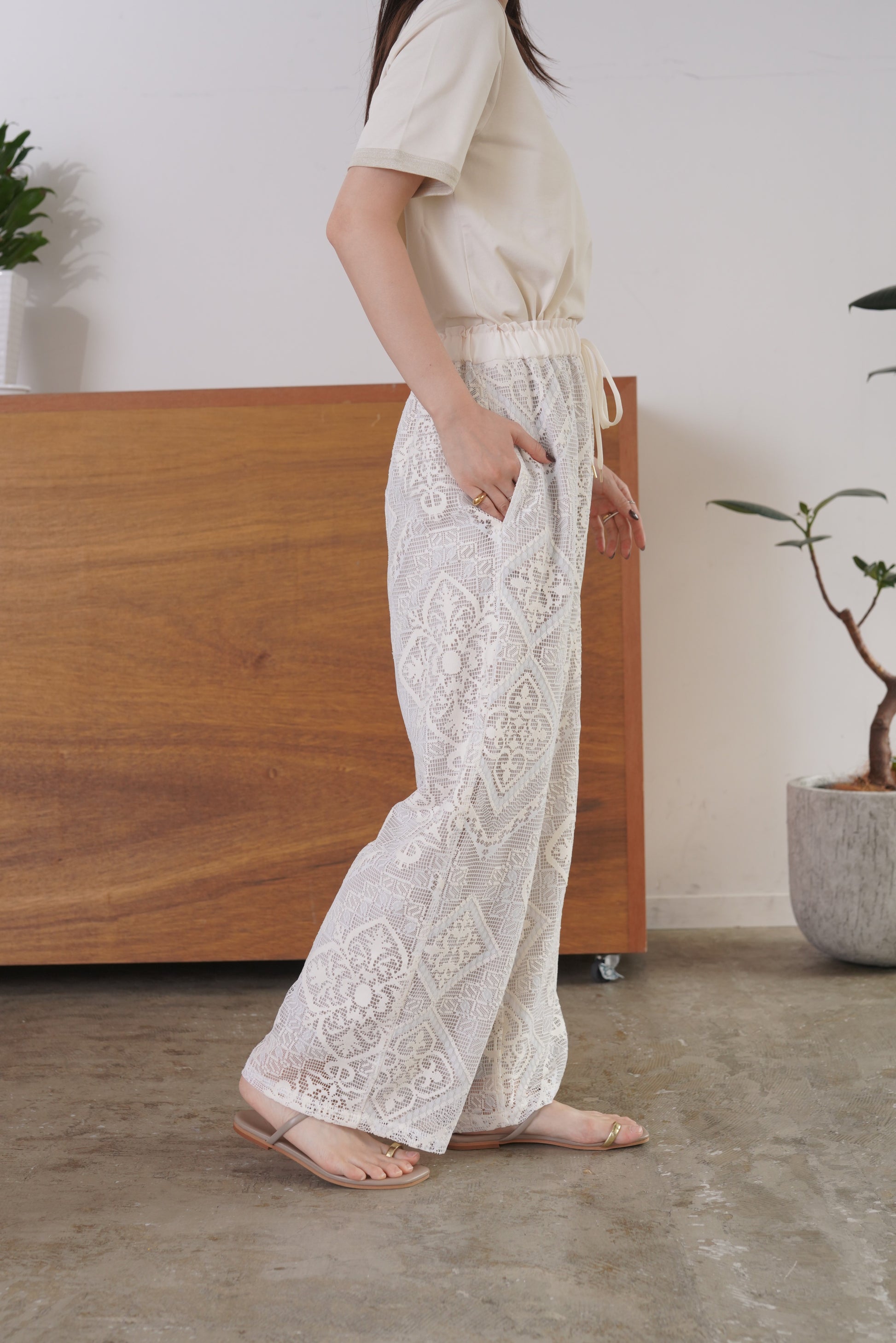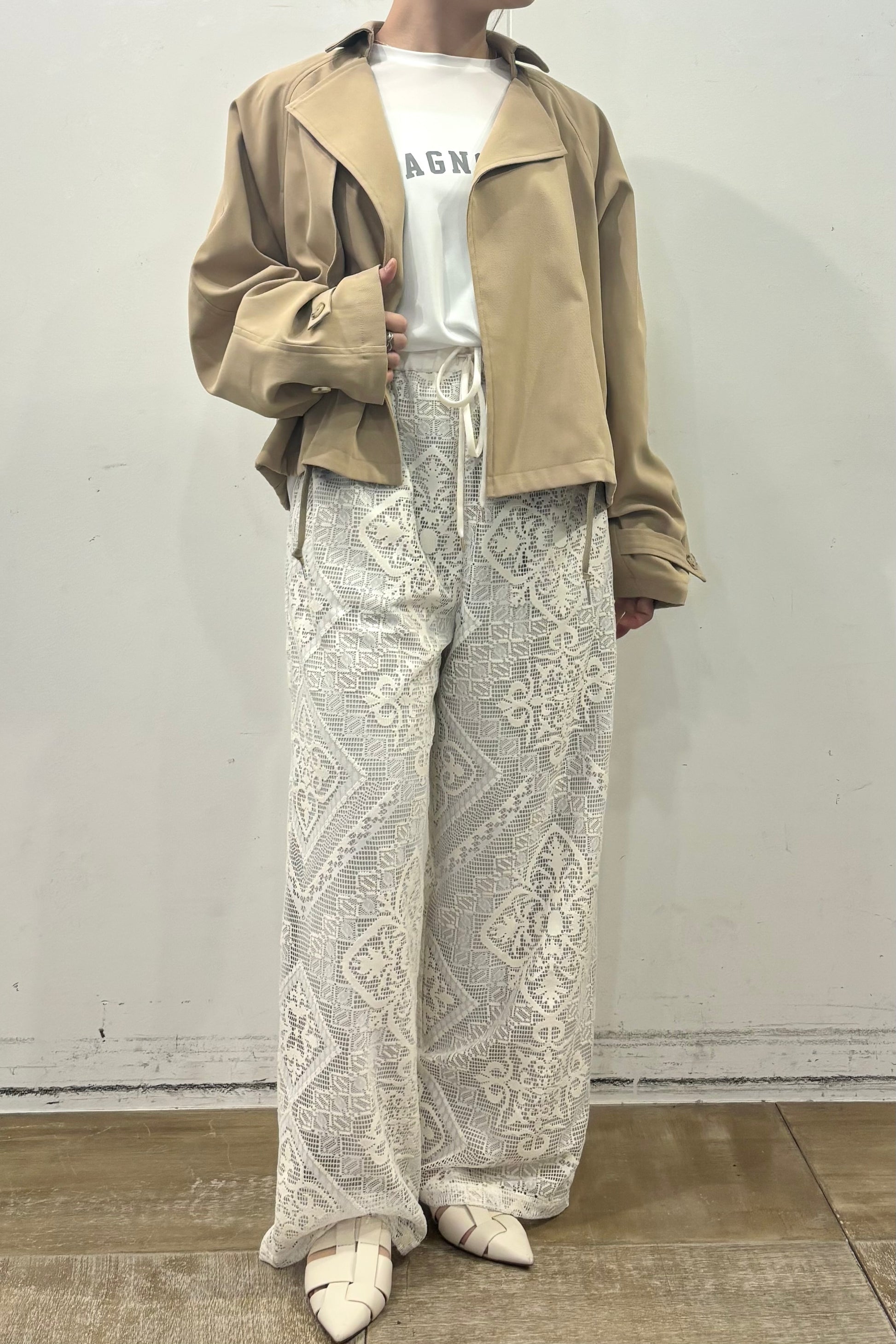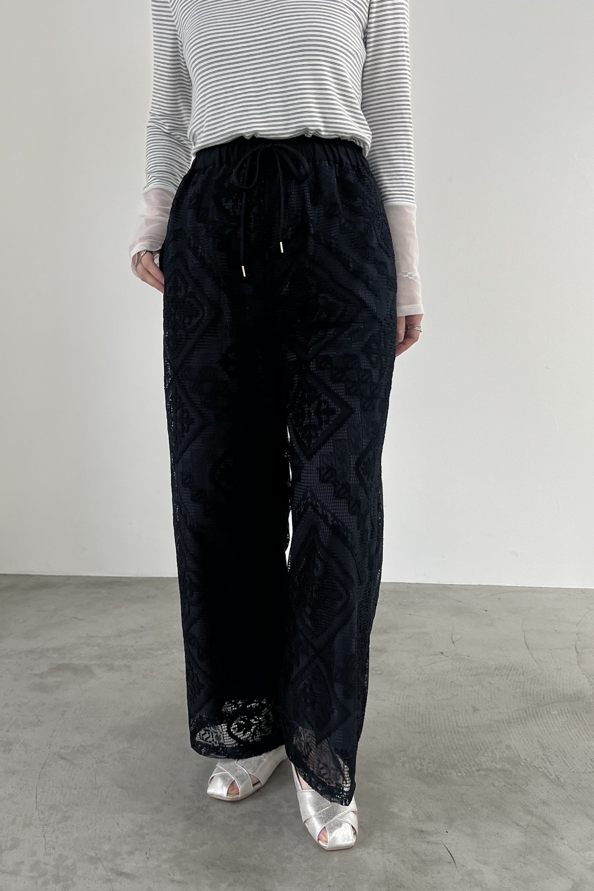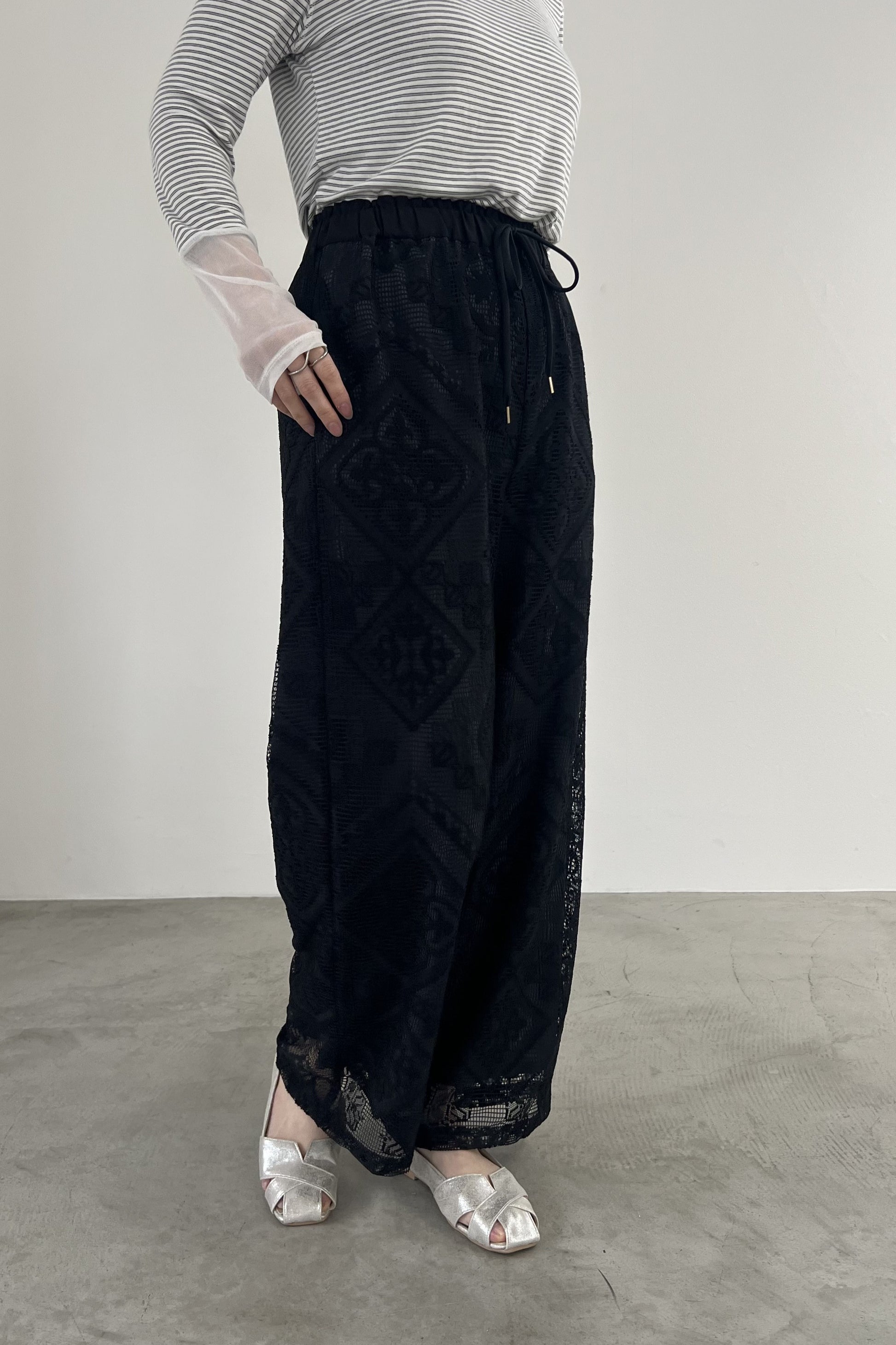 COMMENT▼ クラフト感がある大柄のラッセルレースパンツ。ストレッチ裏地が裾までついており、透けの心配はありません。ウエストは総ゴムで、ドローコードでサイズ調節ができます。同素材ビスチェとのセットアップもおすすめです。
