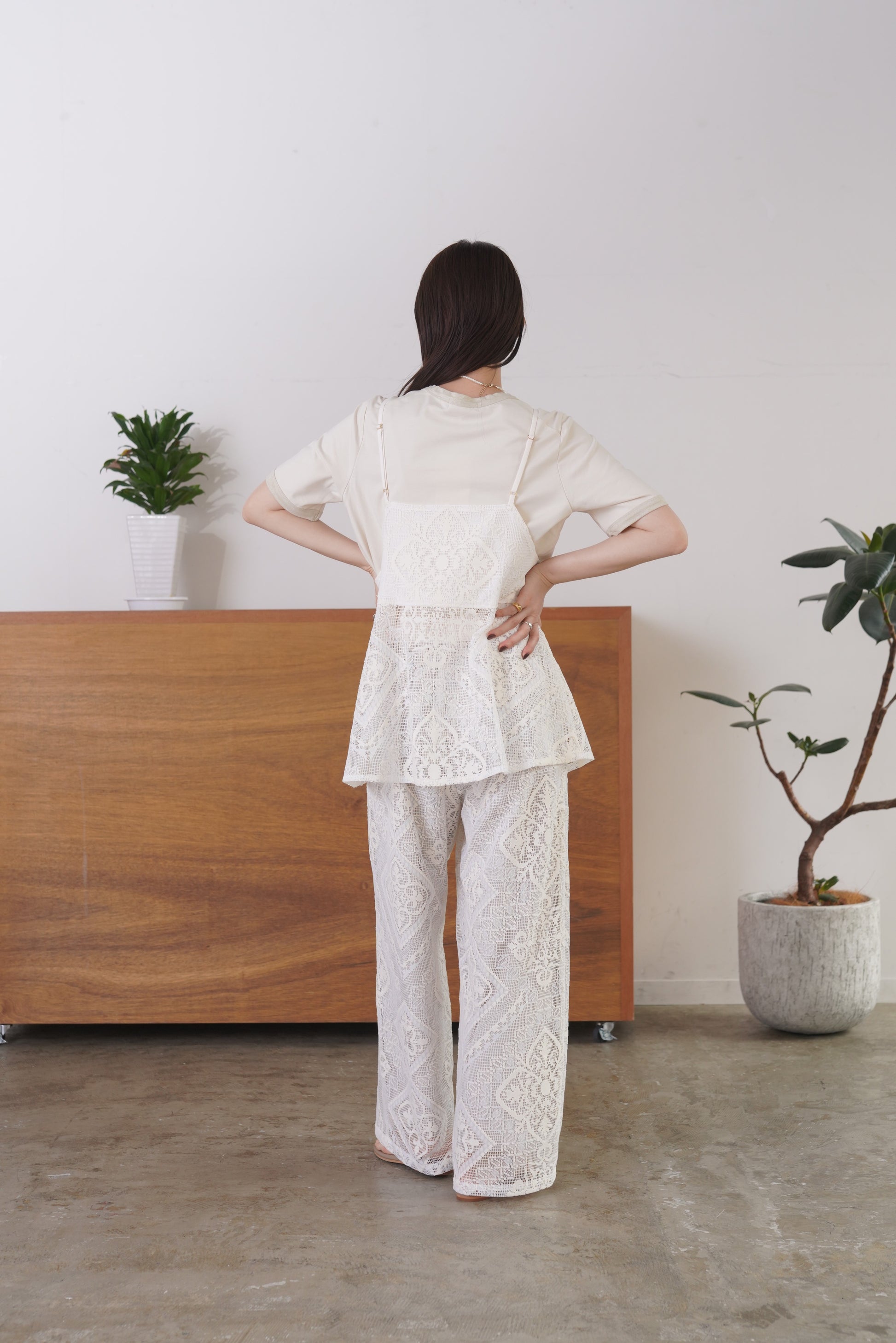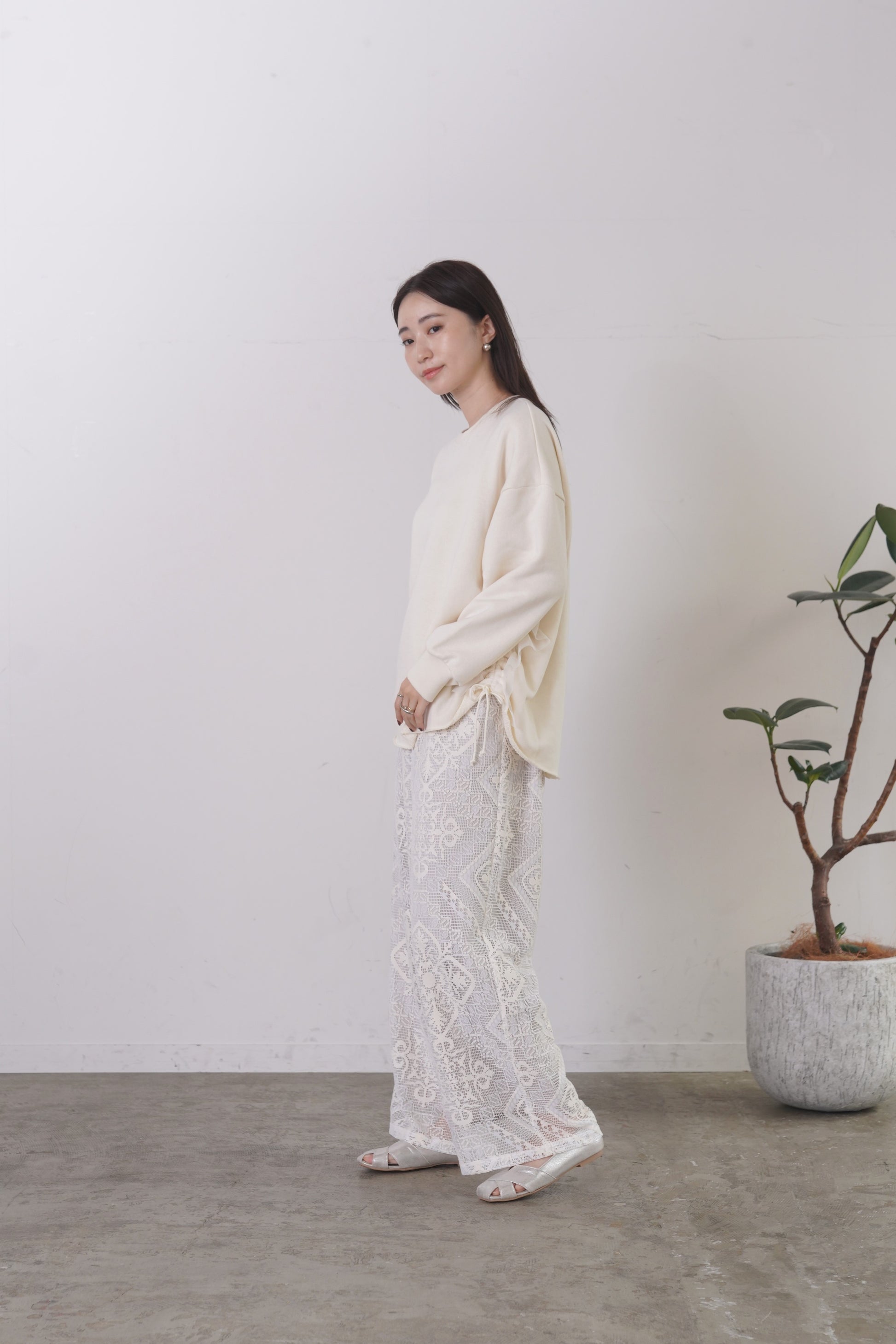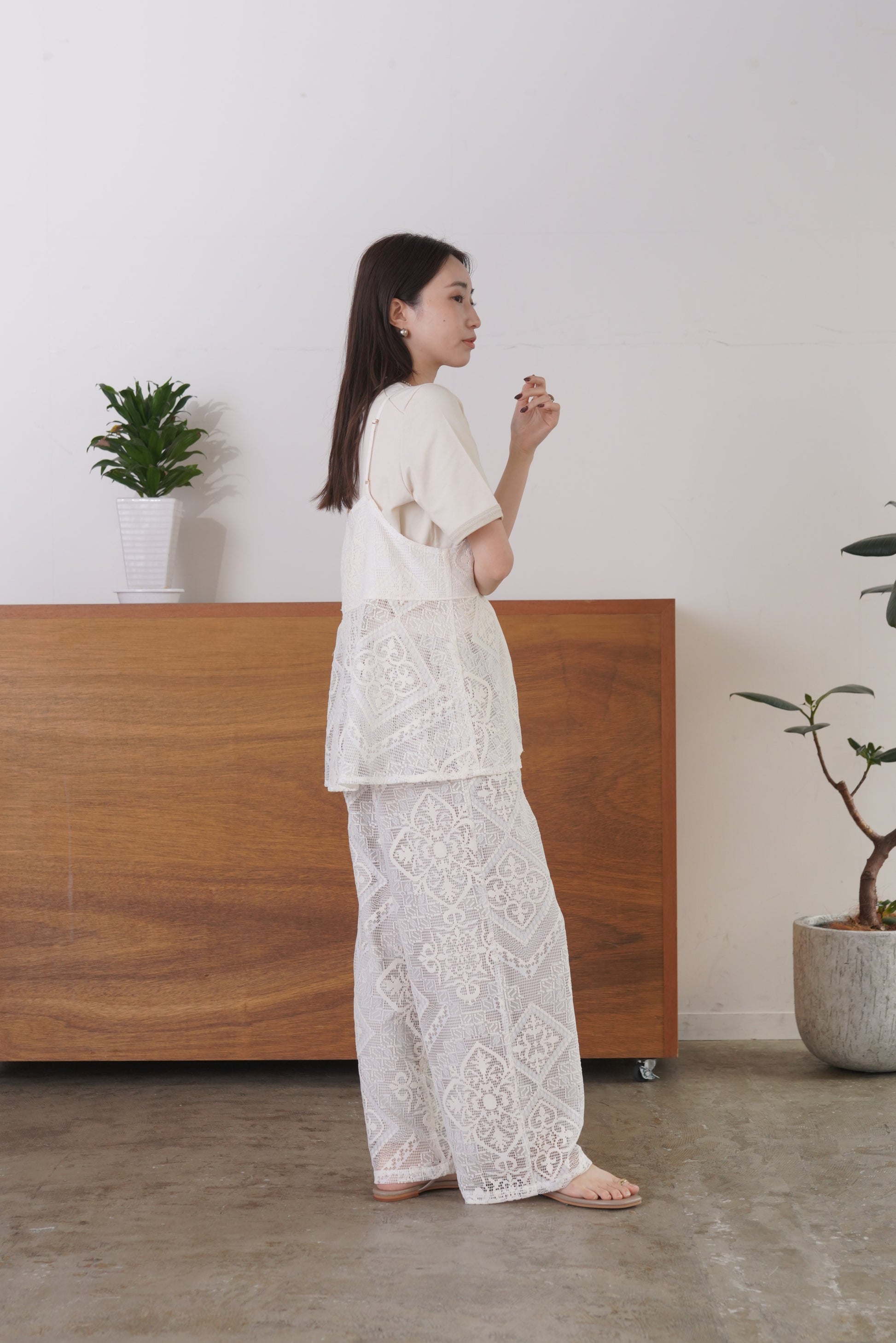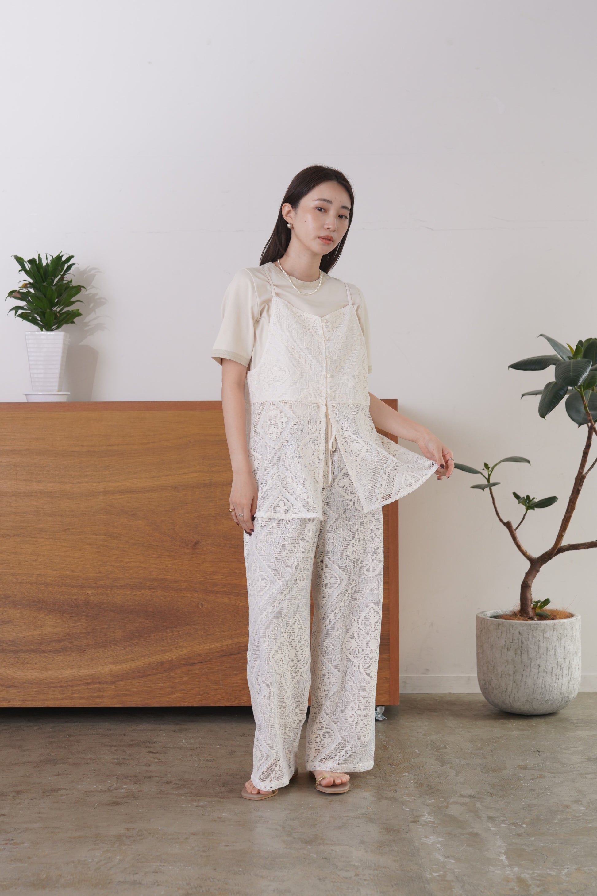 COMMENT▼ クラフト感がある大柄のラッセルレースパンツ。ストレッチ裏地が裾までついており、透けの心配はありません。ウエストは総ゴムで、ドローコードでサイズ調節ができます。同素材ビスチェとのセットアップもおすすめです。