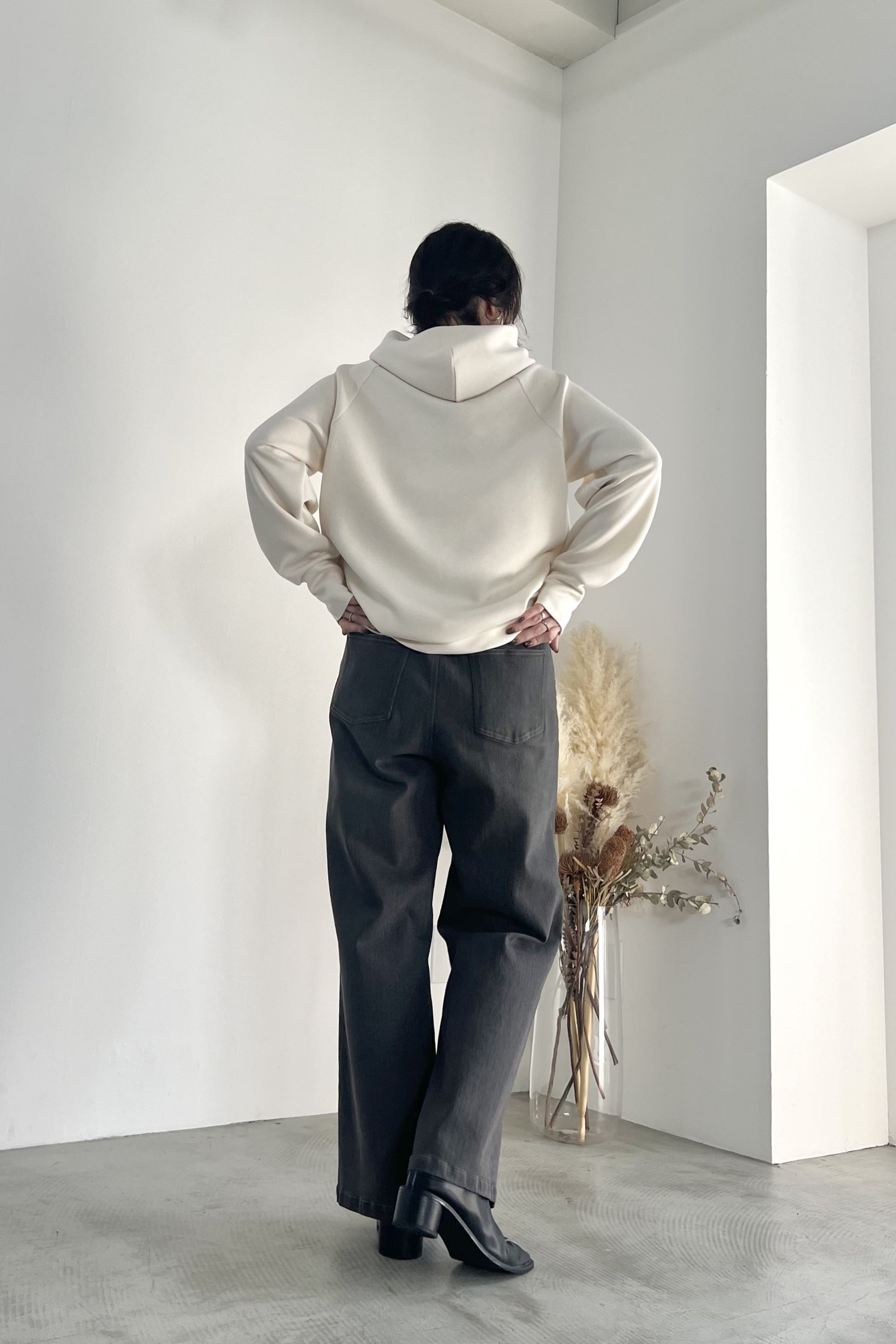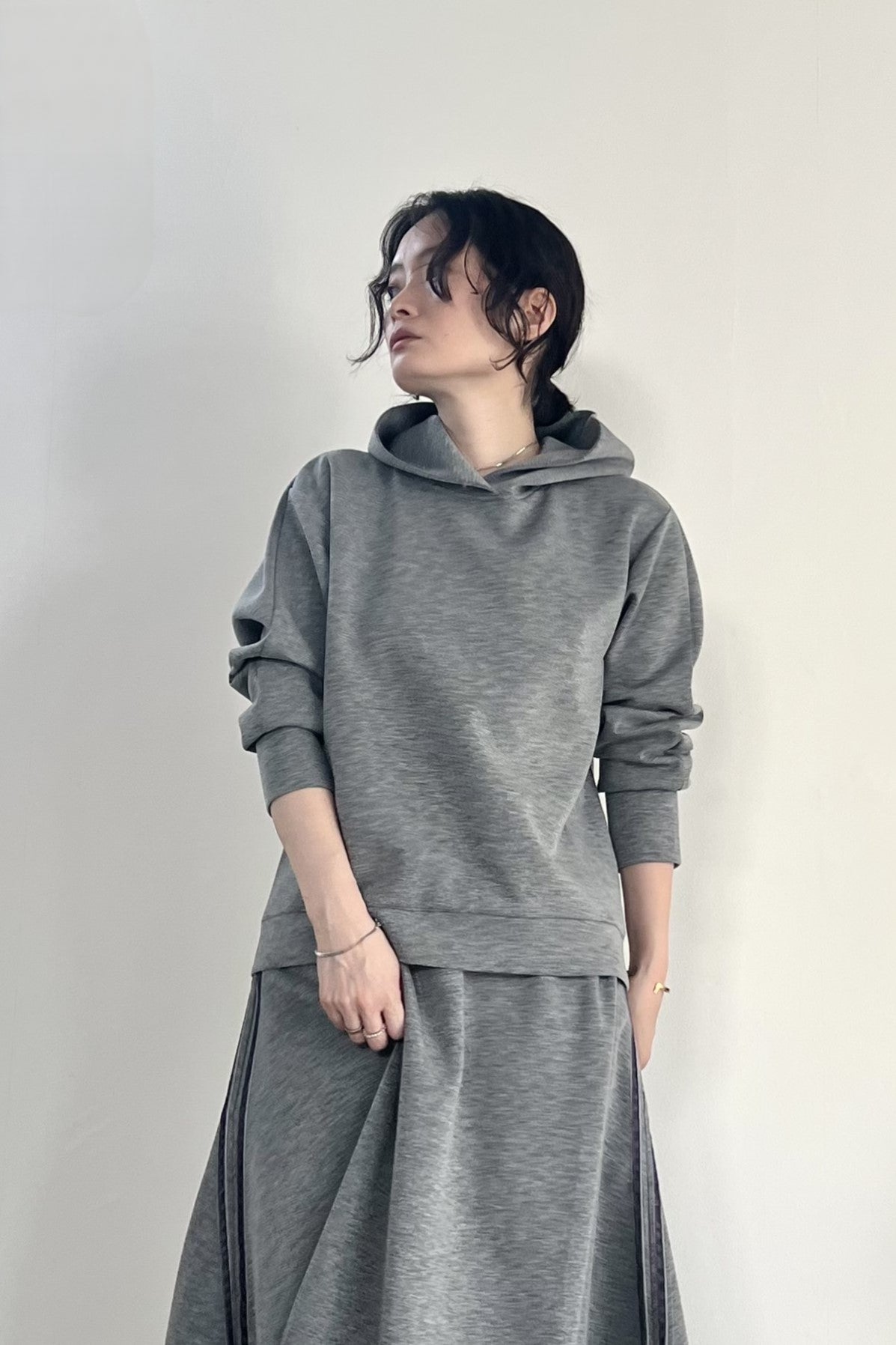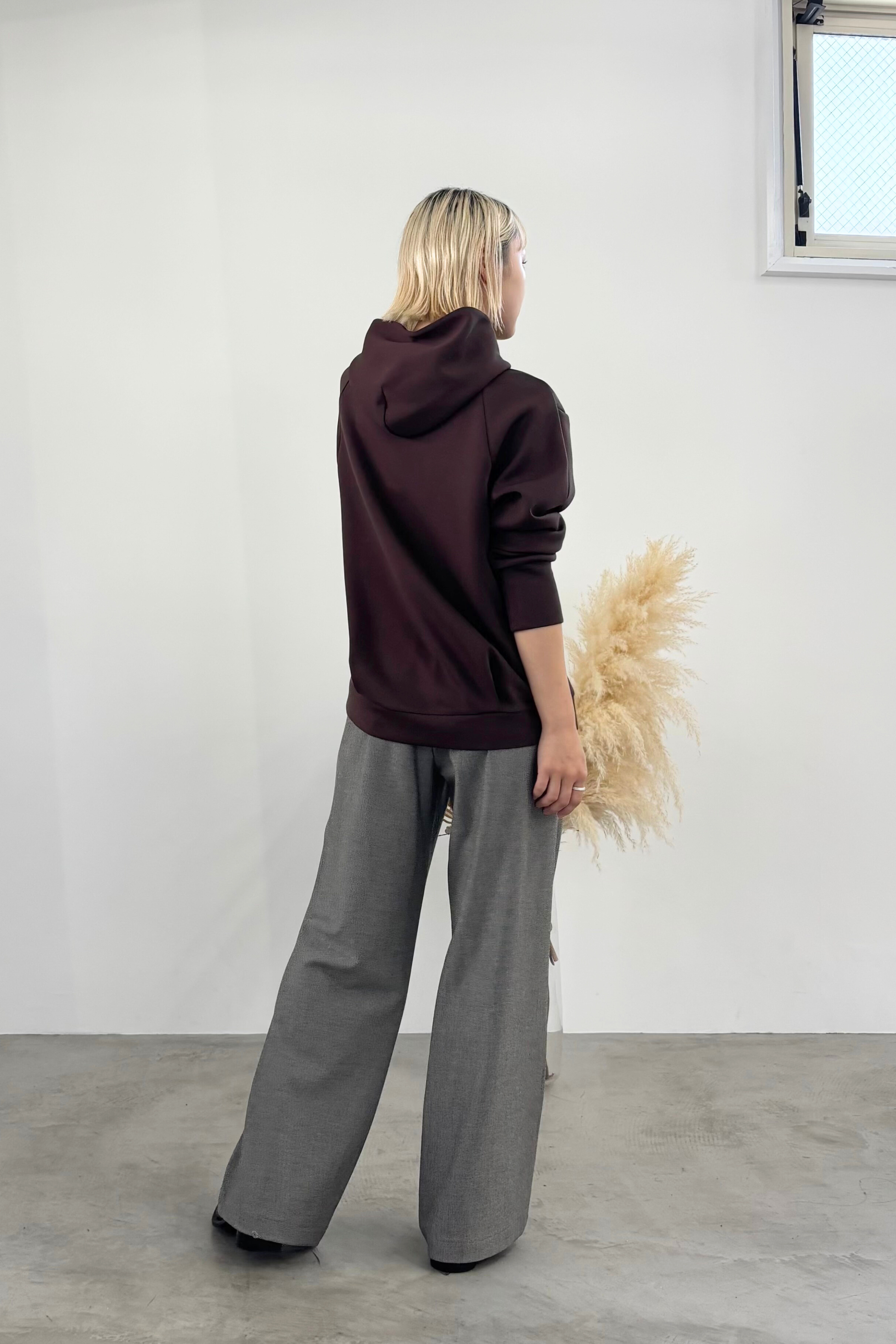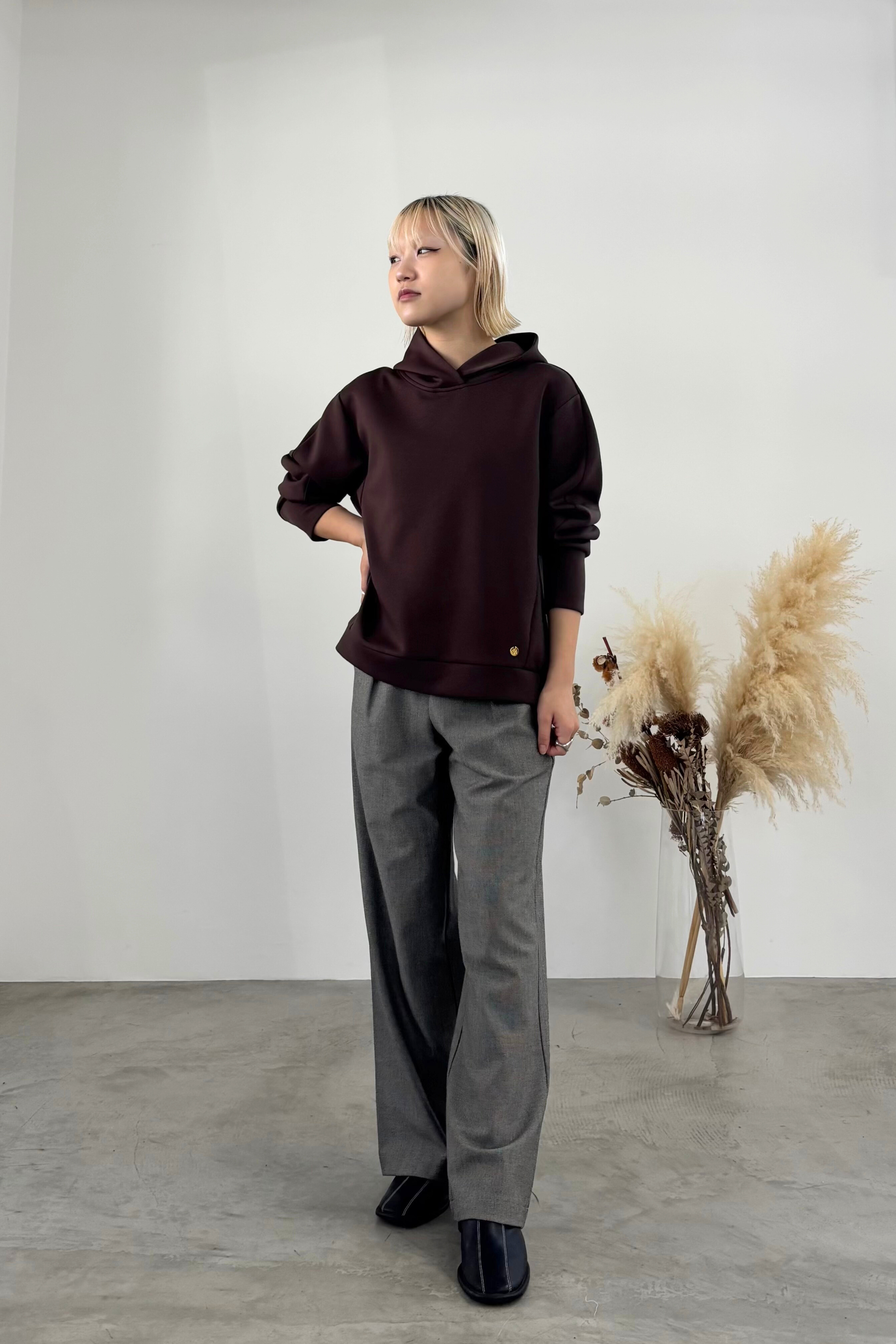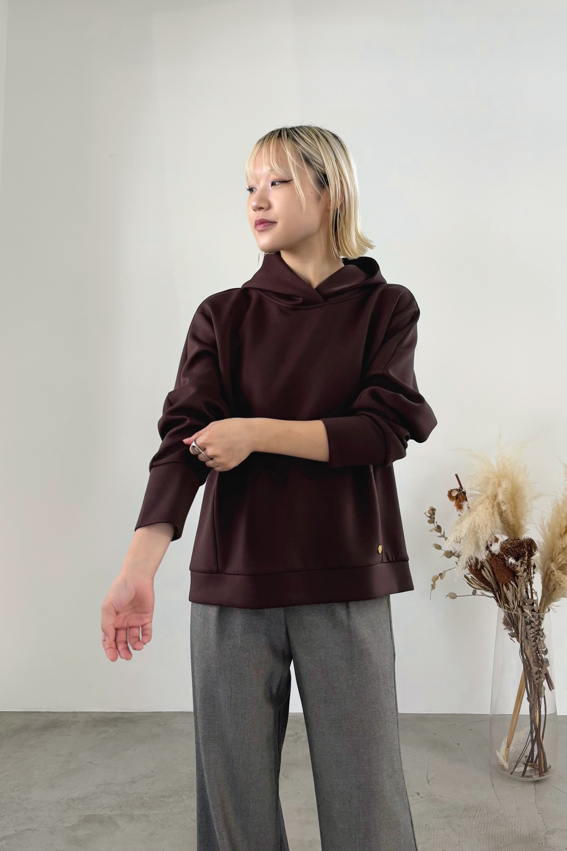きれいな表面感とストレッチ性の高いダンボール素材を使用したフーディーです。あえてディテールをそぎ落とし、着回しやすさを重視しました。比較的コンパクトなサイズ感なので、アウターを選ばず着用していただけます。