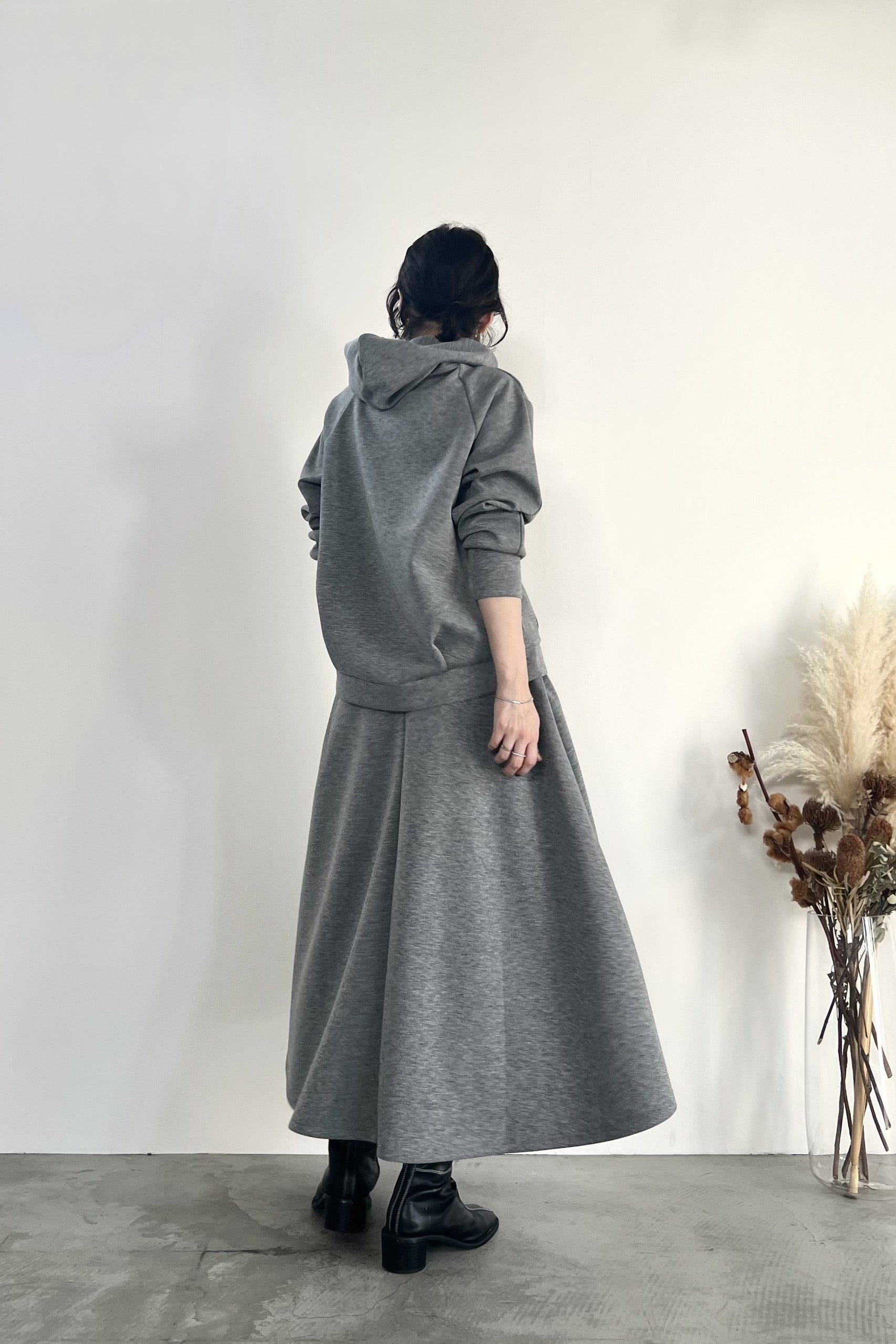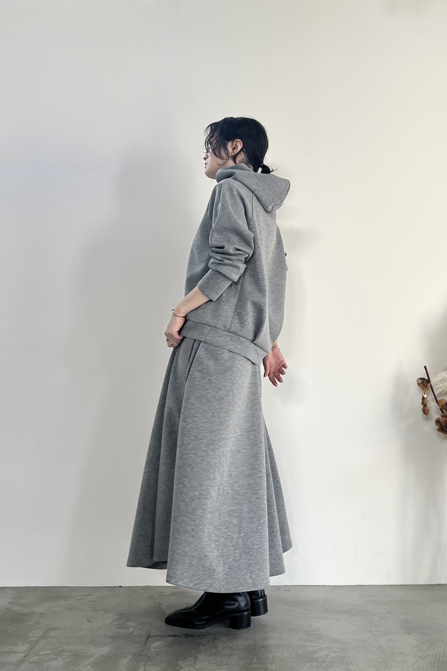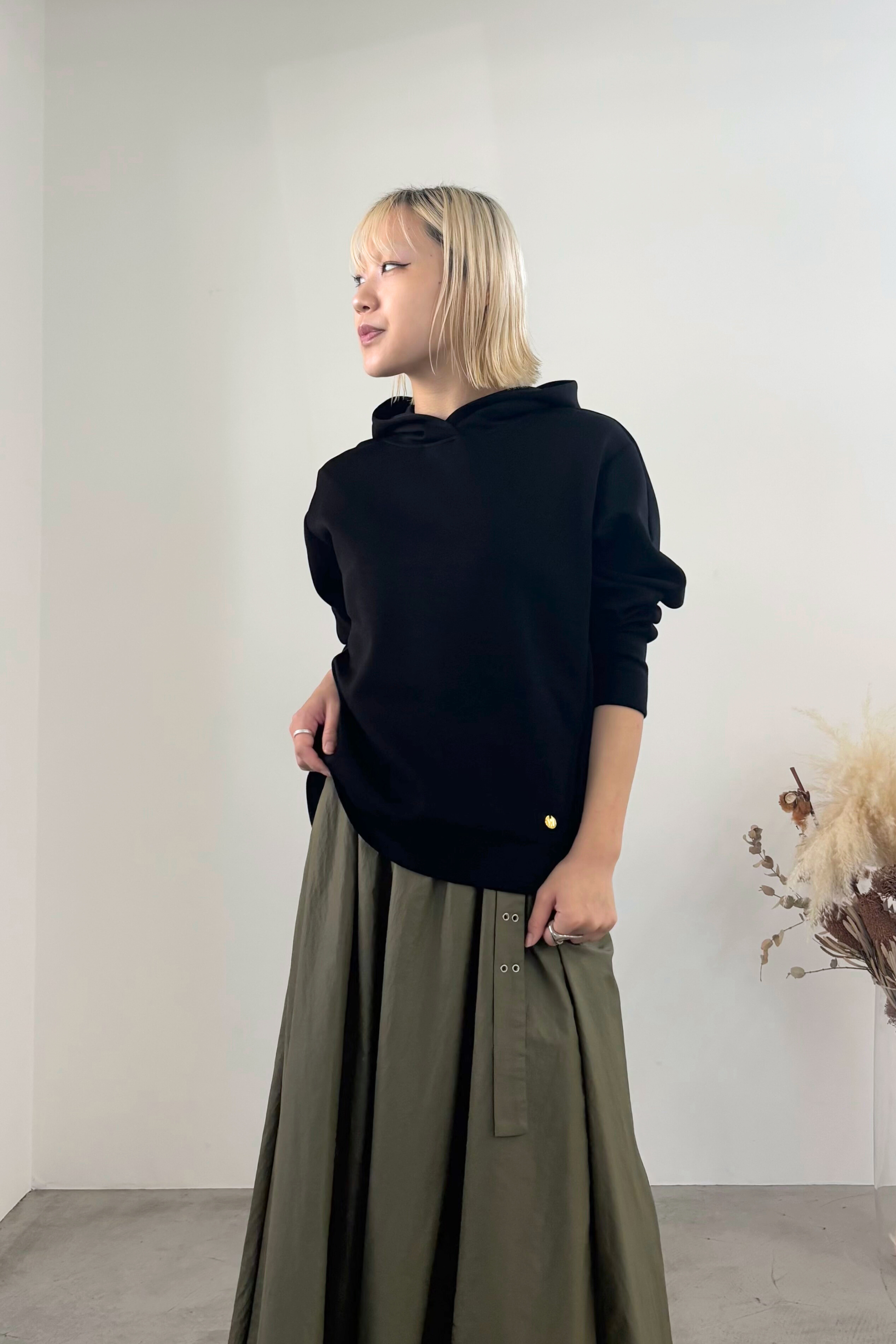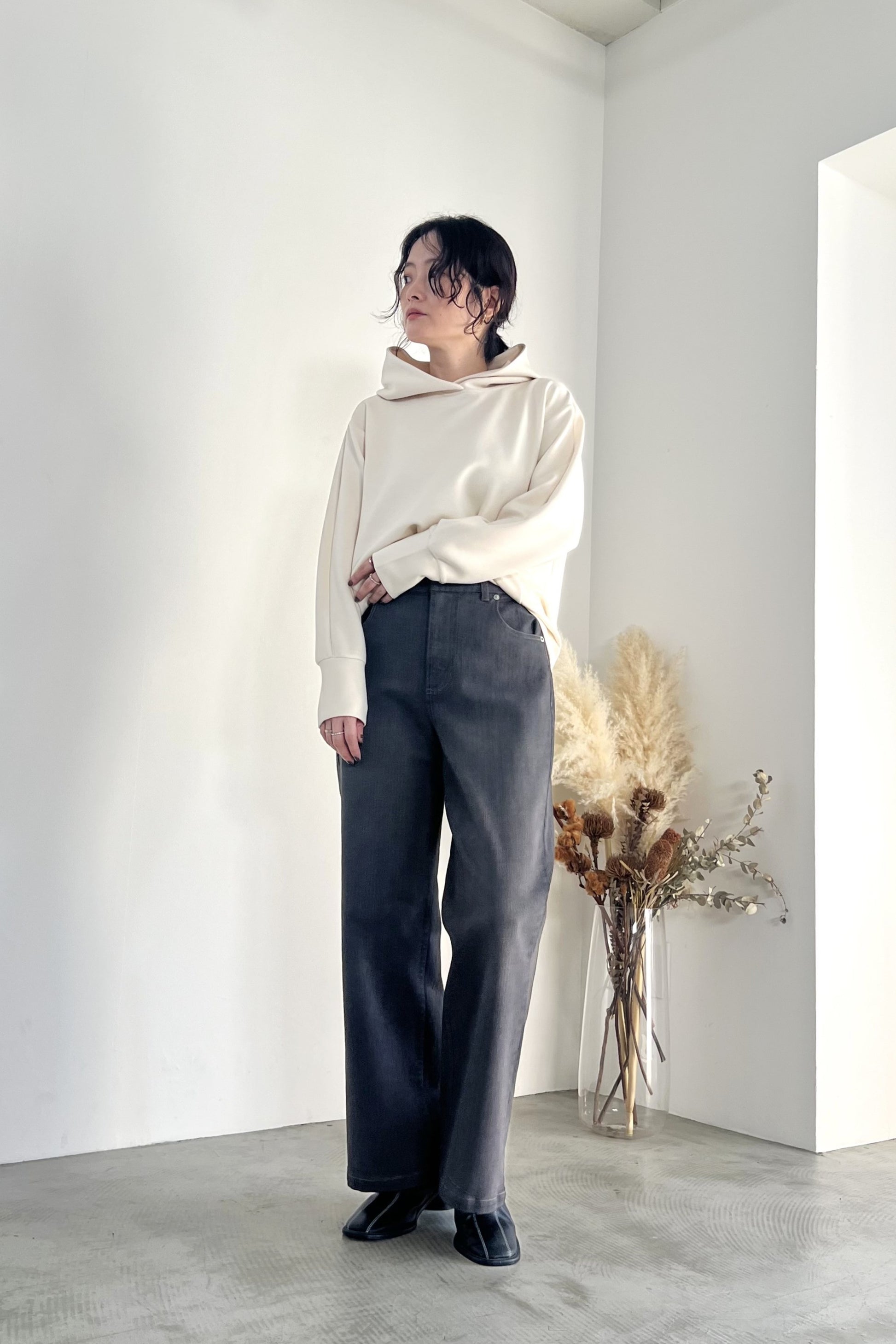 きれいな表面感とストレッチ性の高いダンボール素材を使用したフーディーです。あえてディテールをそぎ落とし、着回しやすさを重視しました。比較的コンパクトなサイズ感なので、アウターを選ばず着用していただけます。