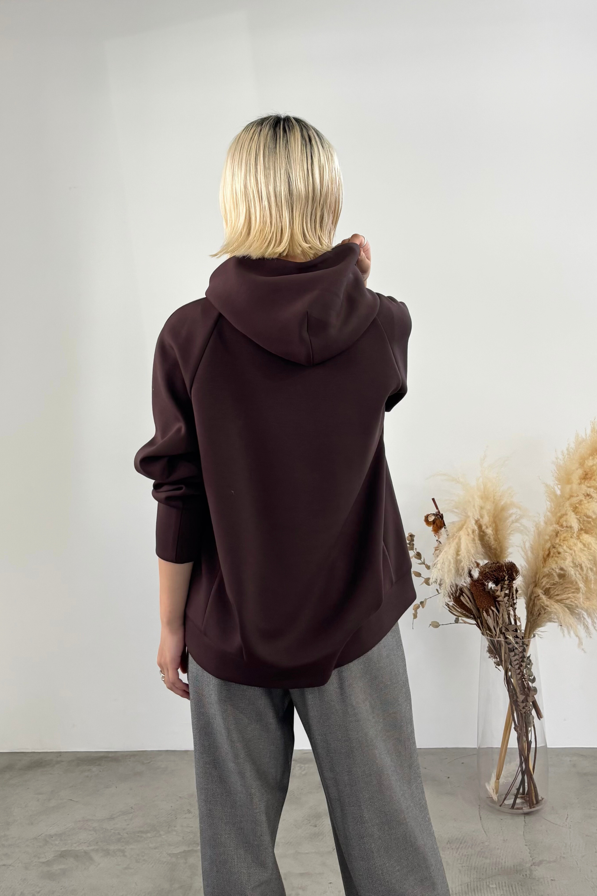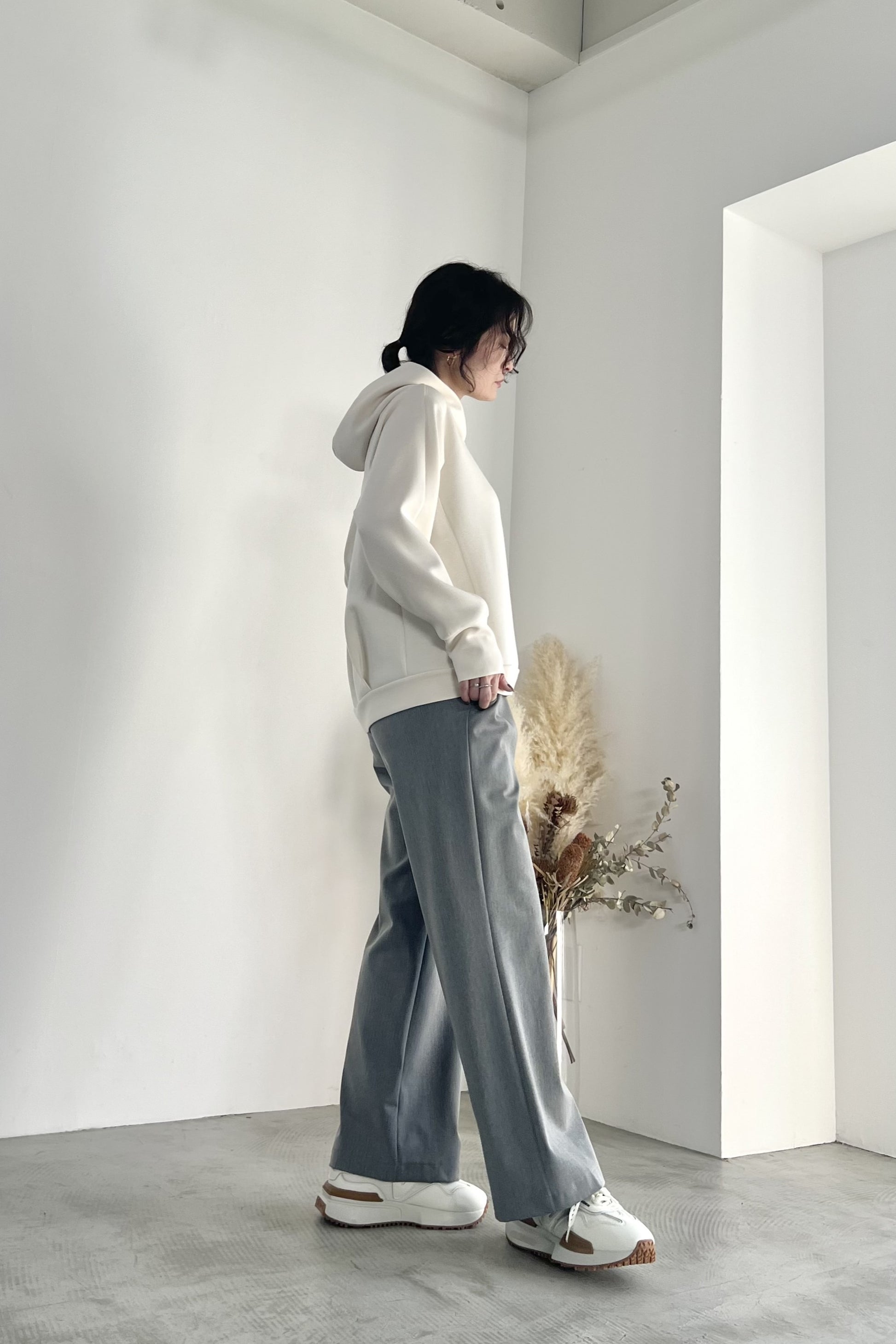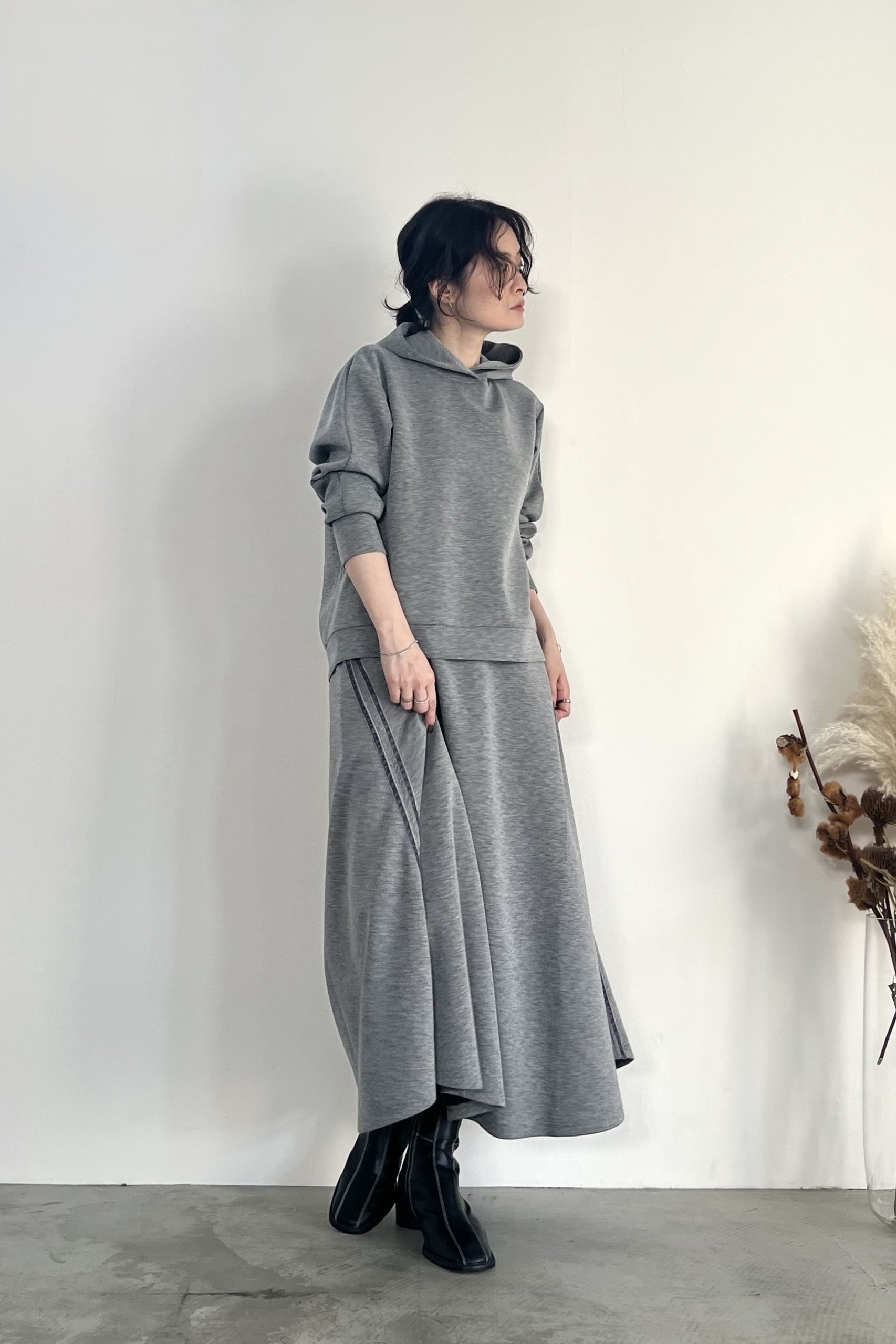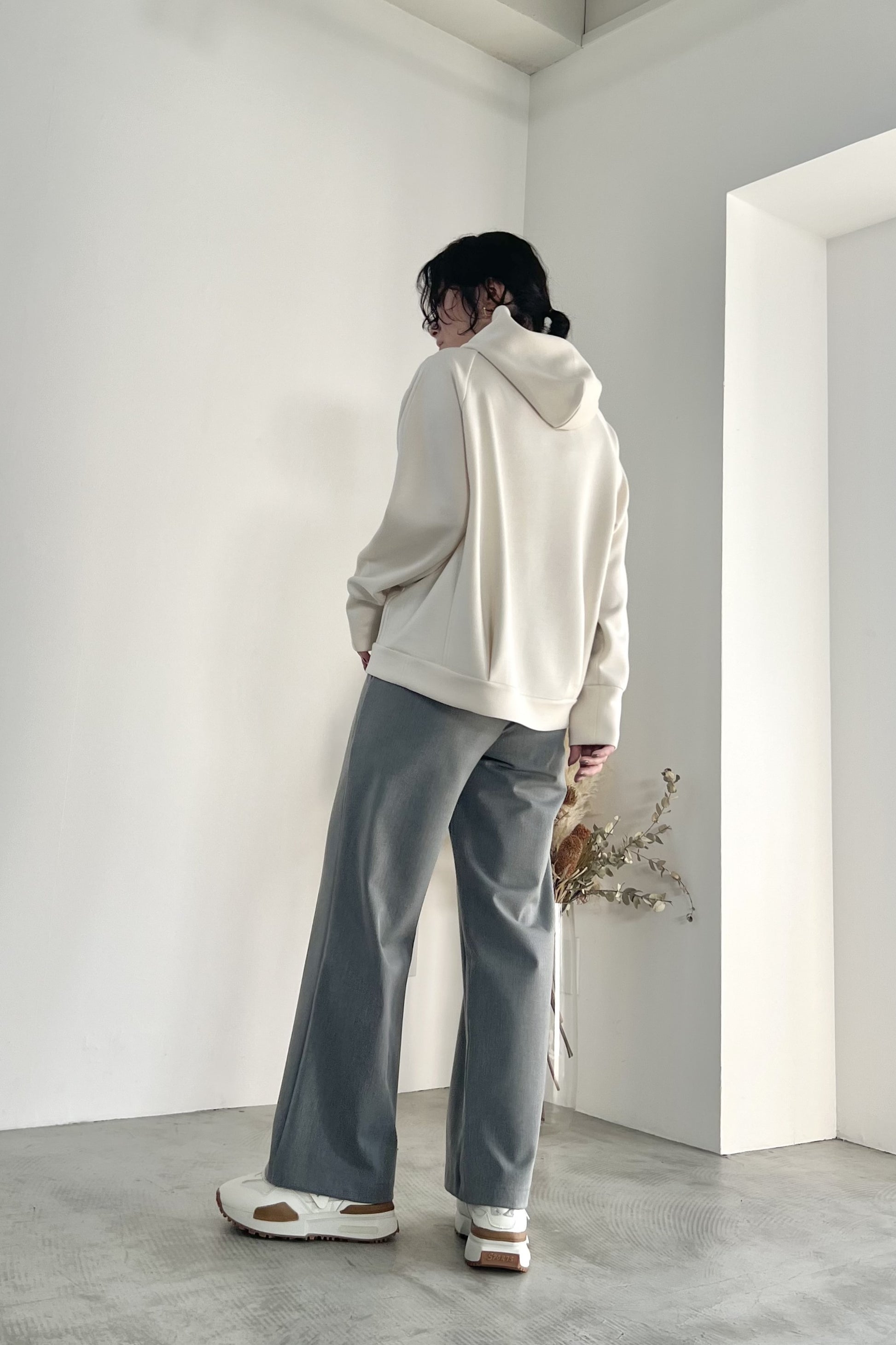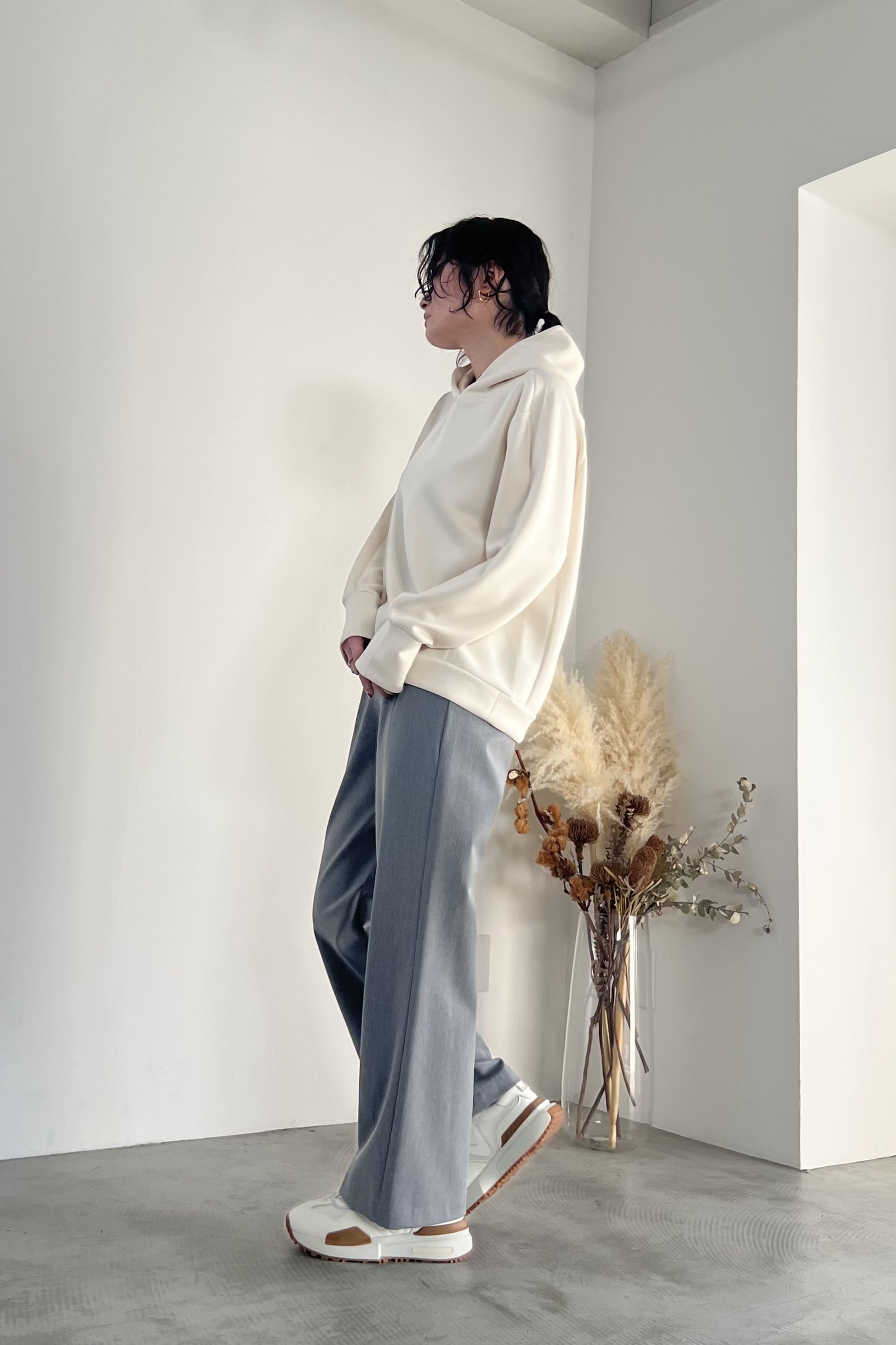 きれいな表面感とストレッチ性の高いダンボール素材を使用したフーディーです。あえてディテールをそぎ落とし、着回しやすさを重視しました。比較的コンパクトなサイズ感なので、アウターを選ばず着用していただけます。