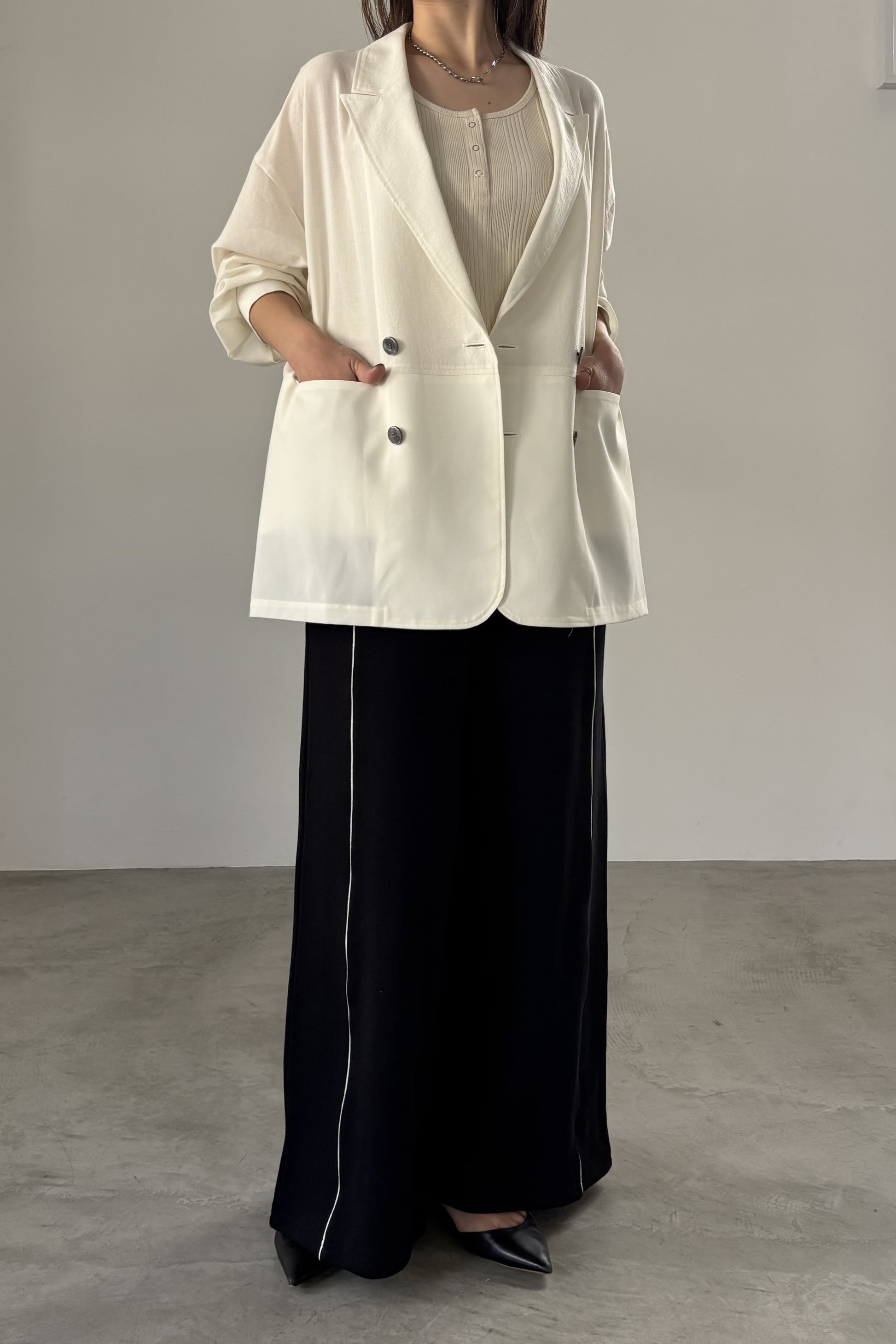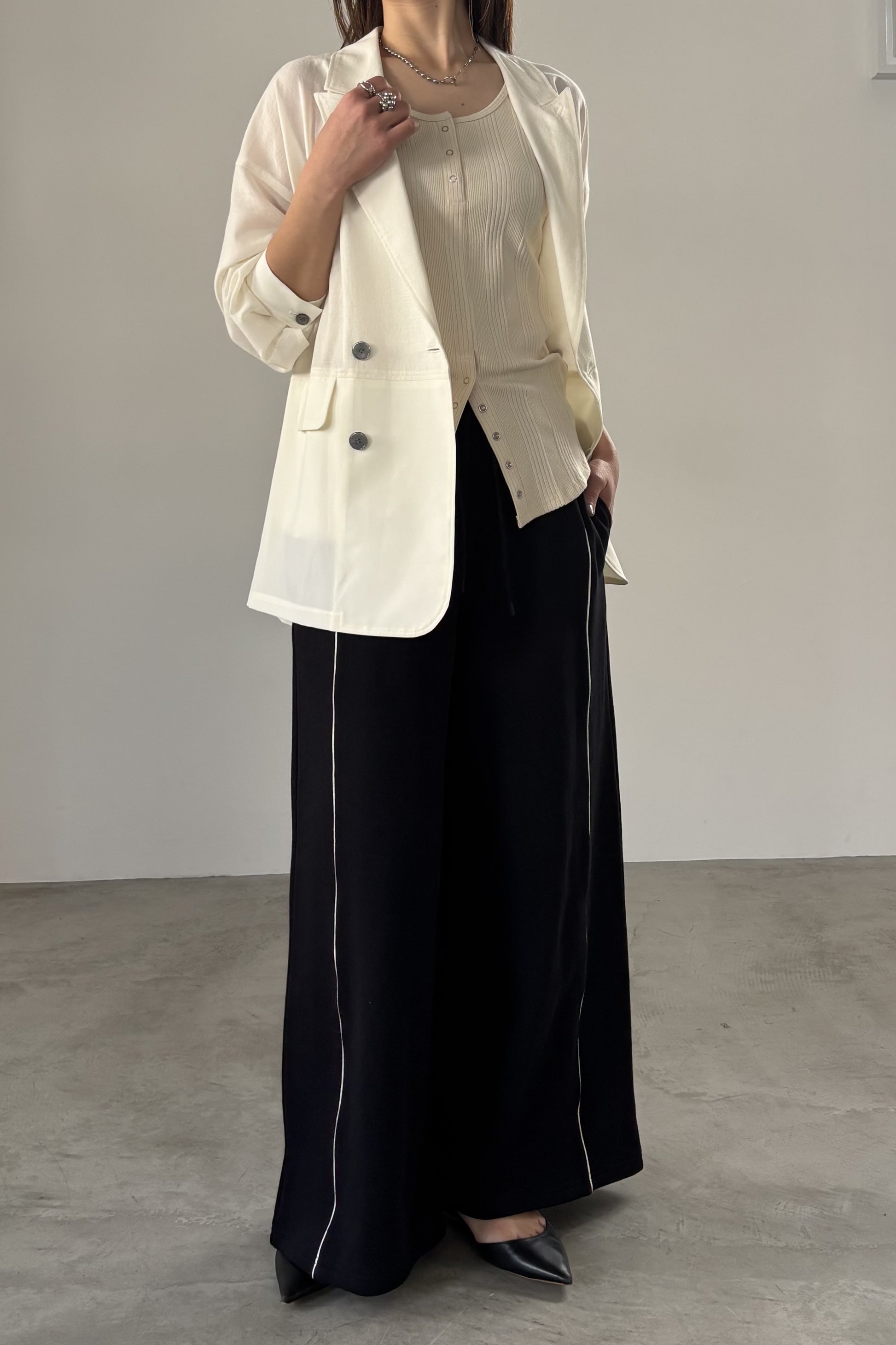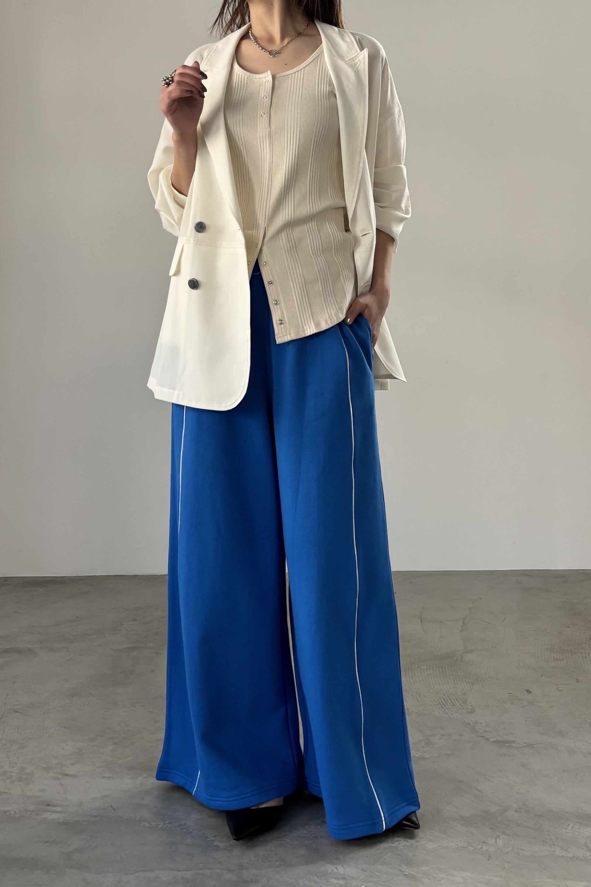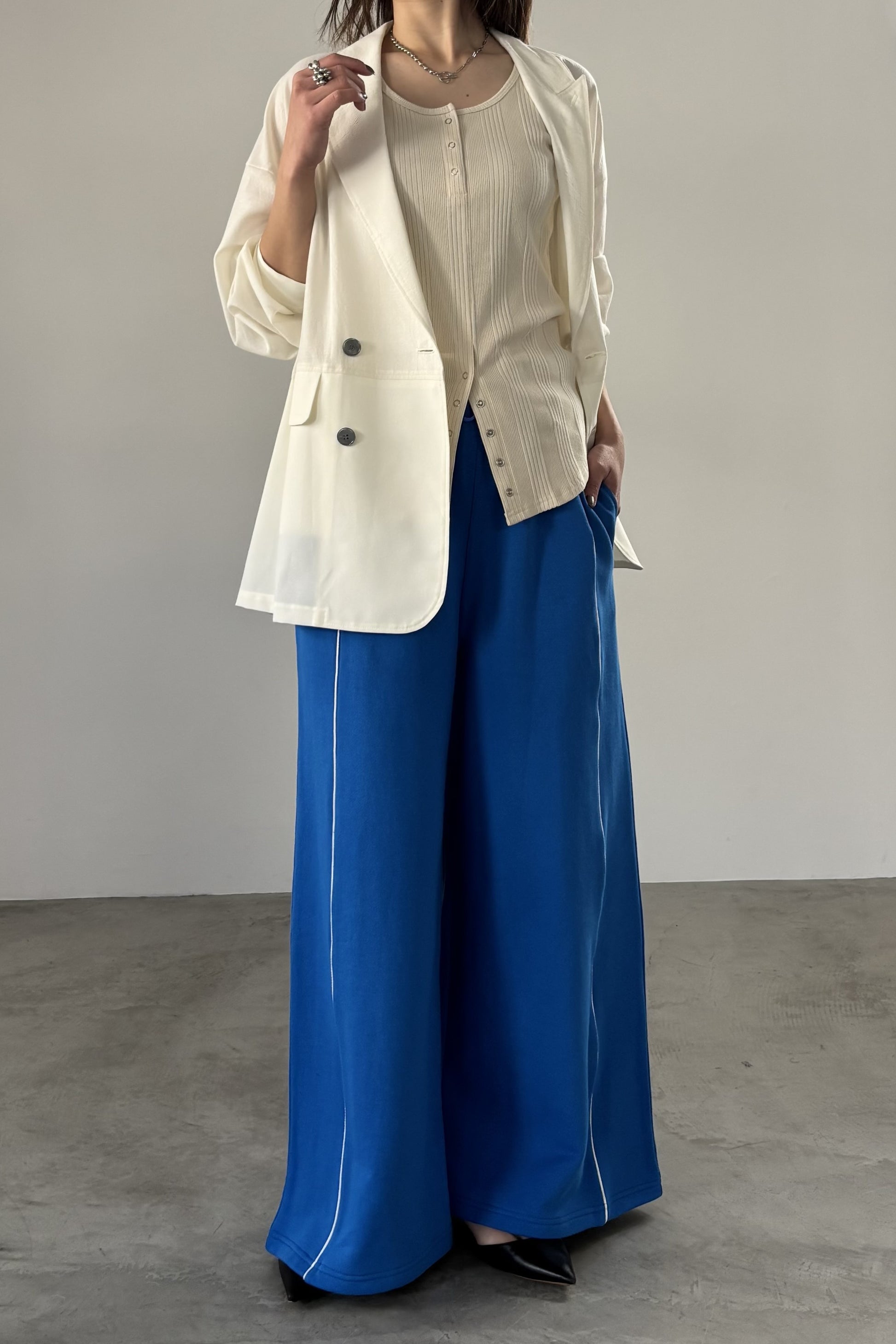 膨らみのあるベーシックな国産裏毛を使用したスウェットパンン。サイドに切り替えを入れ、裾に向かって広がるワイドシルエットに仕上げました。切り替え部分に施した配色のラインがポイントです。同素材のプルオーバーとのセットアップもおすすめです。