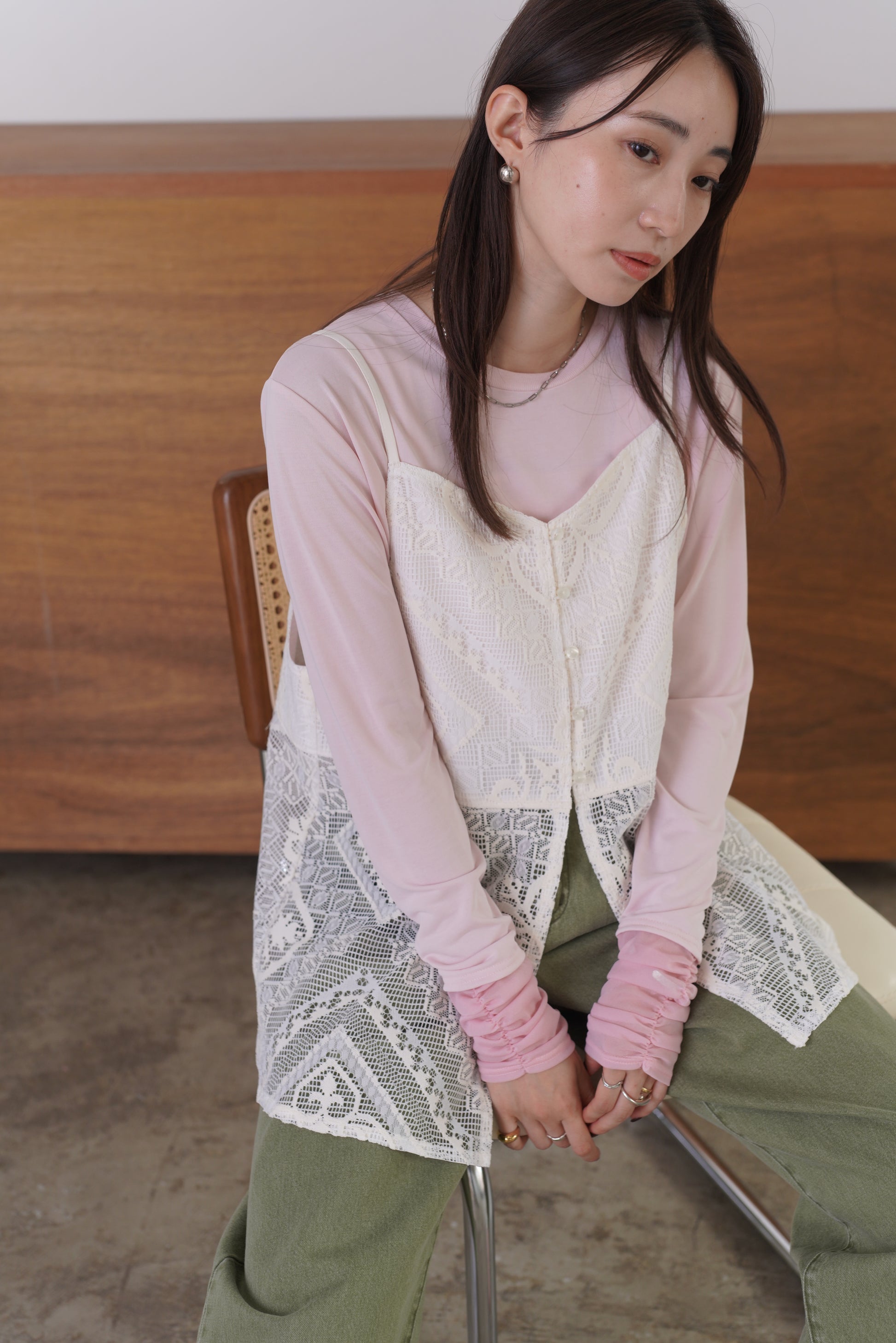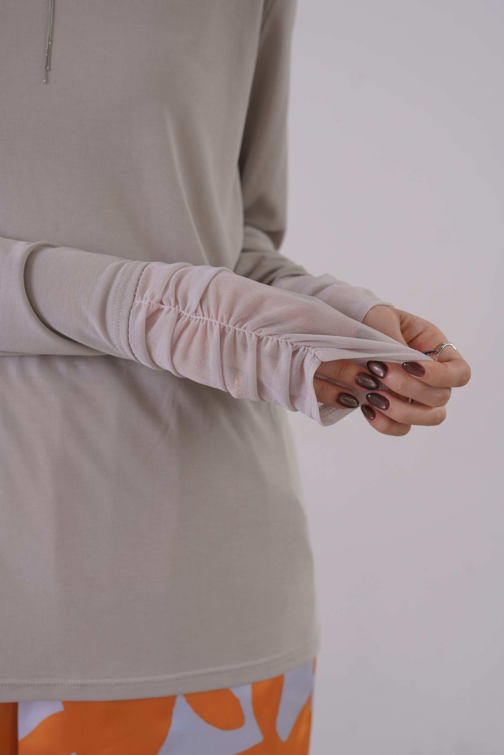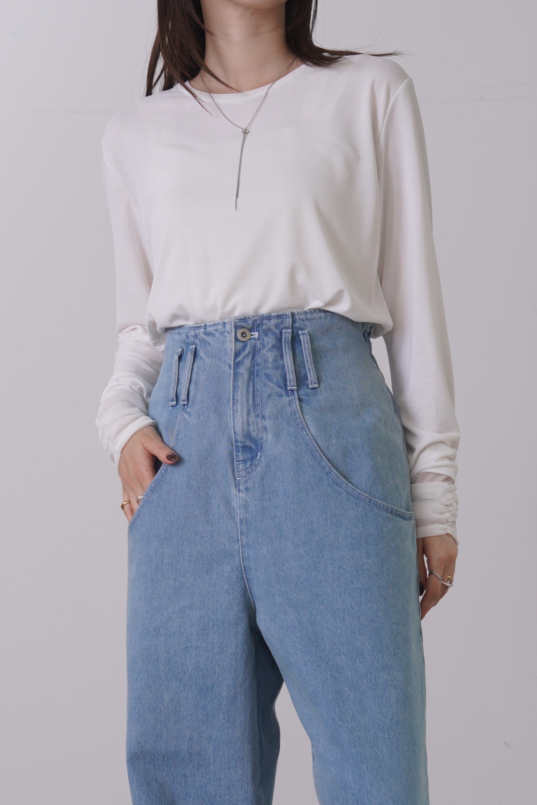 薄手でソフトタッチのカットソー。袖口にギャザーを寄せたシアーシフォンを組み合わせ、手首に生地が溜まるような見え方に仕上げました。ぴたっとしすぎない、ゆとりのあるサイズ感です。