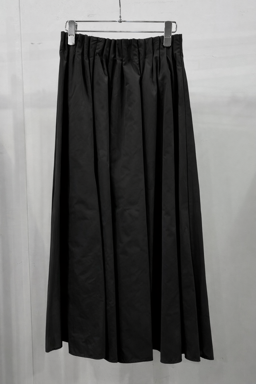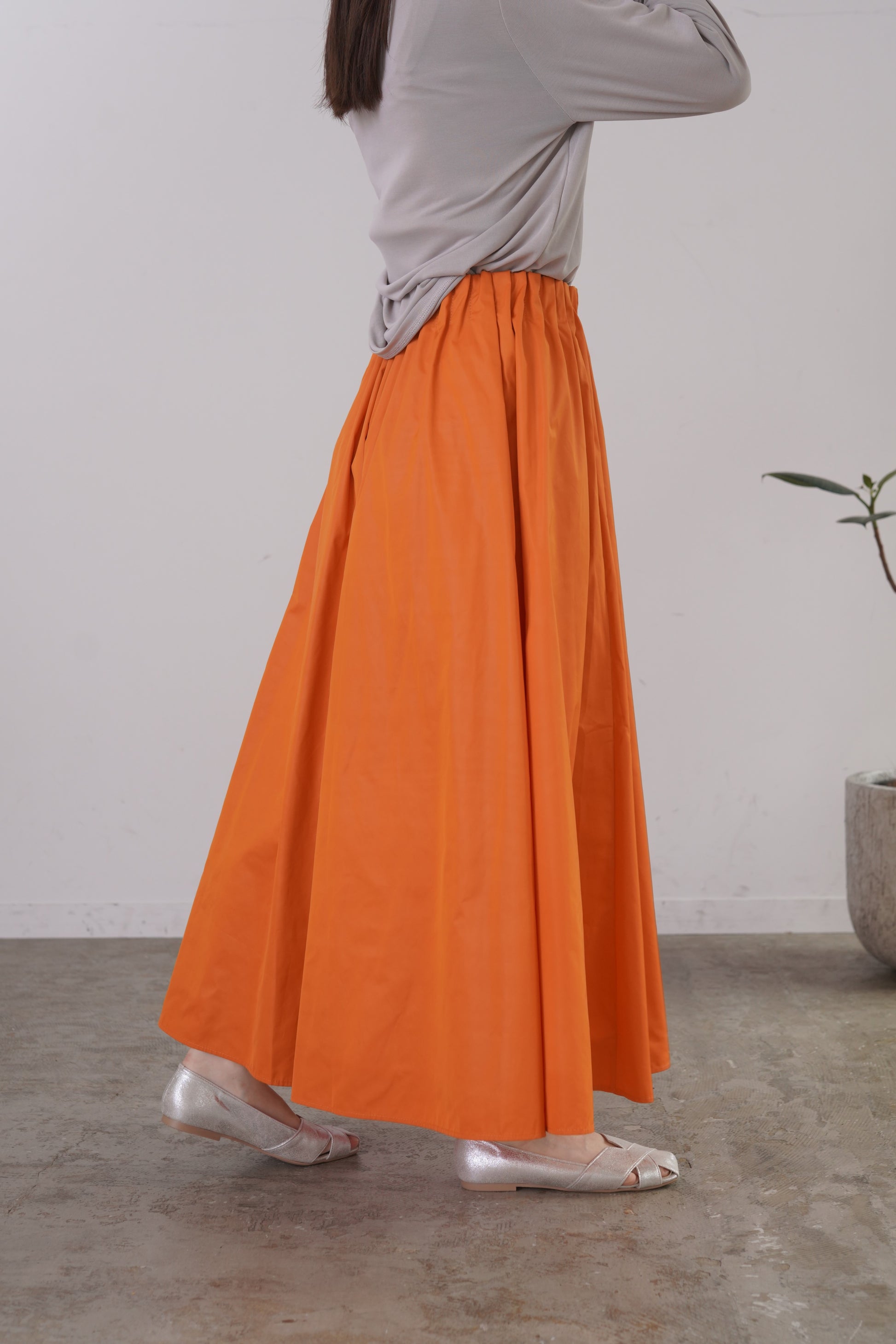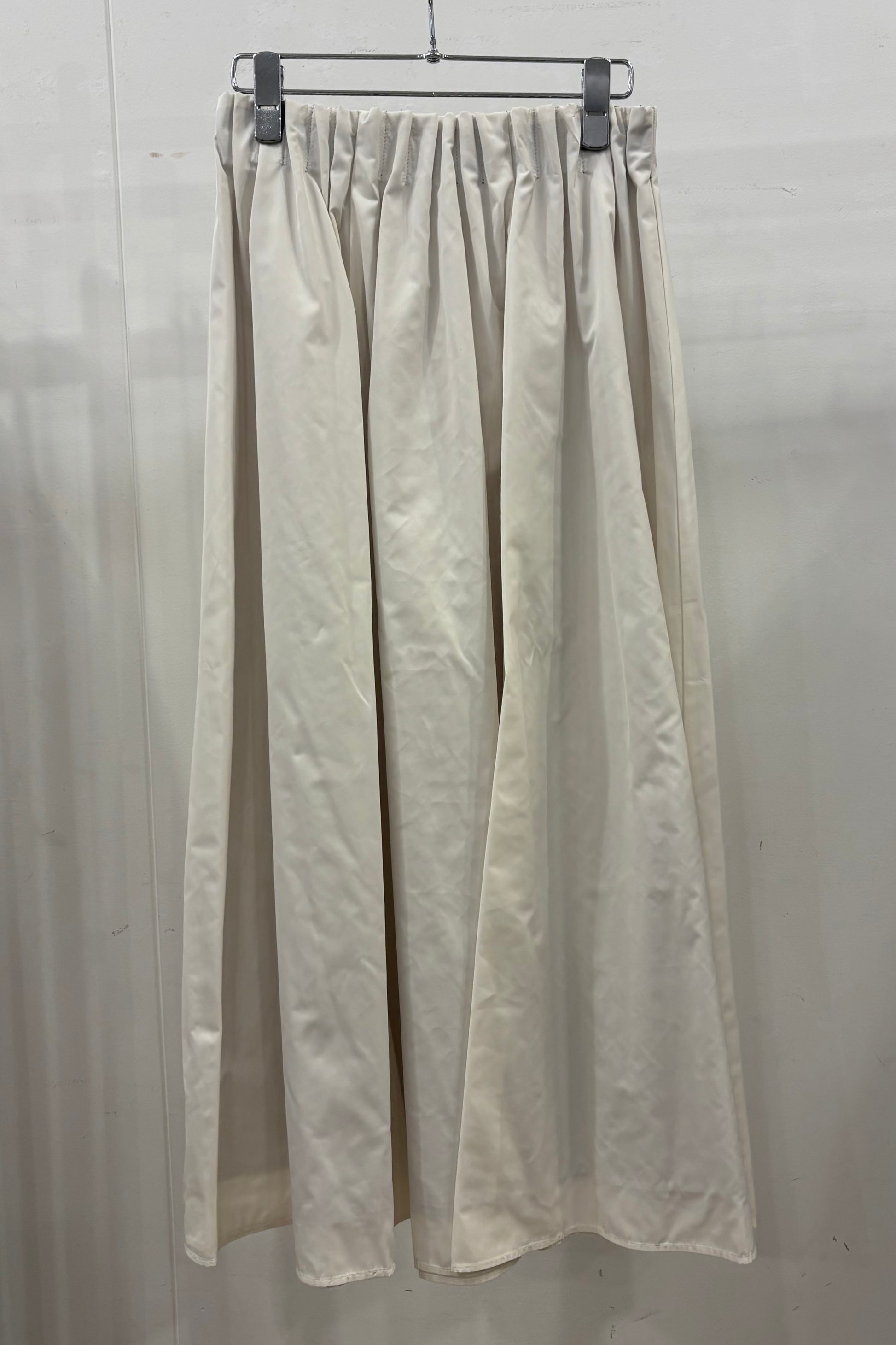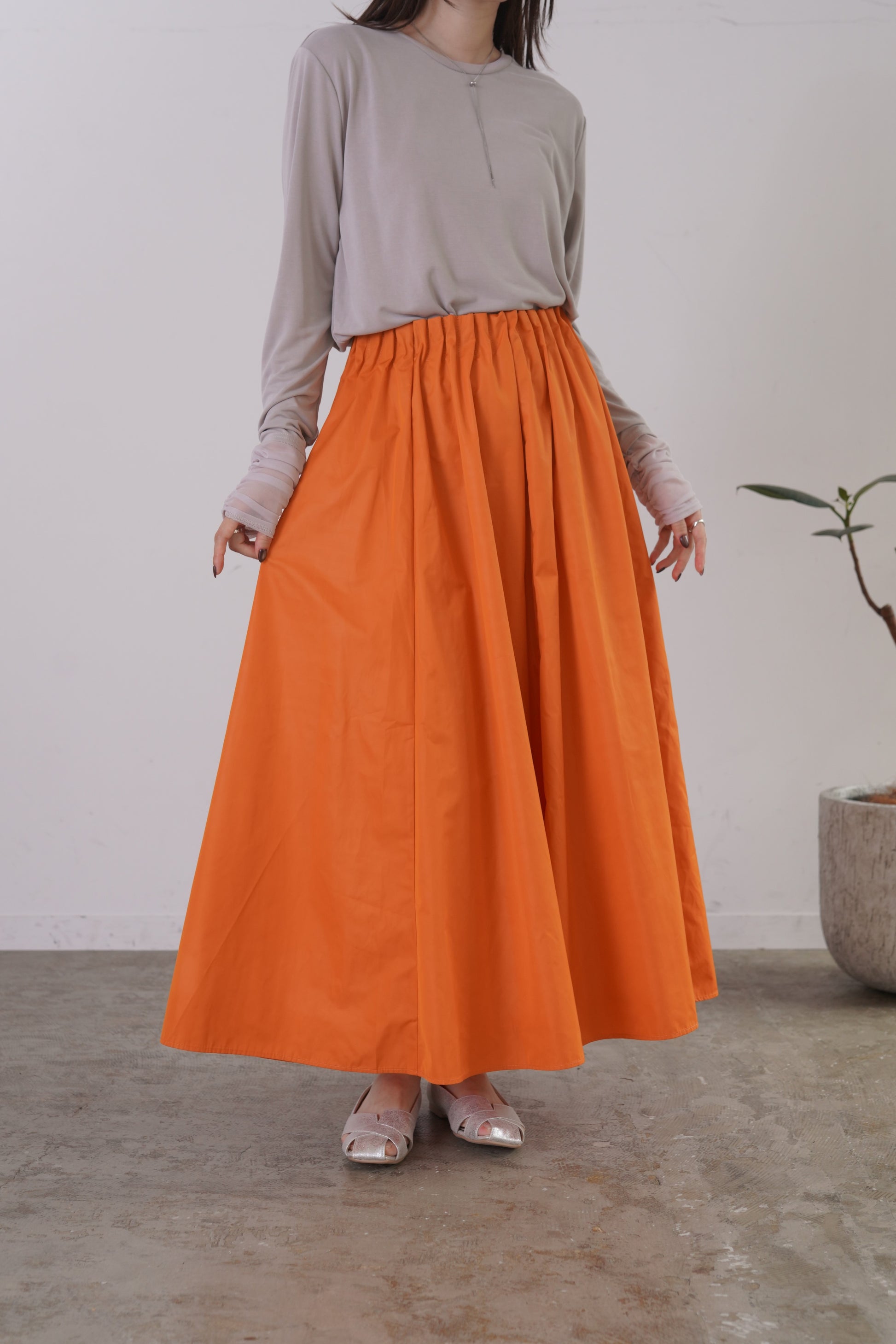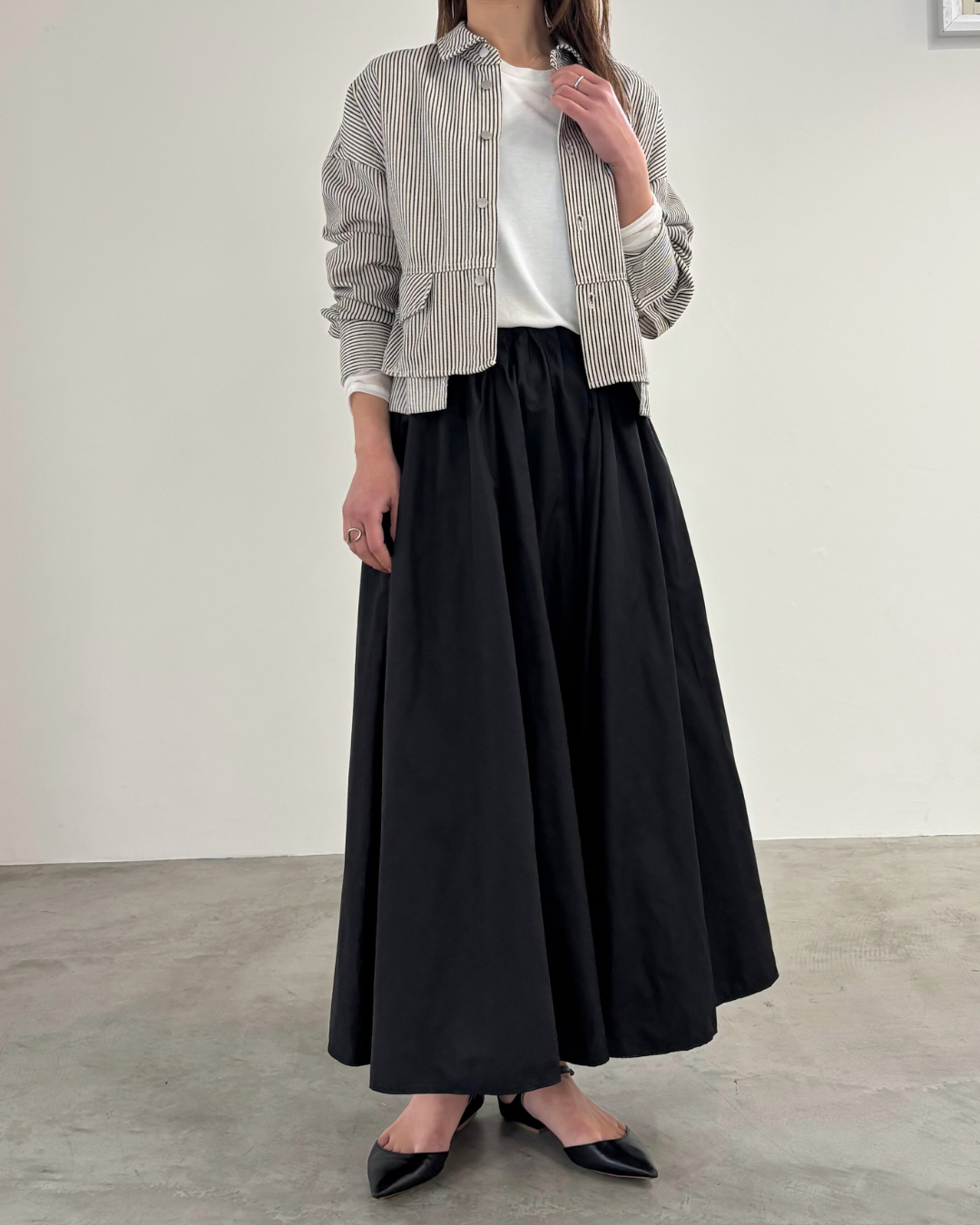 柔らかい風合いのタフタを使用した、6枚剥ぎのフレアスカート。ウエストに細かくタックをとっており、きれいめな印象を与えてくれますが、総ゴム仕様で楽に着用いただけます。