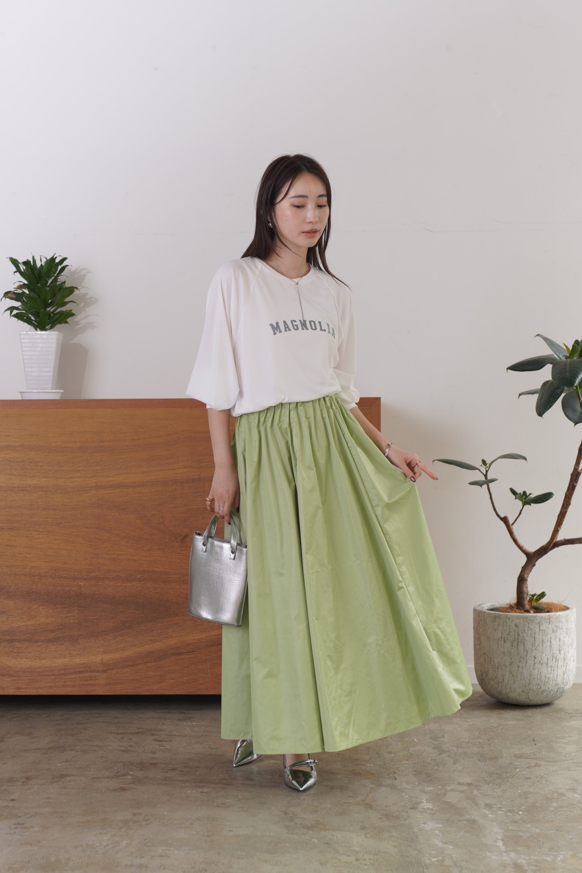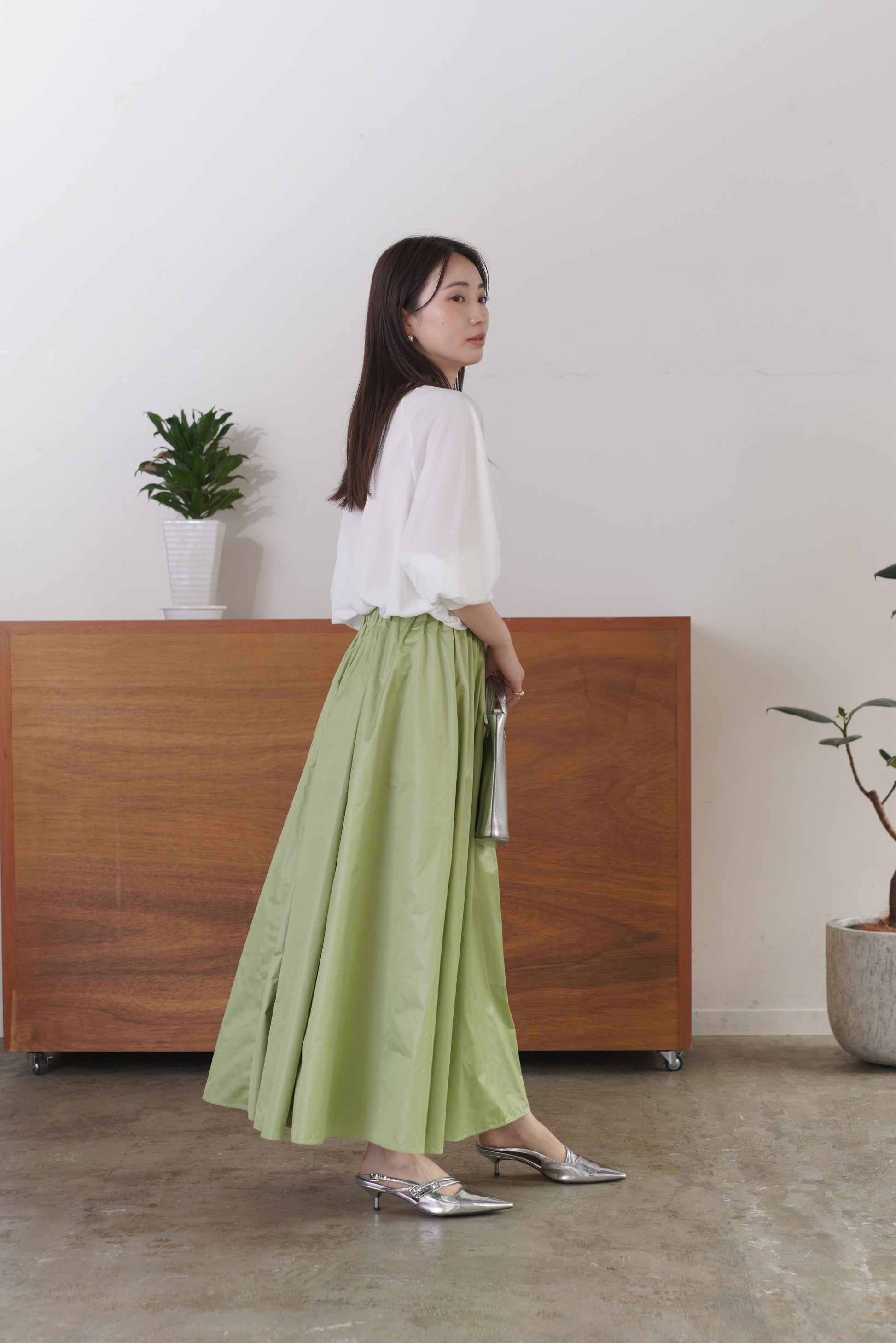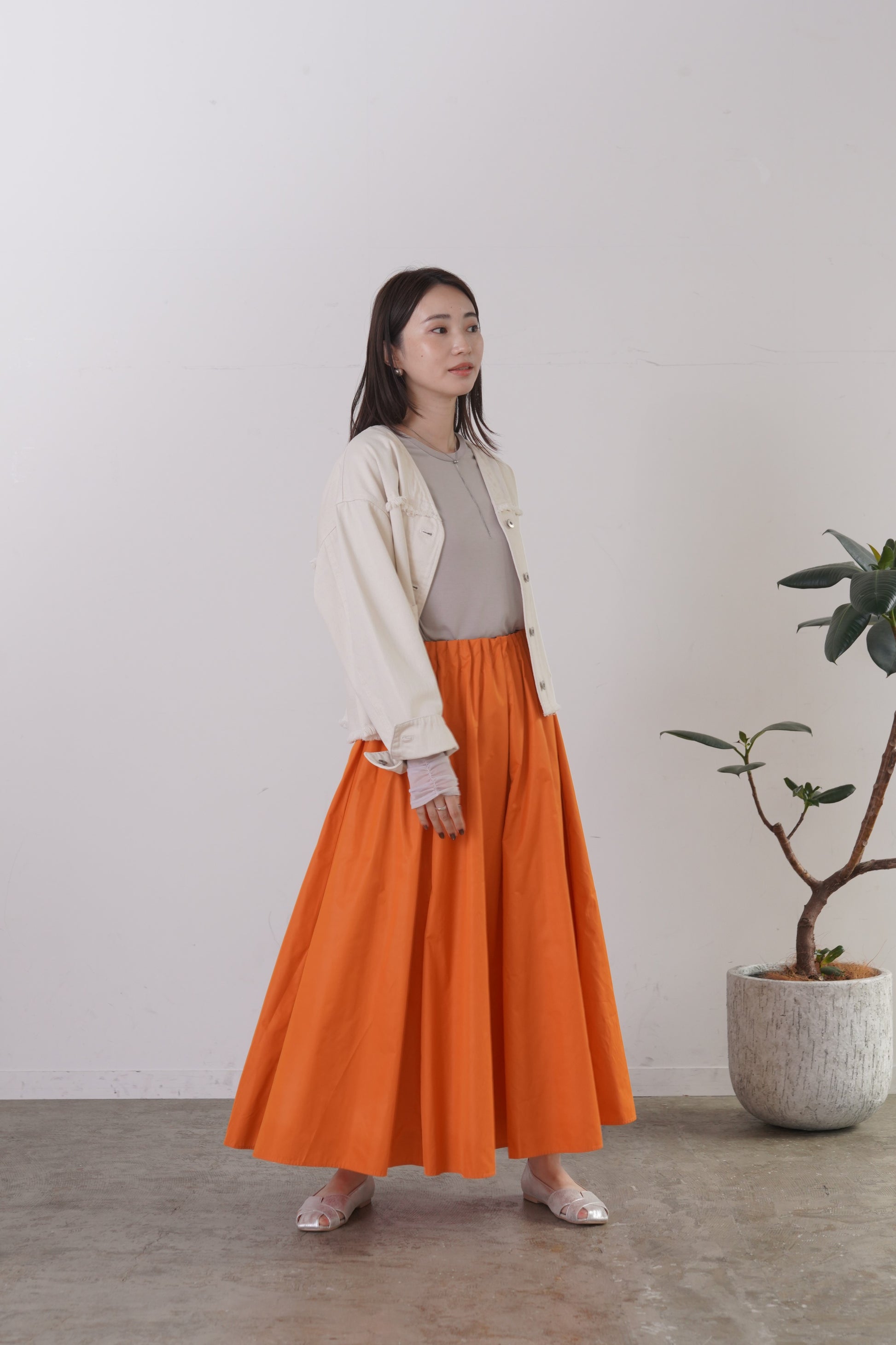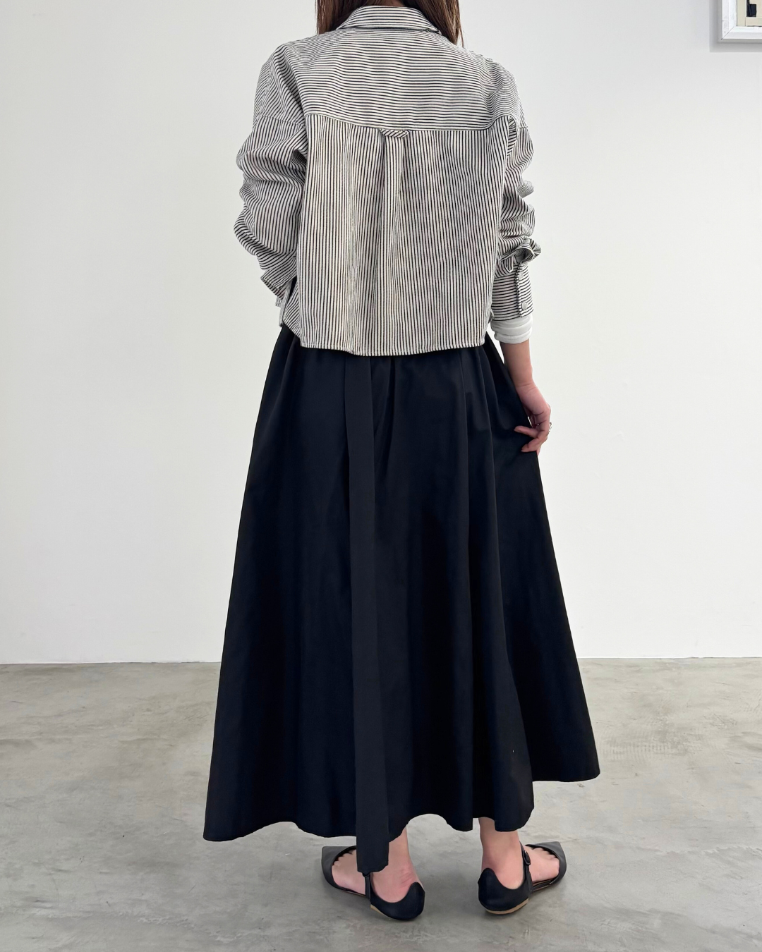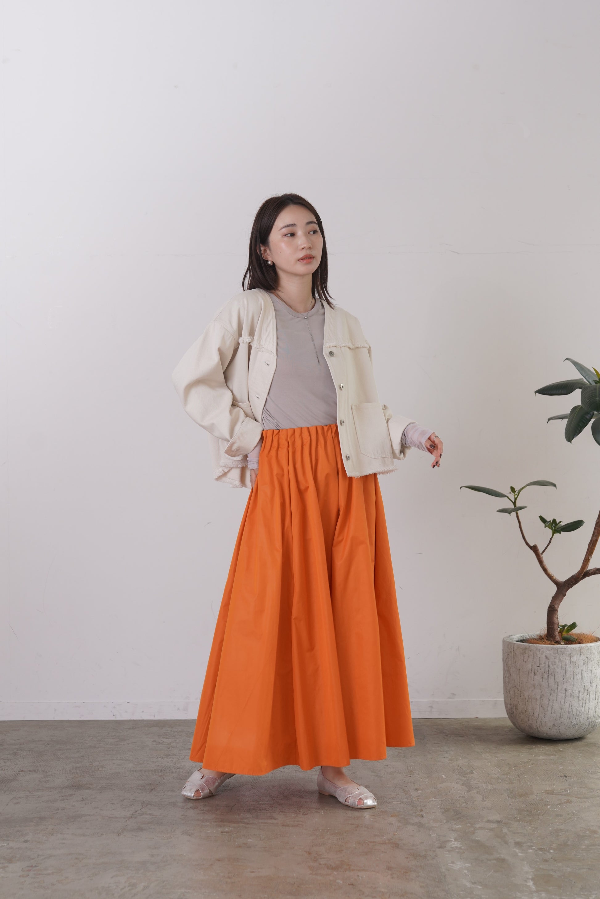 柔らかい風合いのタフタを使用した、6枚剥ぎのフレアスカート。ウエストに細かくタックをとっており、きれいめな印象を与えてくれますが、総ゴム仕様で楽に着用いただけます。