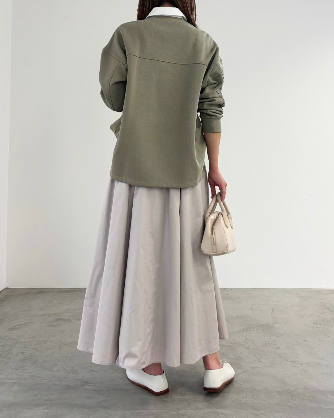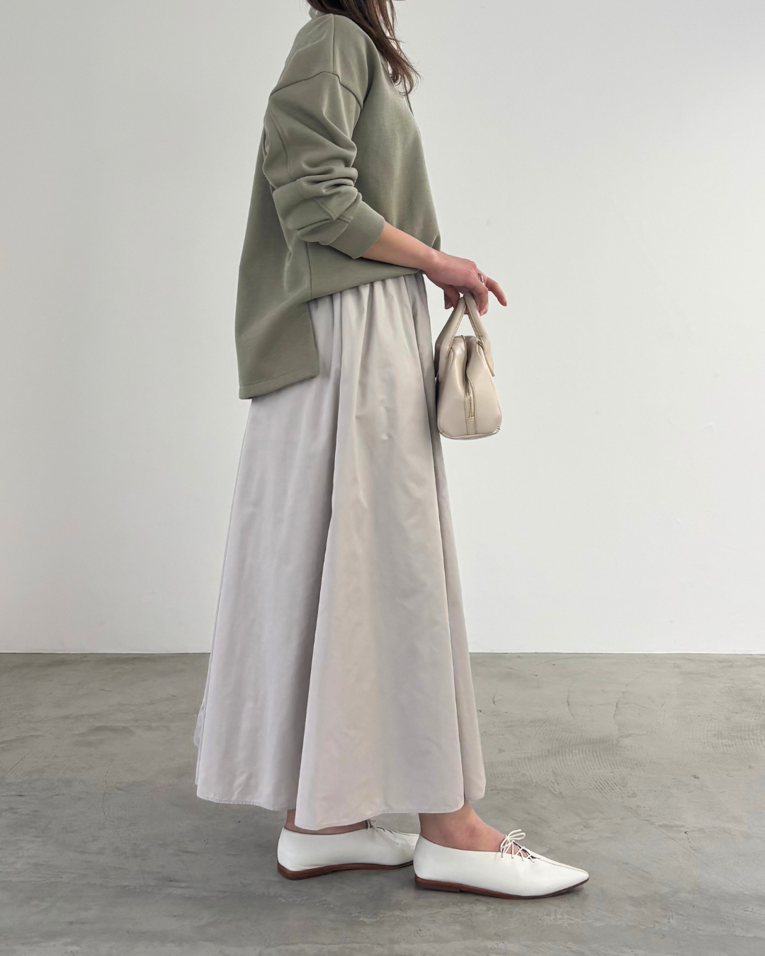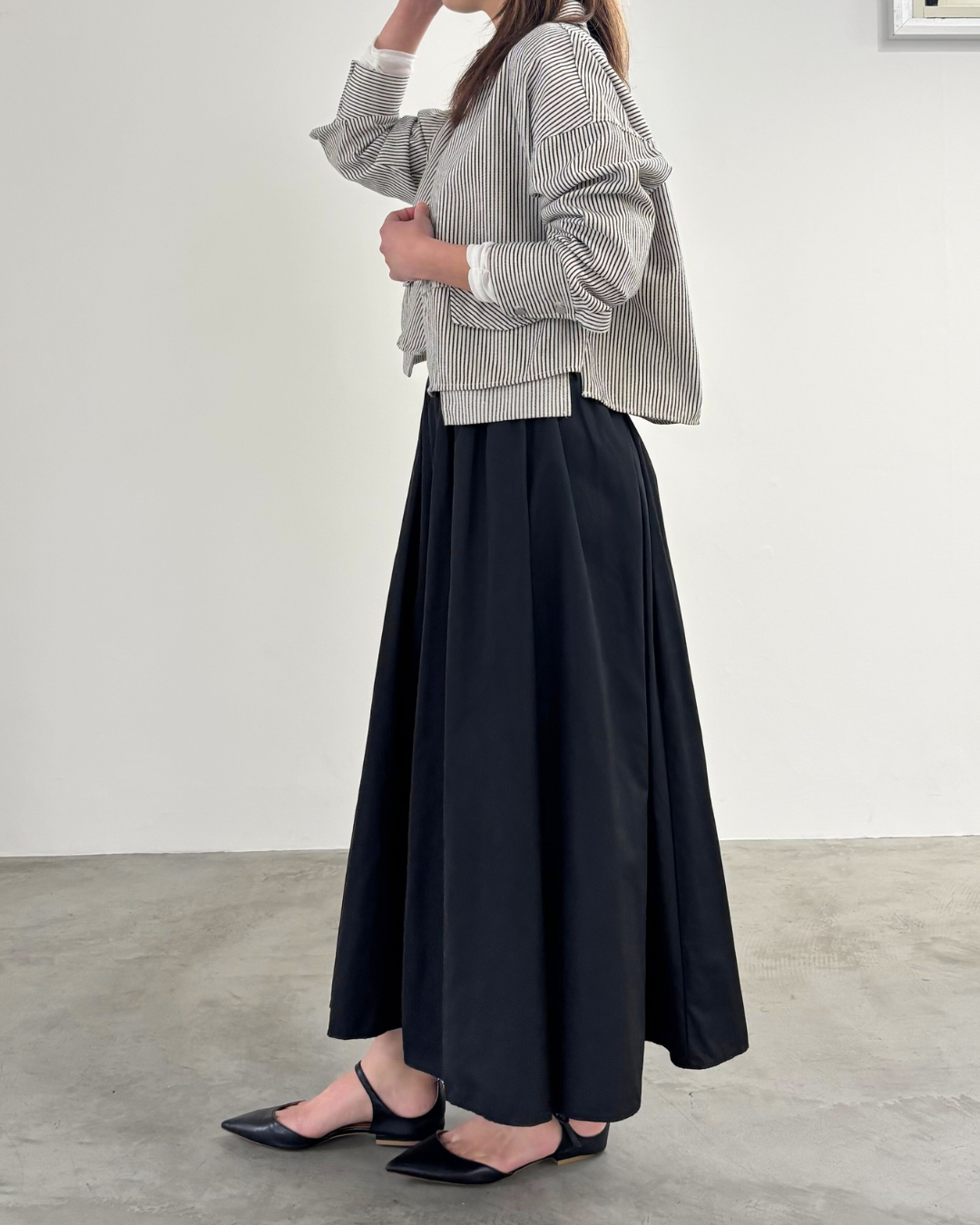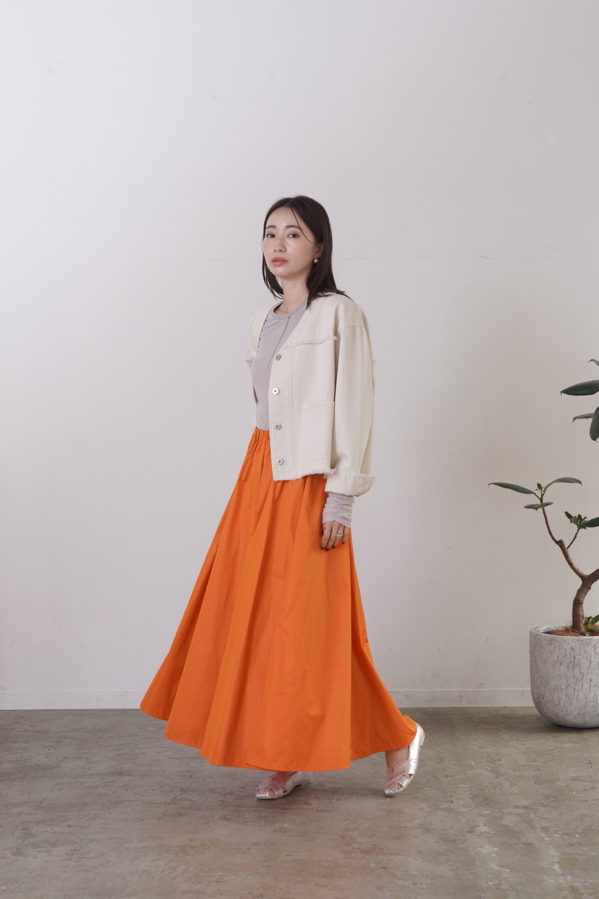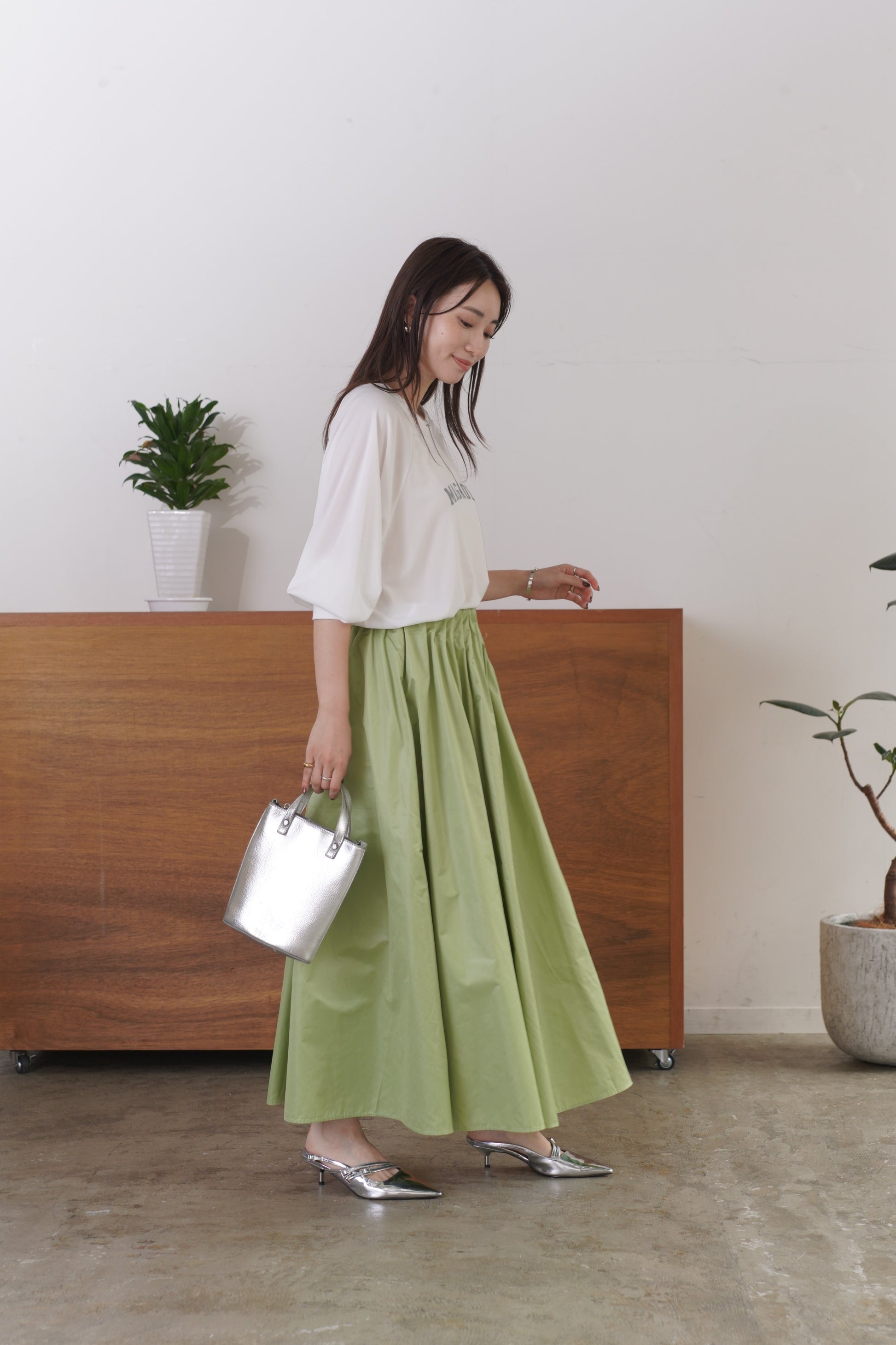 柔らかい風合いのタフタを使用した、6枚剥ぎのフレアスカート。ウエストに細かくタックをとっており、きれいめな印象を与えてくれますが、総ゴム仕様で楽に着用いただけます。