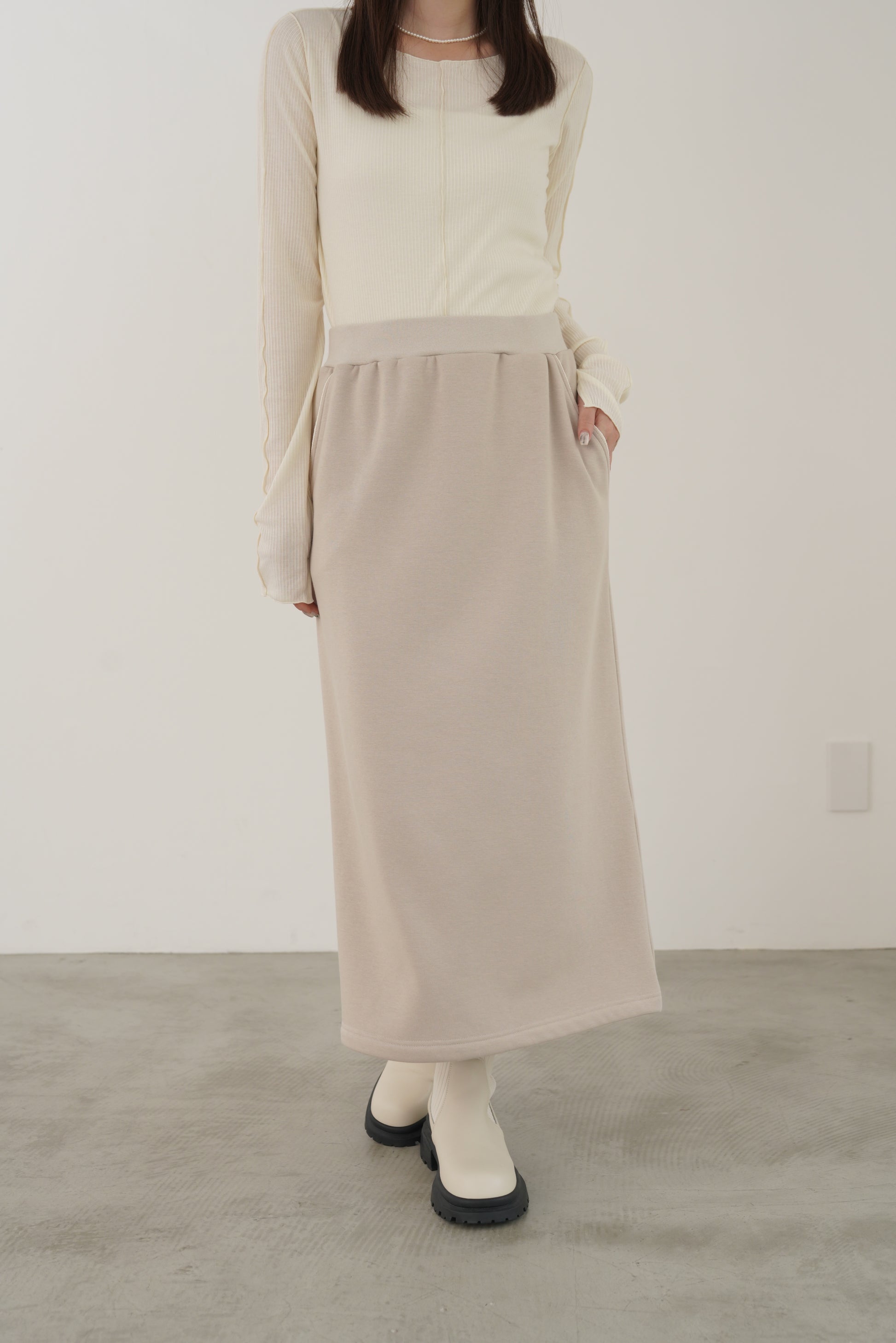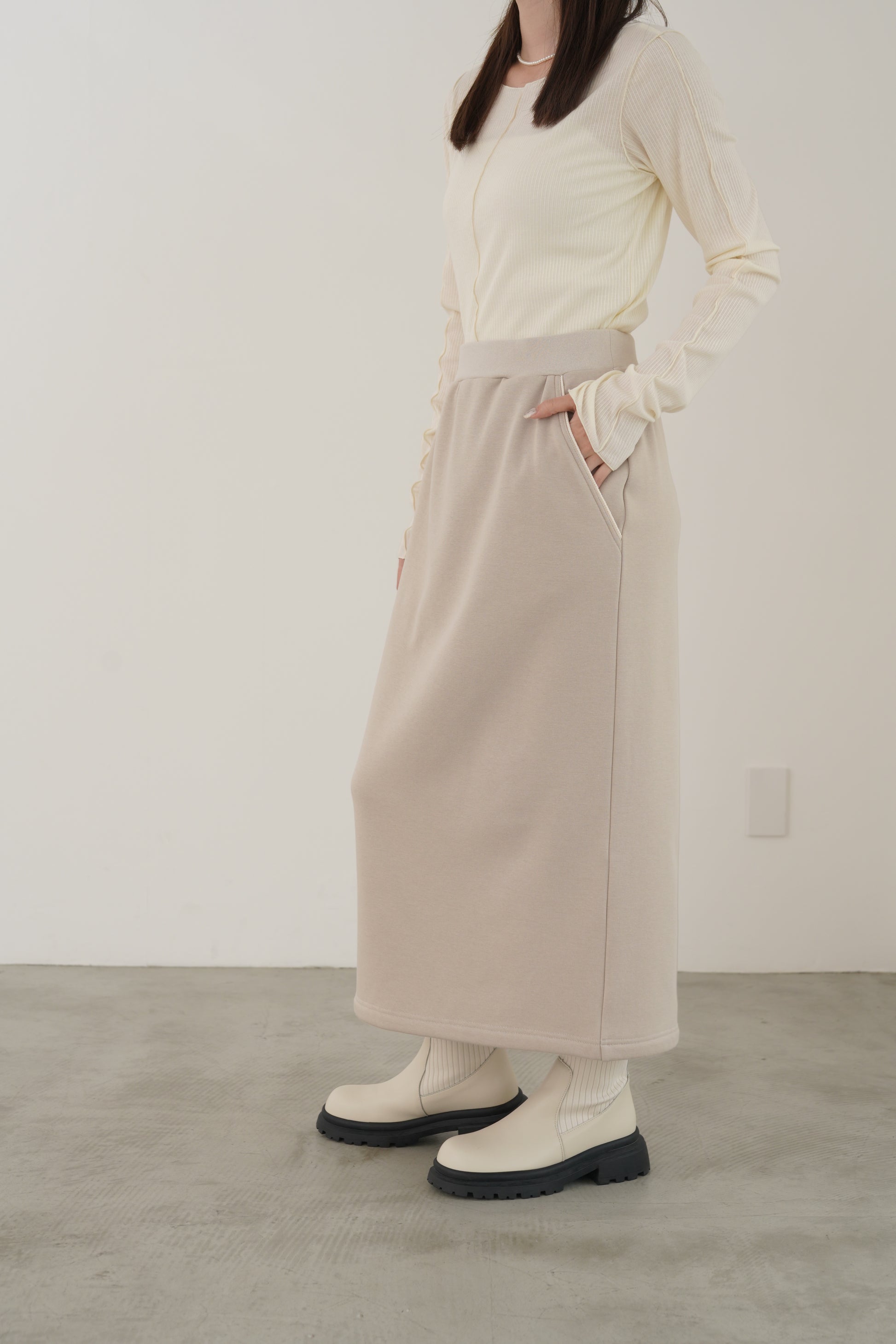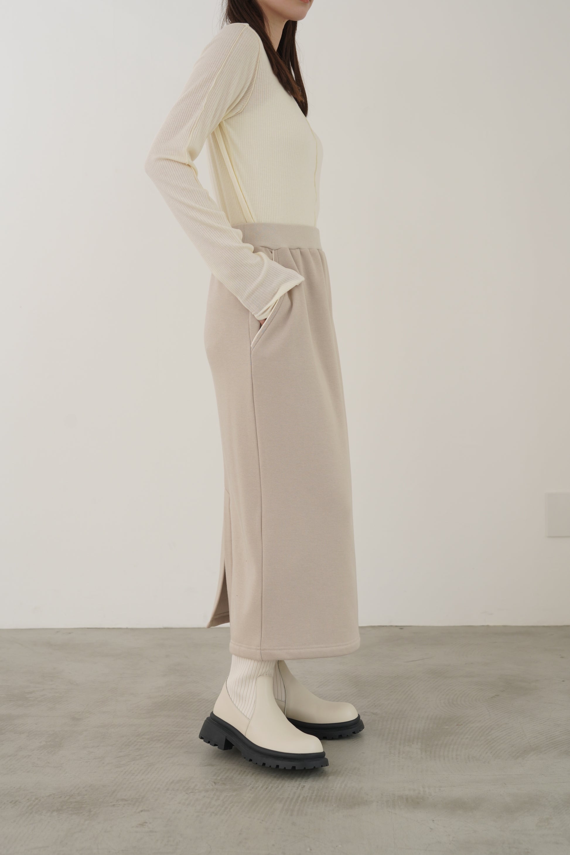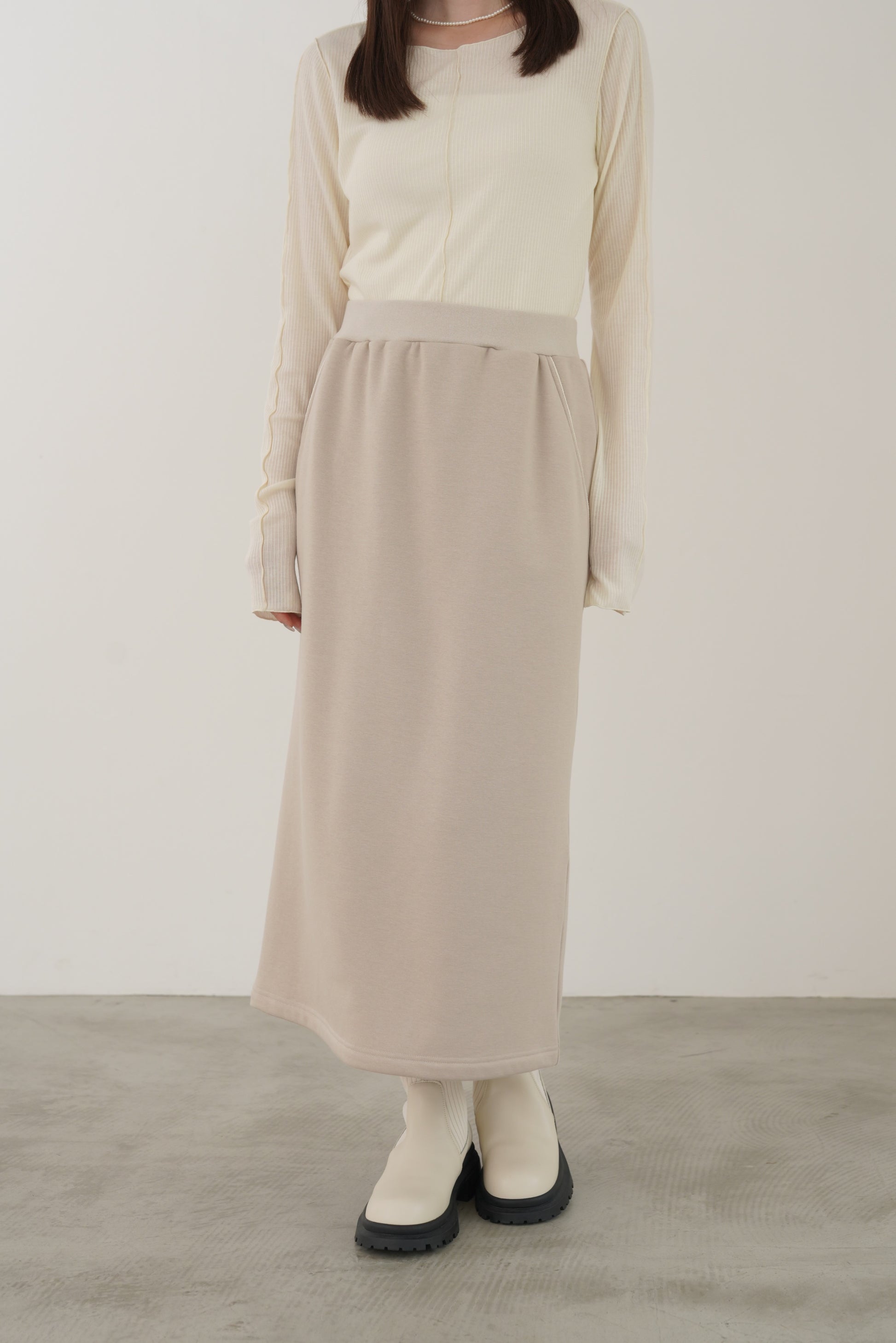 毛布に包まれるような、柔らかな裏起毛ムートン素材のタイトスカート。ストレッチの効いた着心地で、裏面には部分的に制電糸が使用されているため帯電防止性に優れています。ウインターシーズンに定番人気のタイトスカート型です。ポケット口のコードテープがシンプルなアクセント。