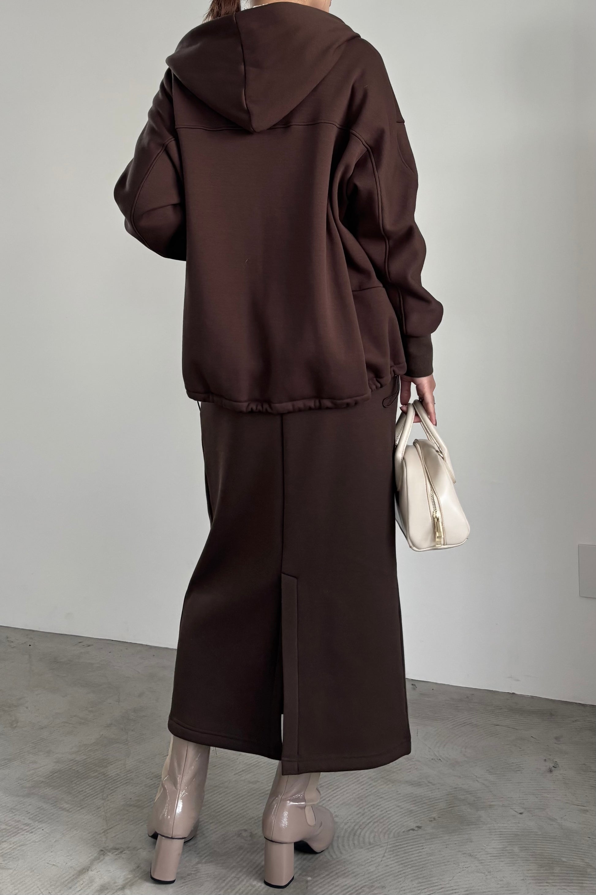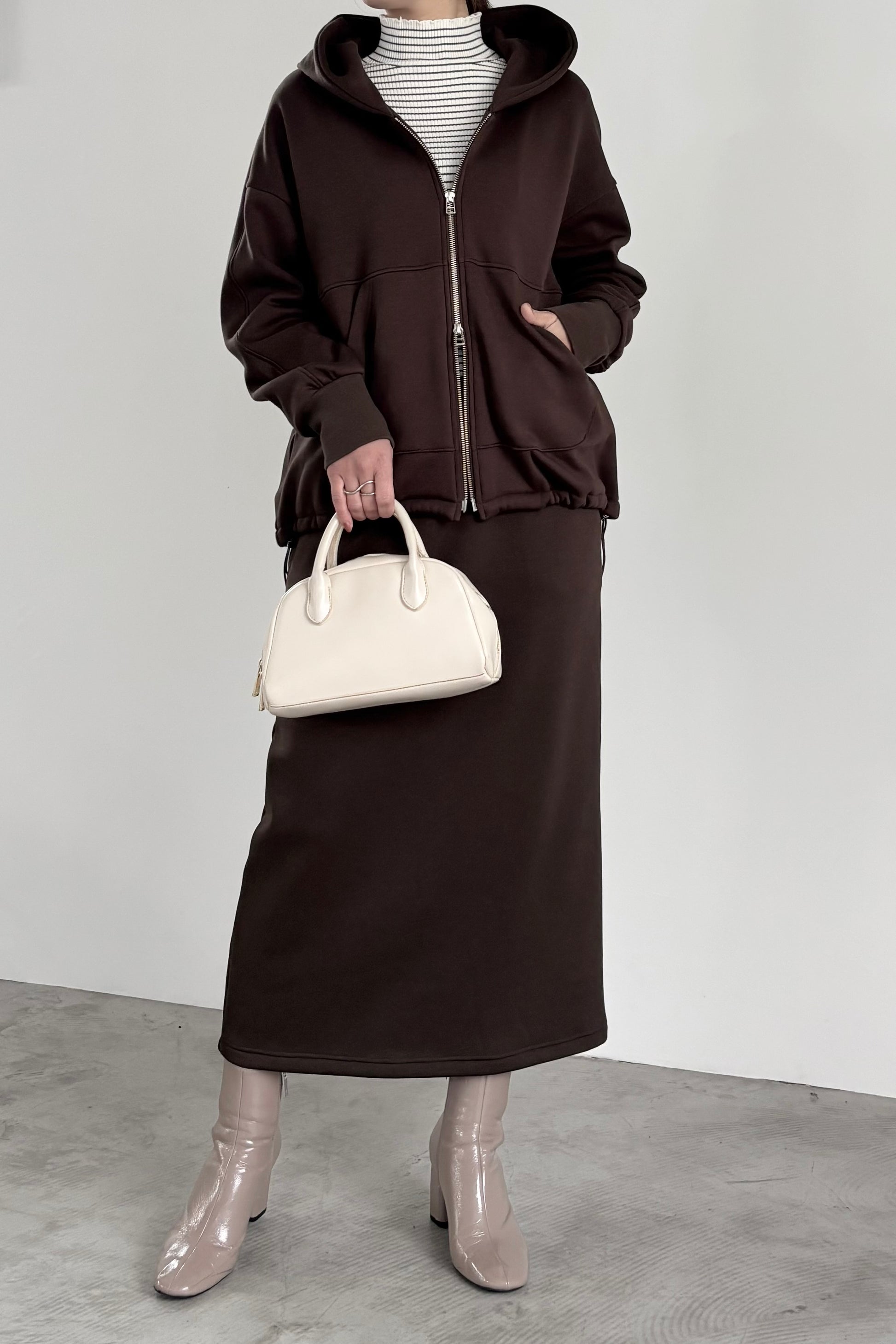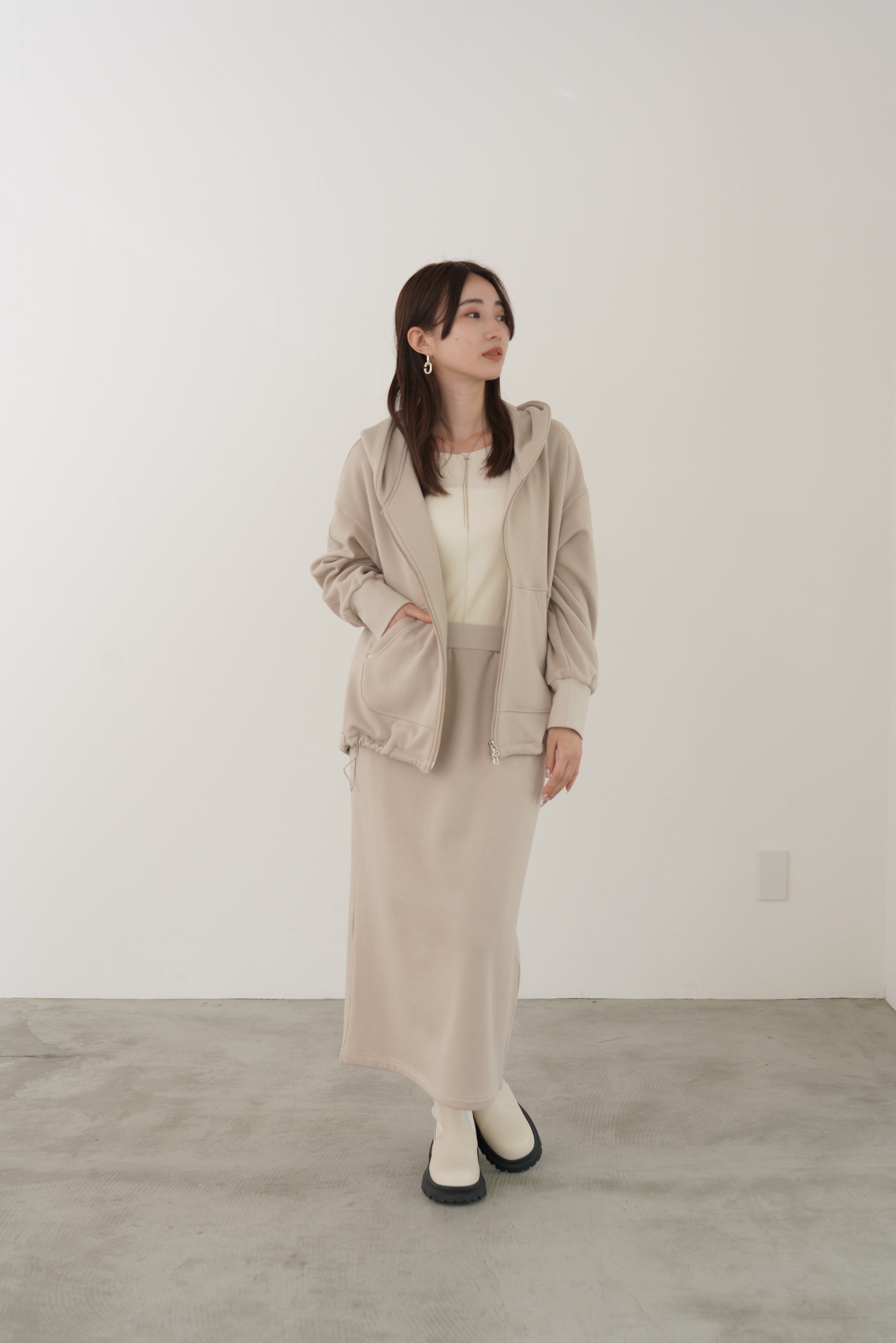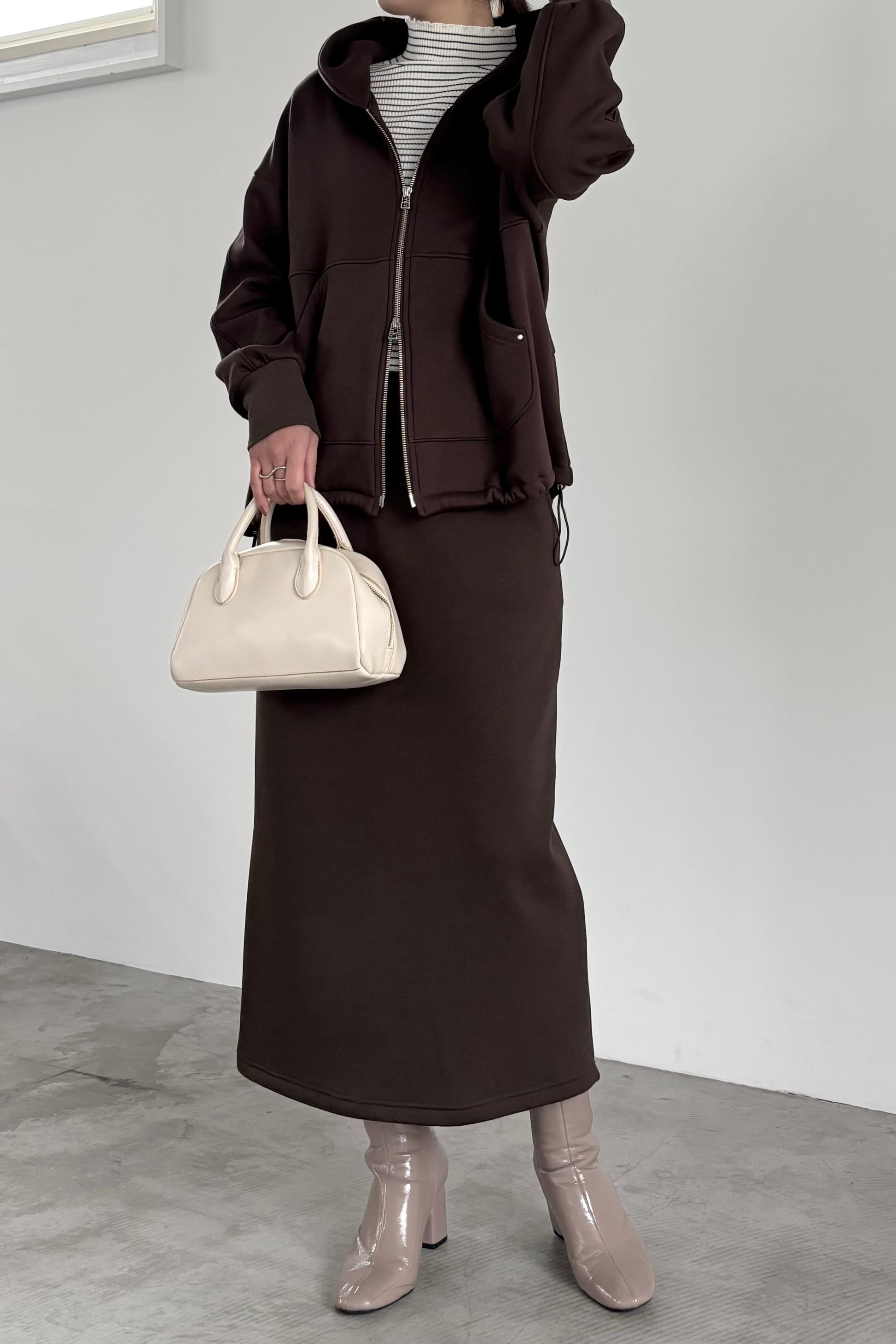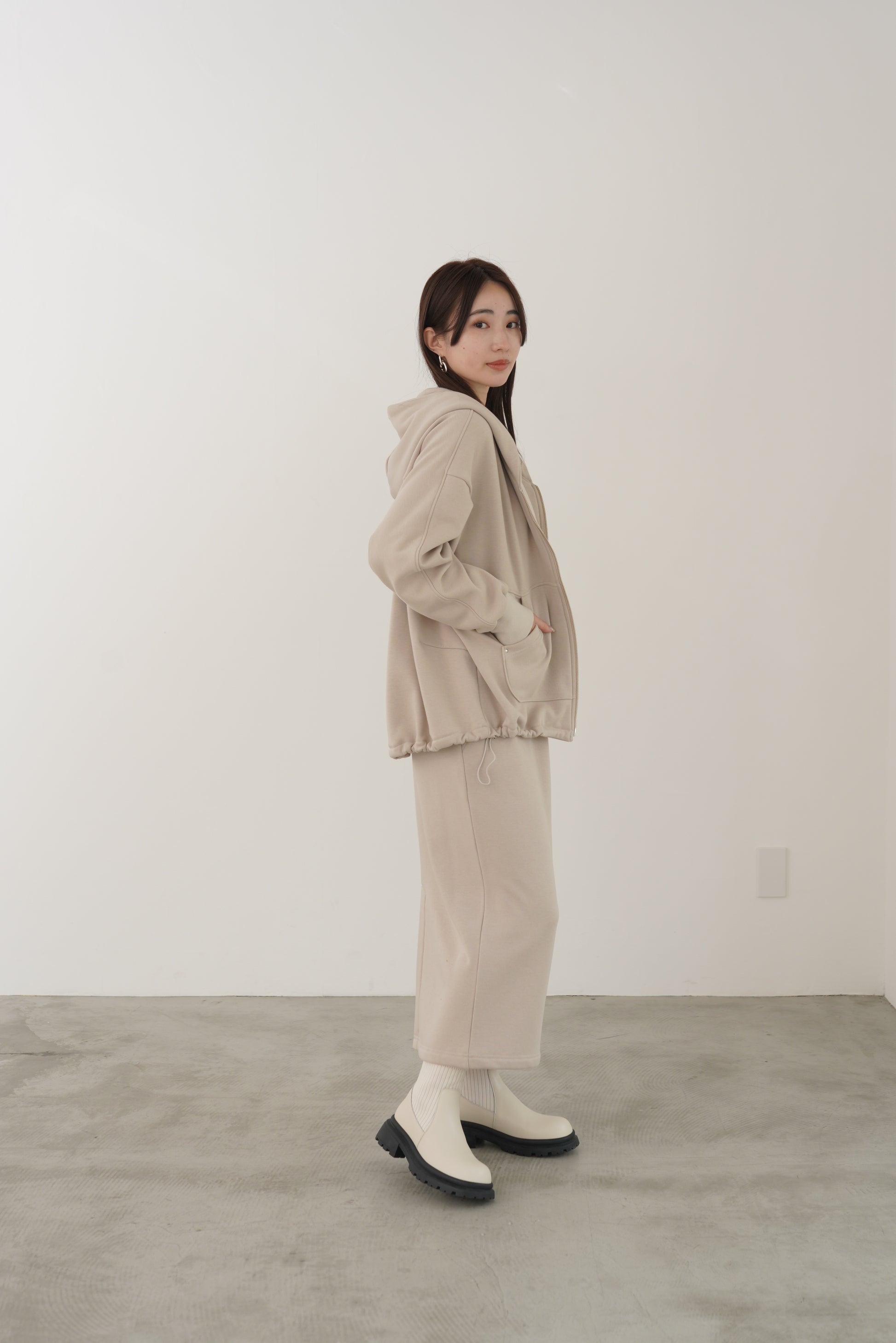 毛布に包まれるような、柔らかな裏起毛ムートン素材のタイトスカート。ストレッチの効いた着心地で、裏面には部分的に制電糸が使用されているため帯電防止性に優れています。ウインターシーズンに定番人気のタイトスカート型です。ポケット口のコードテープがシンプルなアクセント。