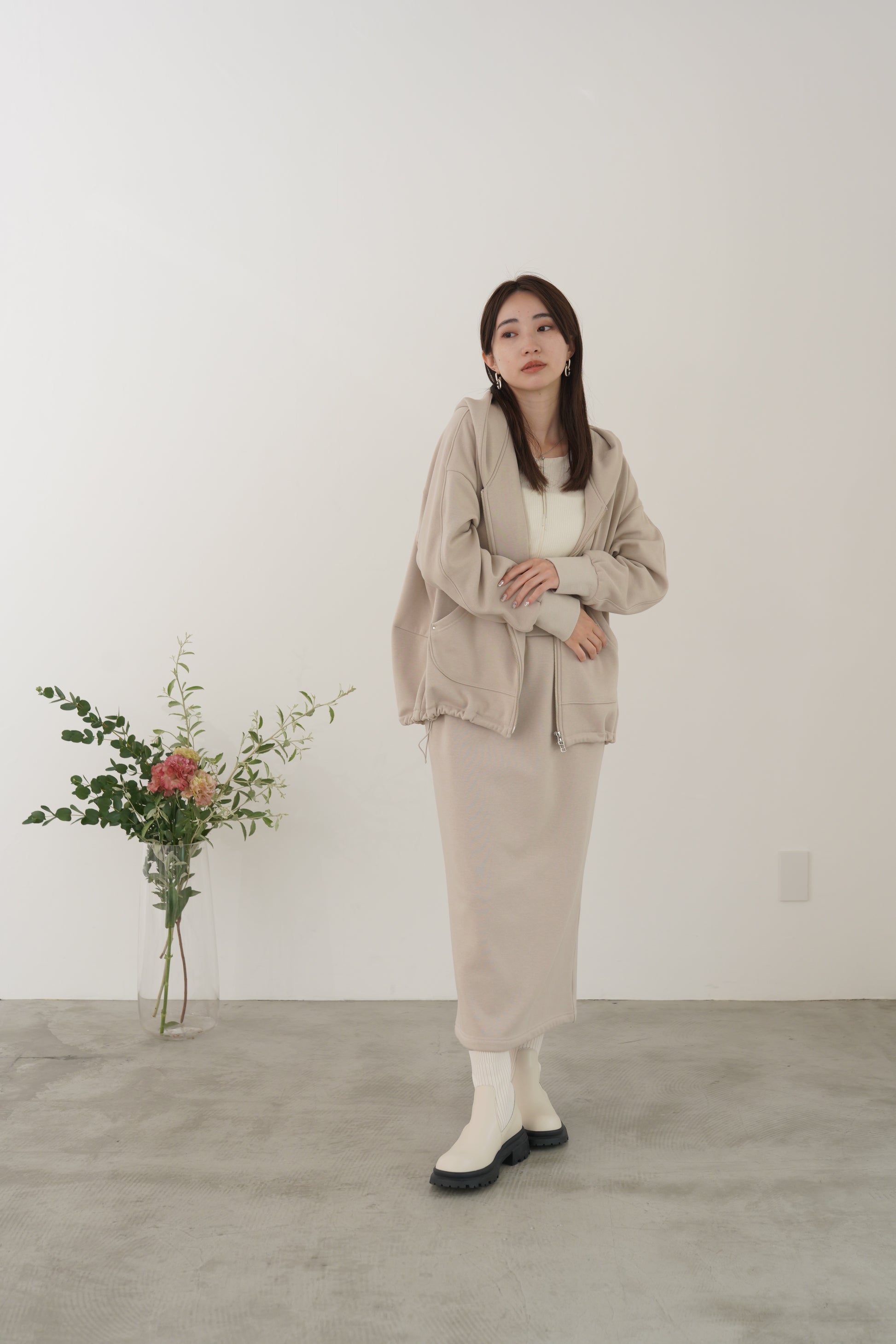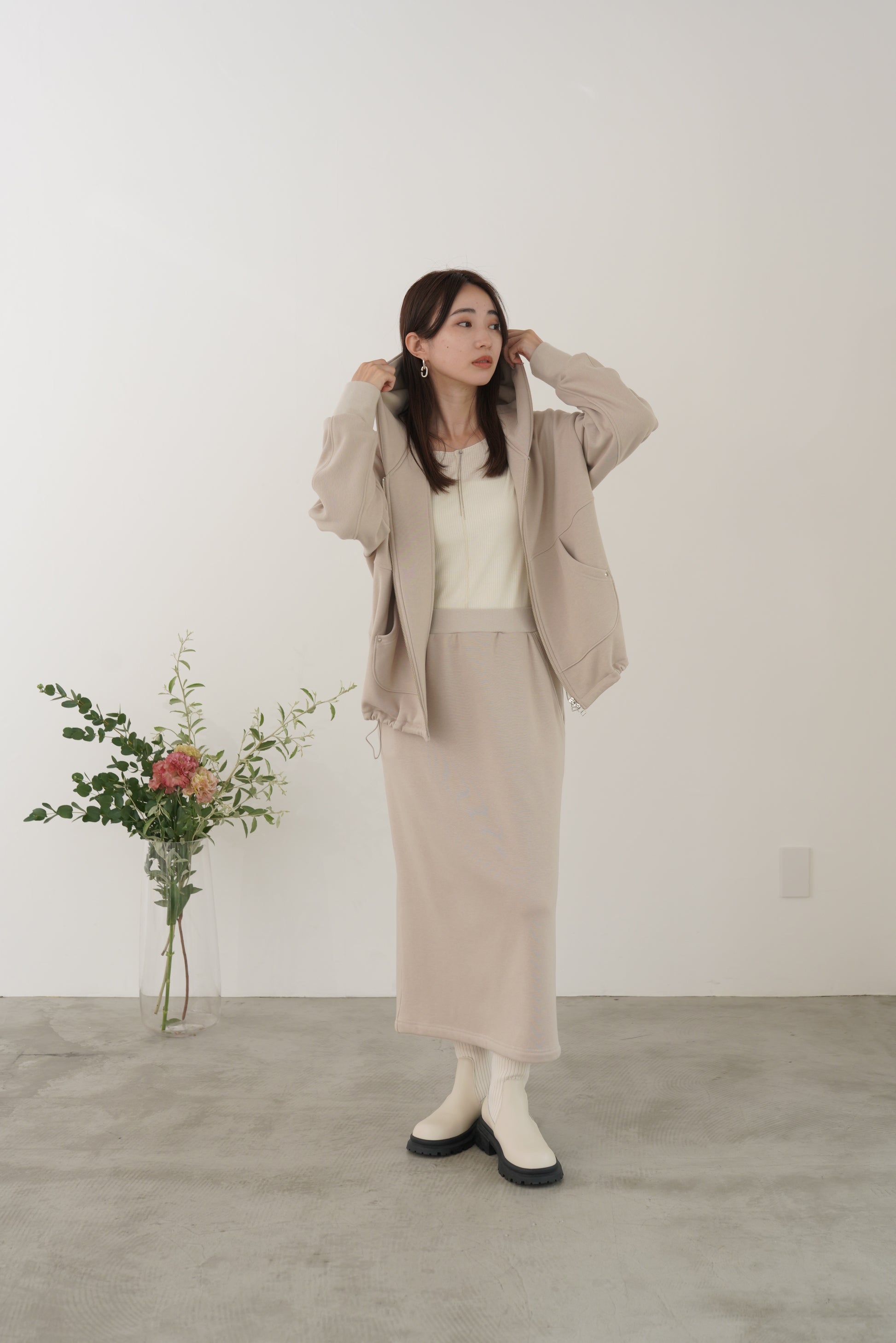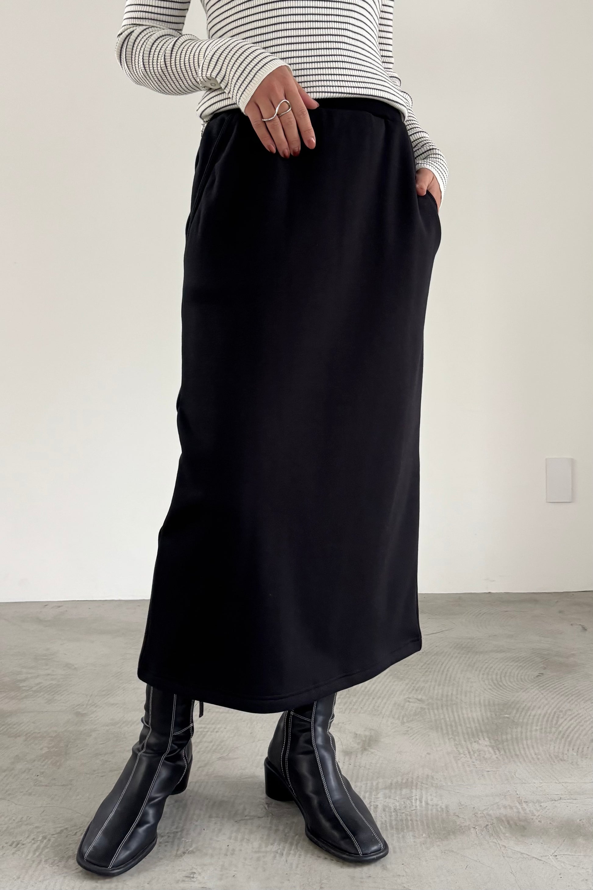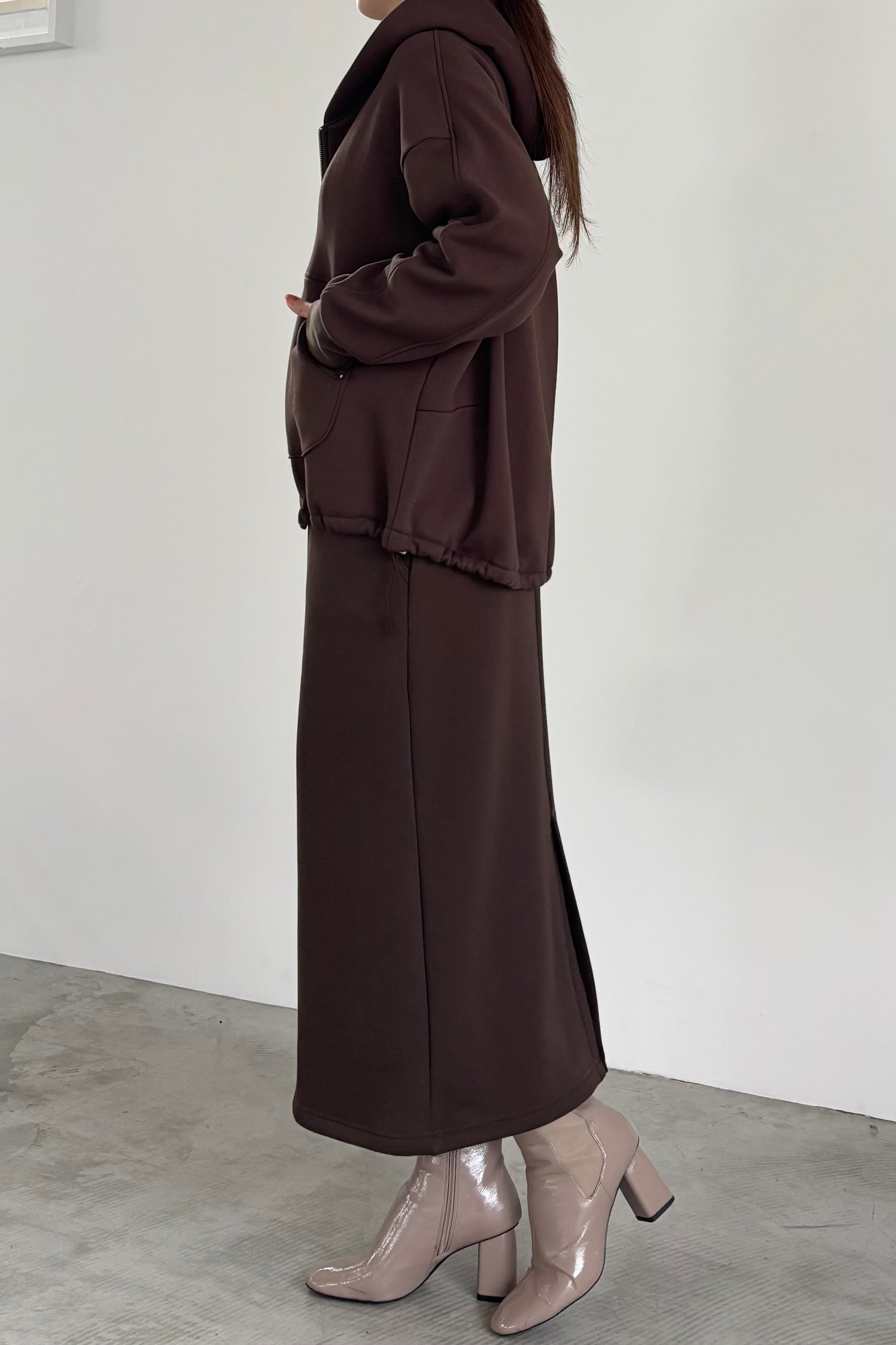 毛布に包まれるような、柔らかな裏起毛ムートン素材のタイトスカート。ストレッチの効いた着心地で、裏面には部分的に制電糸が使用されているため帯電防止性に優れています。ウインターシーズンに定番人気のタイトスカート型です。ポケット口のコードテープがシンプルなアクセント。
