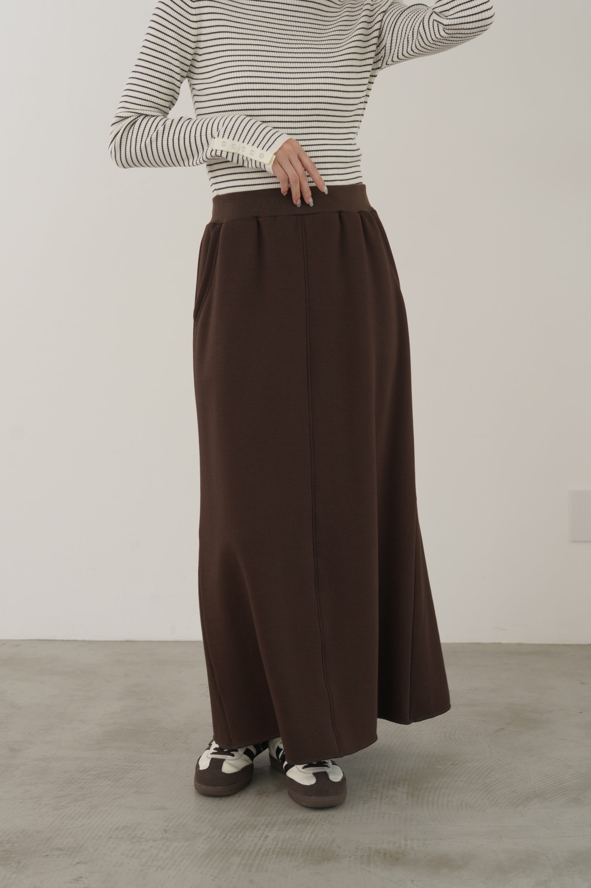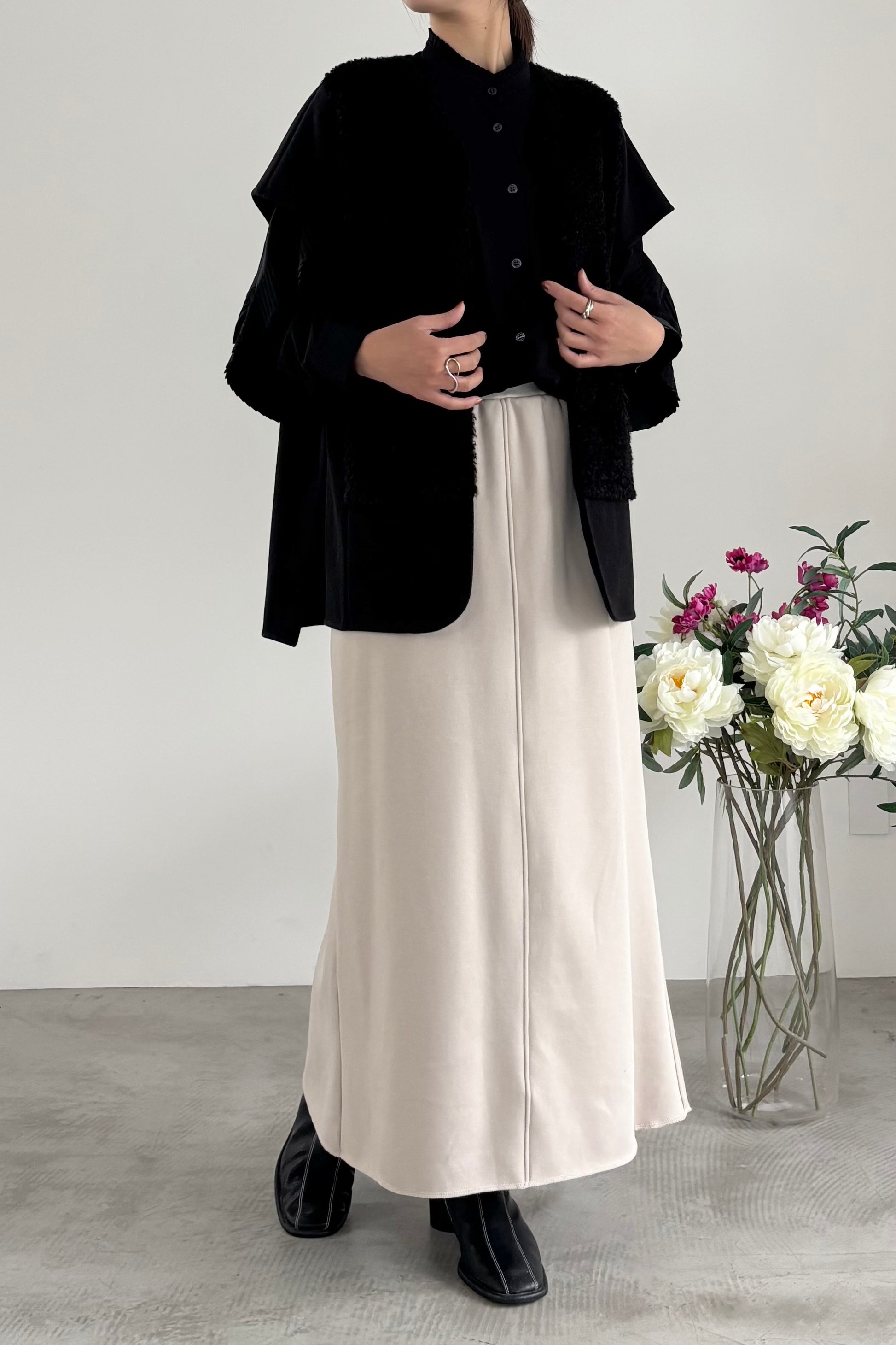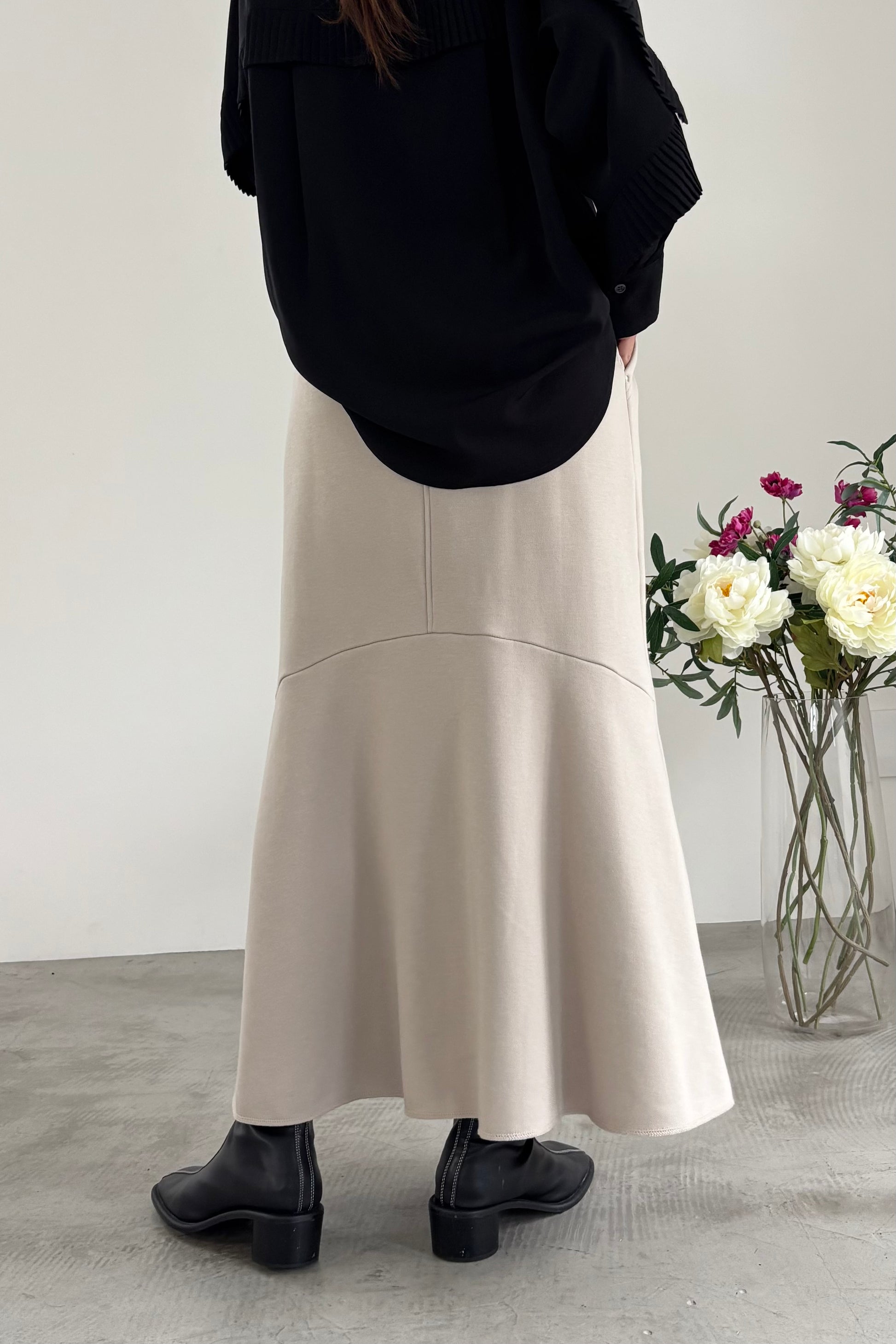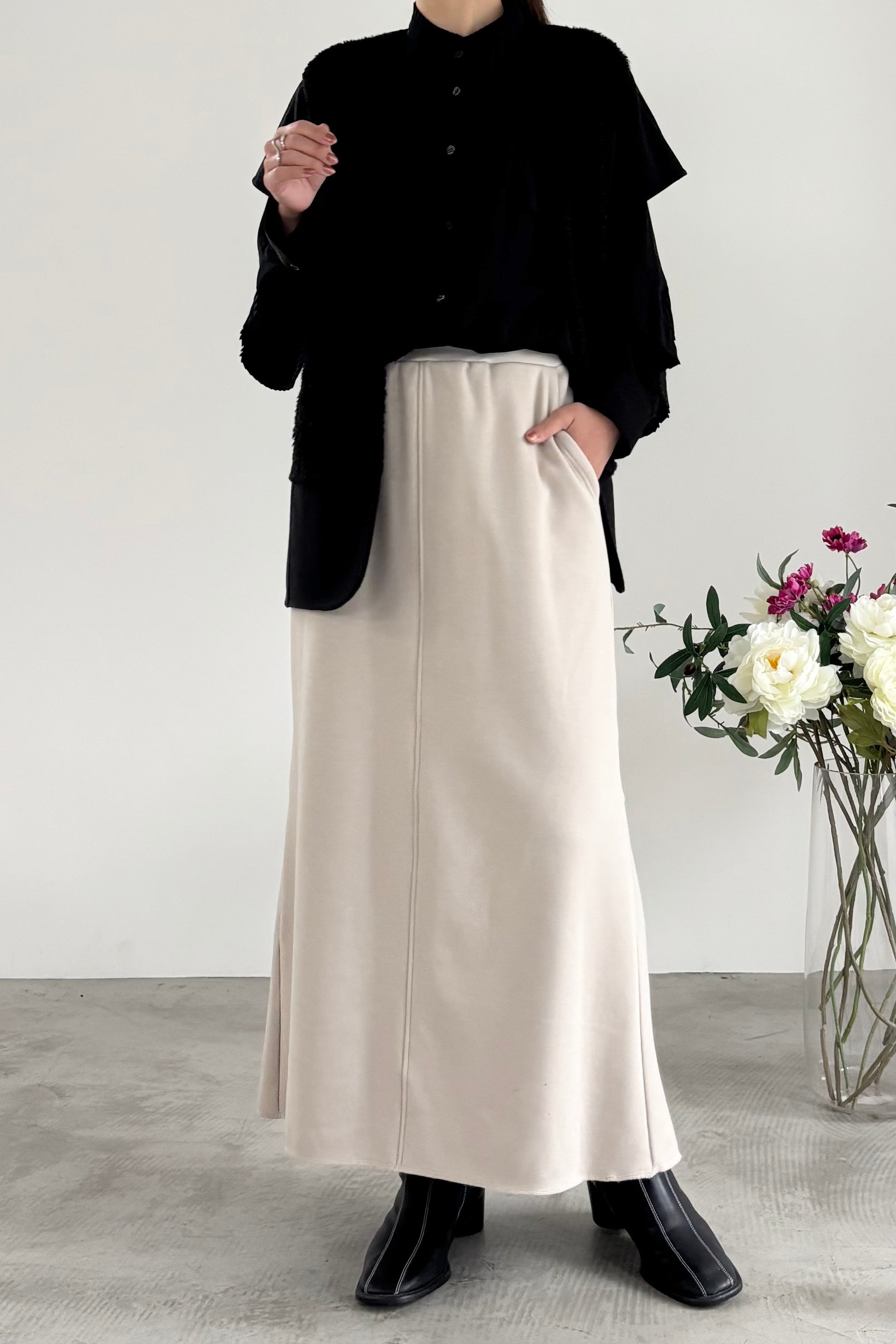 毛布に包まれるような、柔らかな裏起毛ムートン素材のフレアスカート。ストレッチの効いた着心地で、裏面には部分的に制電糸が使用されているため帯電防止性に優れています。バックスタイルの切り替えから波打つフレアがきれいで、足捌きも良いスカートです。