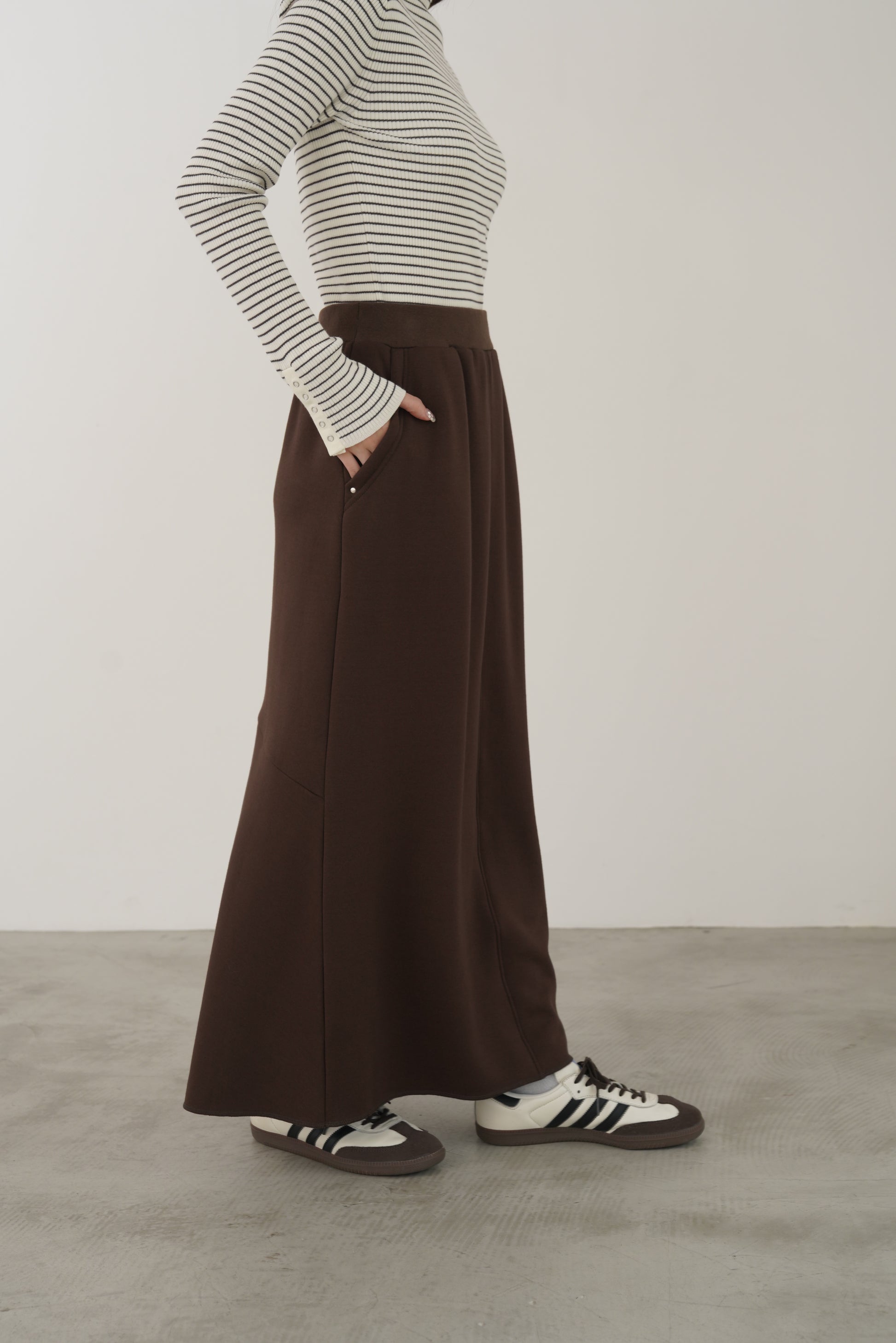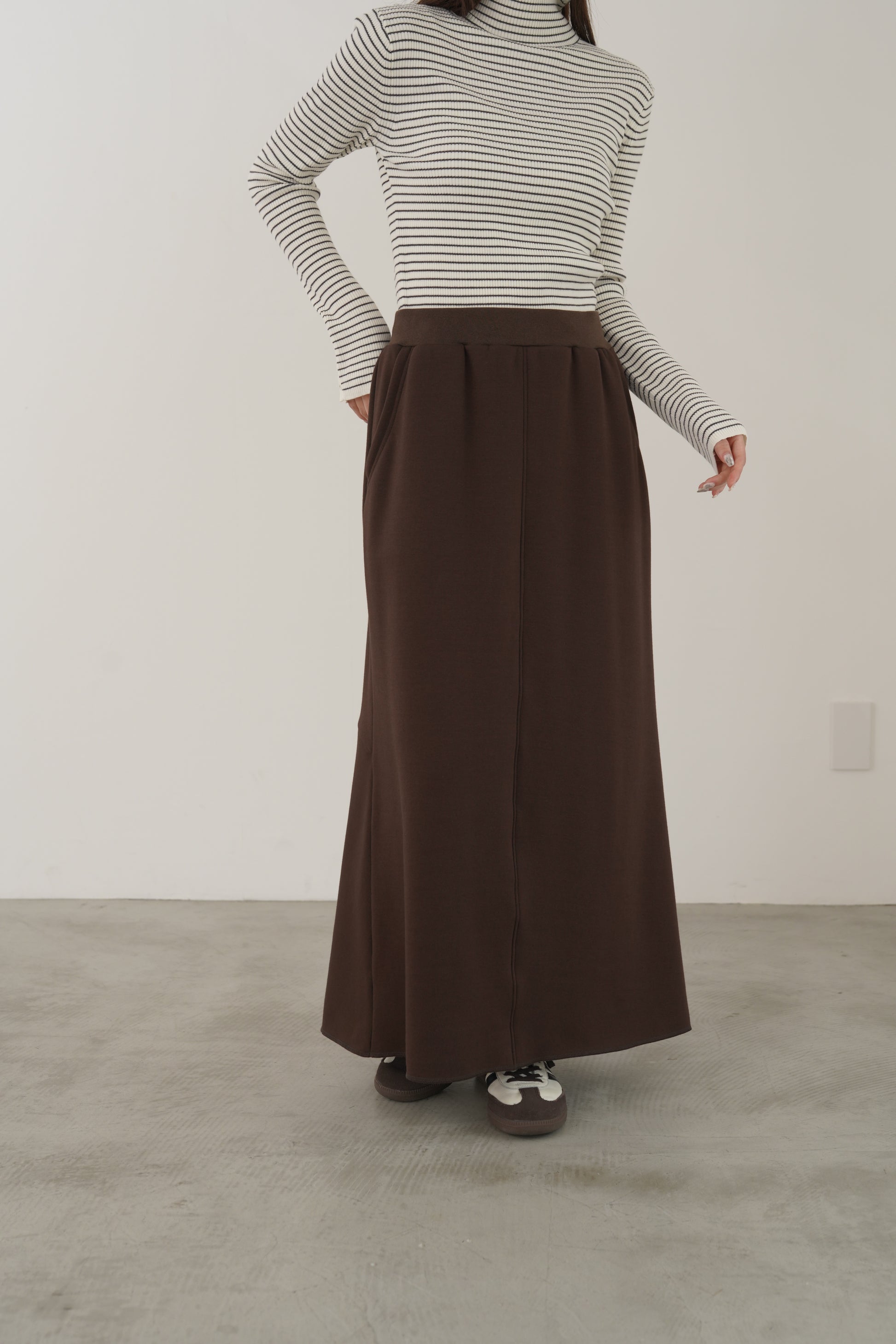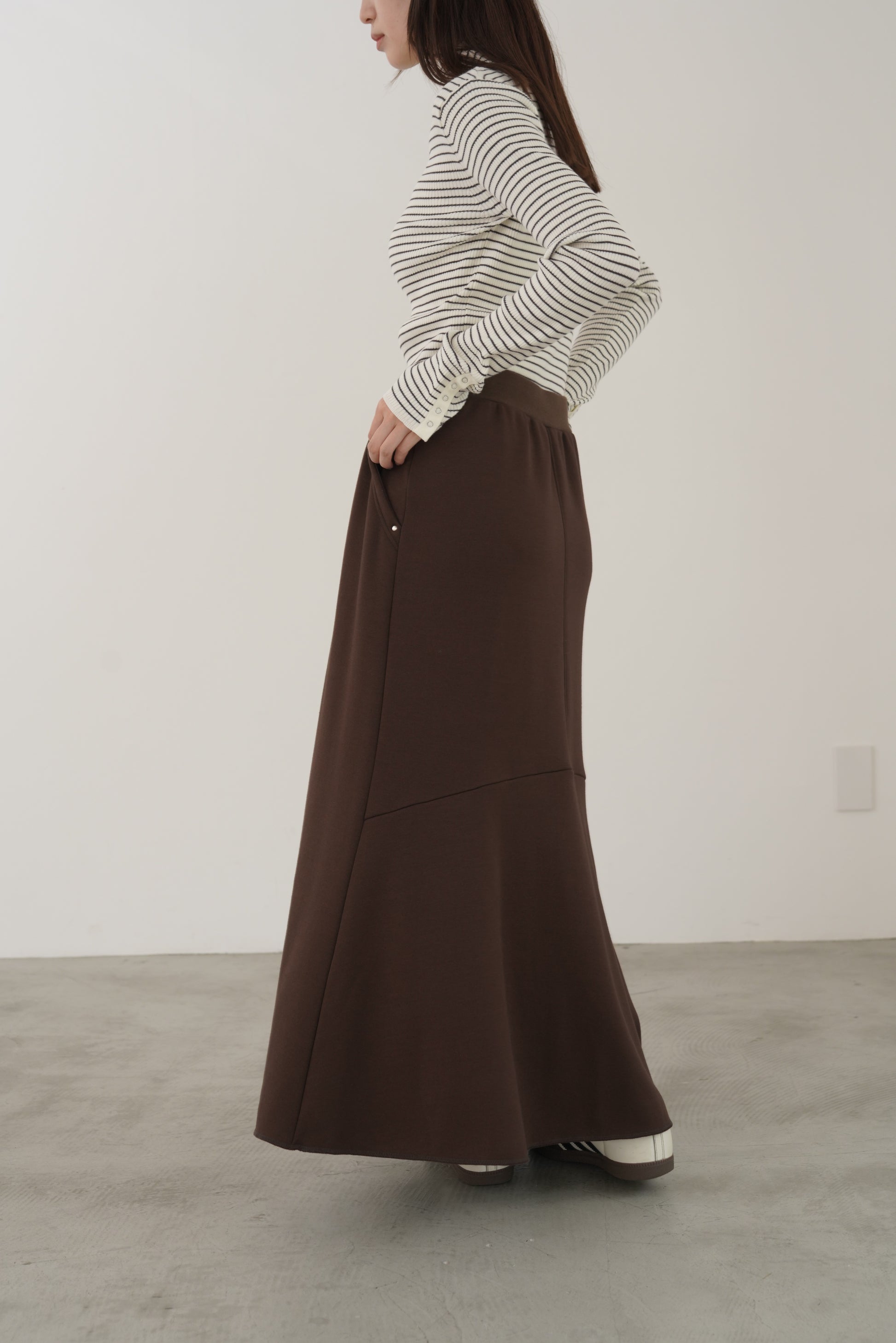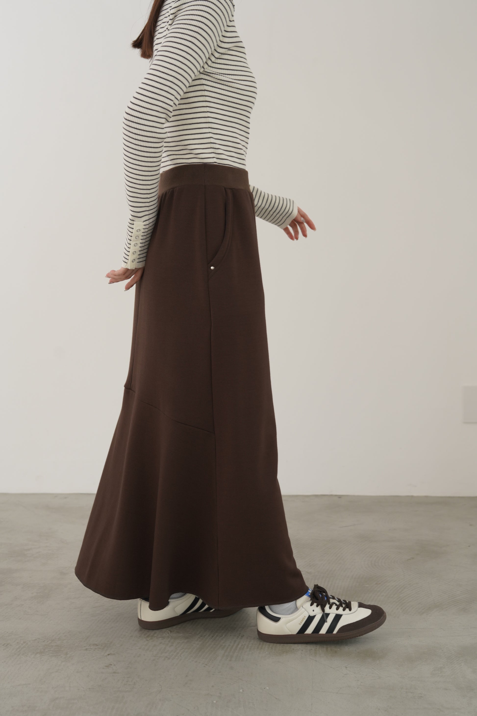 毛布に包まれるような、柔らかな裏起毛ムートン素材のフレアスカート。ストレッチの効いた着心地で、裏面には部分的に制電糸が使用されているため帯電防止性に優れています。バックスタイルの切り替えから波打つフレアがきれいで、足捌きも良いスカートです。