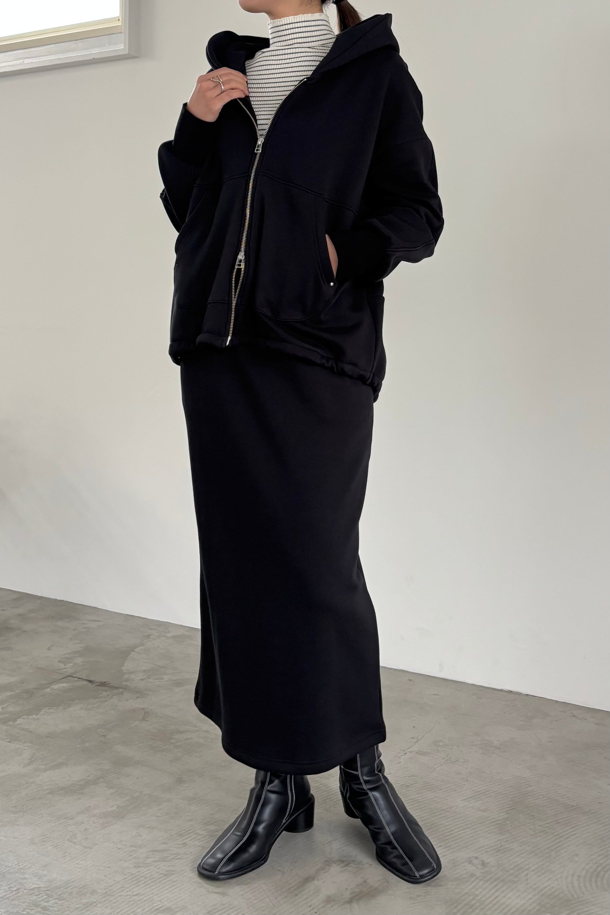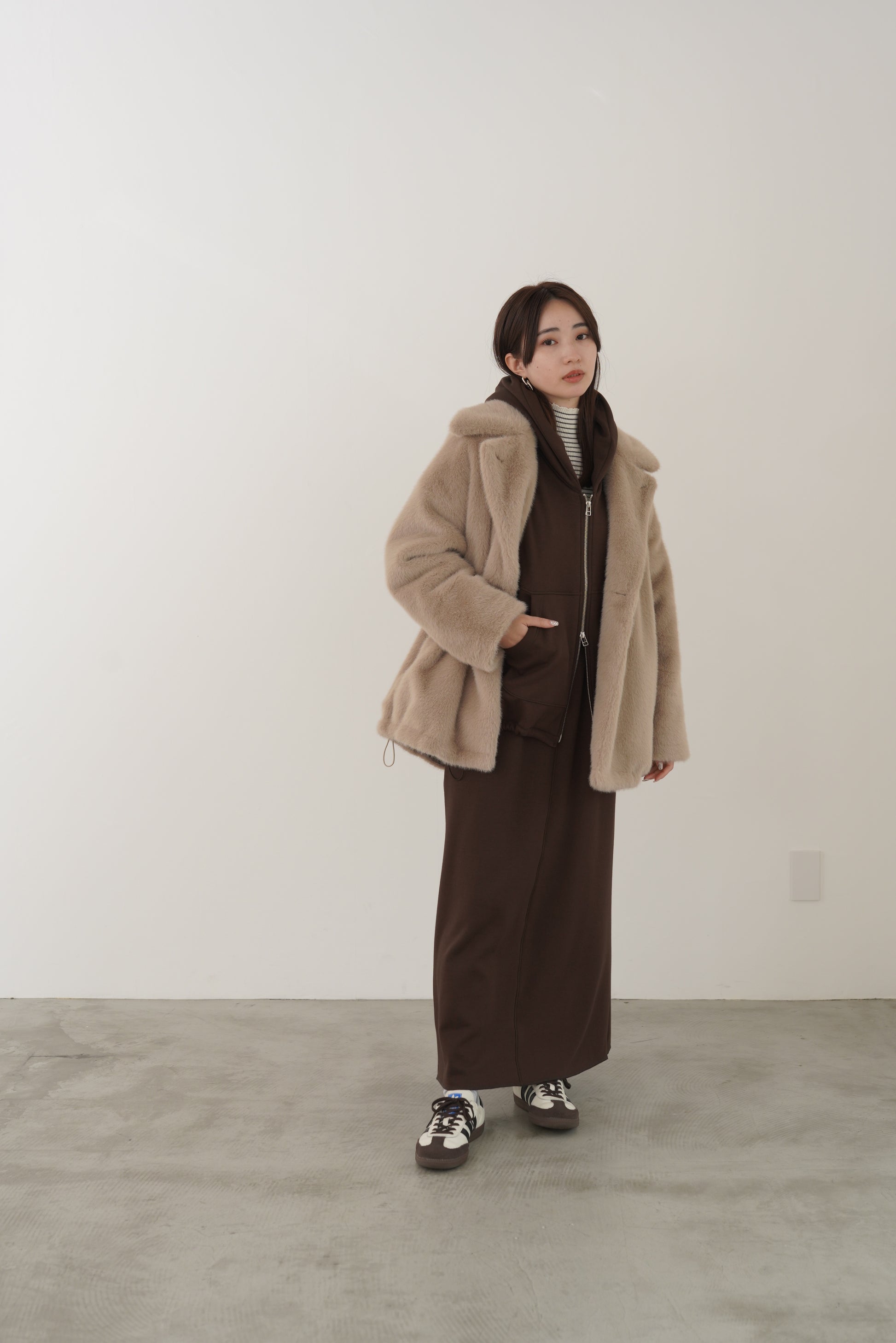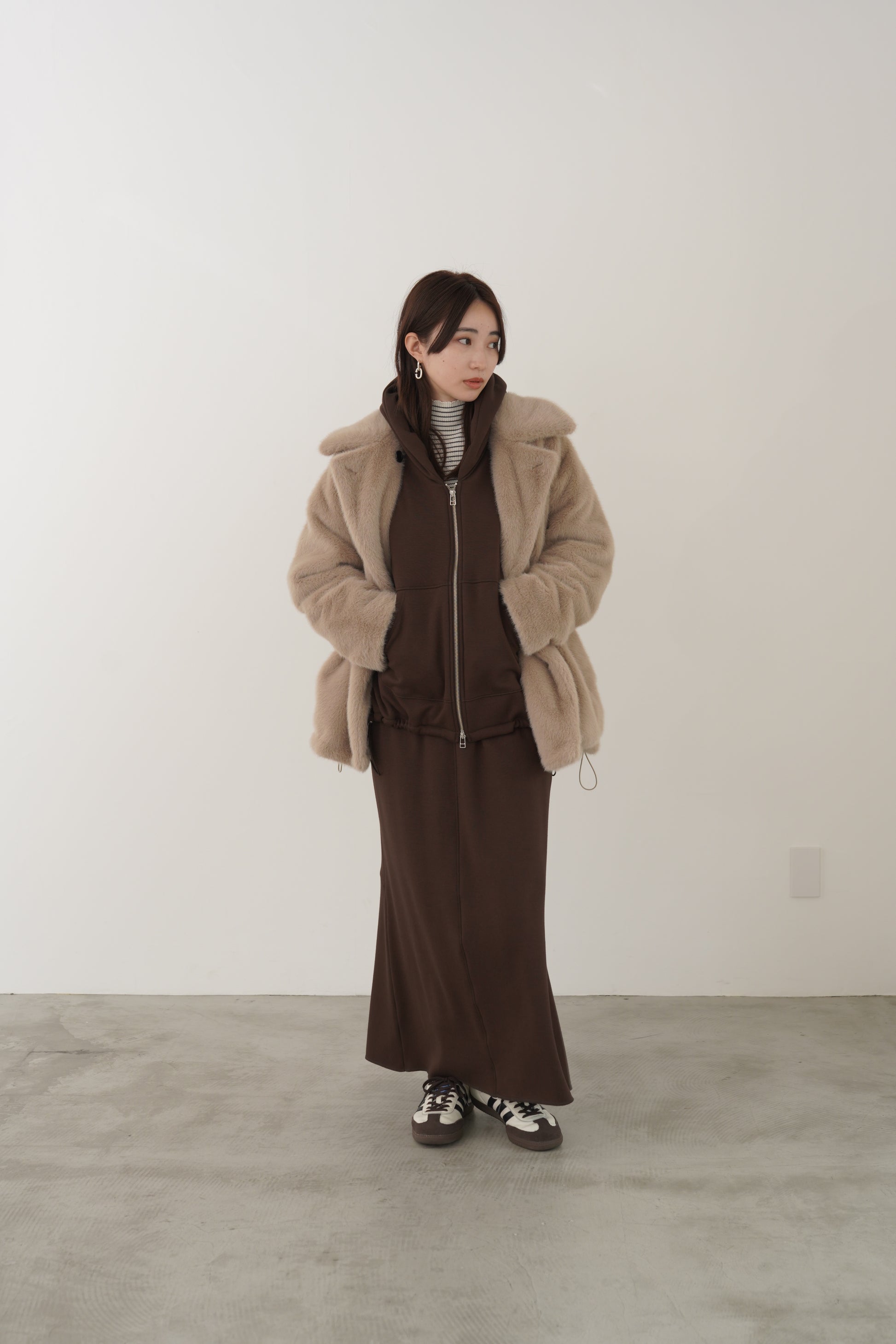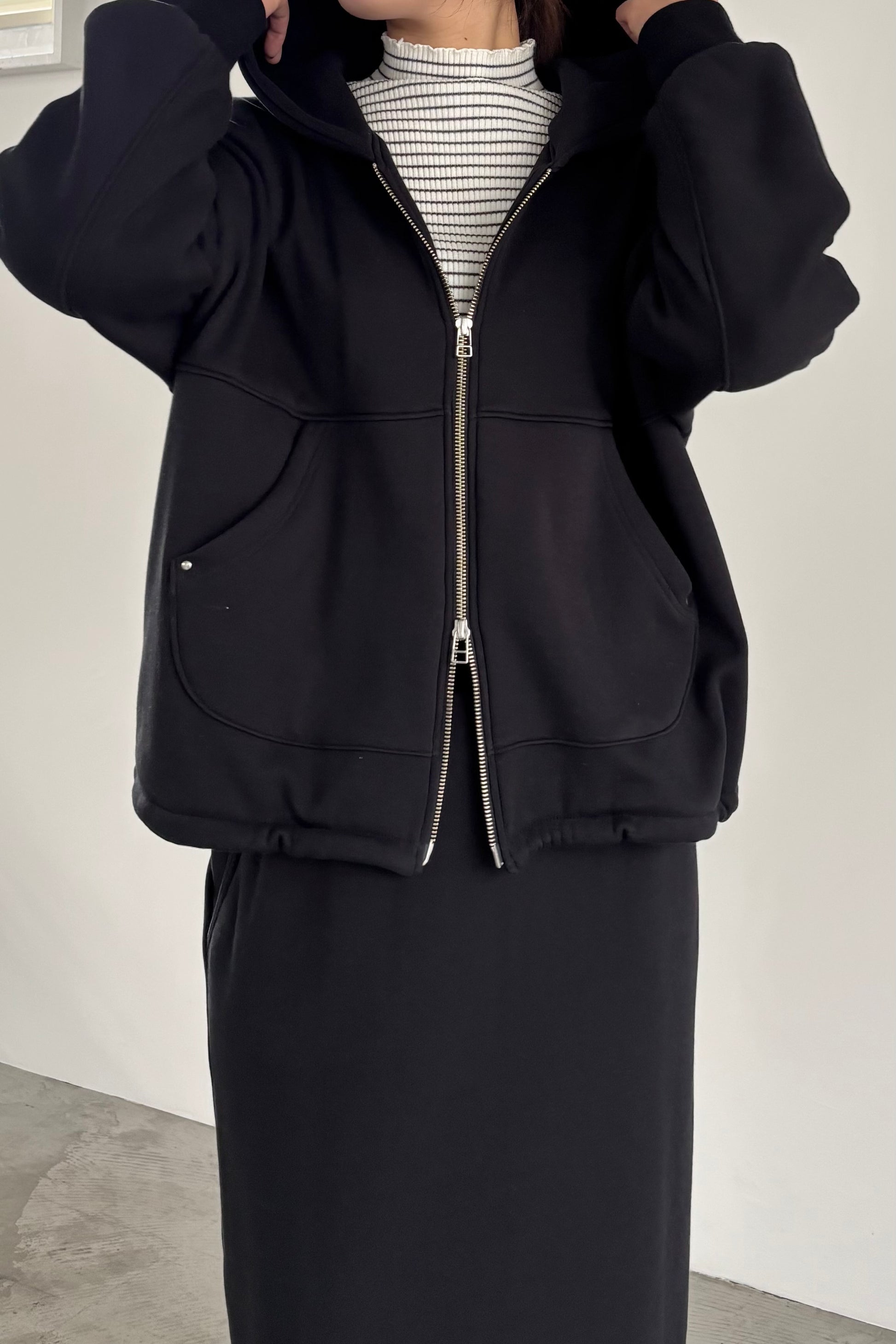 毛布に包まれるような、柔らかな裏起毛ムートン素材のブルゾン。ストレッチの効いた着心地で、裏面には部分的に制電防止糸が使用されているため帯電防止に優れています。中に着込みやすく気軽に羽織れるサイズ感で、デイリーに活躍するブルゾンです。