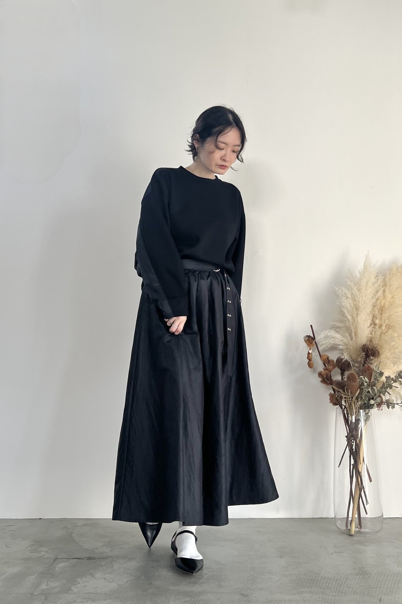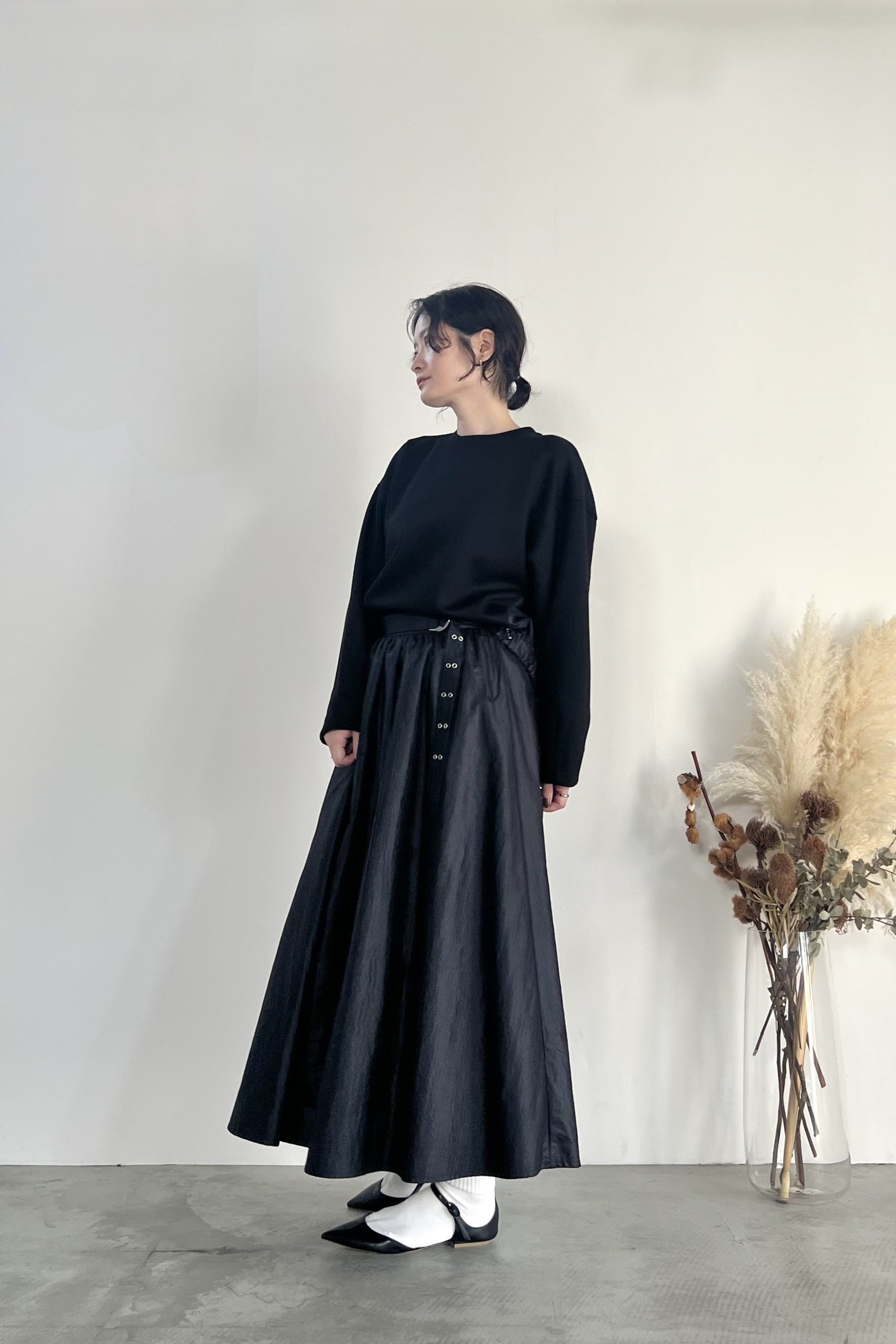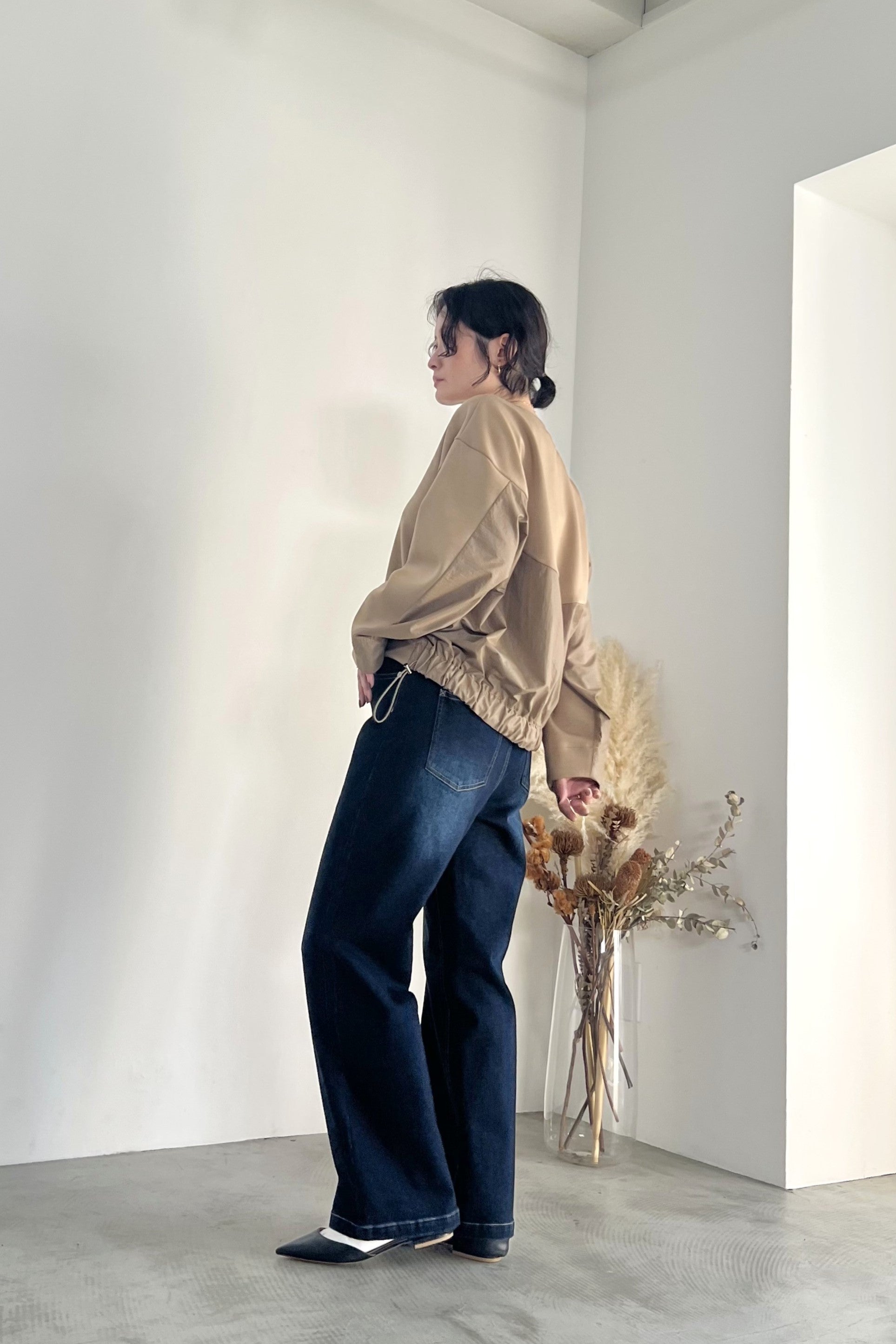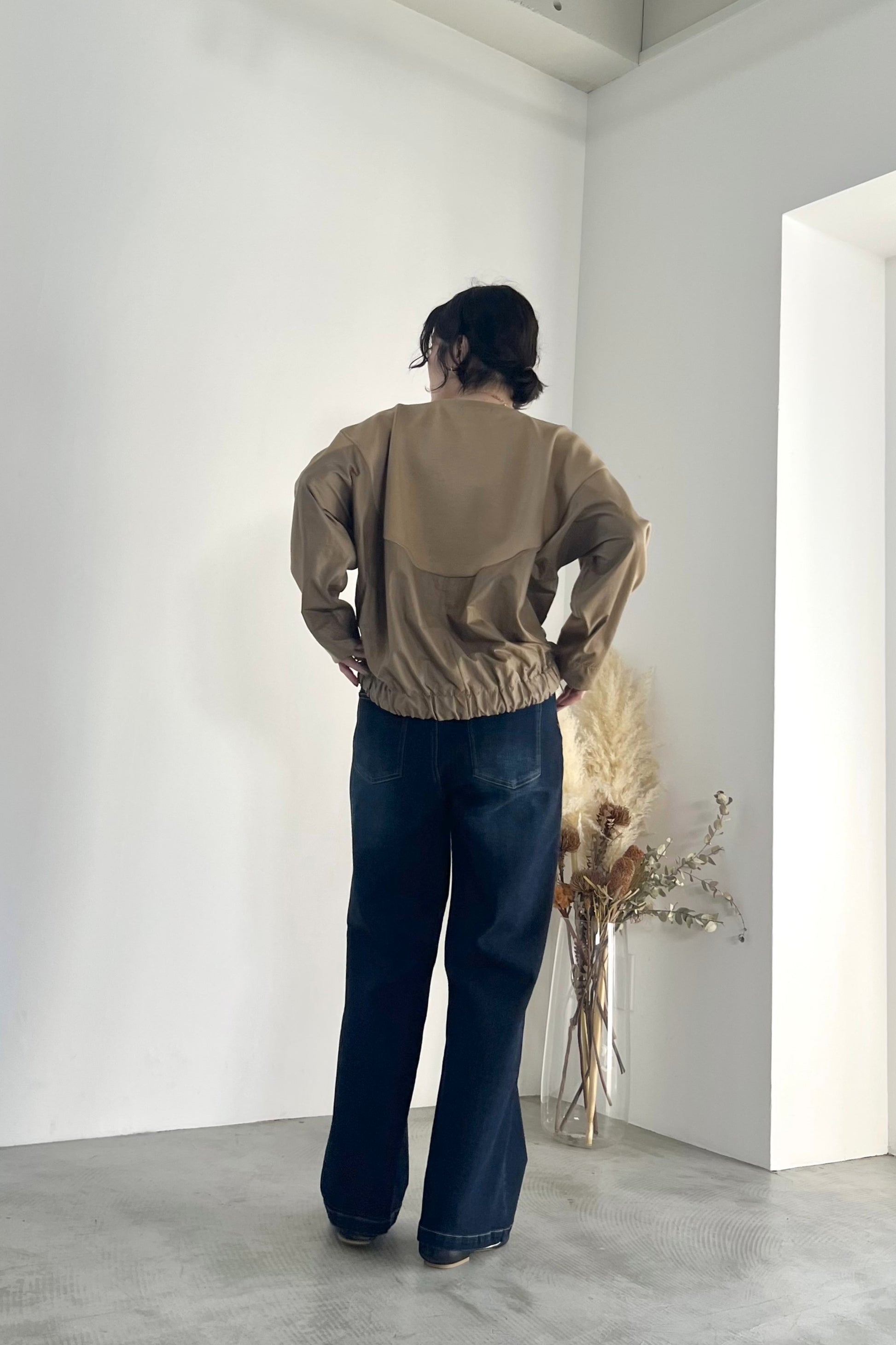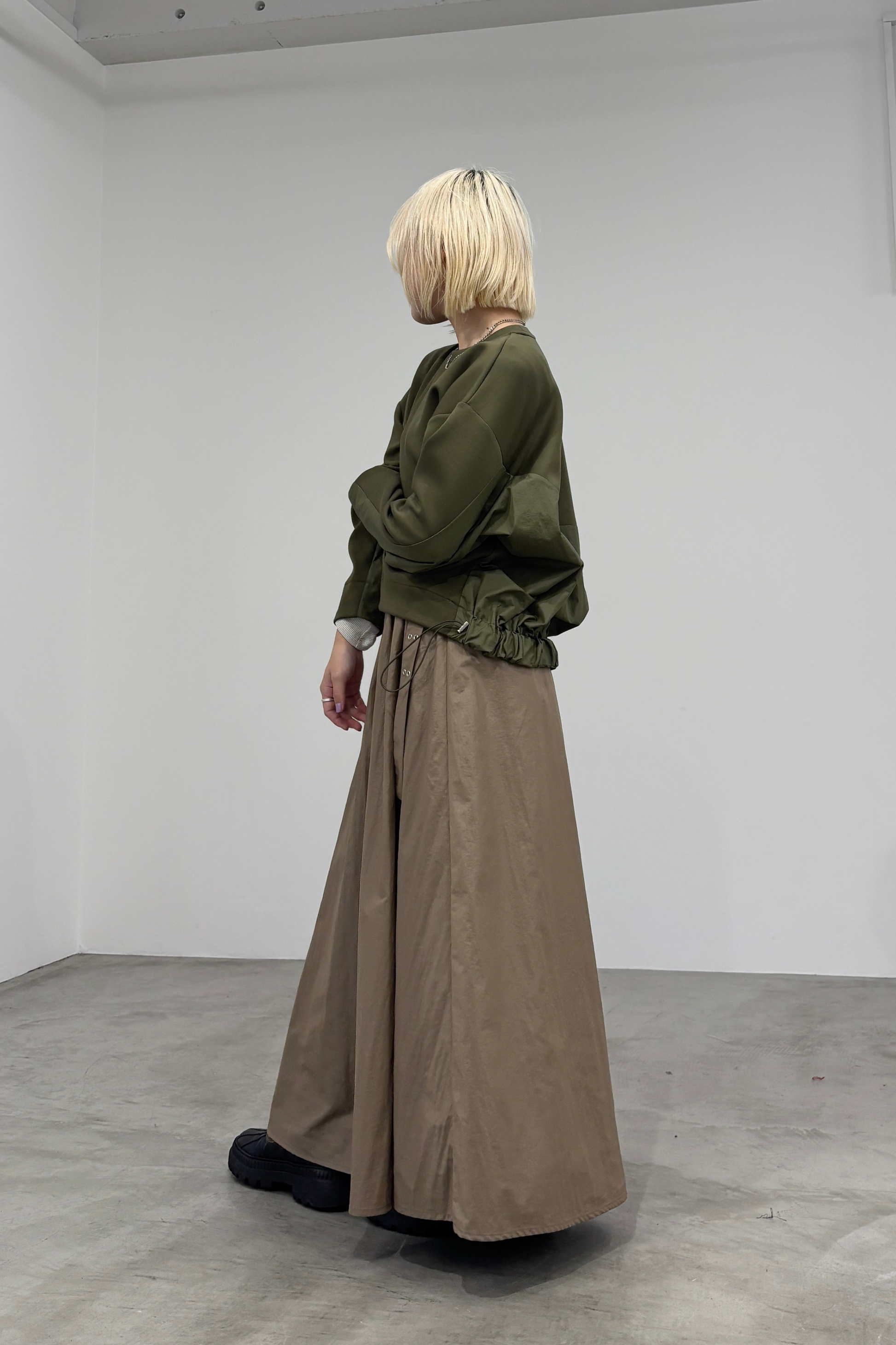 きれいな表面感のダンボール素材とチンツ加工で光沢を持たせたナイロン素材を組み合わせたプルオーバーです。後ろ裾部分にゴムを入れて丸みのあるシルエットに仕上げました。