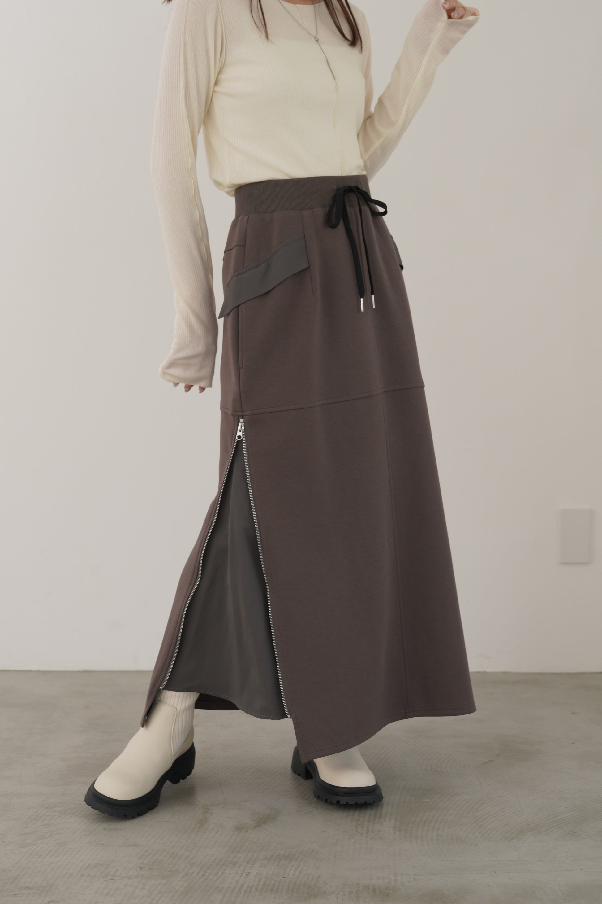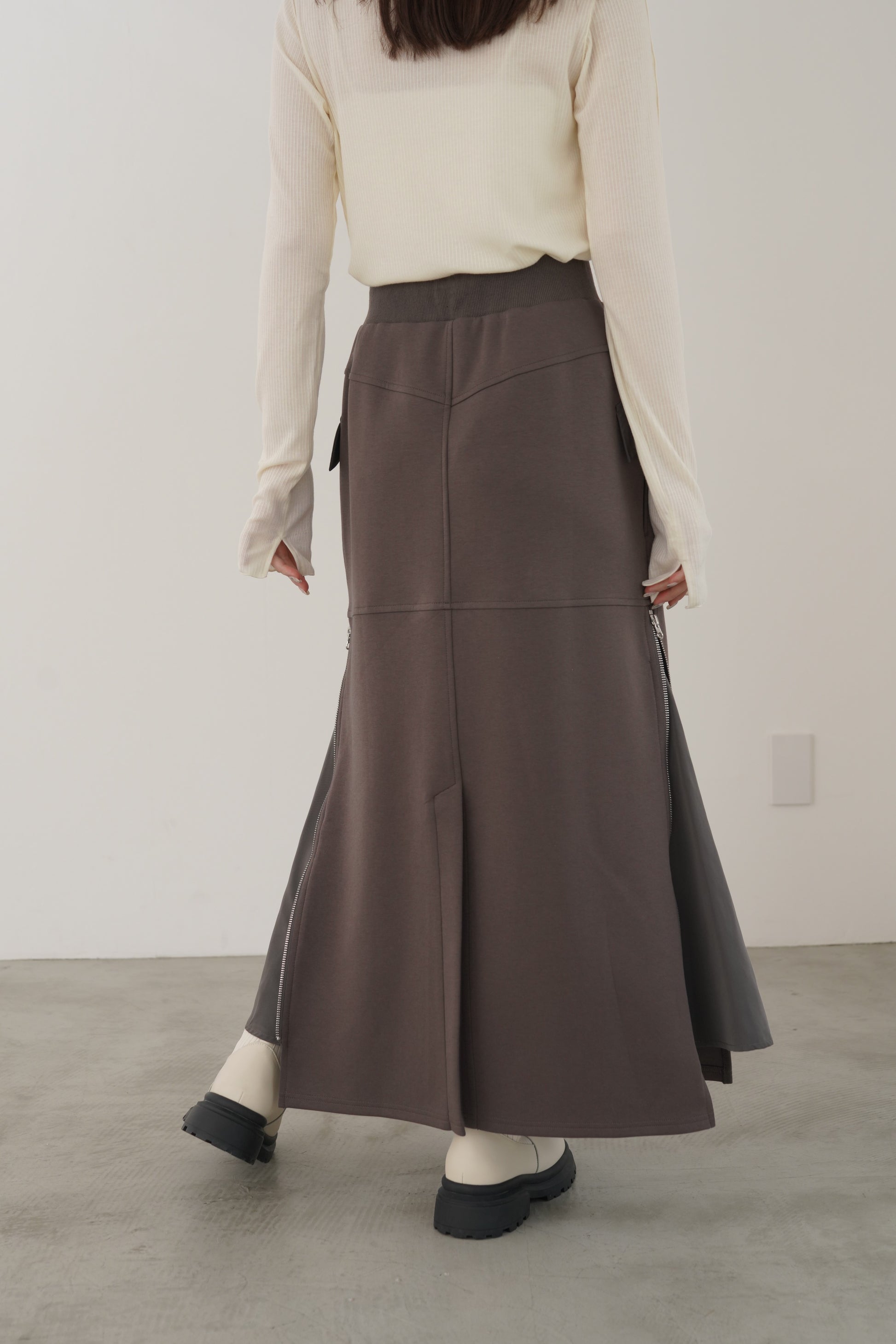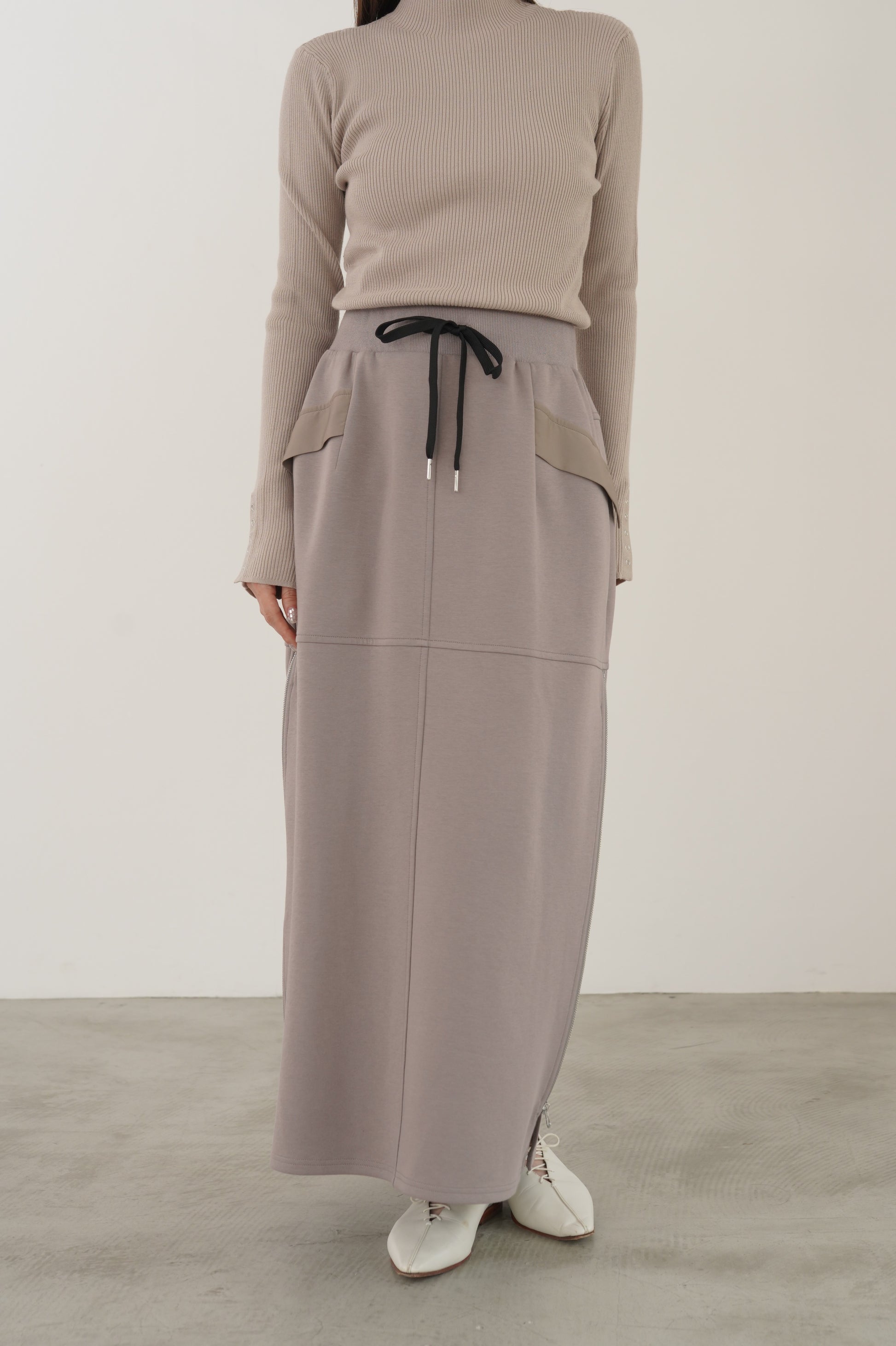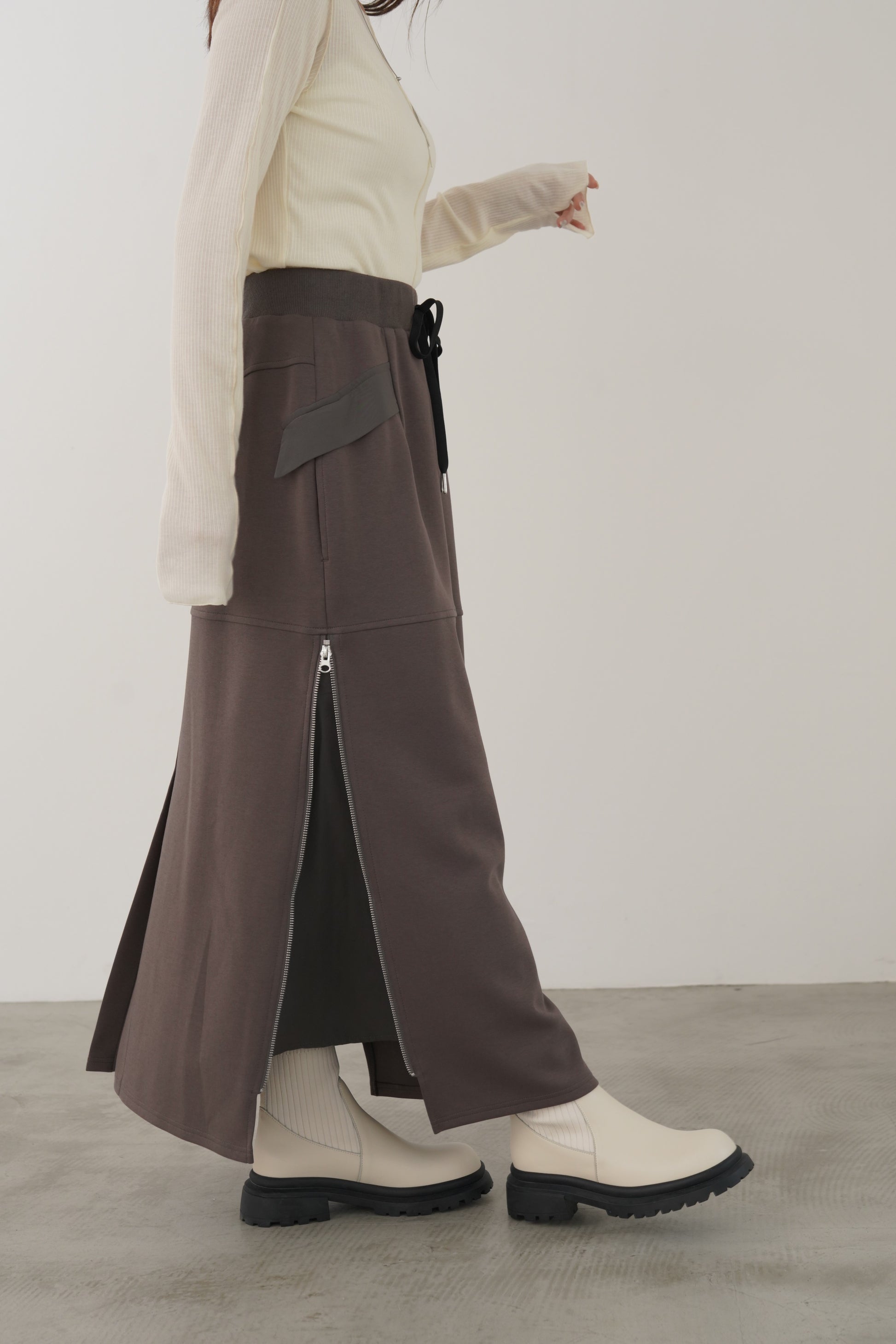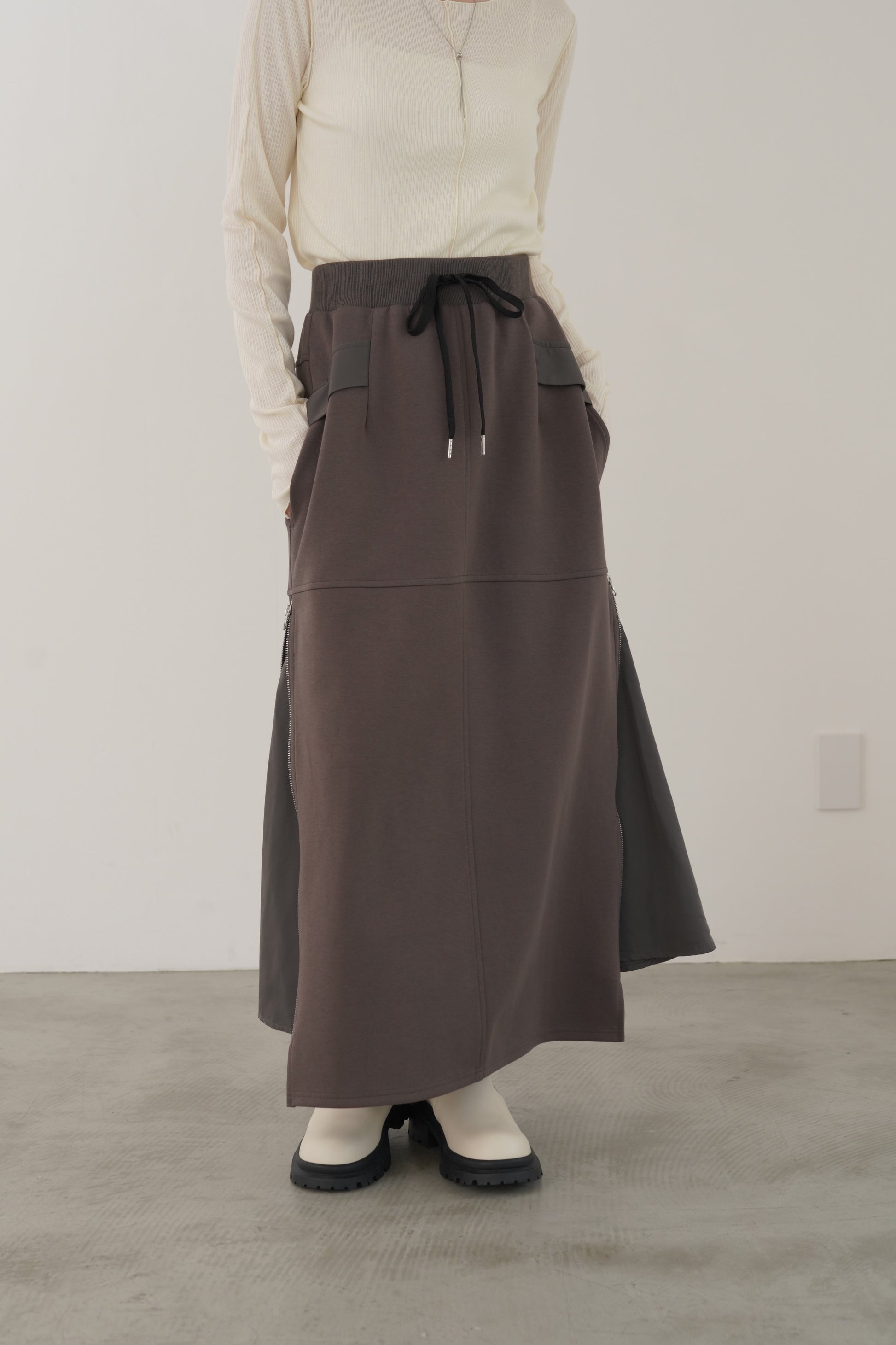 ハリ感となめらかさを併せ持つダンボールニットのタイトスカート。安心感のある肉感でストレッチ性も高く着心地は抜群です。サイドのファスナーを開けるとツヤのあるツイルがのぞき、動くたびに揺れるフレアツイルが女性らしいスカートです。
