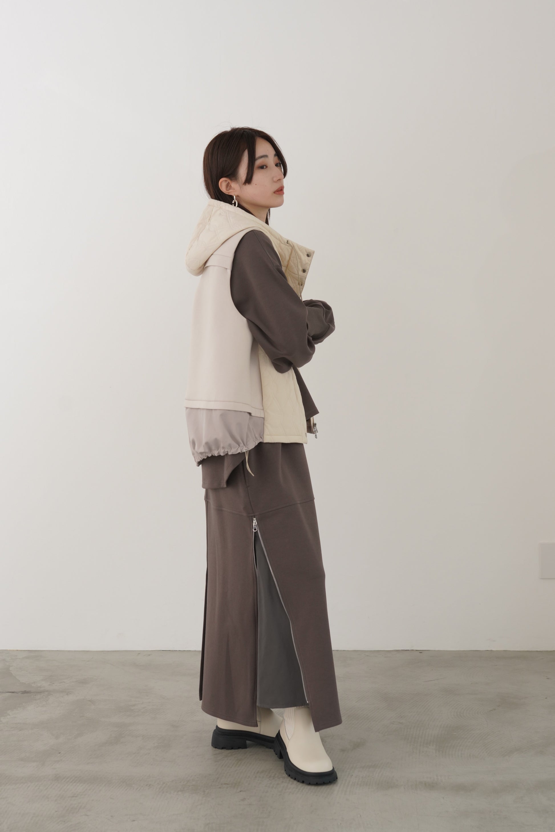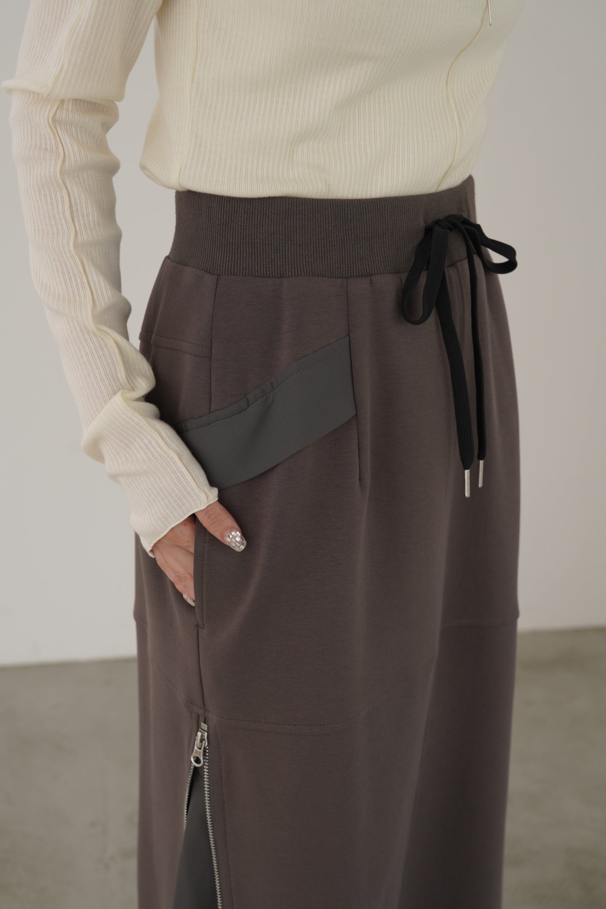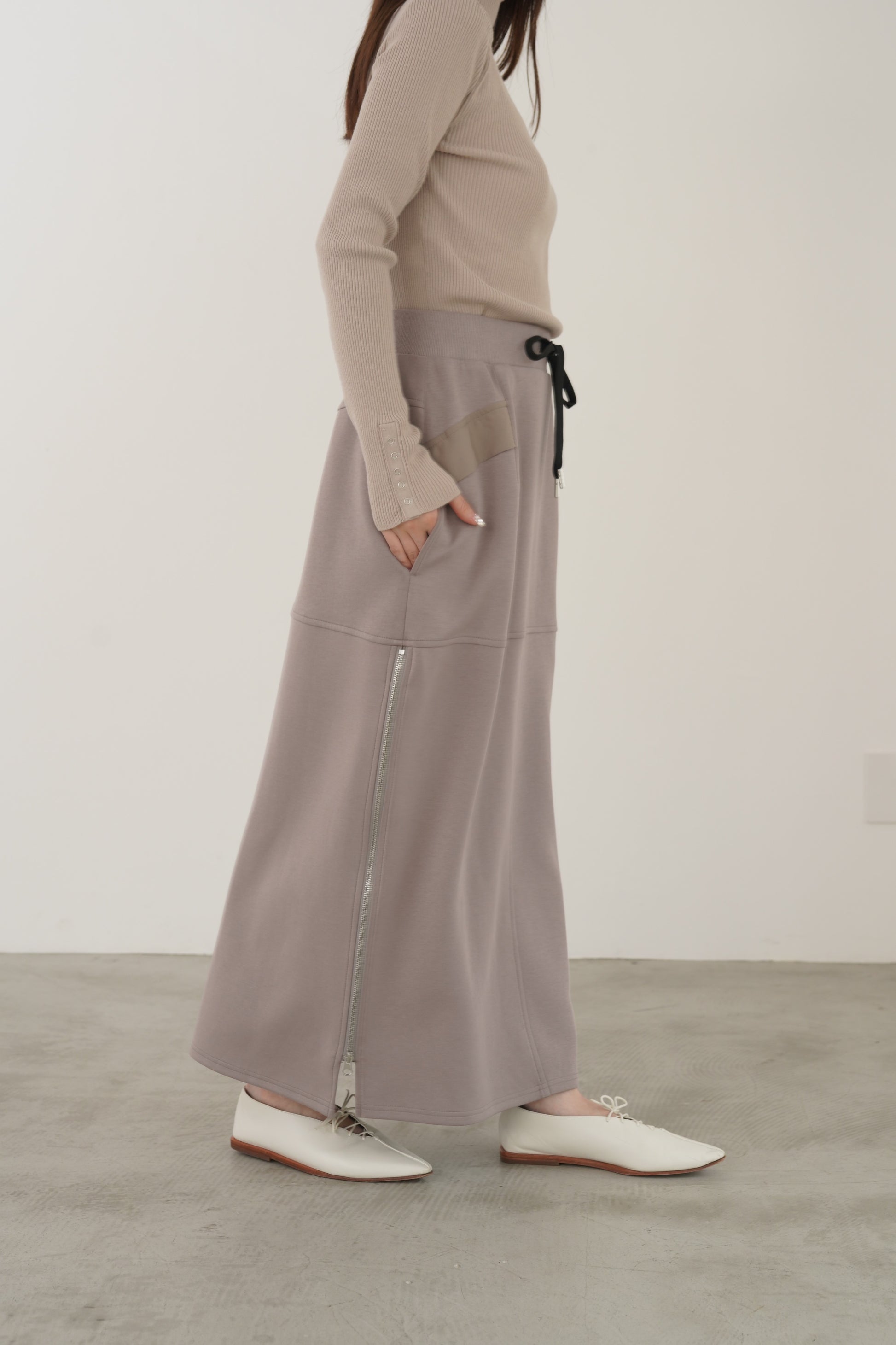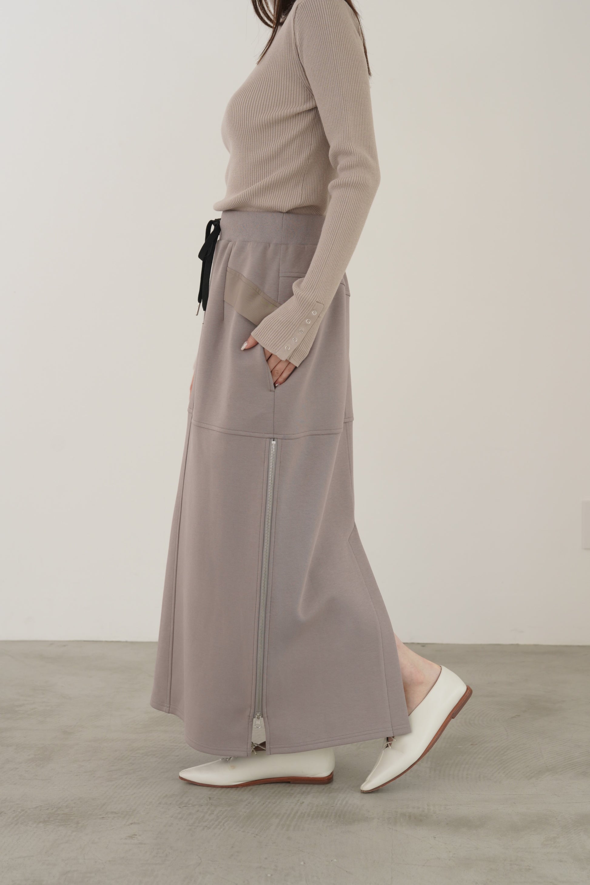 ハリ感となめらかさを併せ持つダンボールニットのタイトスカート。安心感のある肉感でストレッチ性も高く着心地は抜群です。サイドのファスナーを開けるとツヤのあるツイルがのぞき、動くたびに揺れるフレアツイルが女性らしいスカートです。