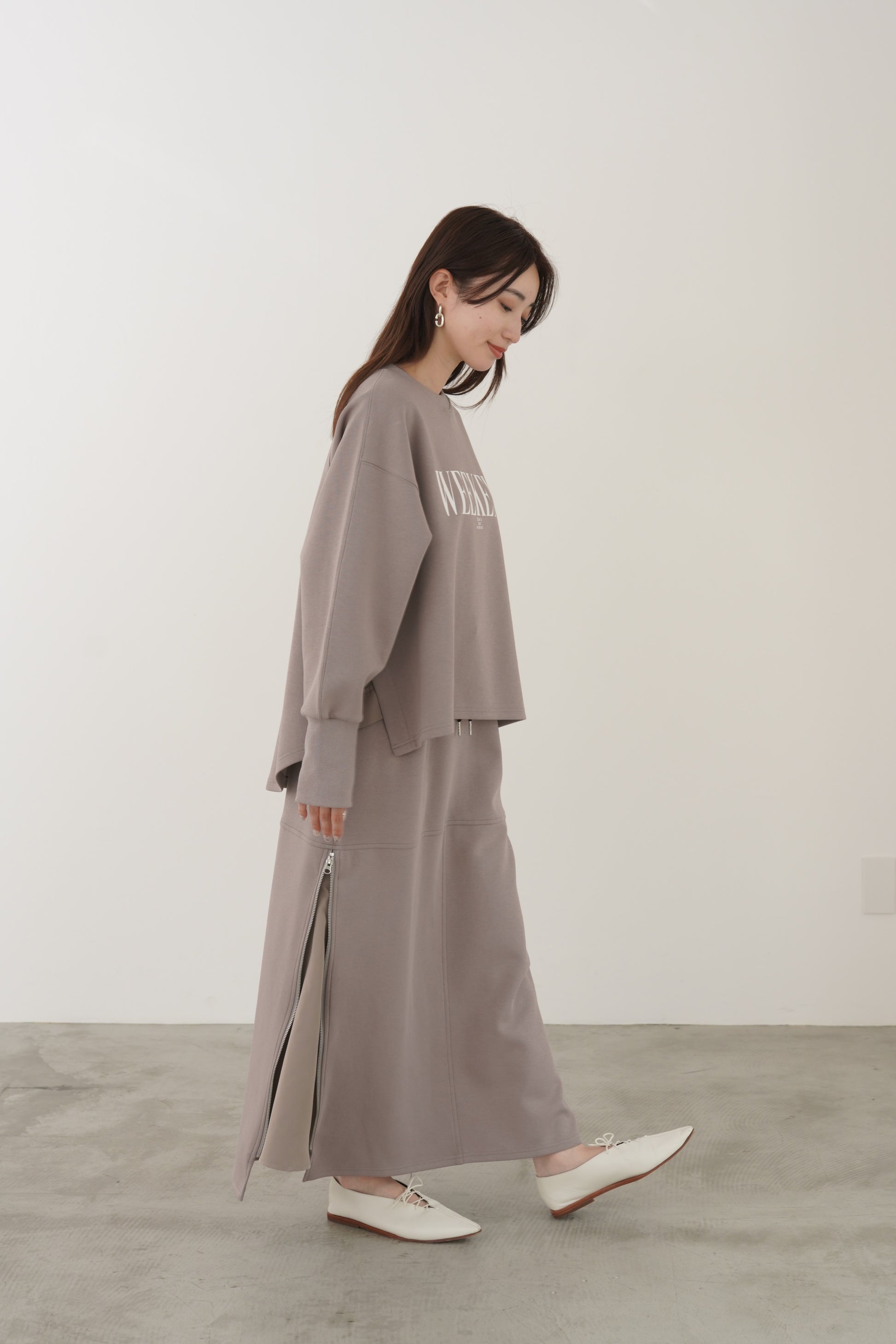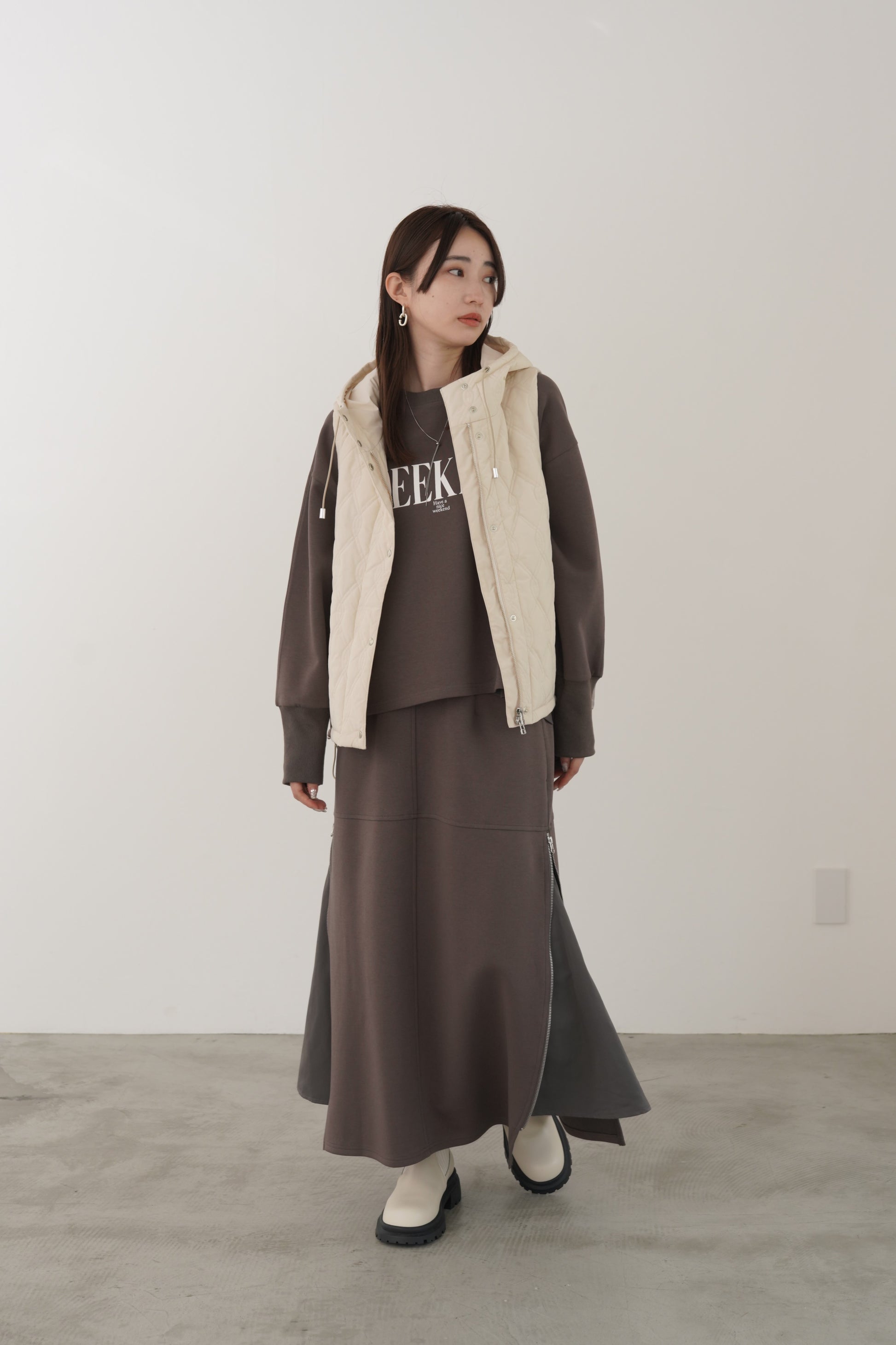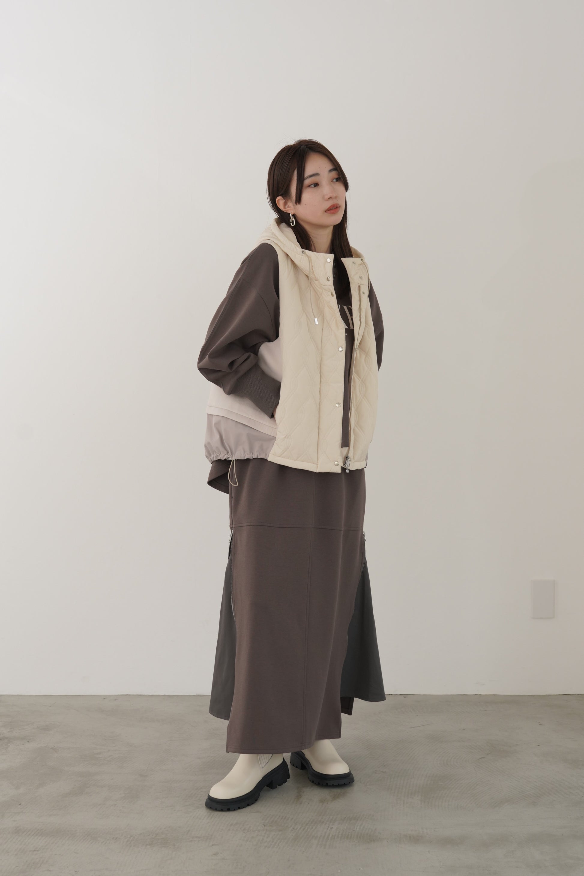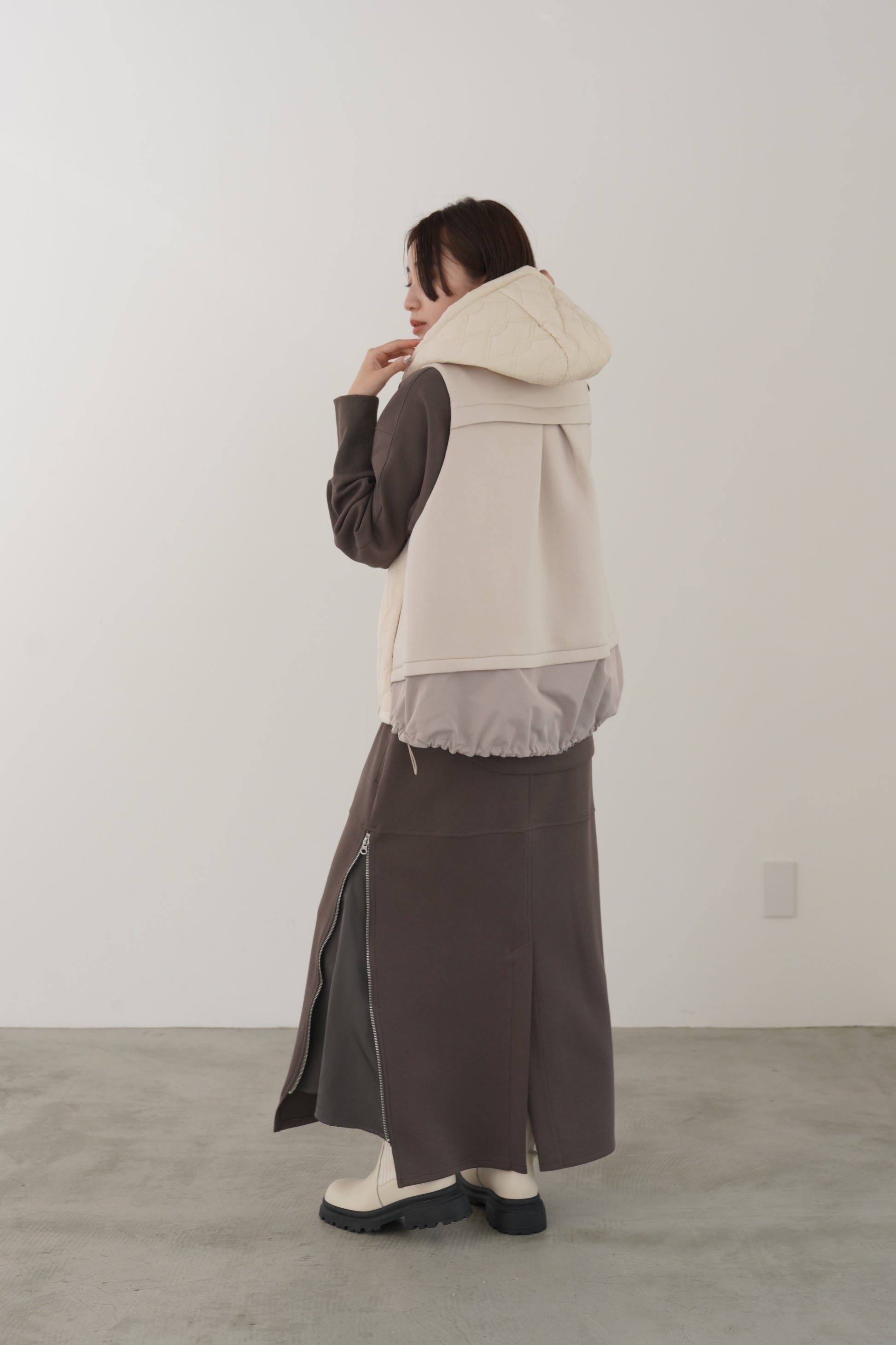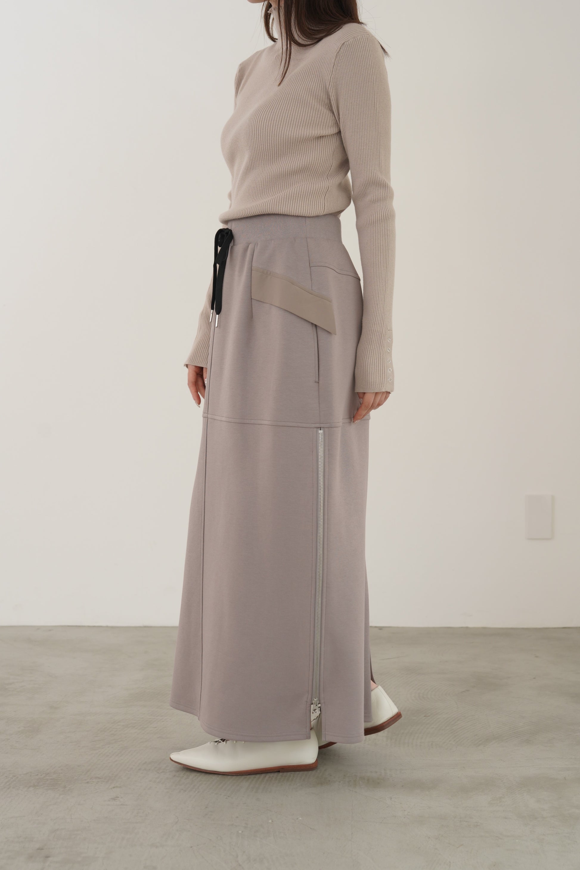 ハリ感となめらかさを併せ持つダンボールニットのタイトスカート。安心感のある肉感でストレッチ性も高く着心地は抜群です。サイドのファスナーを開けるとツヤのあるツイルがのぞき、動くたびに揺れるフレアツイルが女性らしいスカートです。