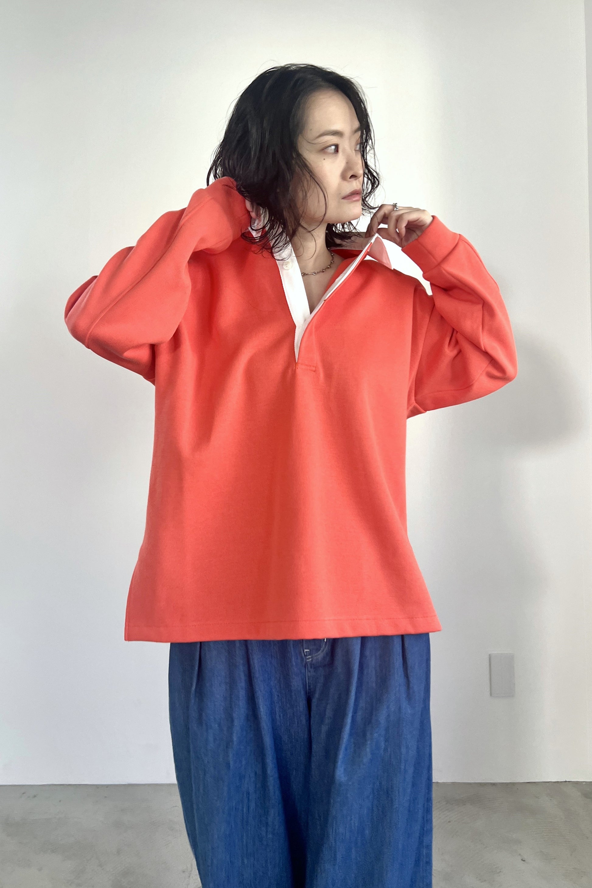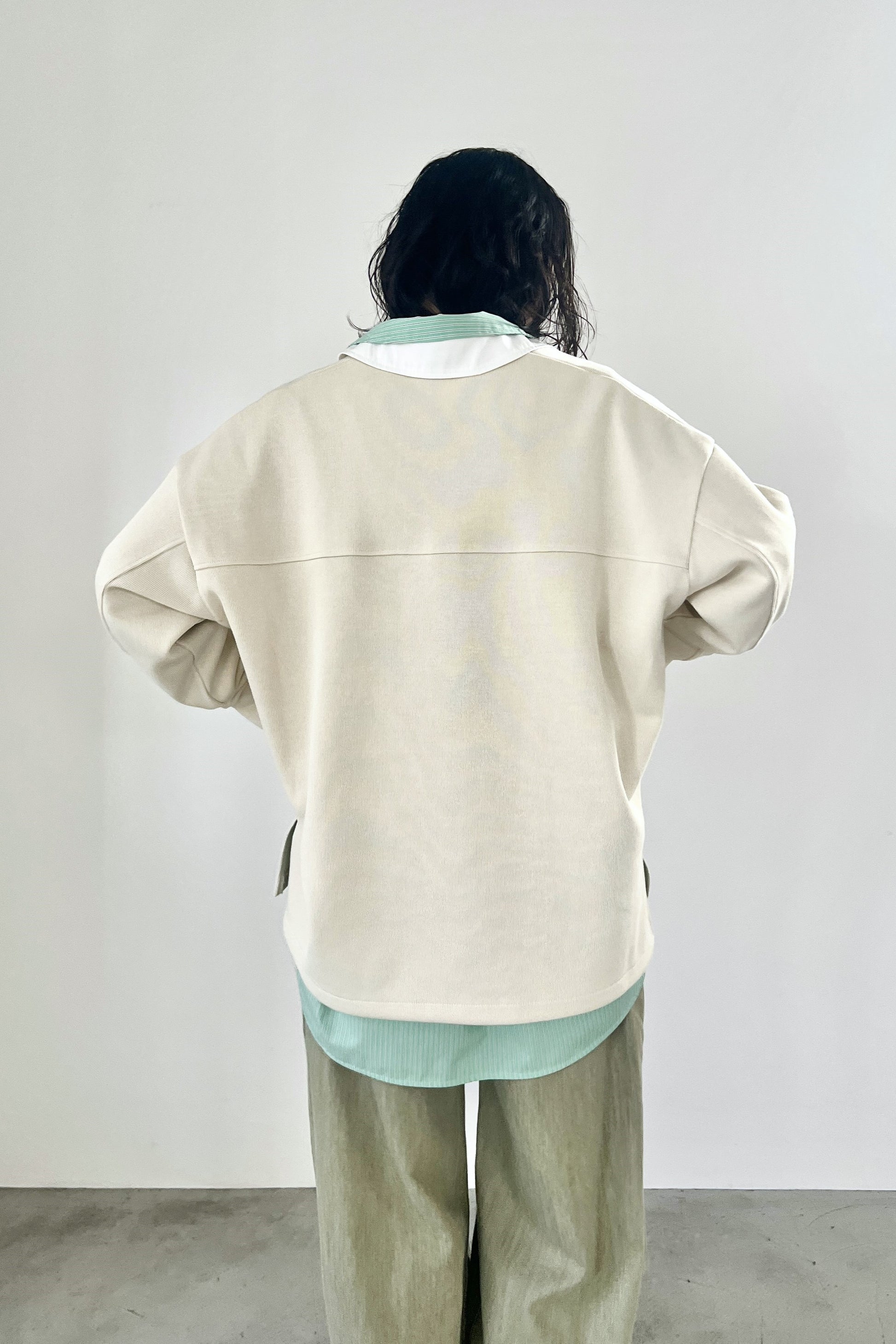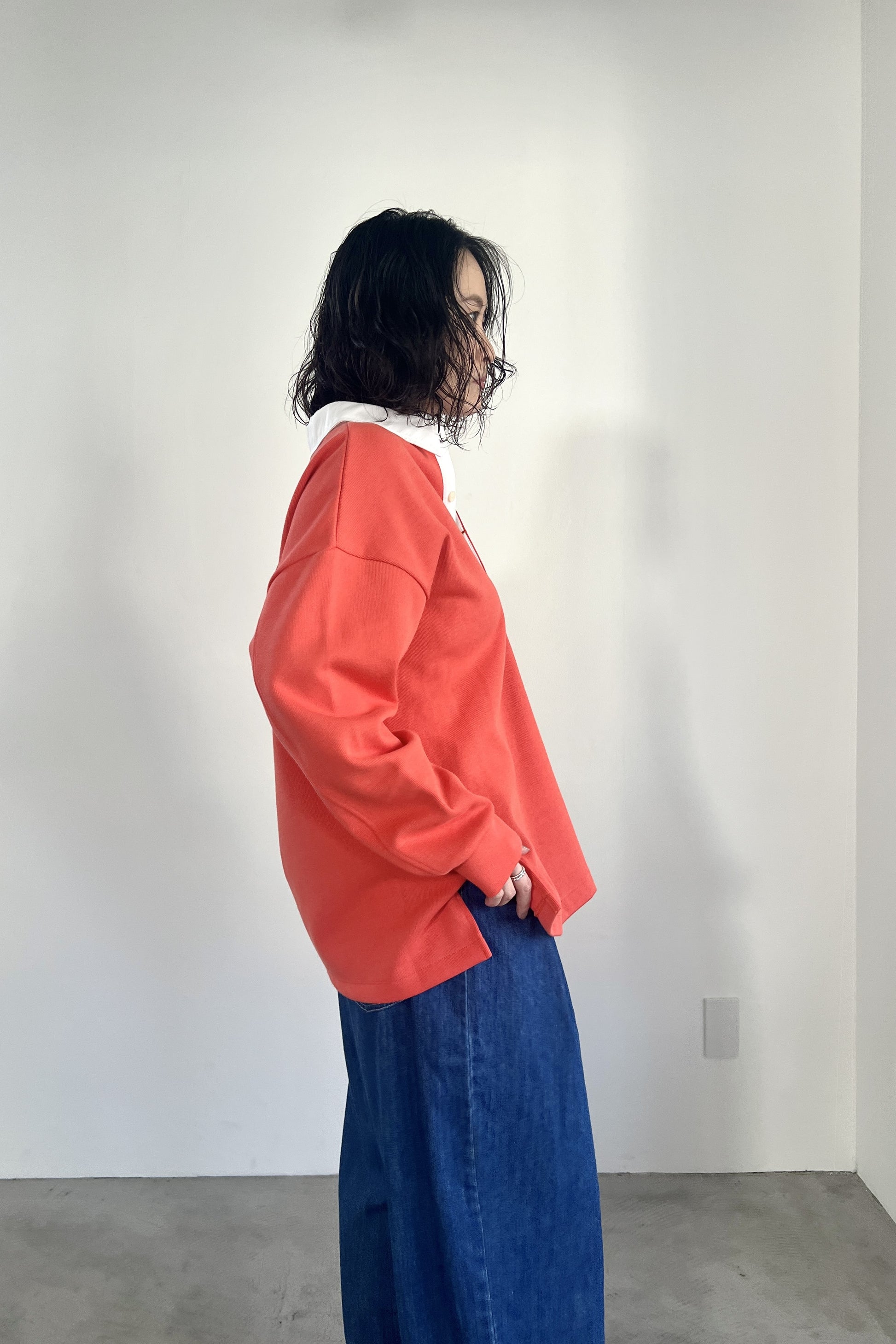ニットライクなダンボールニットを使用したラガーシャツ。ハイゲージのような表面感の素材を使用することで、カジュアルながらも高級感のある大人のラガーシャツに仕上げました。胸元を開けたゆるっとした着こなしがおすすめです。