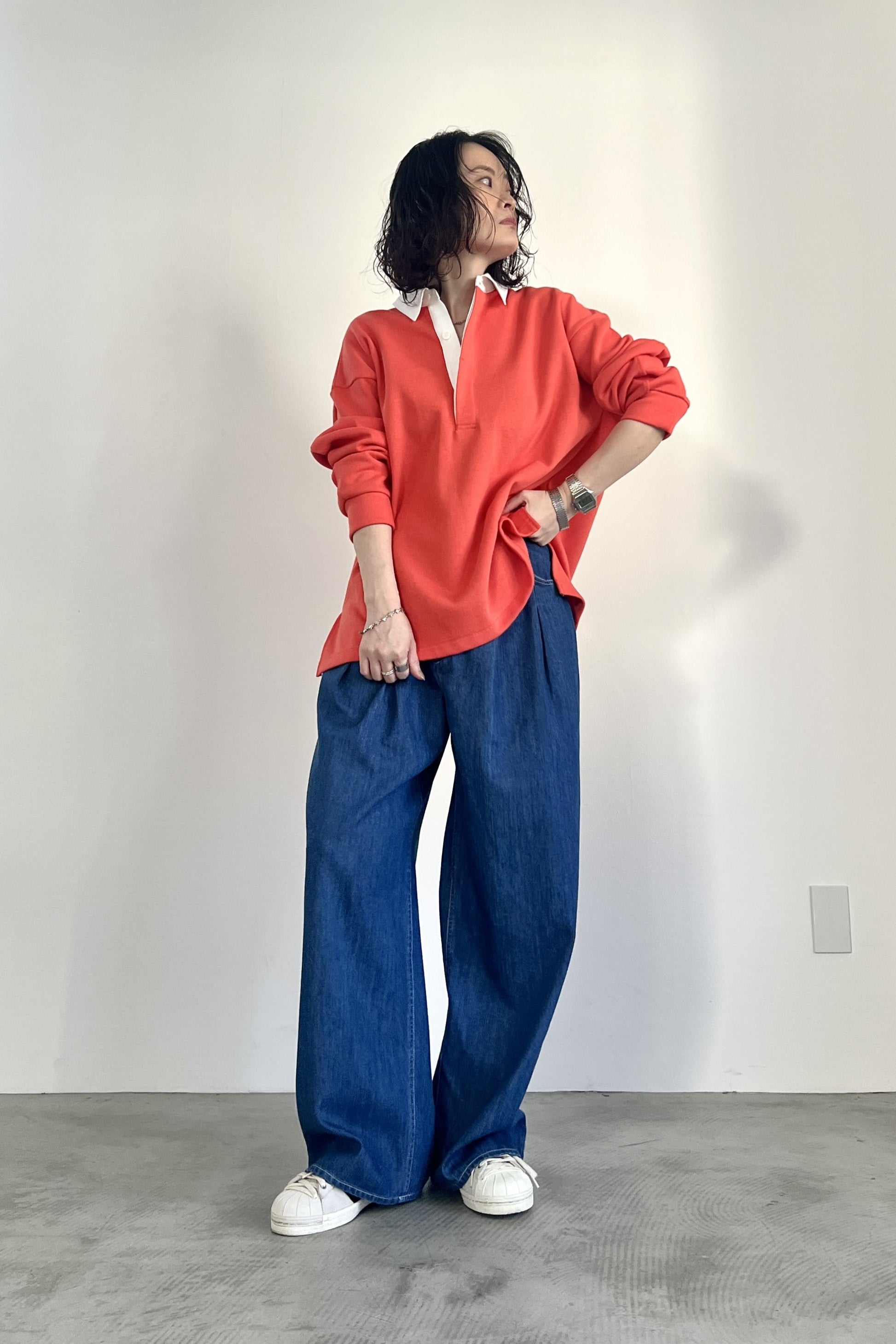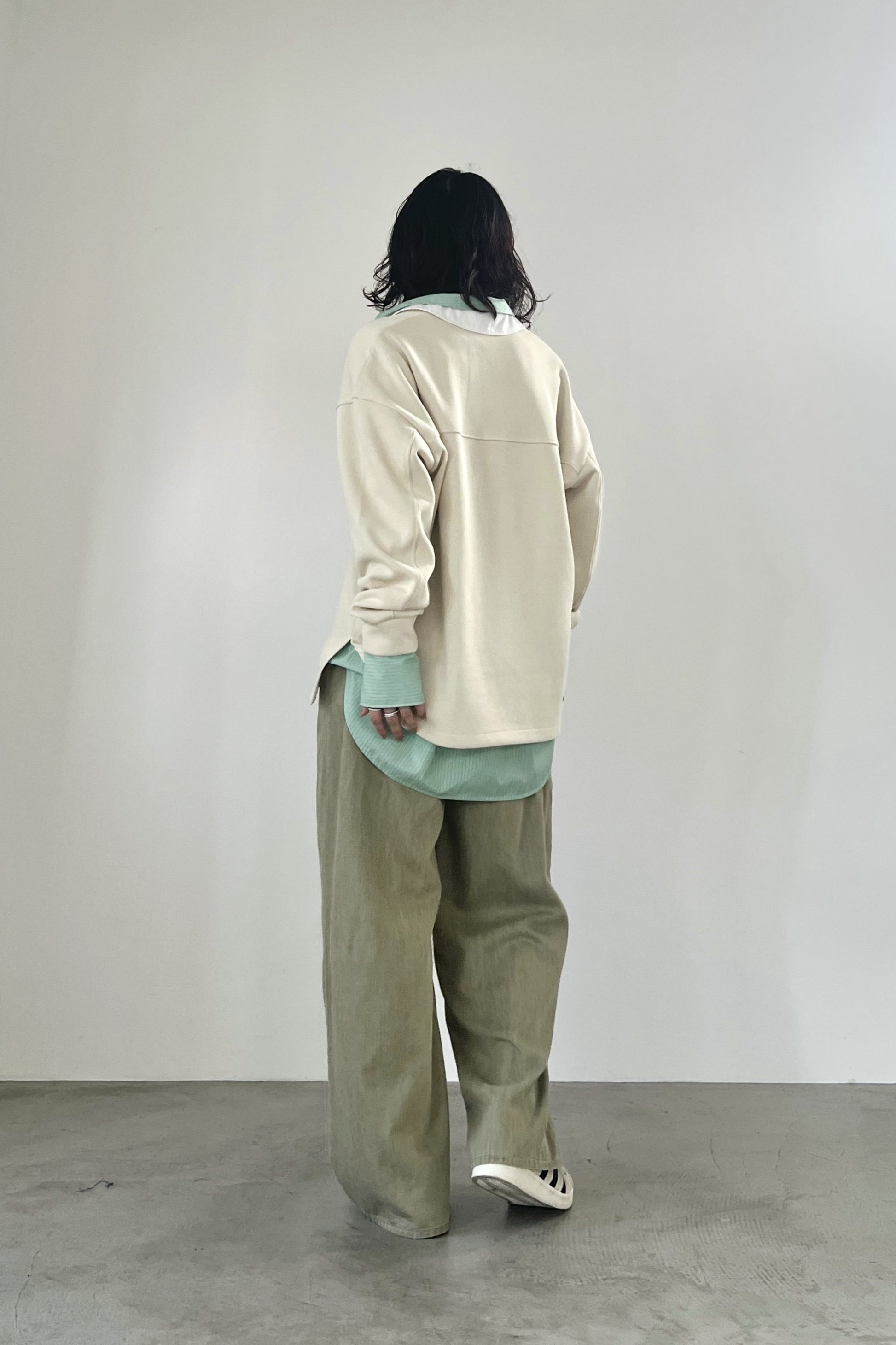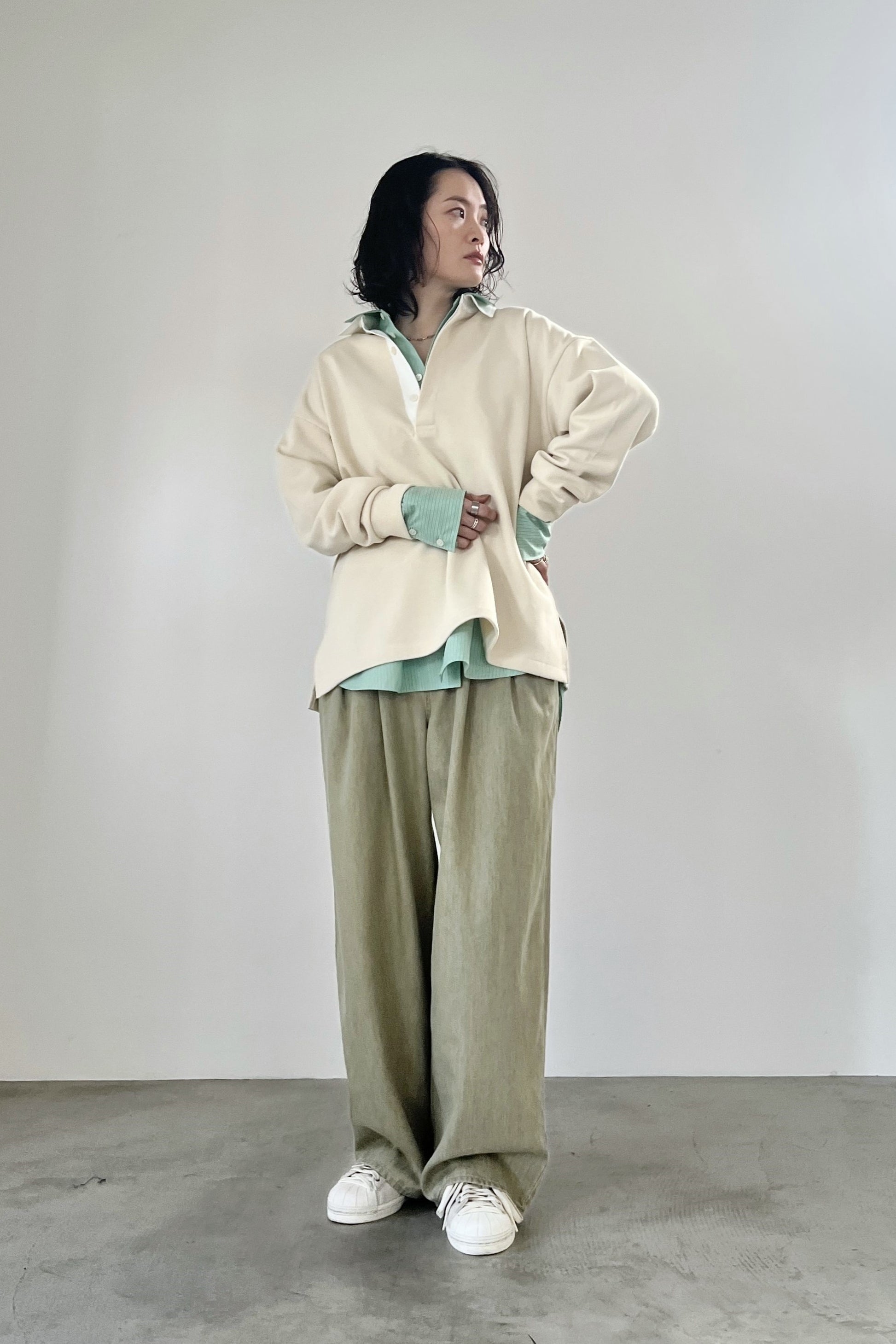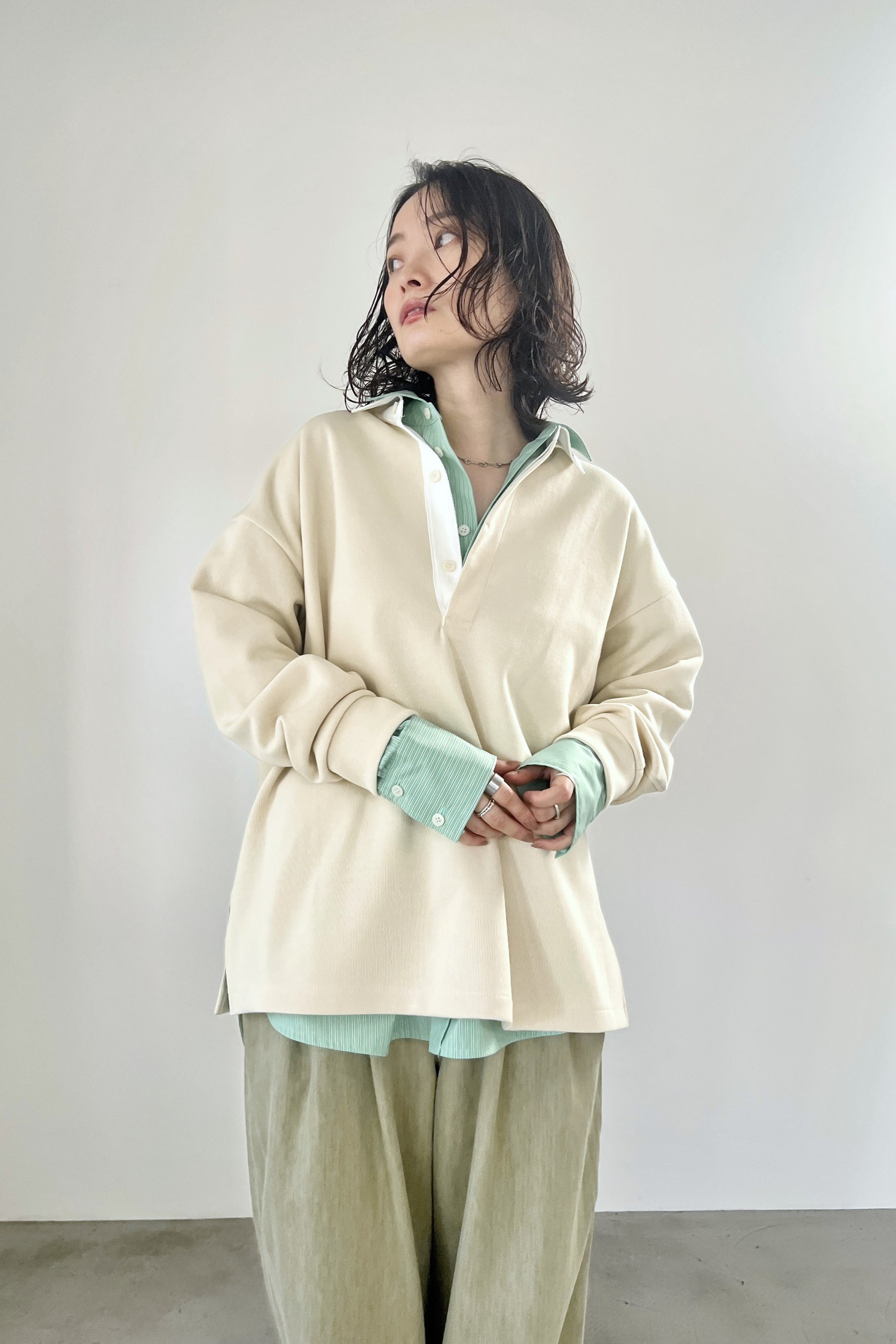 ニットライクなダンボールニットを使用したラガーシャツ。ハイゲージのような表面感の素材を使用することで、カジュアルながらも高級感のある大人のラガーシャツに仕上げました。胸元を開けたゆるっとした着こなしがおすすめです。