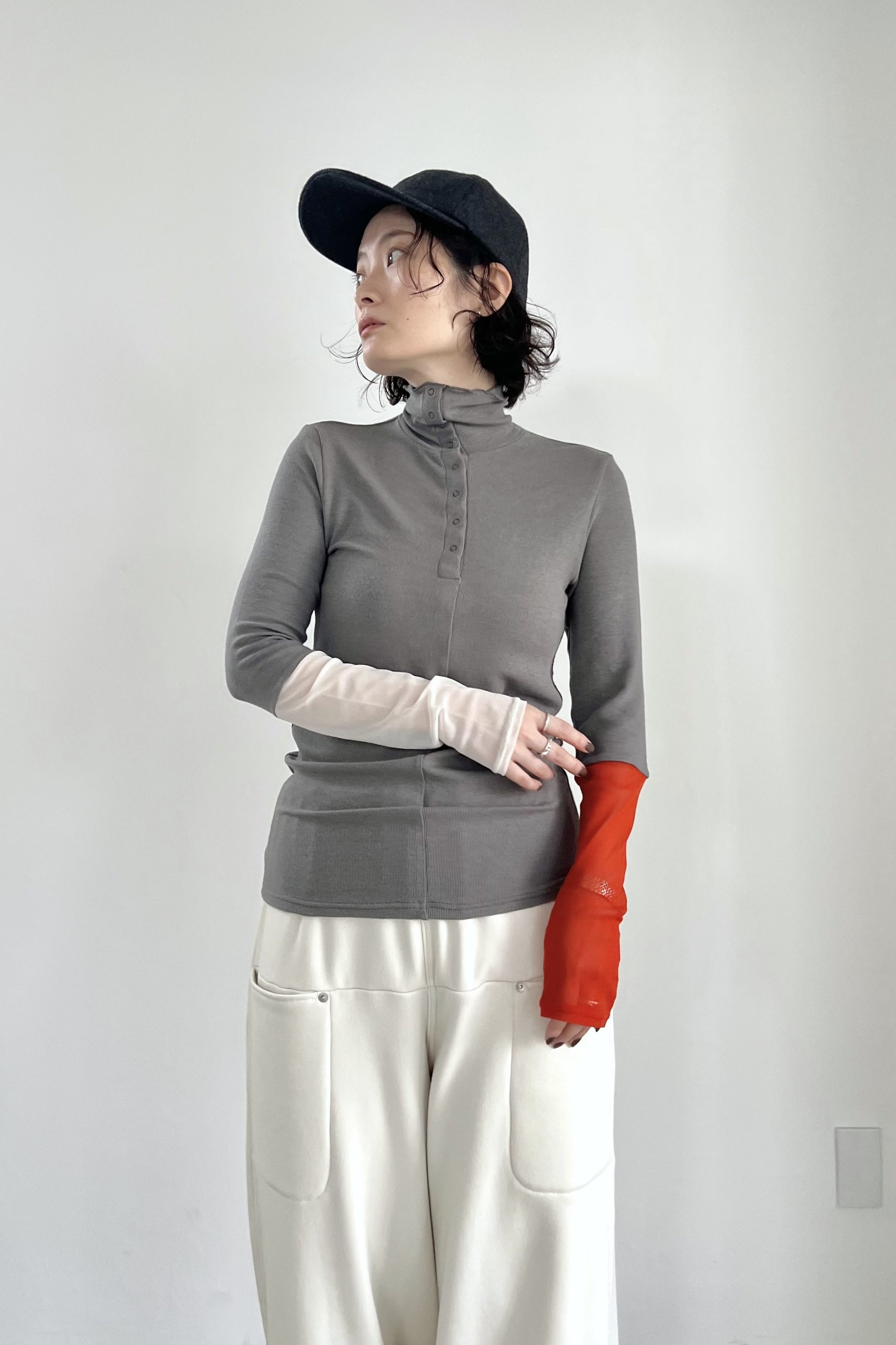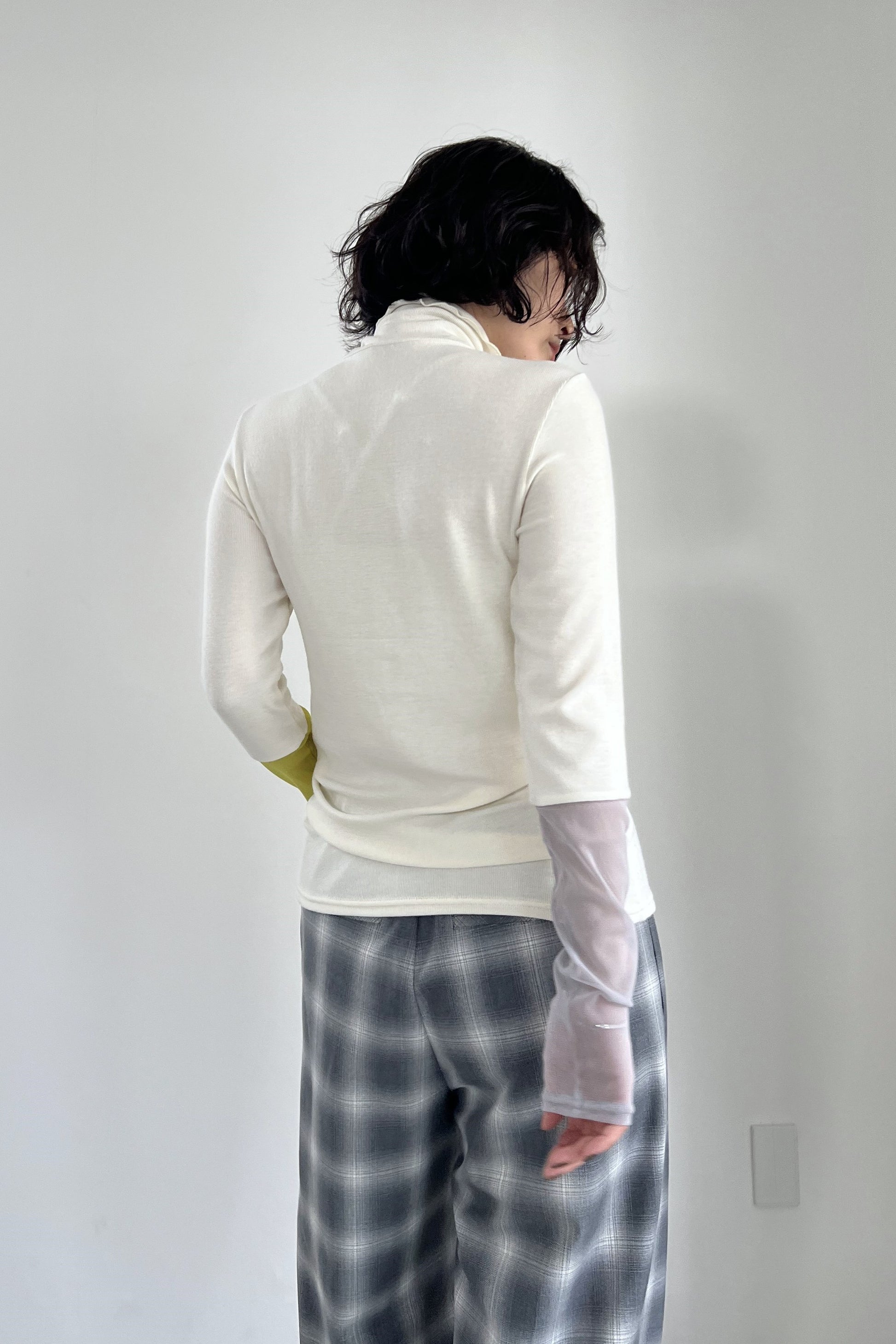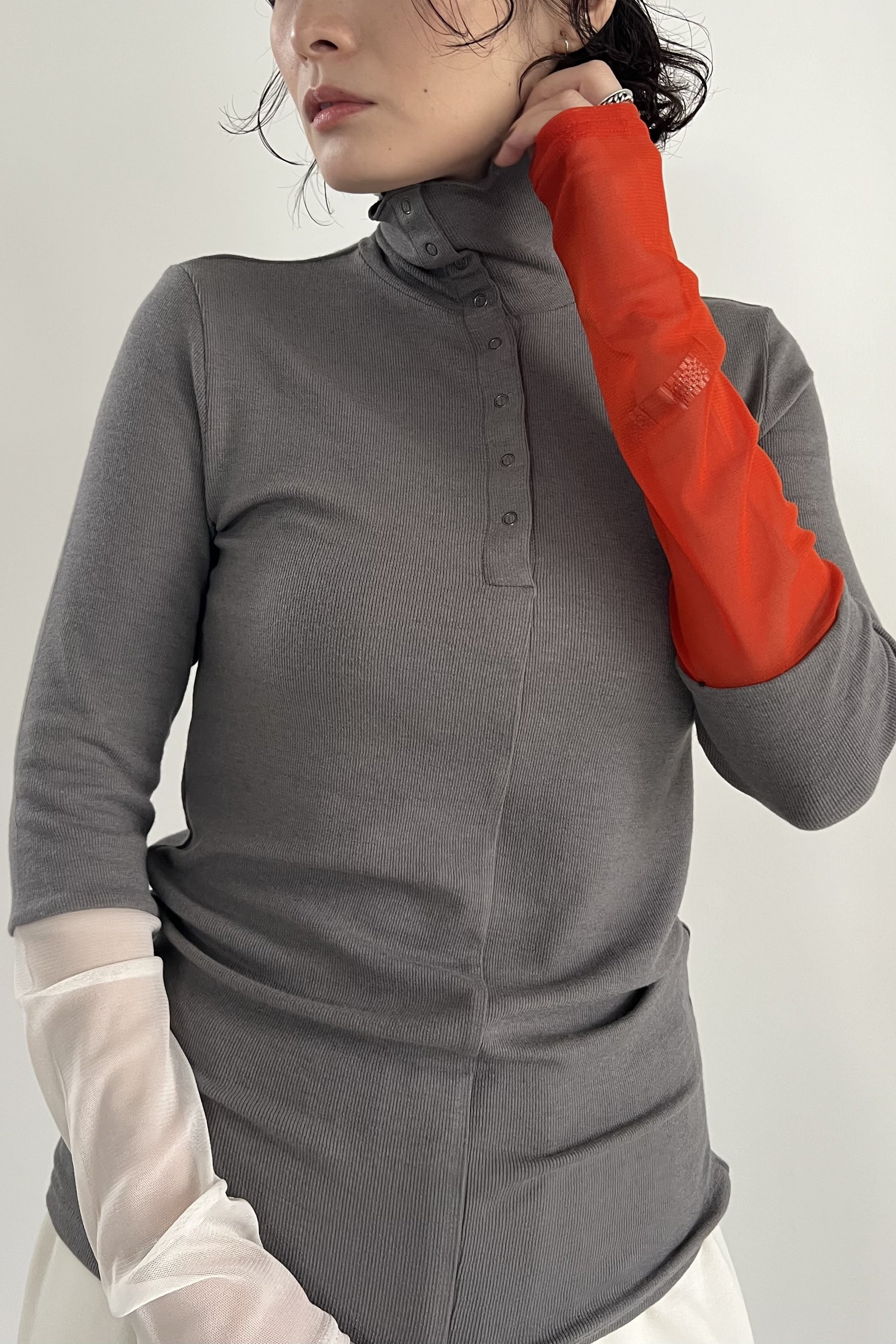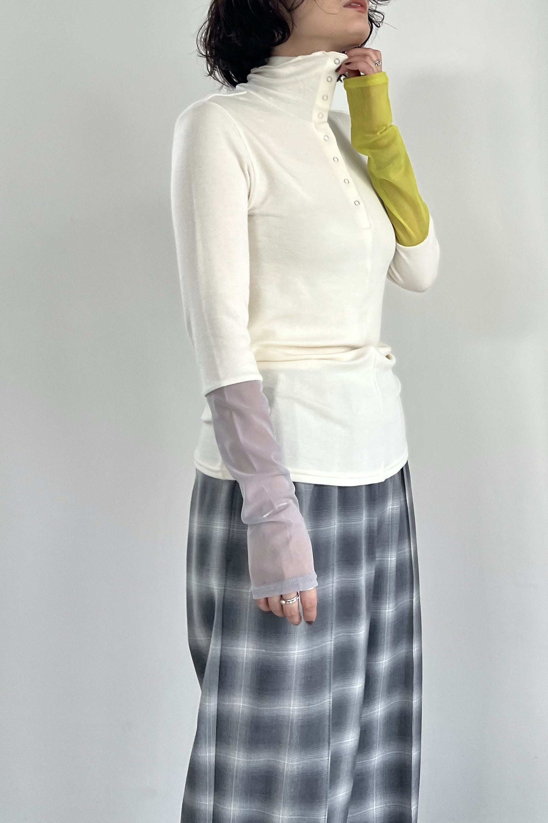 バイカラーのチュールスリーブがキャッチーなリブタートル。身頃にはウールの暖かみと、レーヨンの柔らかさ、抜群の伸縮性を兼ね備えたエンジェルウールリブを使用しています。防縮ウールをヴィスコースレーヨンで包み込んだ二層構造の糸なので、ウール特有のチクチクさがなく、快適に着用していただけます。衿元のボタンを開けて着用するのもおすすめです。