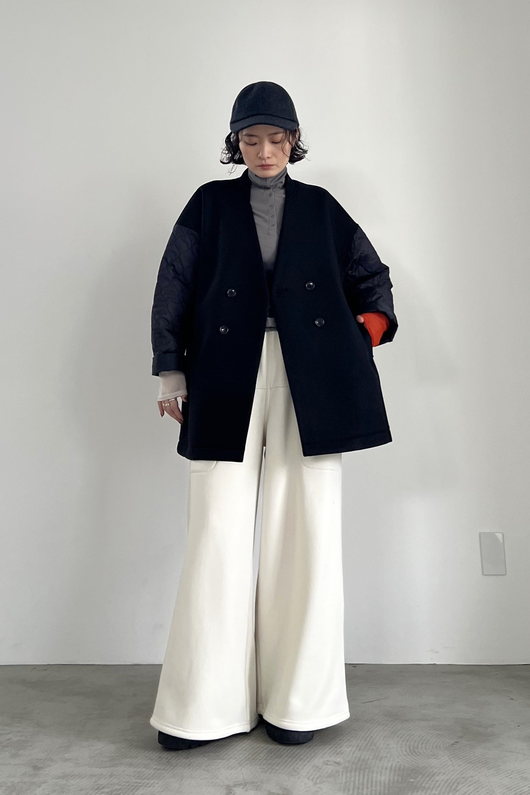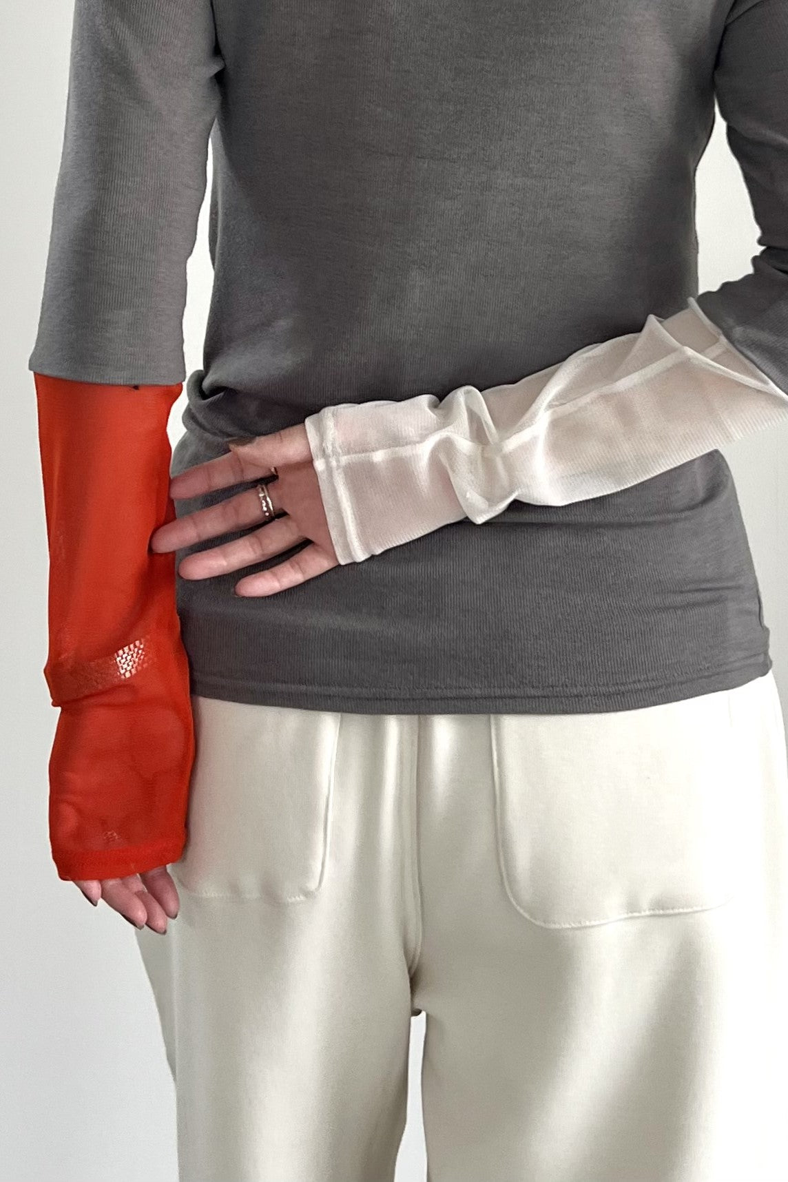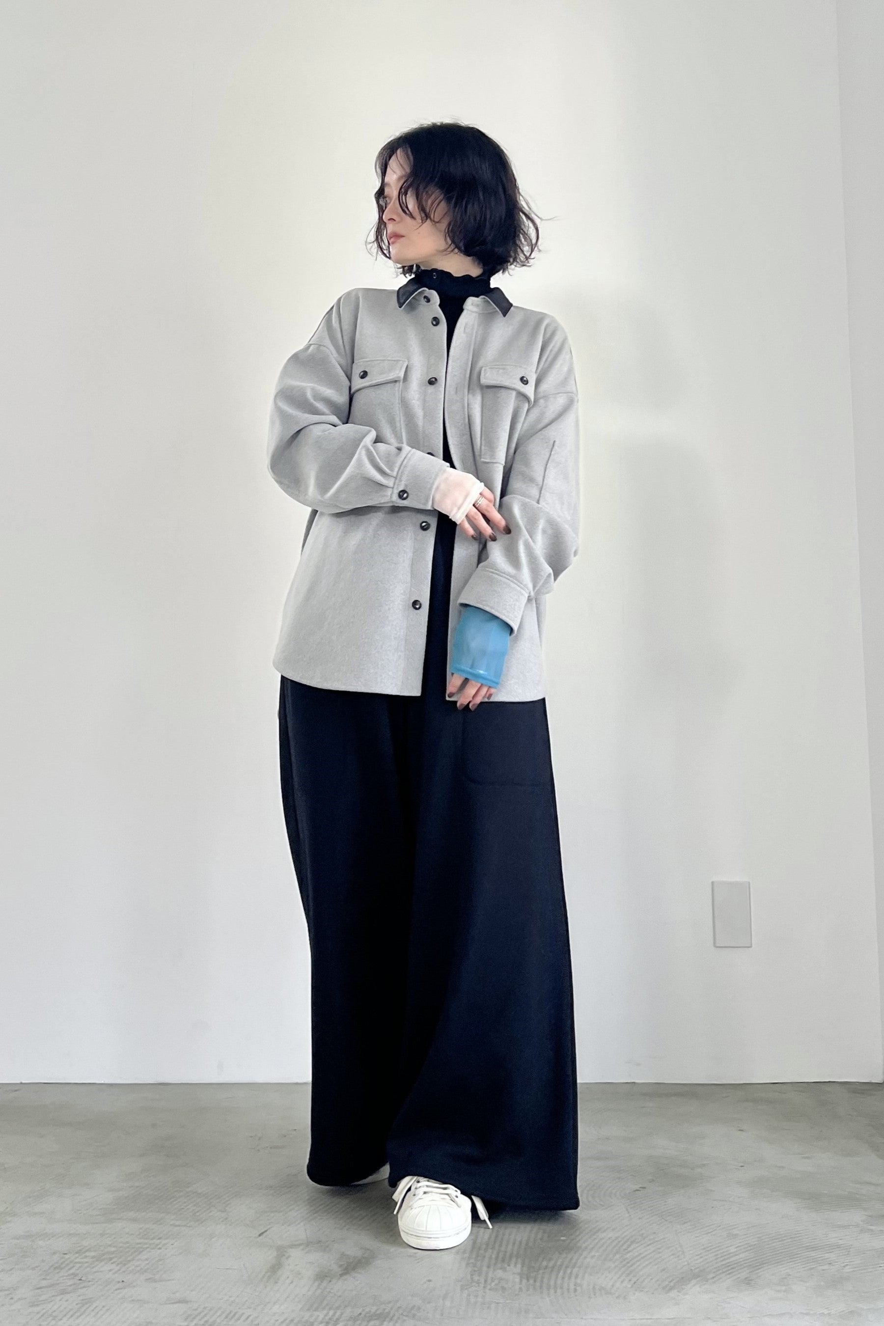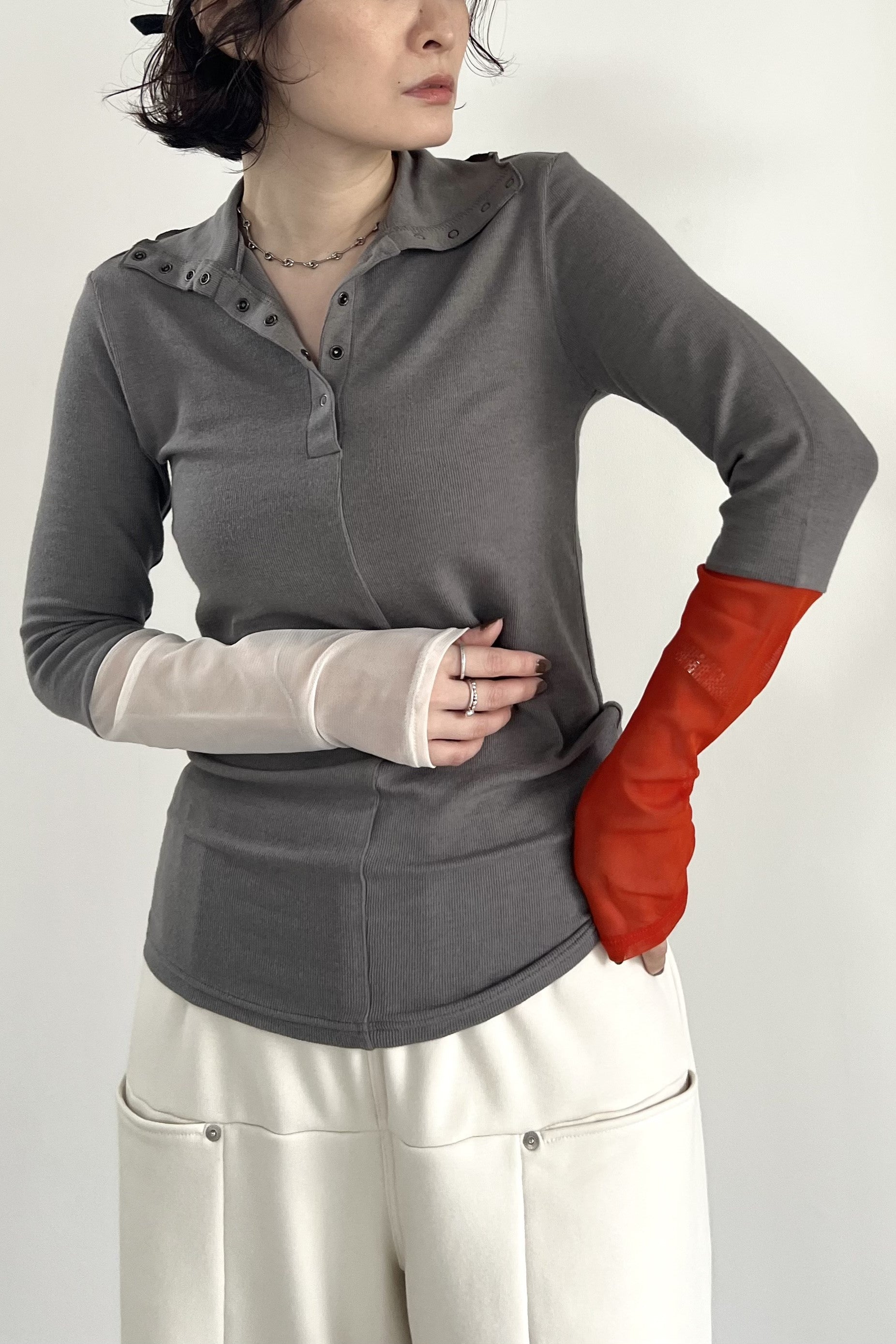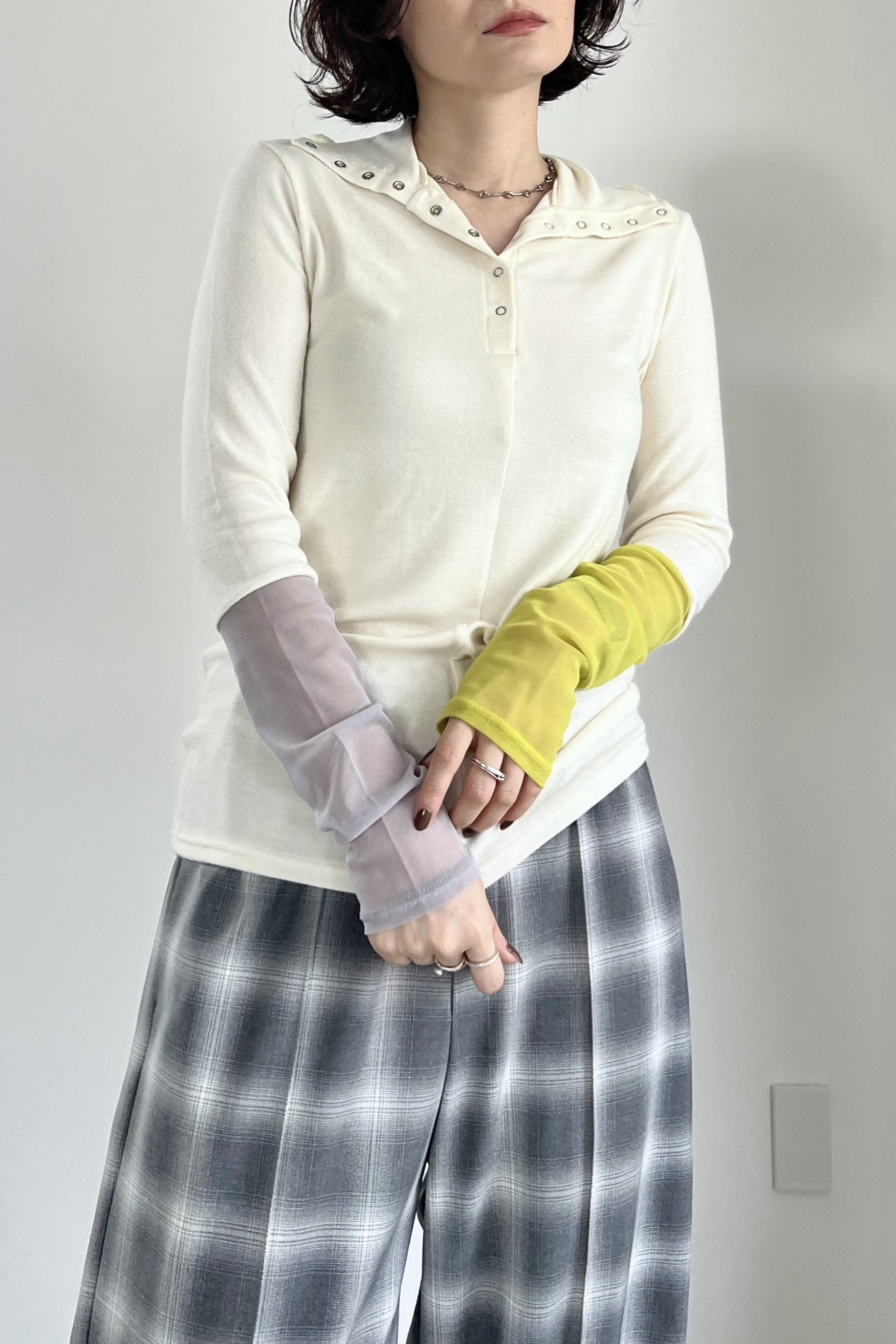 バイカラーのチュールスリーブがキャッチーなリブタートル。身頃にはウールの暖かみと、レーヨンの柔らかさ、抜群の伸縮性を兼ね備えたエンジェルウールリブを使用しています。防縮ウールをヴィスコースレーヨンで包み込んだ二層構造の糸なので、ウール特有のチクチクさがなく、快適に着用していただけます。衿元のボタンを開けて着用するのもおすすめです。