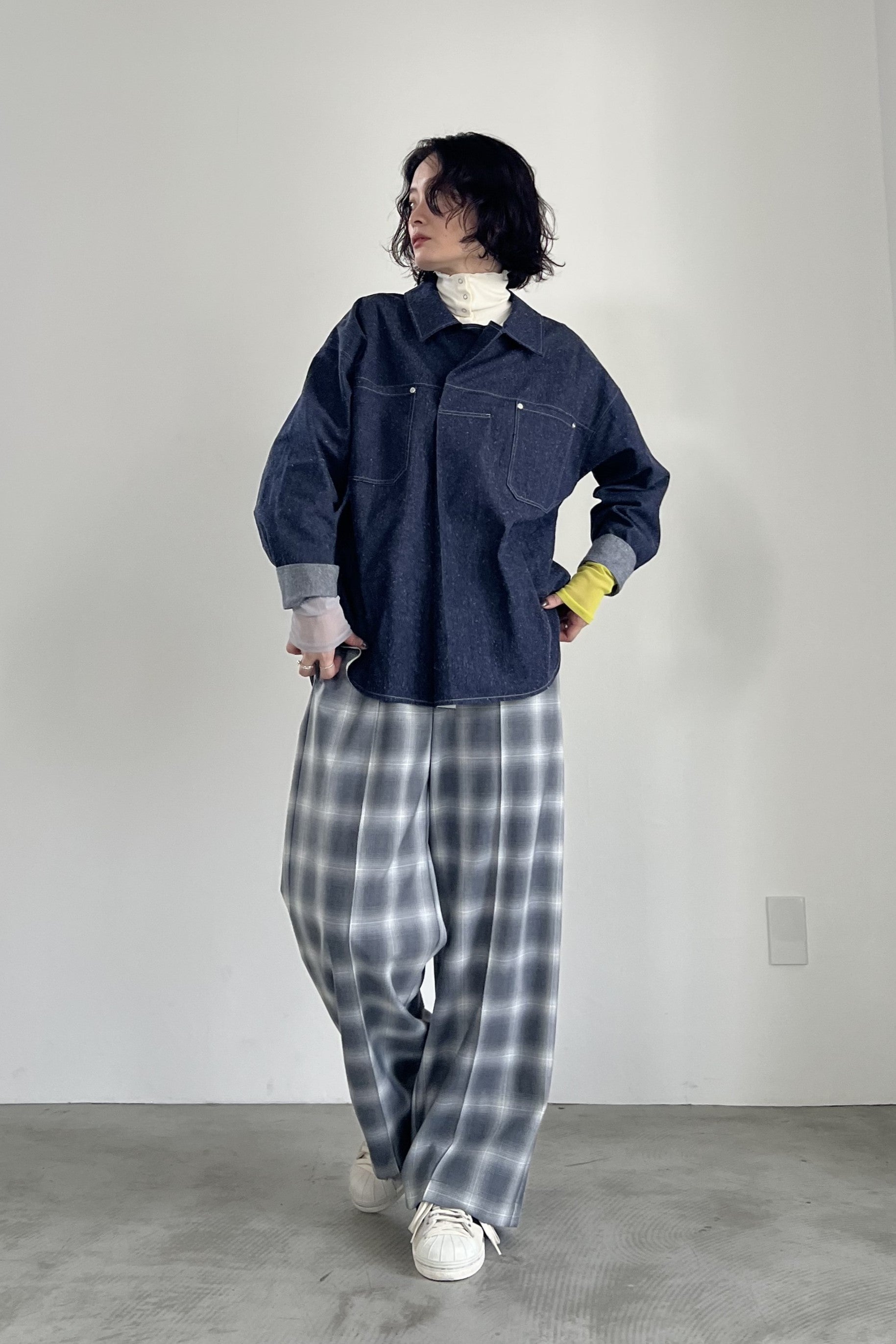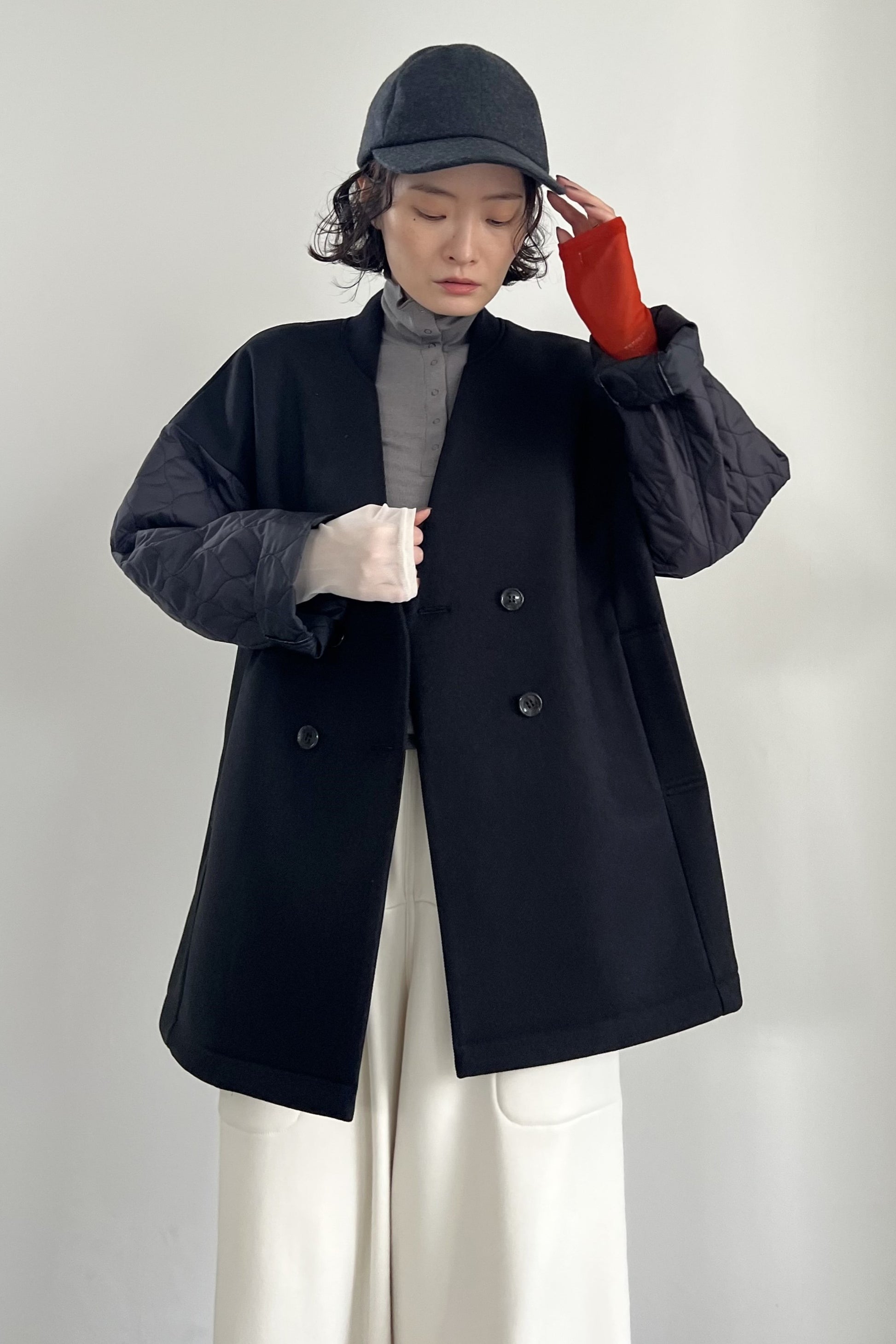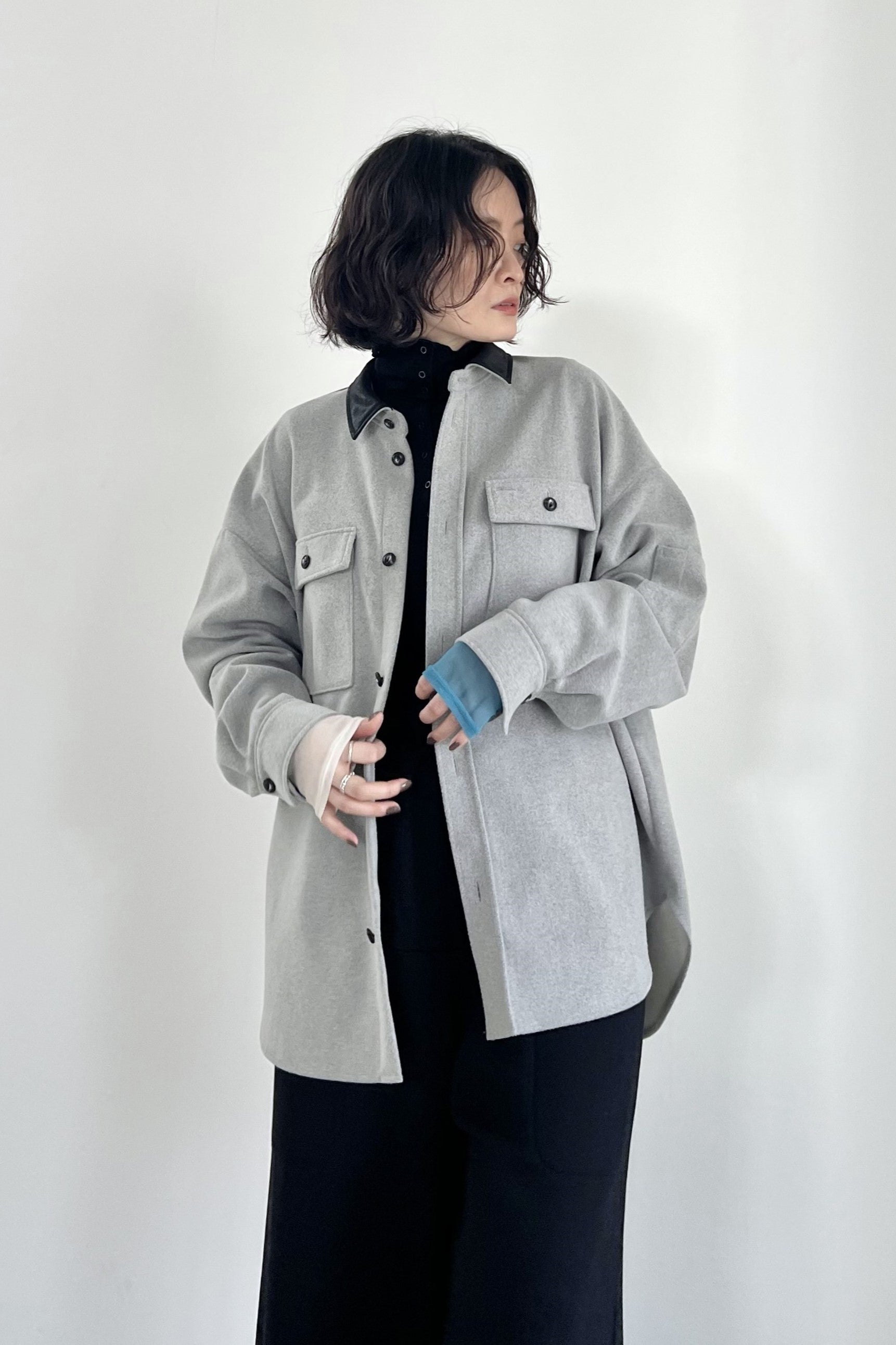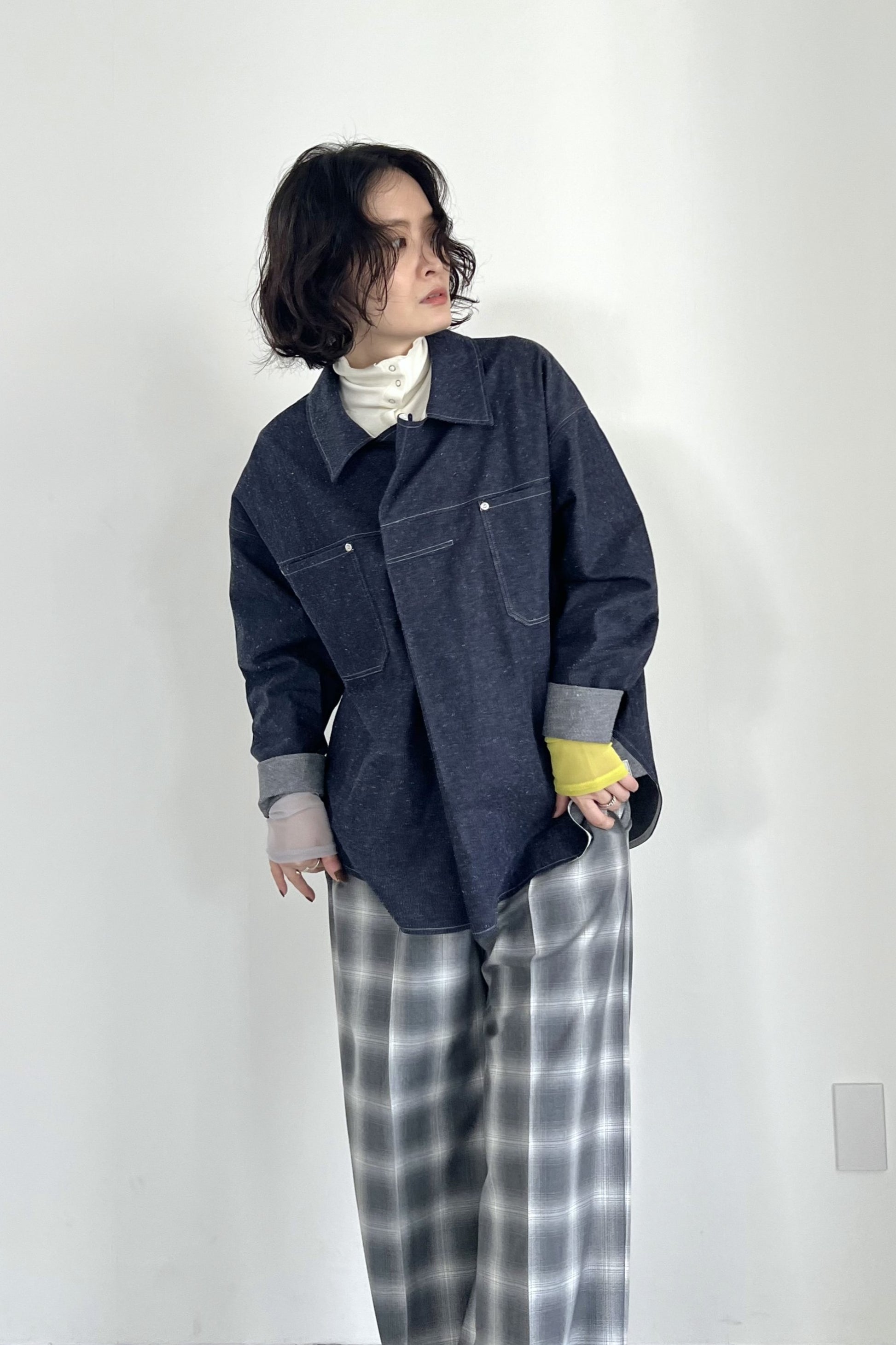 バイカラーのチュールスリーブがキャッチーなリブタートル。身頃にはウールの暖かみと、レーヨンの柔らかさ、抜群の伸縮性を兼ね備えたエンジェルウールリブを使用しています。防縮ウールをヴィスコースレーヨンで包み込んだ二層構造の糸なので、ウール特有のチクチクさがなく、快適に着用していただけます。衿元のボタンを開けて着用するのもおすすめです。
