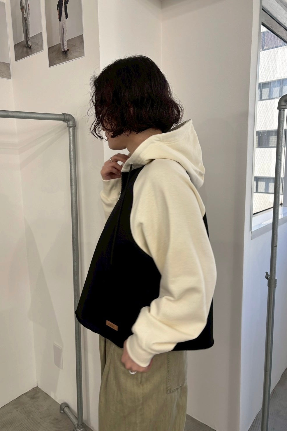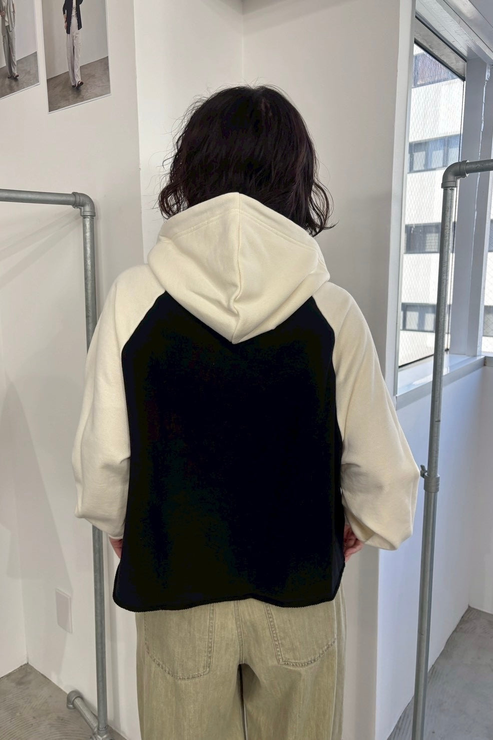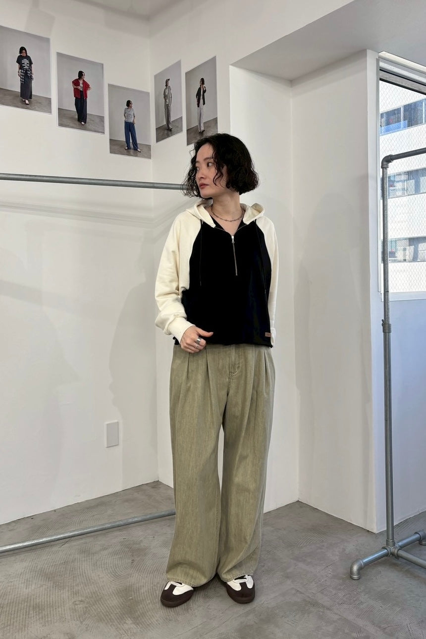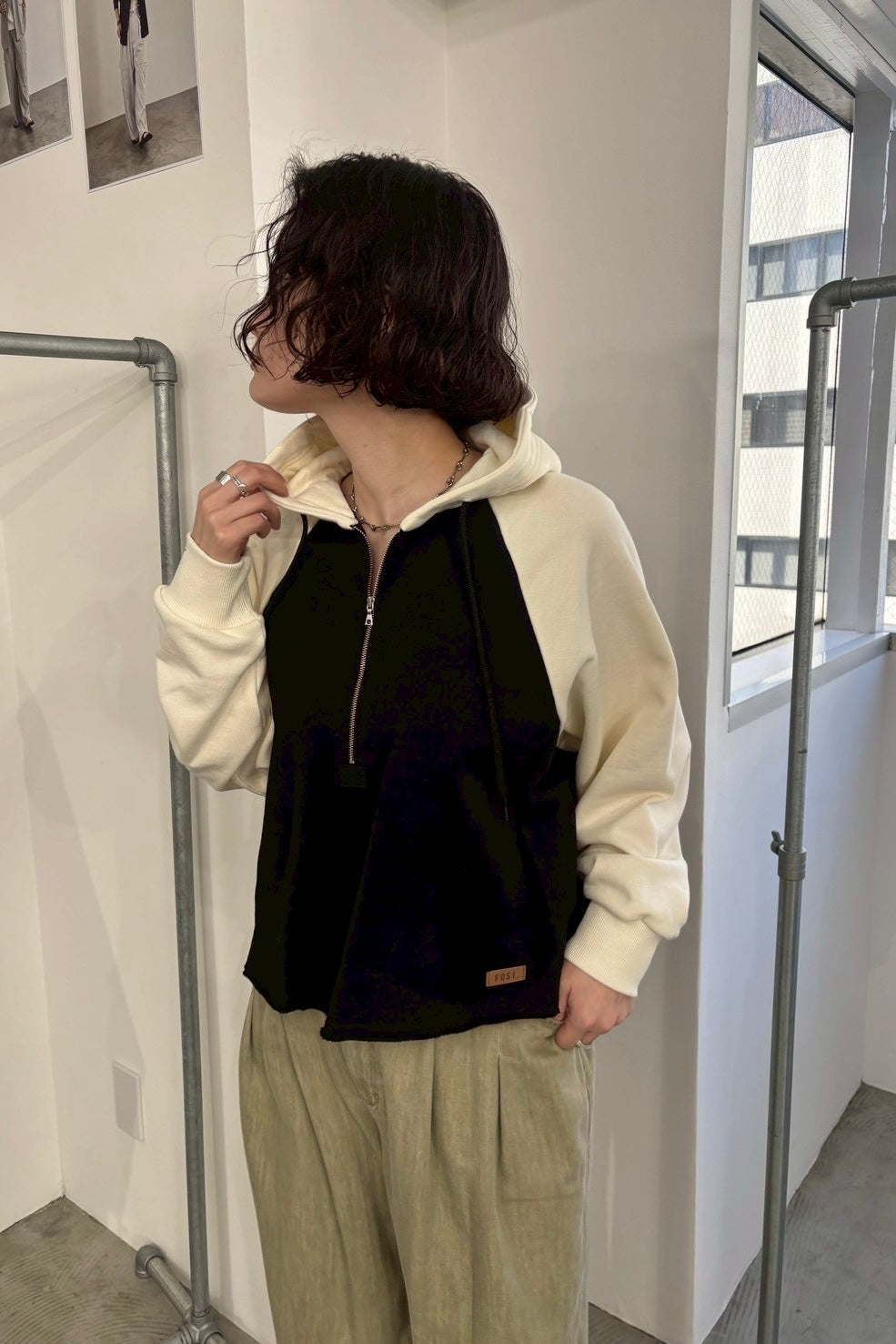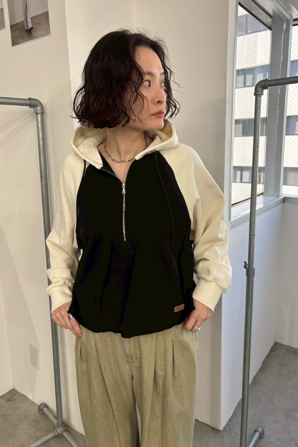 膨らみのあるベーシックな国産裏毛を使用したハーフジップフーディー。切りっぱなしの裾始末や、大胆なバイカラーの配色でカジュアルに仕上げました。ゆったりめのサイズ感ですが、短めの着丈なのでボリュームのあるボトムとの相性も◎