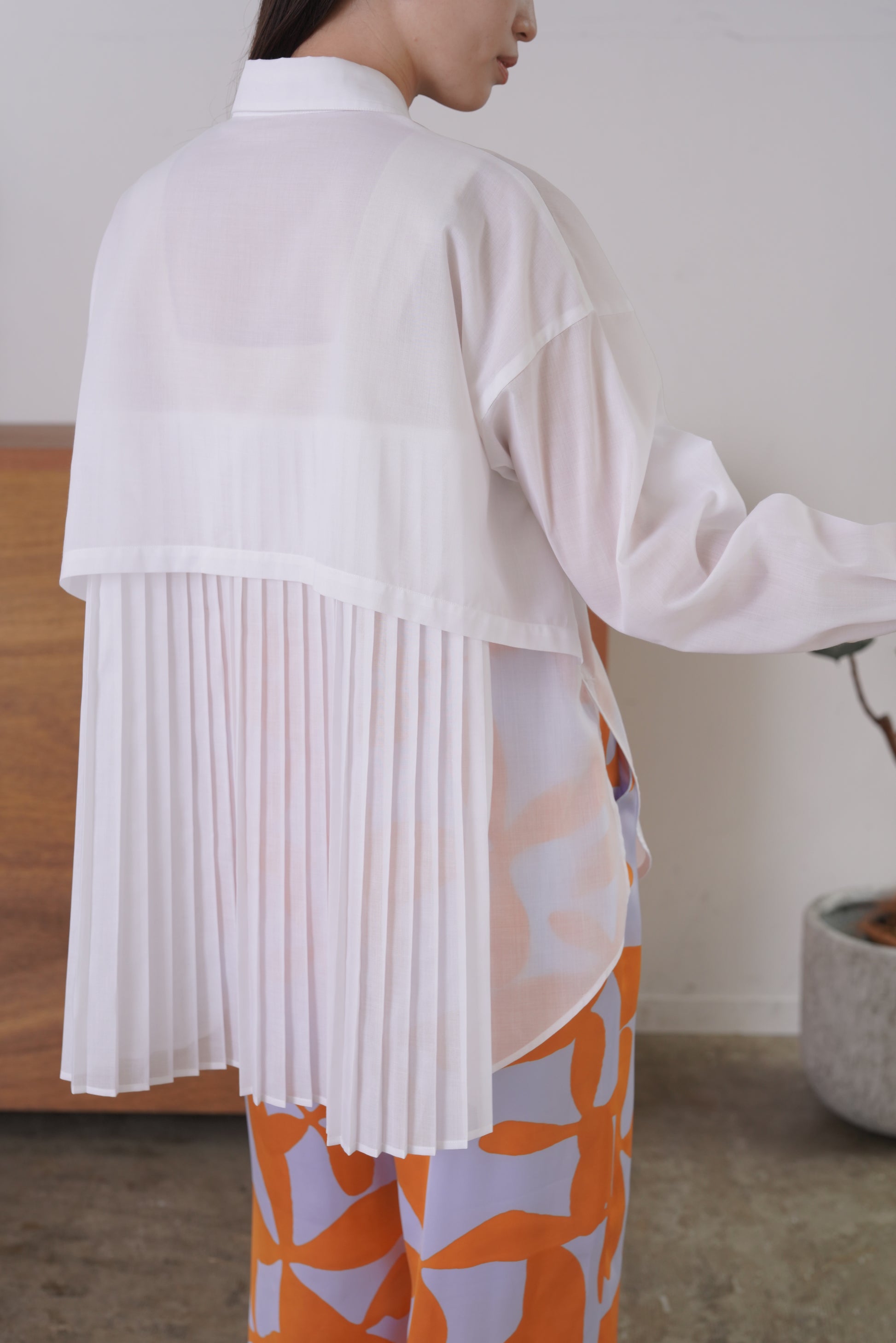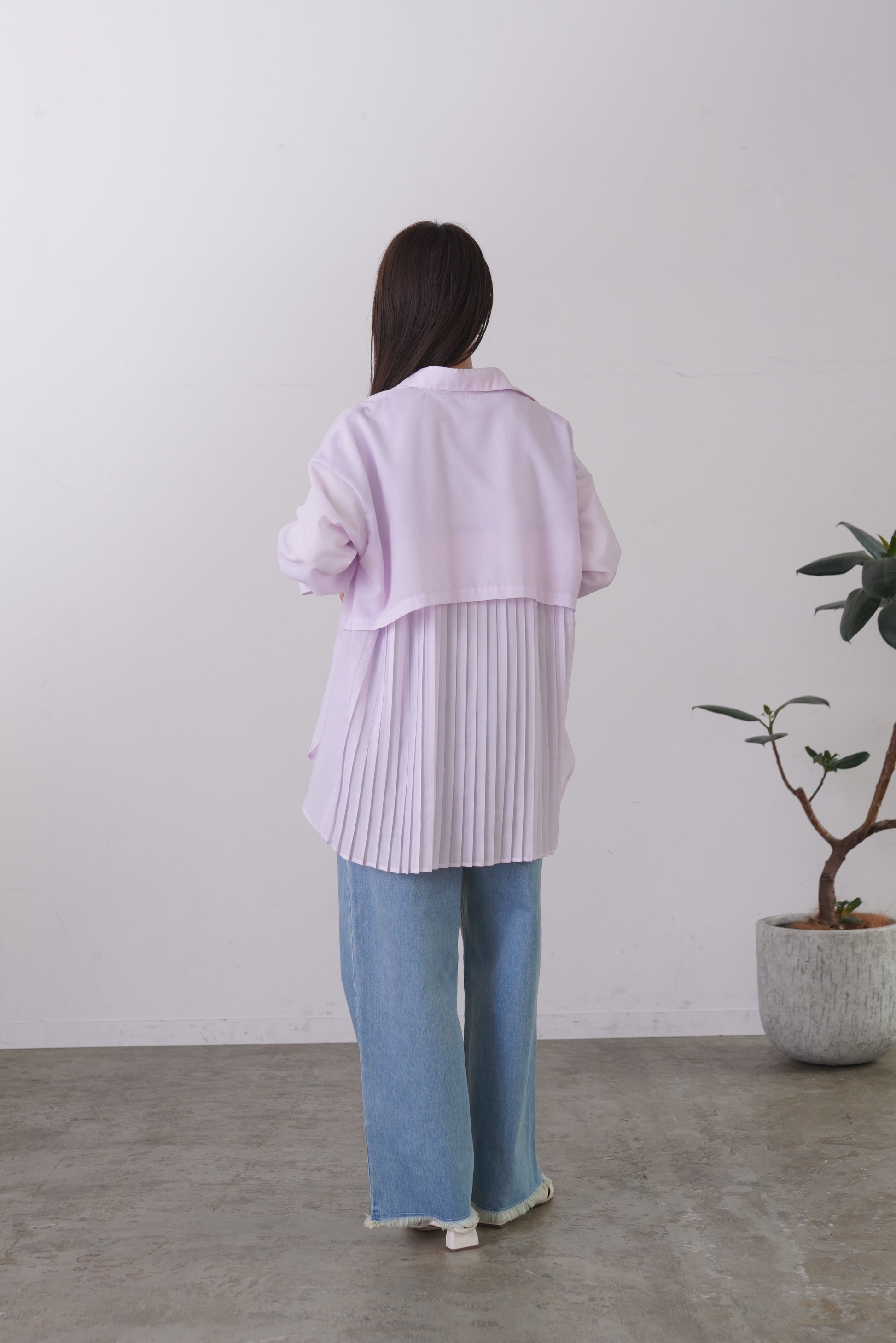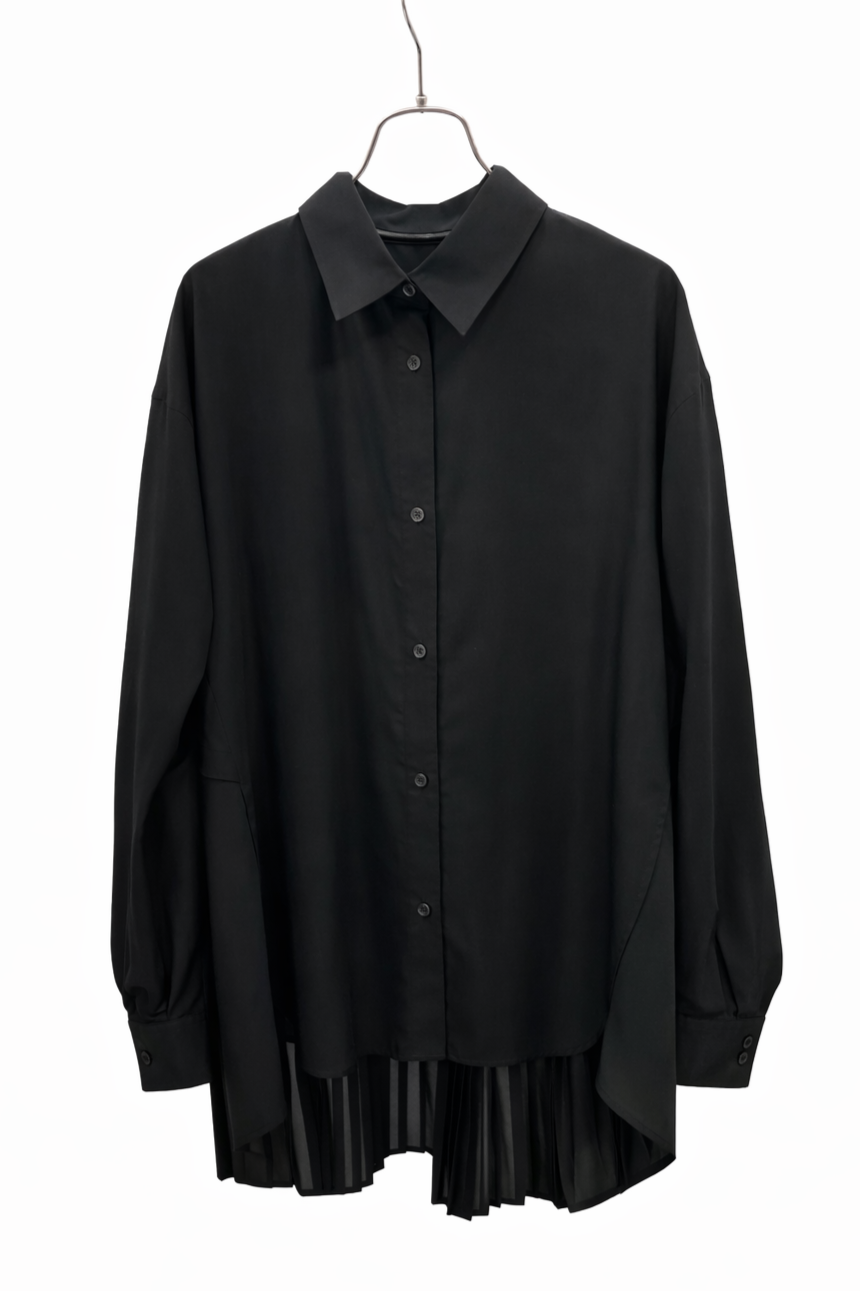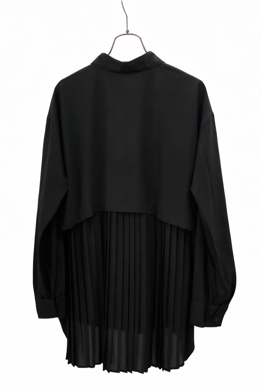ふらしになったヨークとプリーツの組み合わせが目を惹く、ややシアー感のあるロングレングスのシャツ。天然繊維の様な優しい風合いのポリエステル生地を使用。前身はベーシックなシャツディテールで後ろ着丈が長め。アウターとのレイヤードも楽しいアイテムです。
