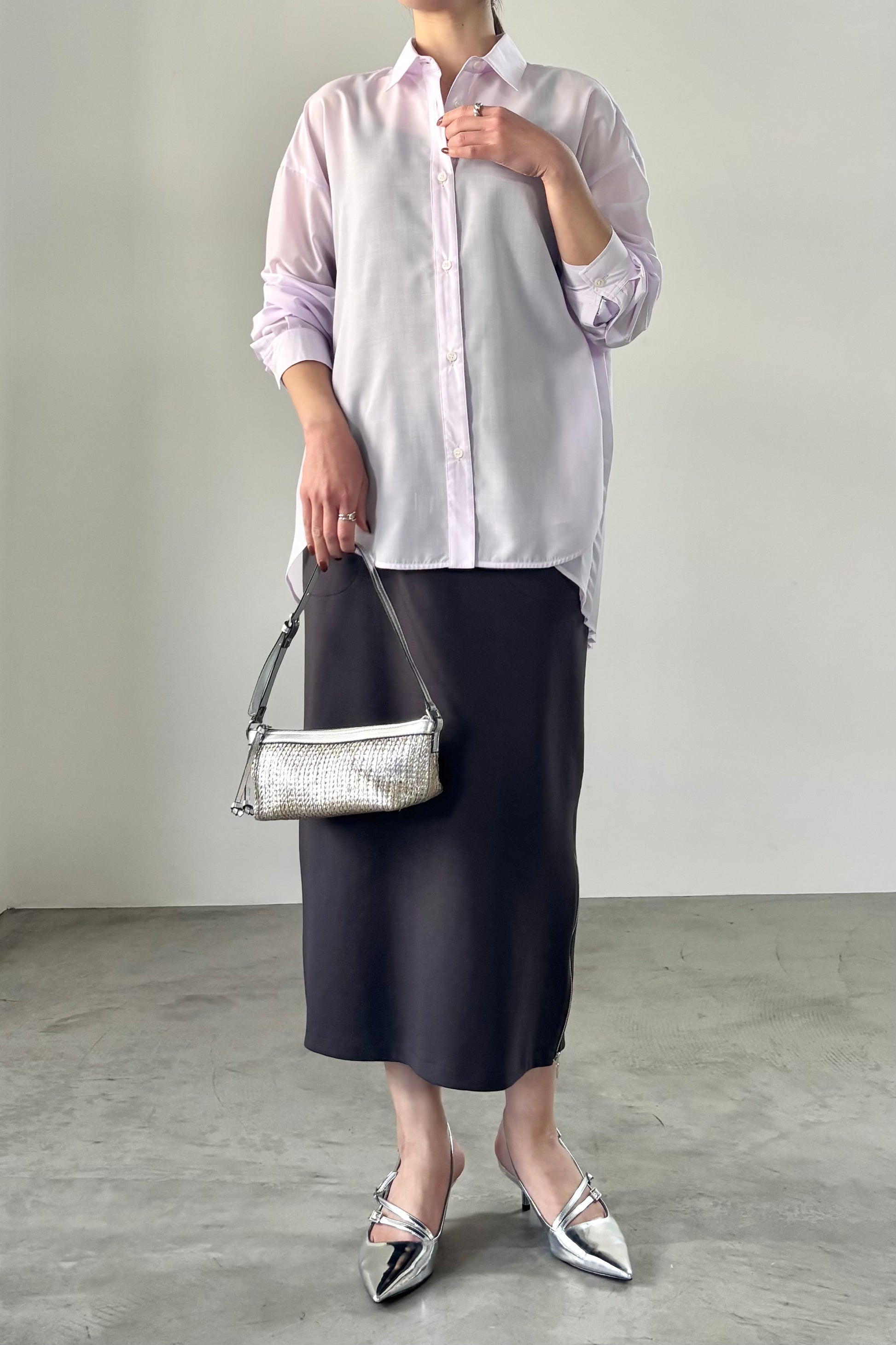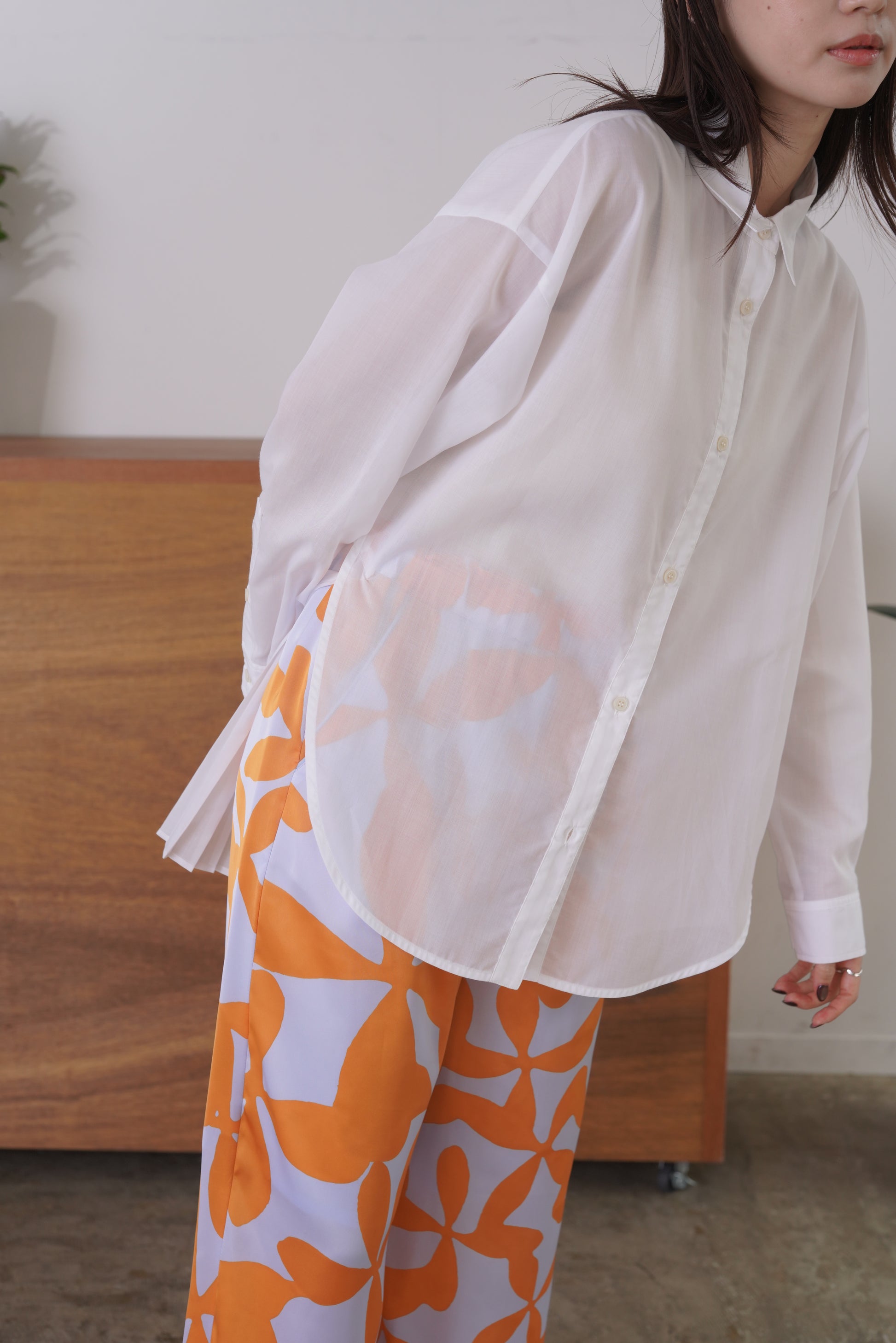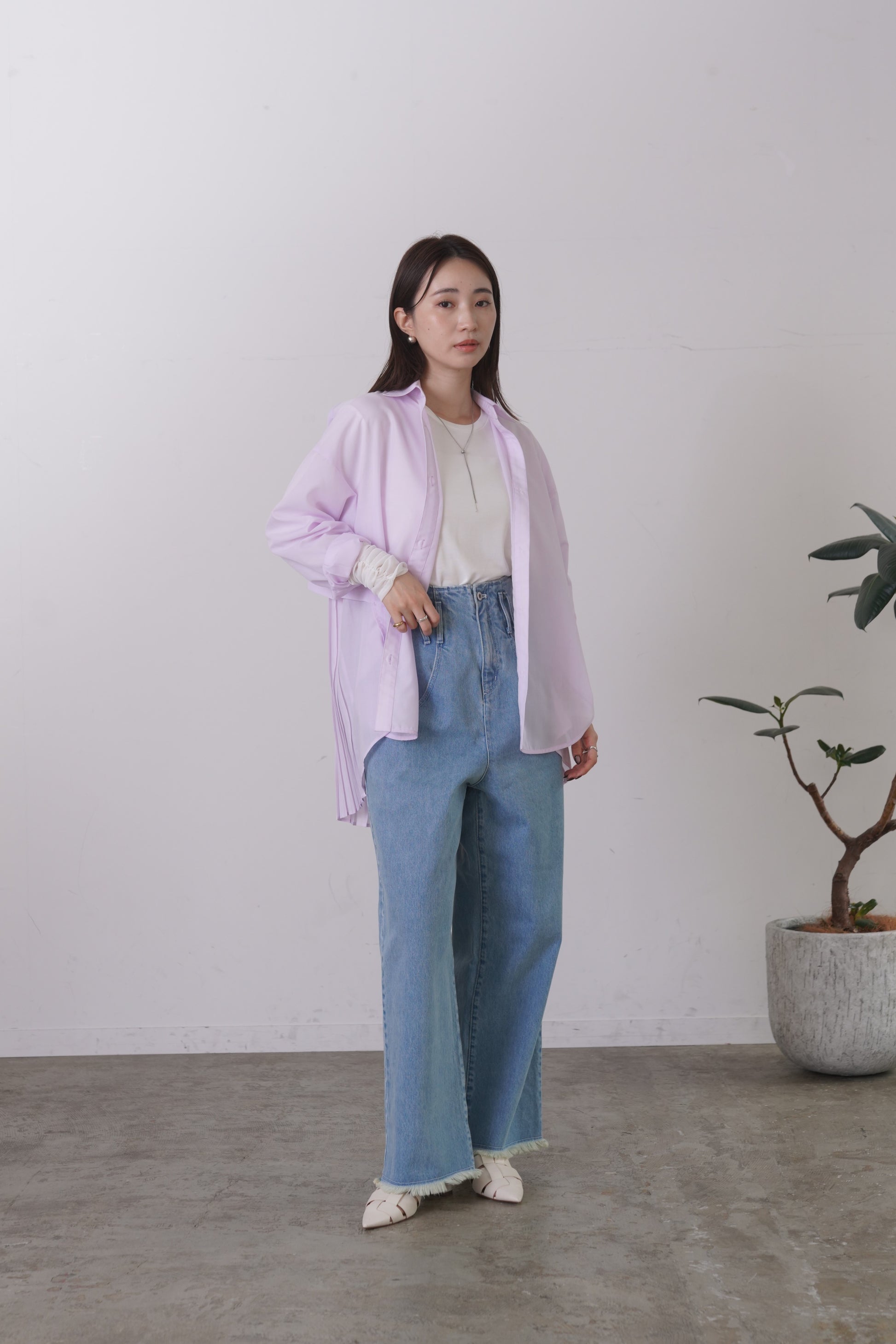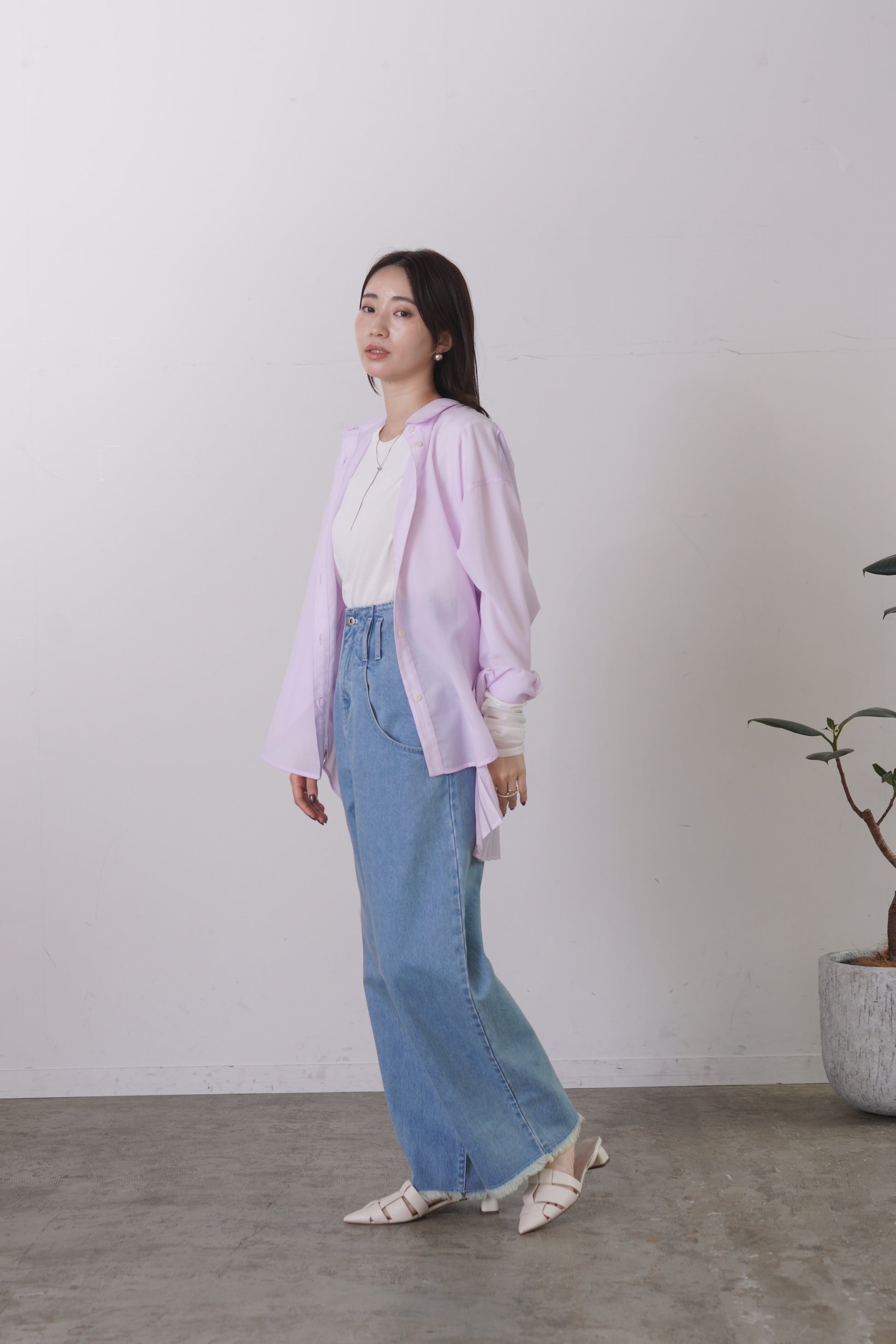ふらしになったヨークとプリーツの組み合わせが目を惹く、ややシアー感のあるロングレングスのシャツ。天然繊維の様な優しい風合いのポリエステル生地を使用。前身はベーシックなシャツディテールで後ろ着丈が長め。アウターとのレイヤードも楽しいアイテムです。