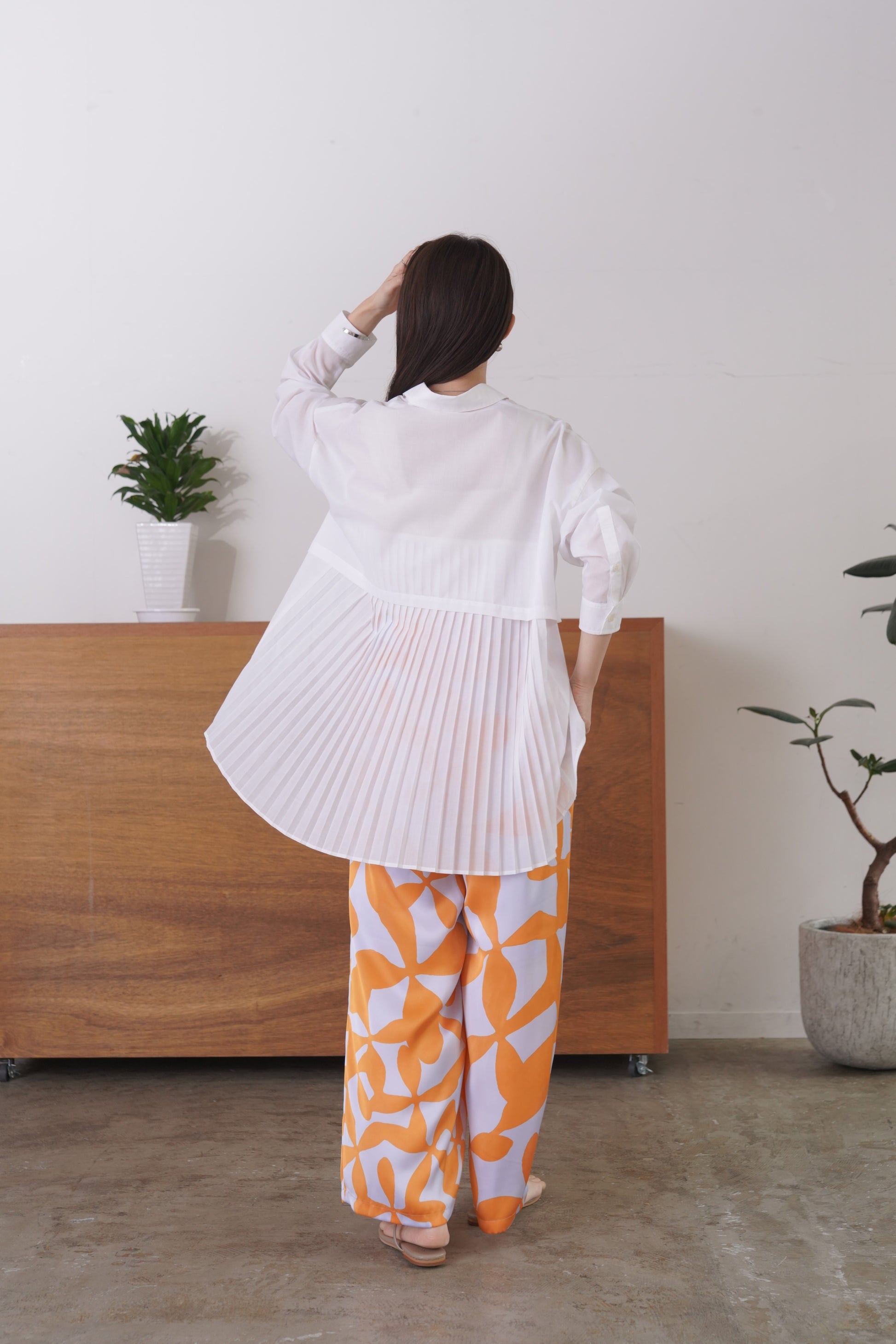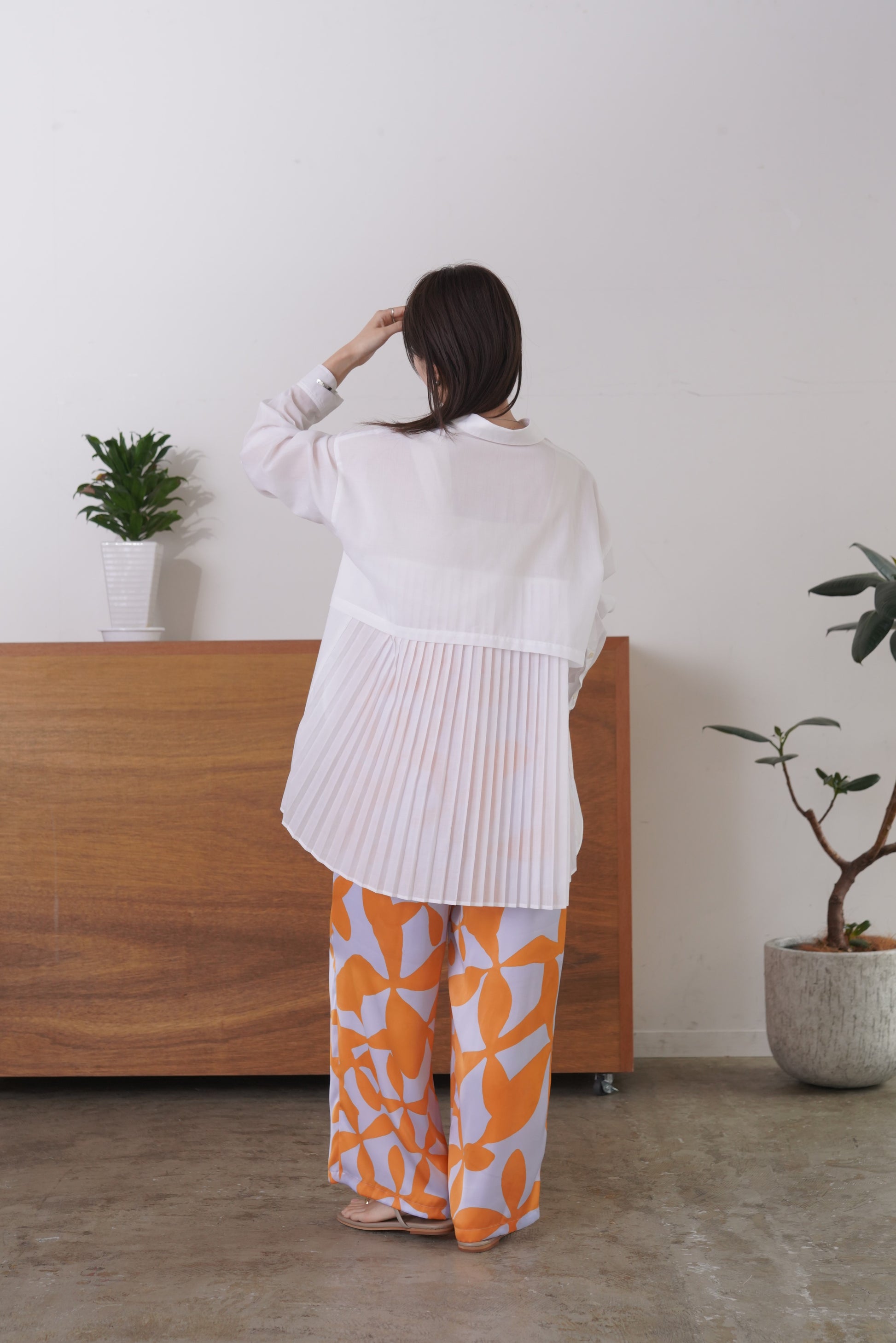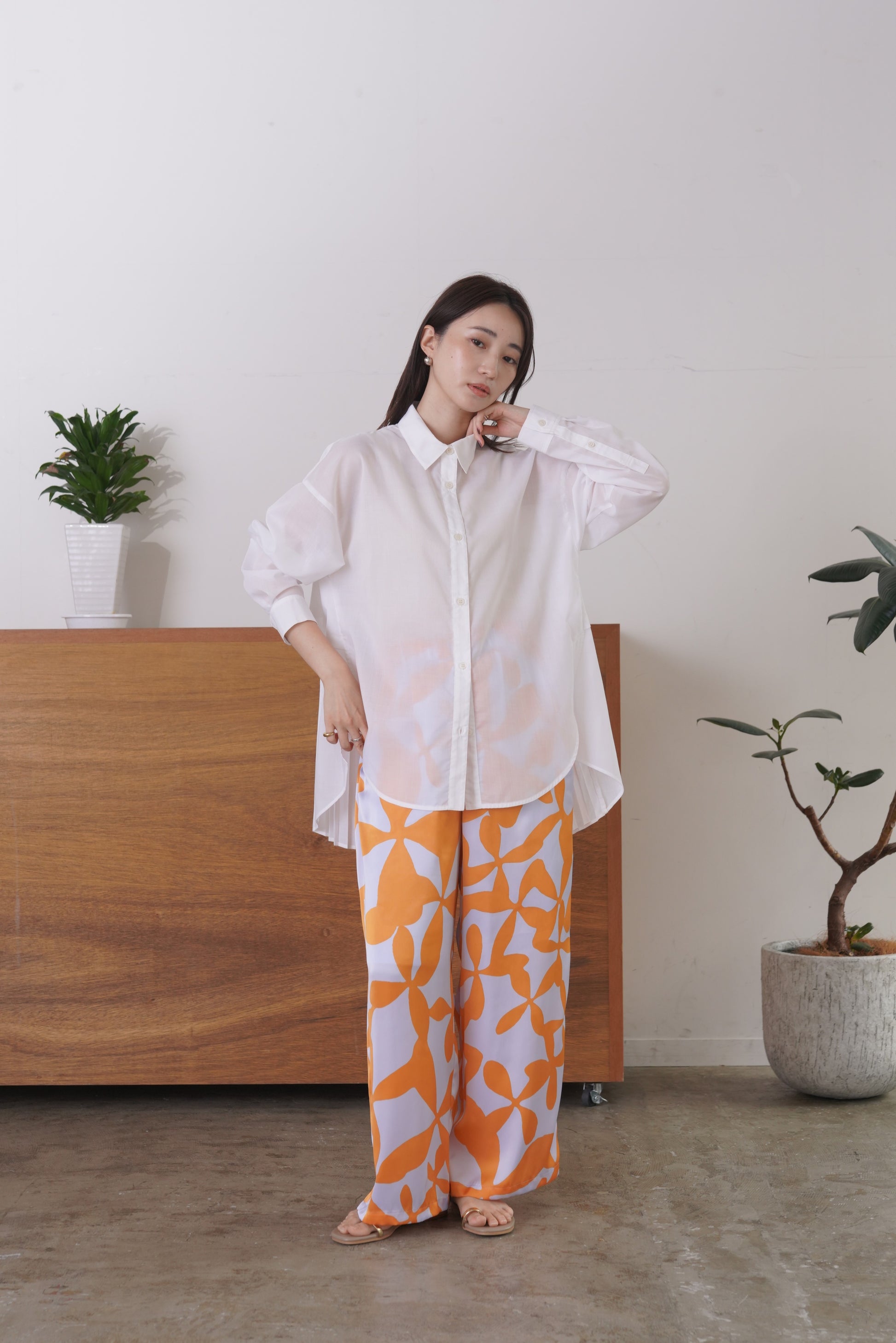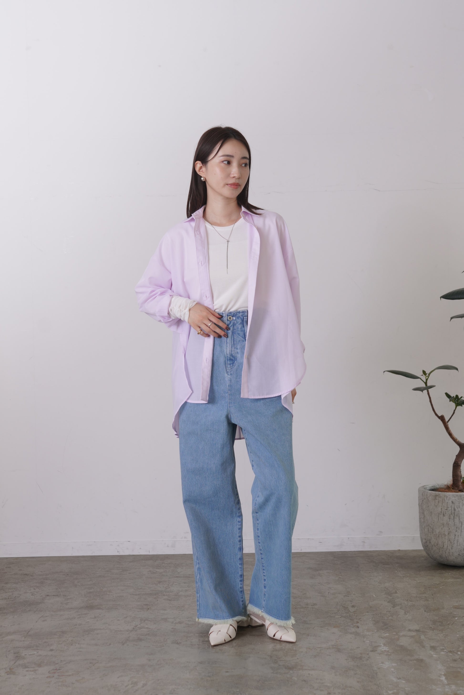 ふらしになったヨークとプリーツの組み合わせが目を惹く、ややシアー感のあるロングレングスのシャツ。天然繊維の様な優しい風合いのポリエステル生地を使用。前身はベーシックなシャツディテールで後ろ着丈が長め。アウターとのレイヤードも楽しいアイテムです。