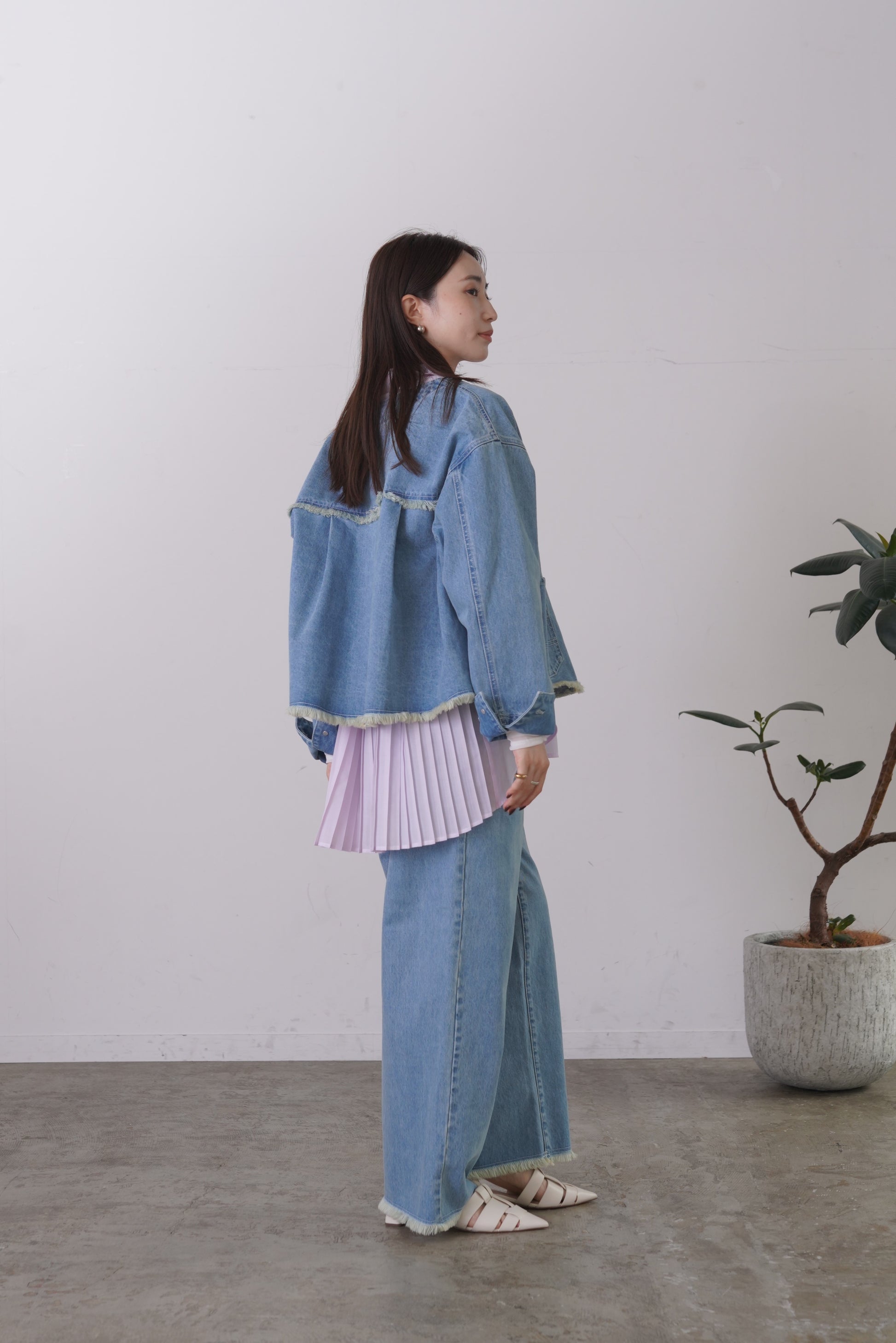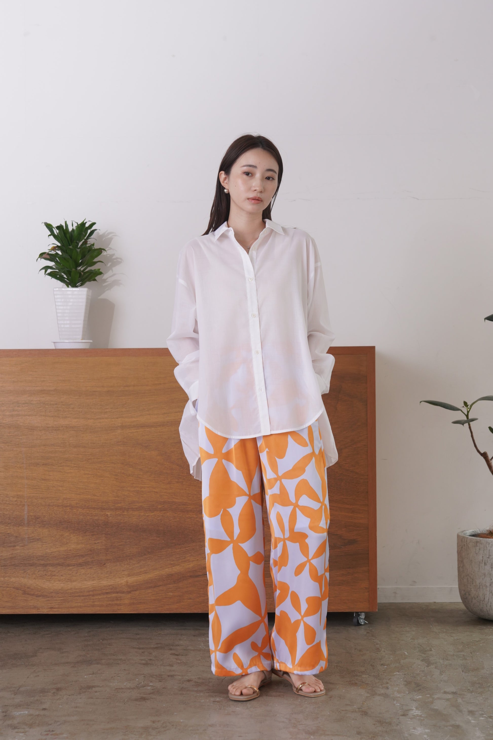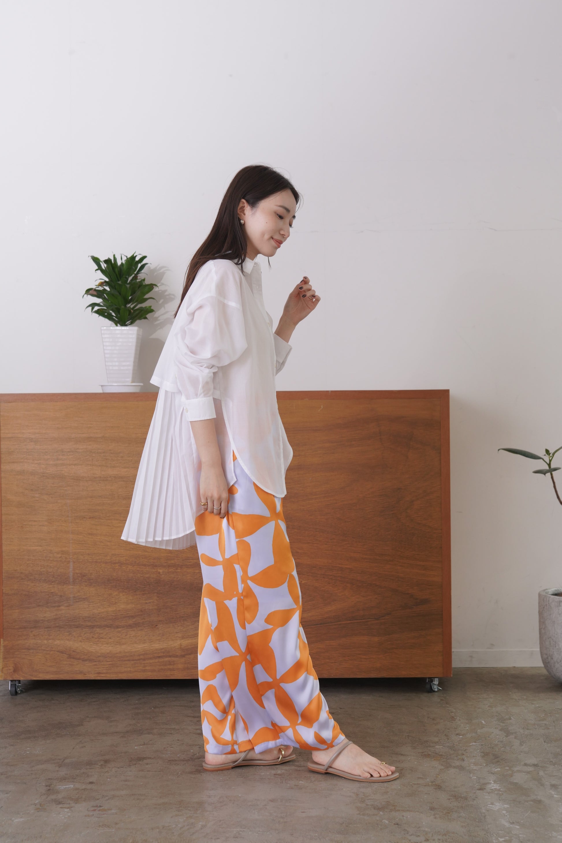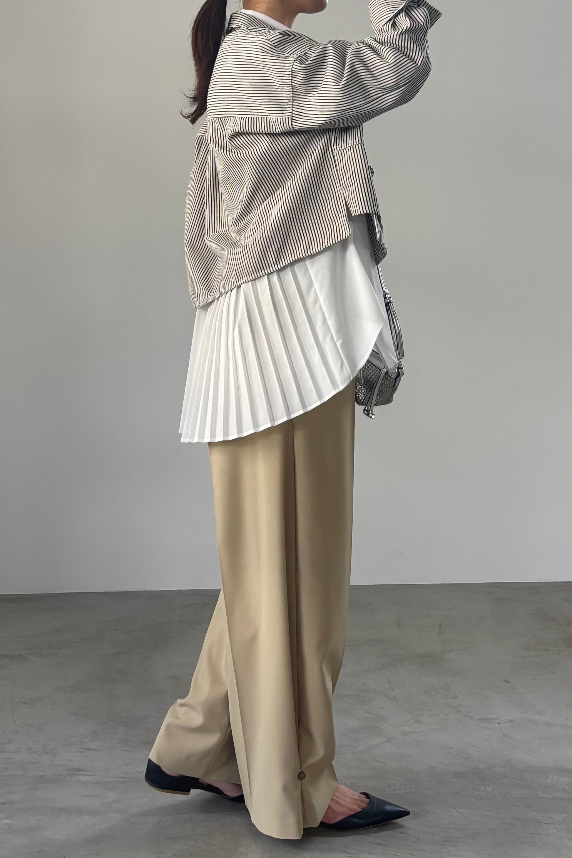 ふらしになったヨークとプリーツの組み合わせが目を惹く、ややシアー感のあるロングレングスのシャツ。天然繊維の様な優しい風合いのポリエステル生地を使用。前身はベーシックなシャツディテールで後ろ着丈が長め。アウターとのレイヤードも楽しいアイテムです。