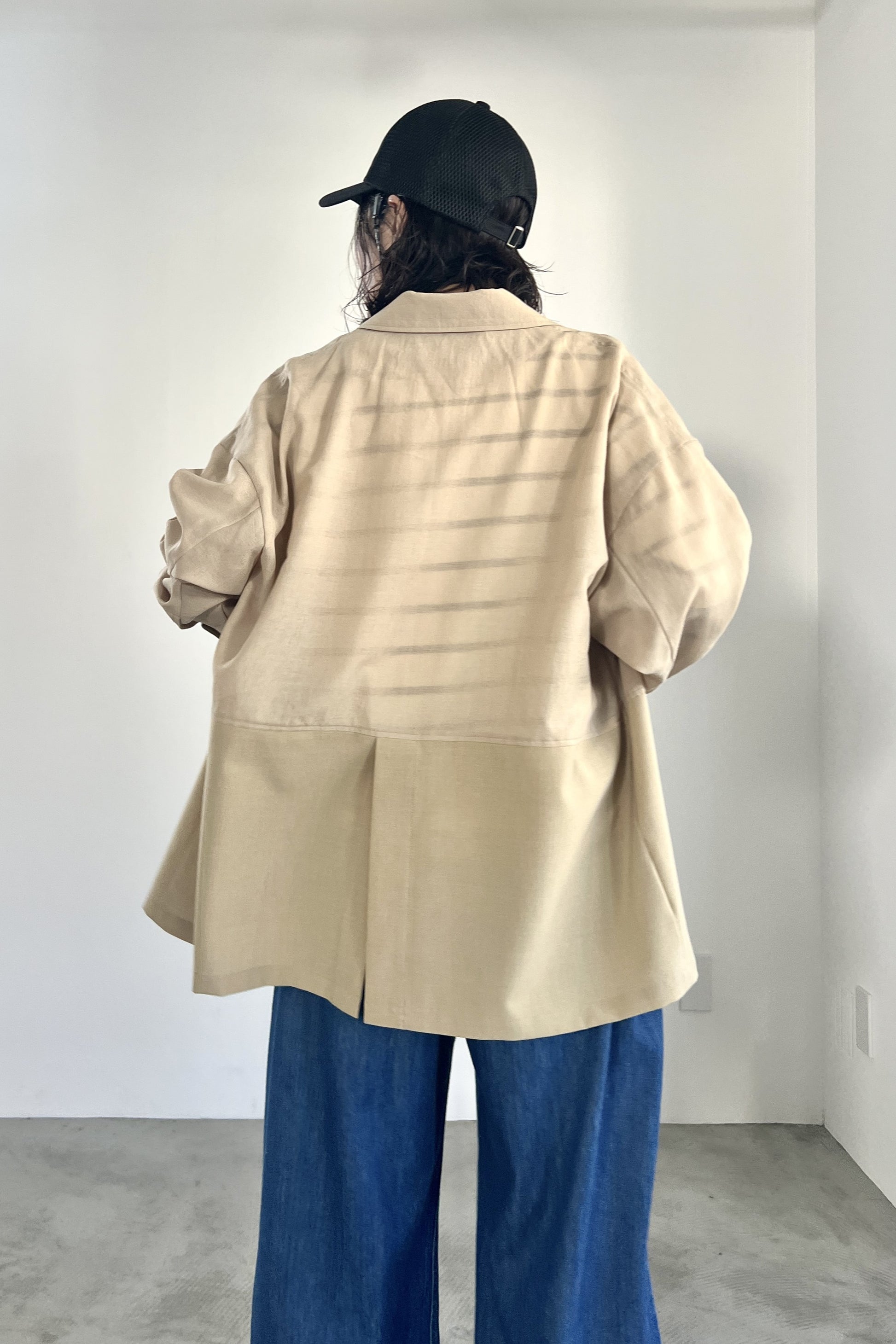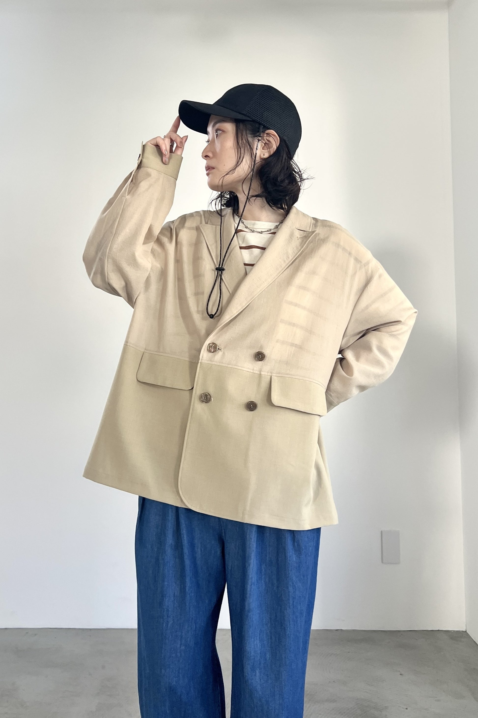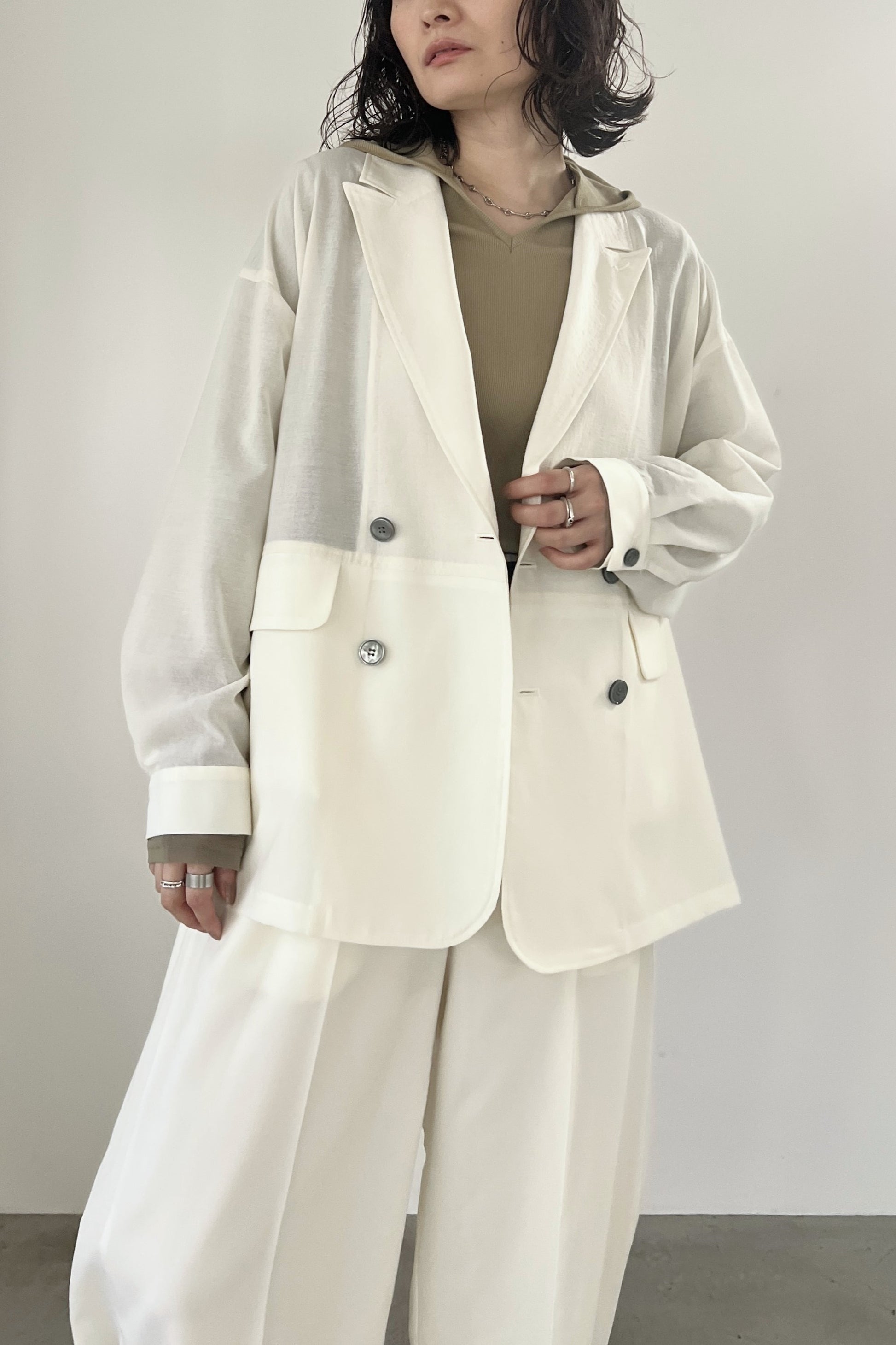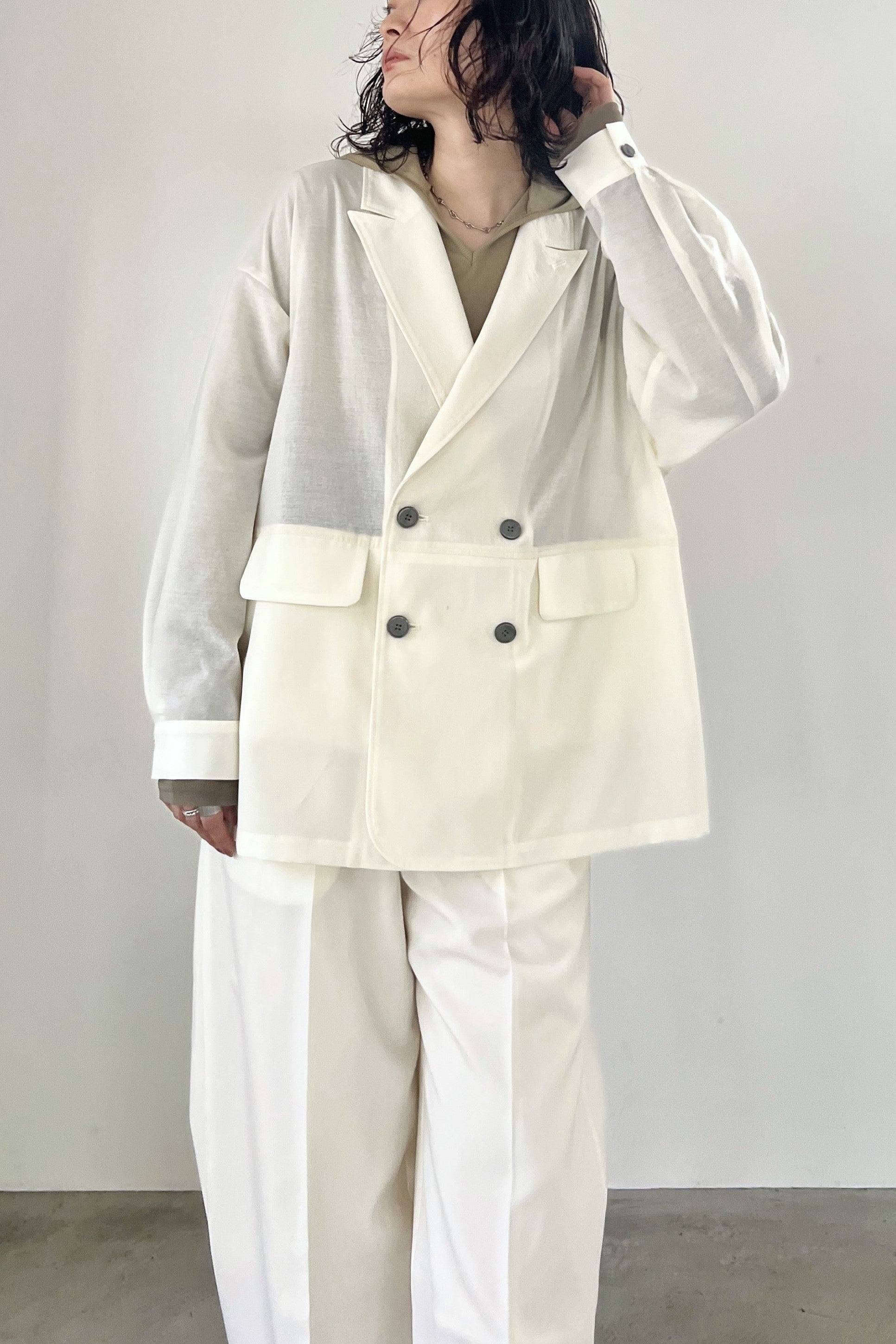 COMMENT▼ 程良い透け感のシアー素材と、サマーウールのようなトロ素材を同色で組み合わせたピークドラペルジャケット。きちんと感は残しつつ、シアー素材の清涼感とゆったりシルエットでラフに羽織れる一枚です。同素材のスラックスパンツとのセットアップもおすすめです。