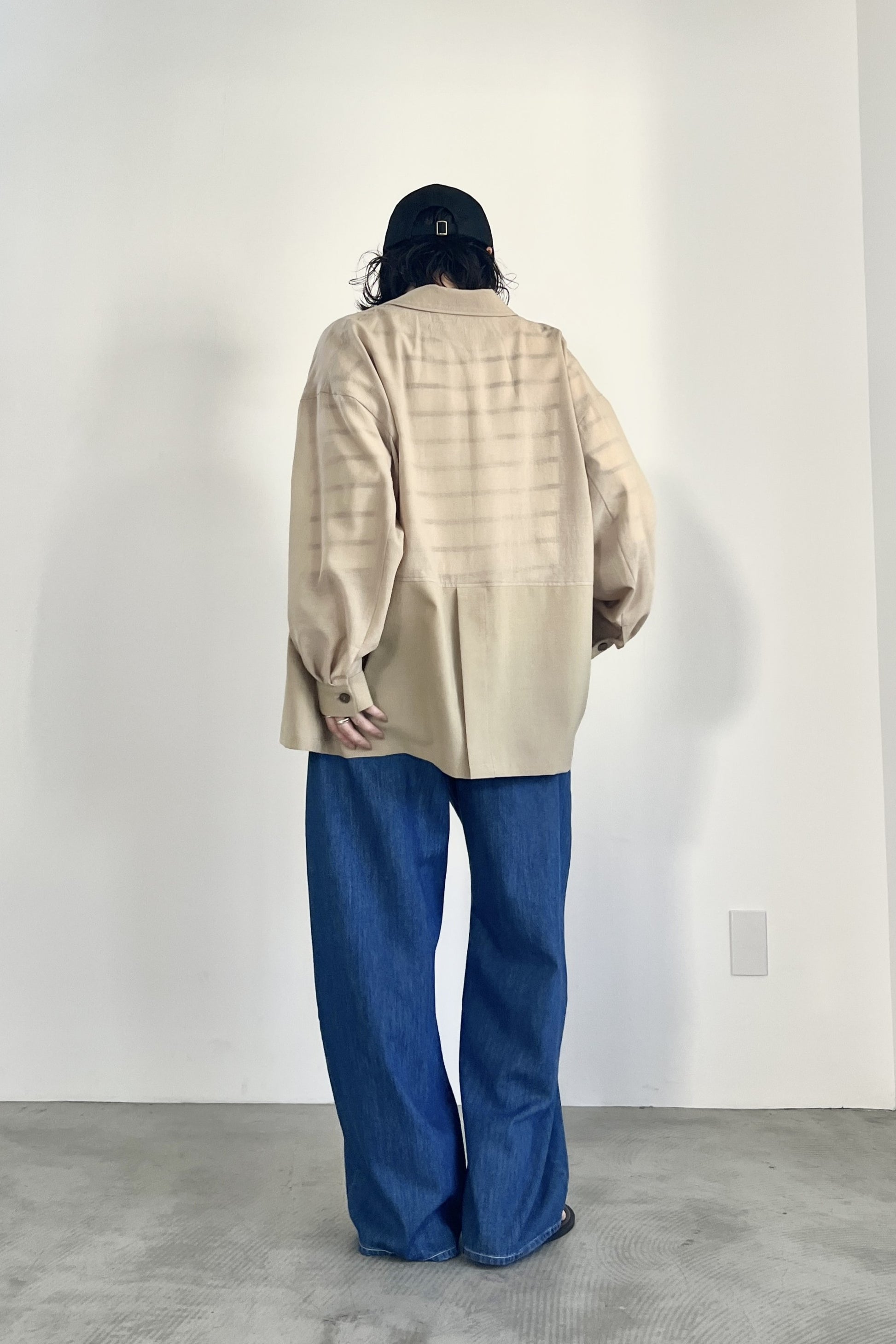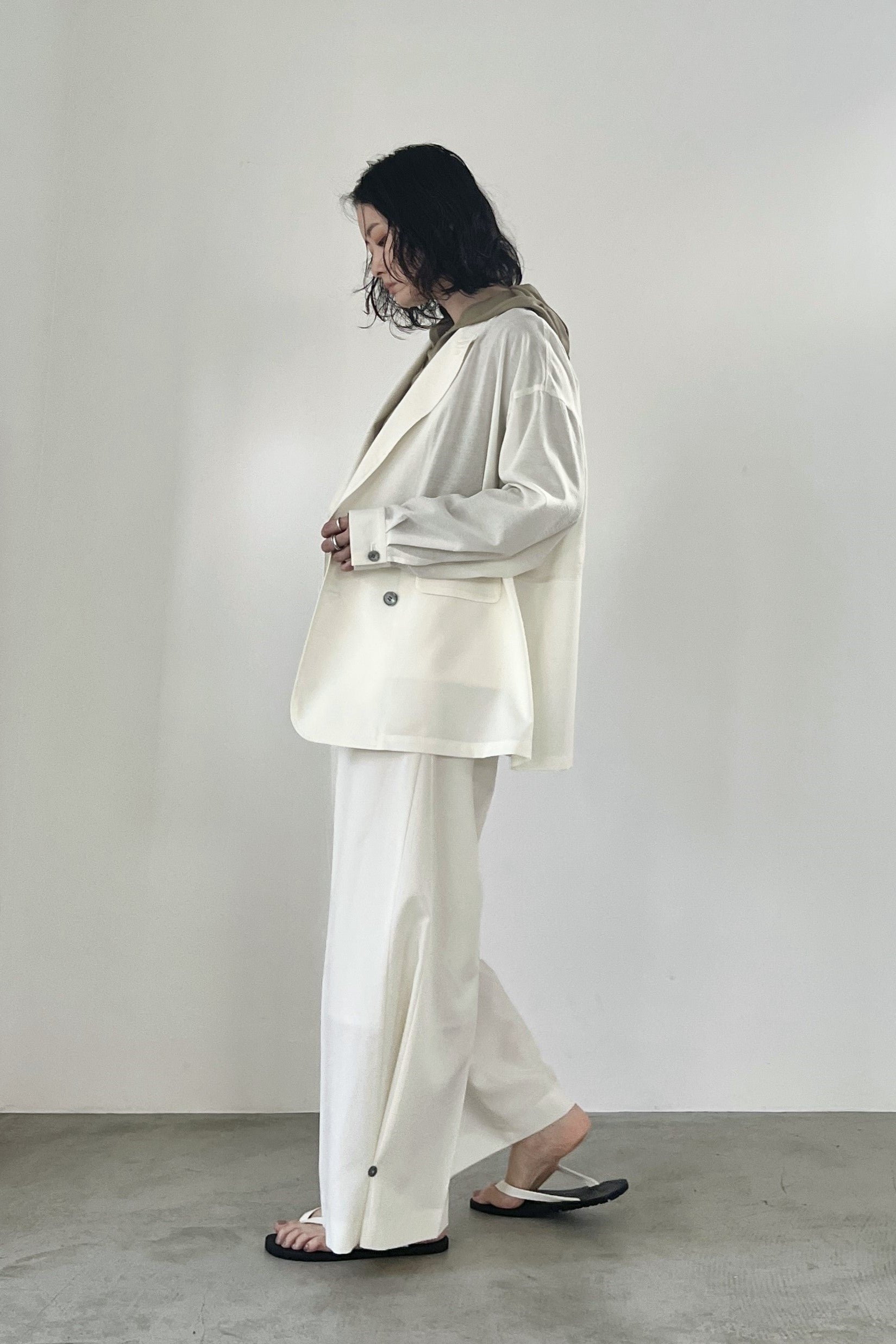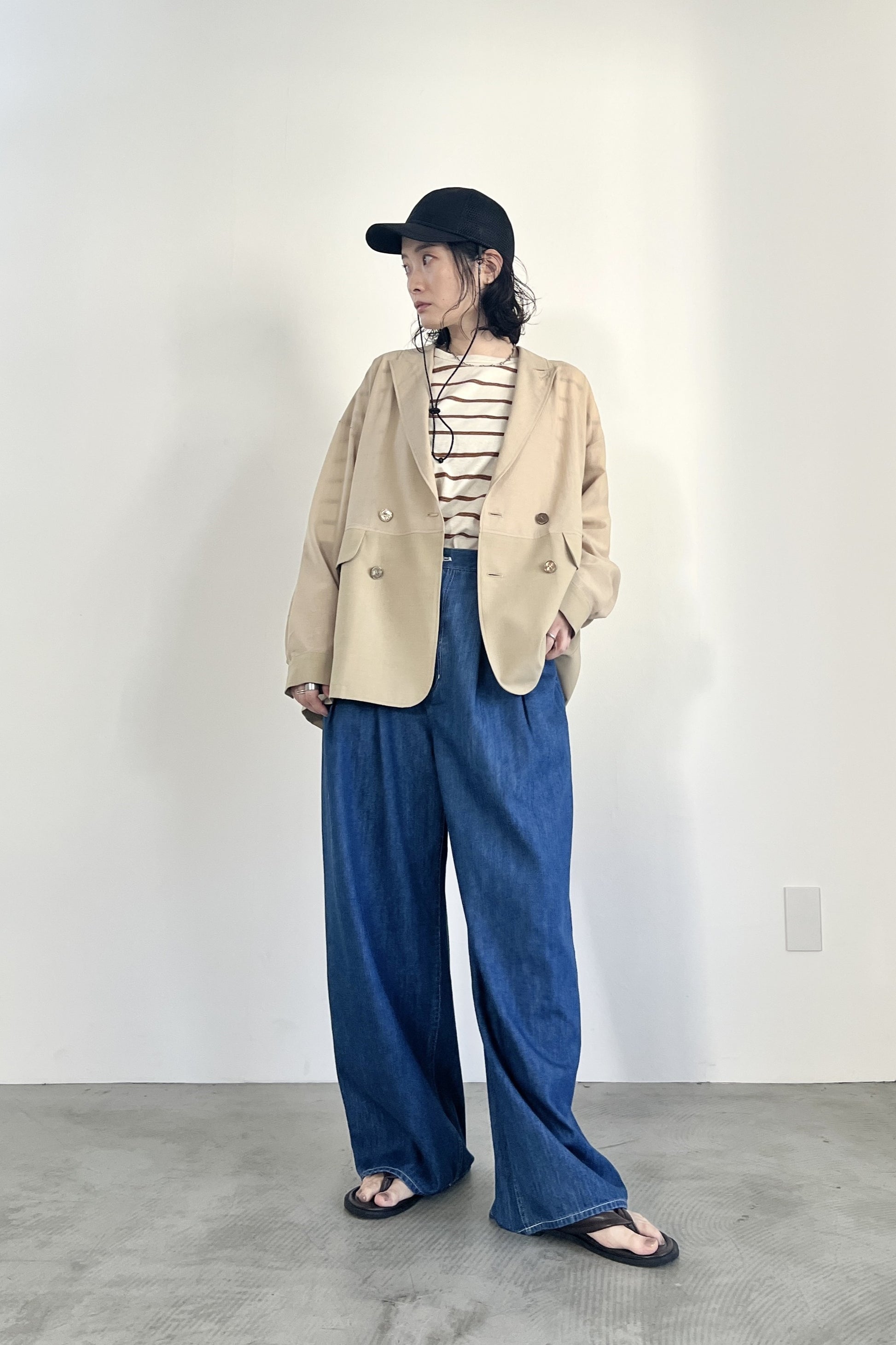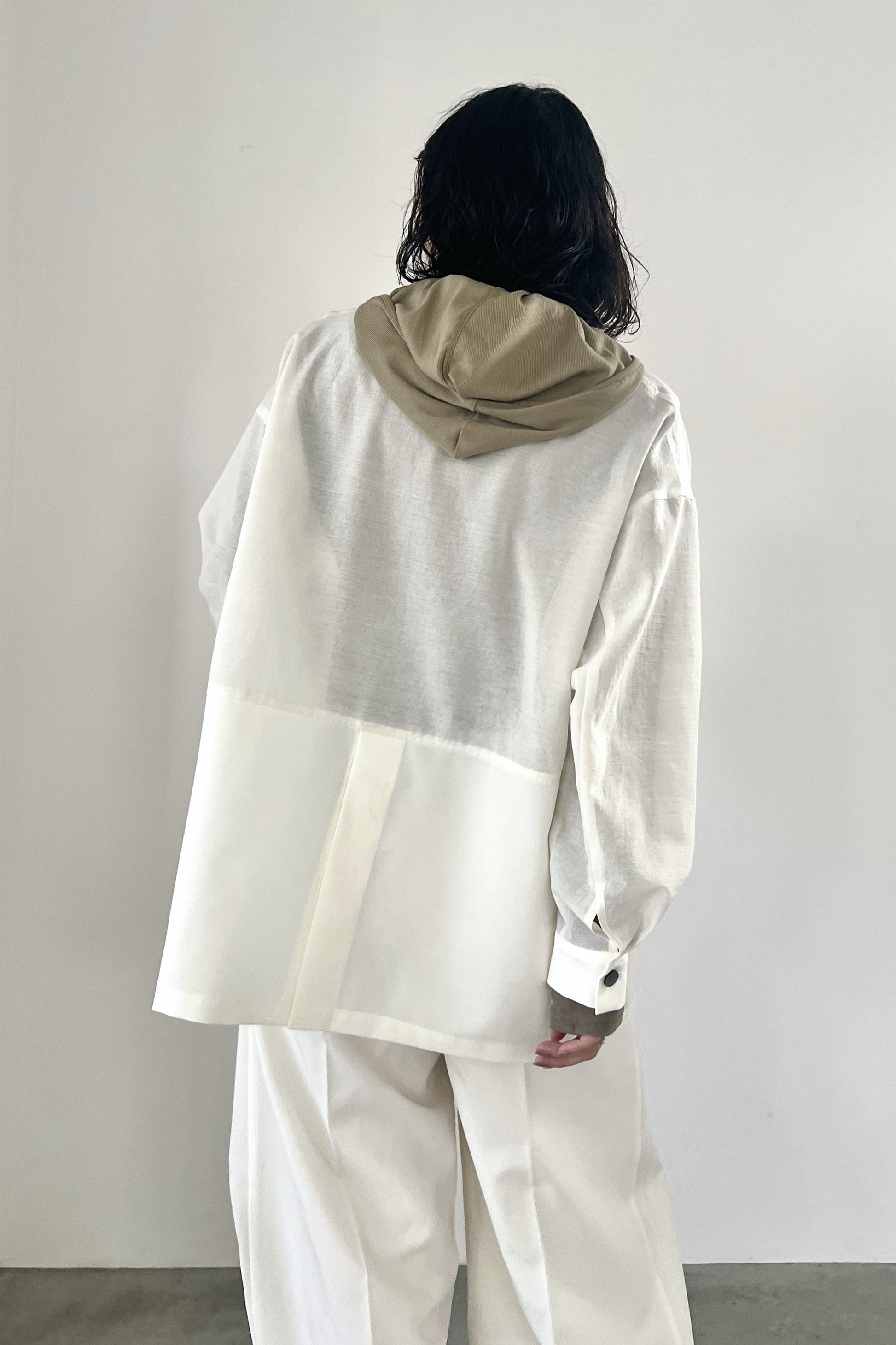 COMMENT▼ 程良い透け感のシアー素材と、サマーウールのようなトロ素材を同色で組み合わせたピークドラペルジャケット。きちんと感は残しつつ、シアー素材の清涼感とゆったりシルエットでラフに羽織れる一枚です。同素材のスラックスパンツとのセットアップもおすすめです。