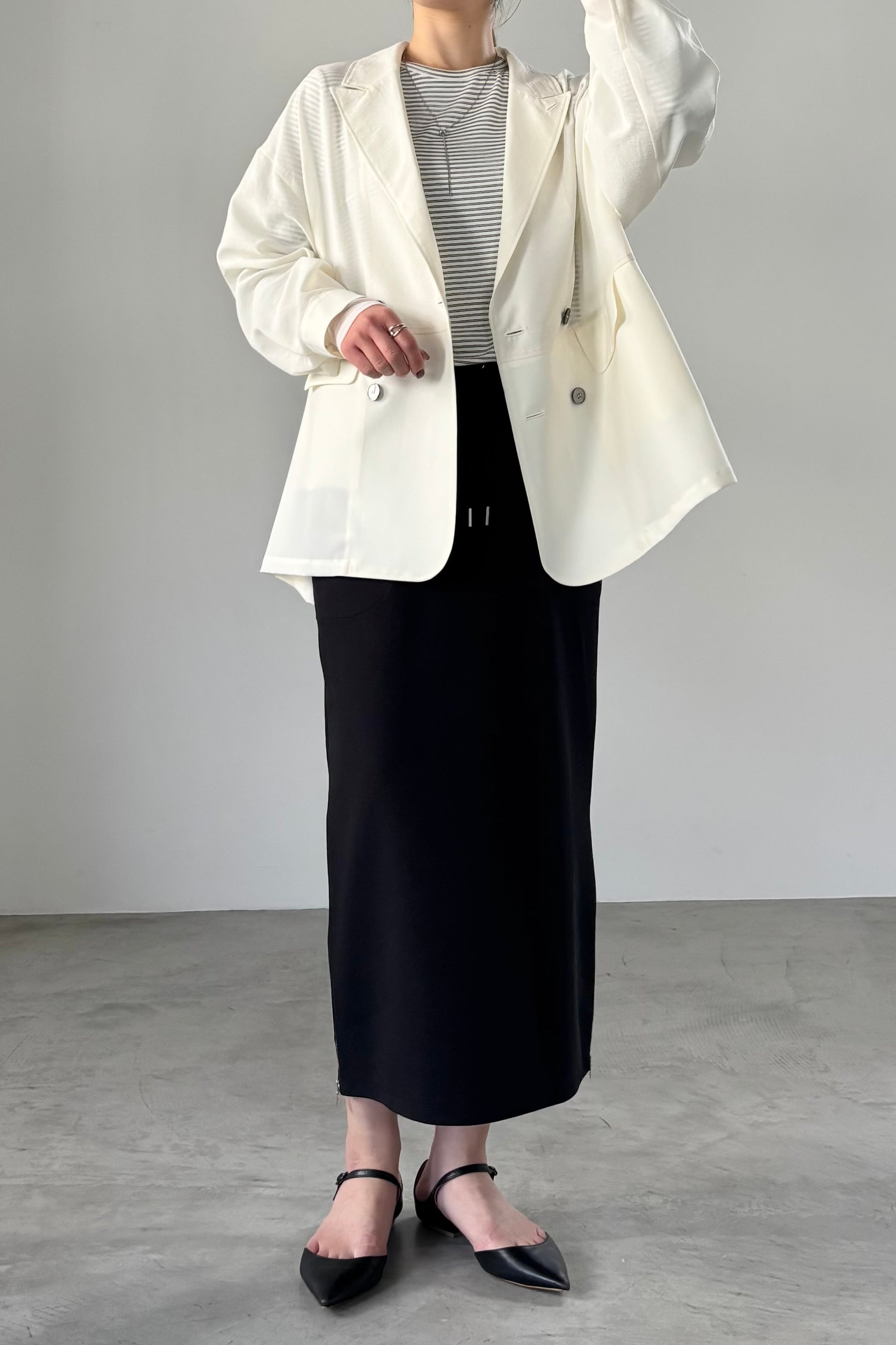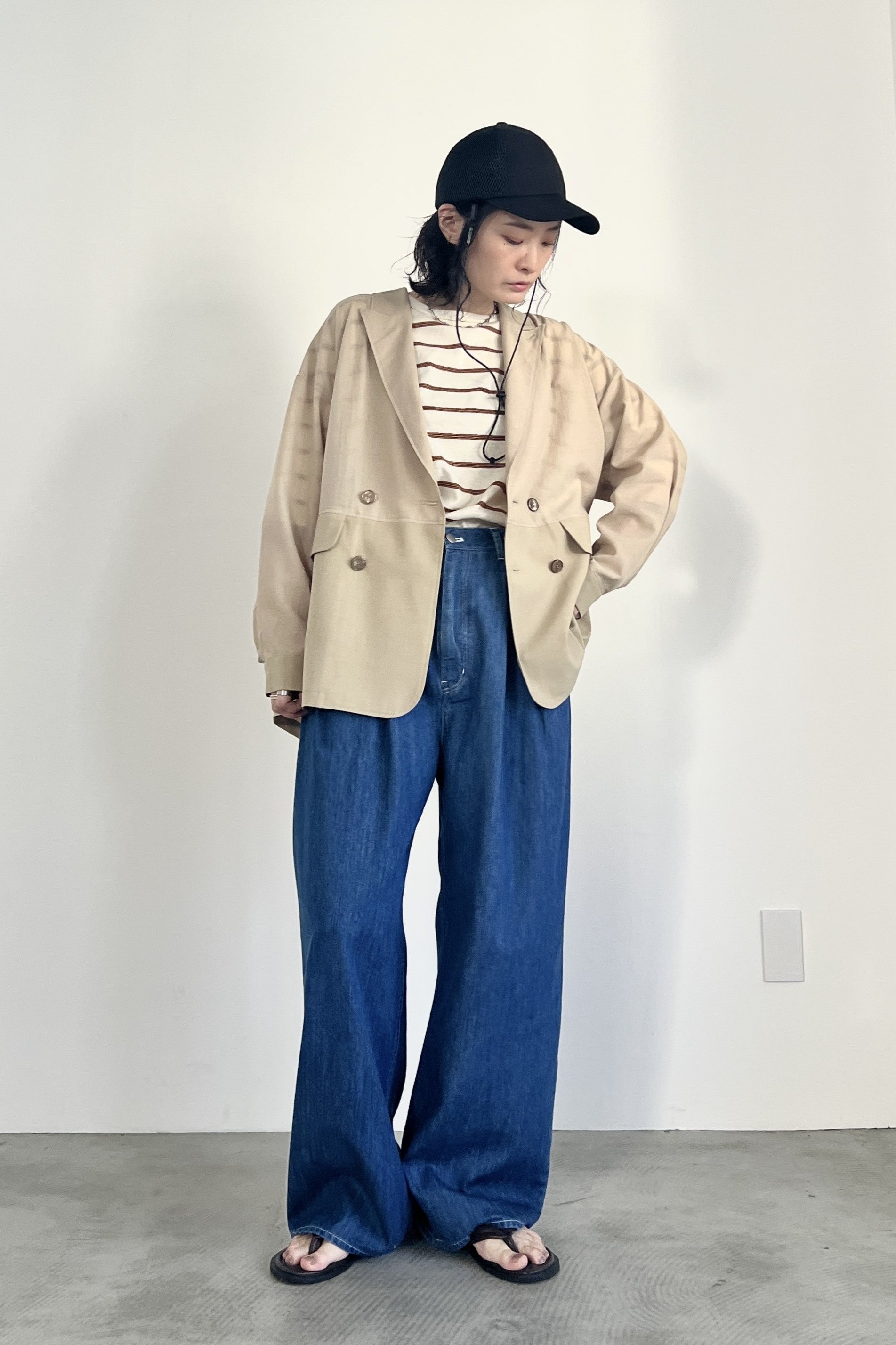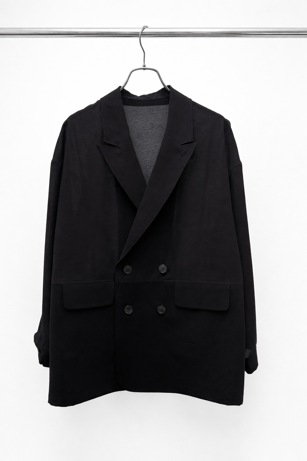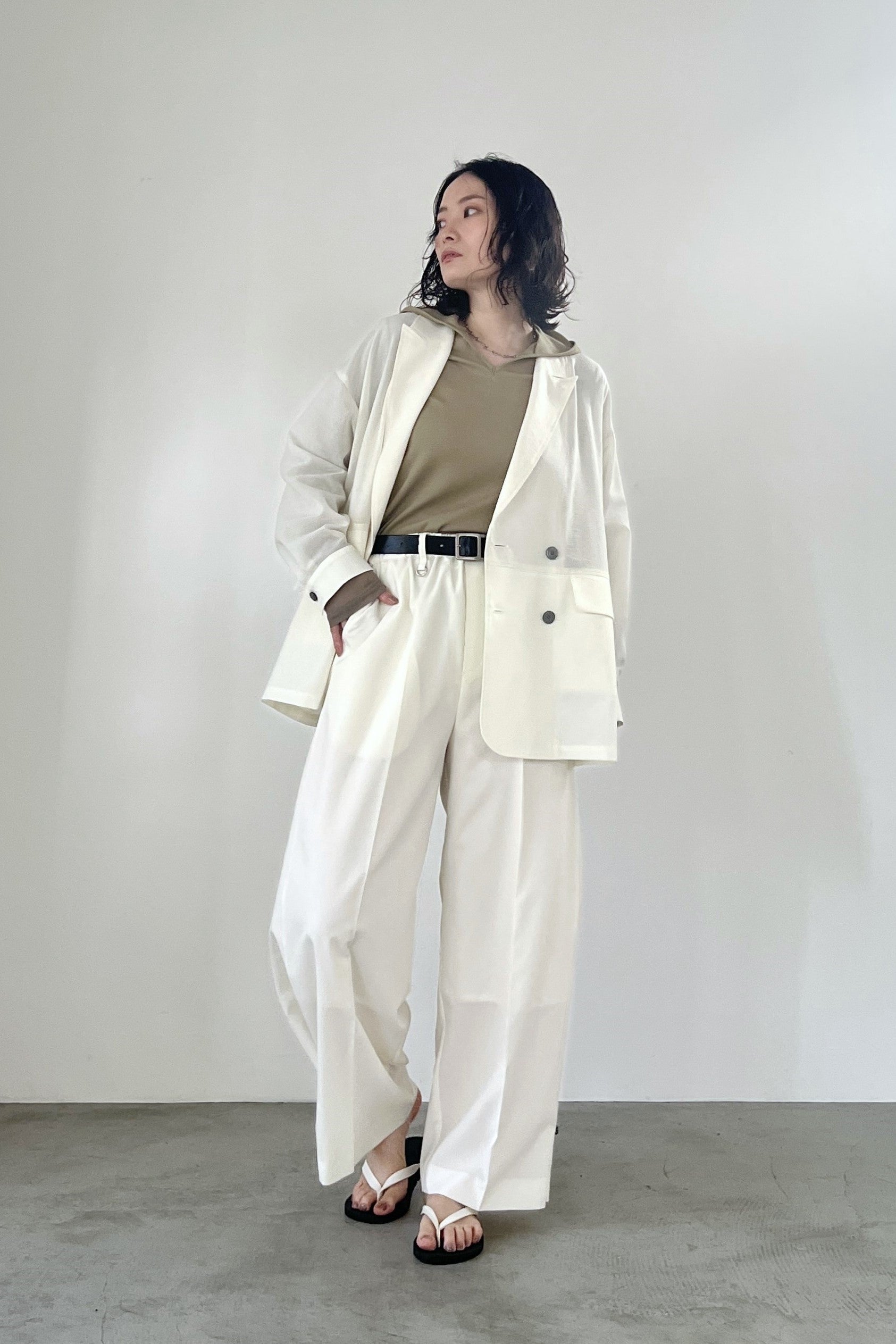 COMMENT▼ 程良い透け感のシアー素材と、サマーウールのようなトロ素材を同色で組み合わせたピークドラペルジャケット。きちんと感は残しつつ、シアー素材の清涼感とゆったりシルエットでラフに羽織れる一枚です。同素材のスラックスパンツとのセットアップもおすすめです。