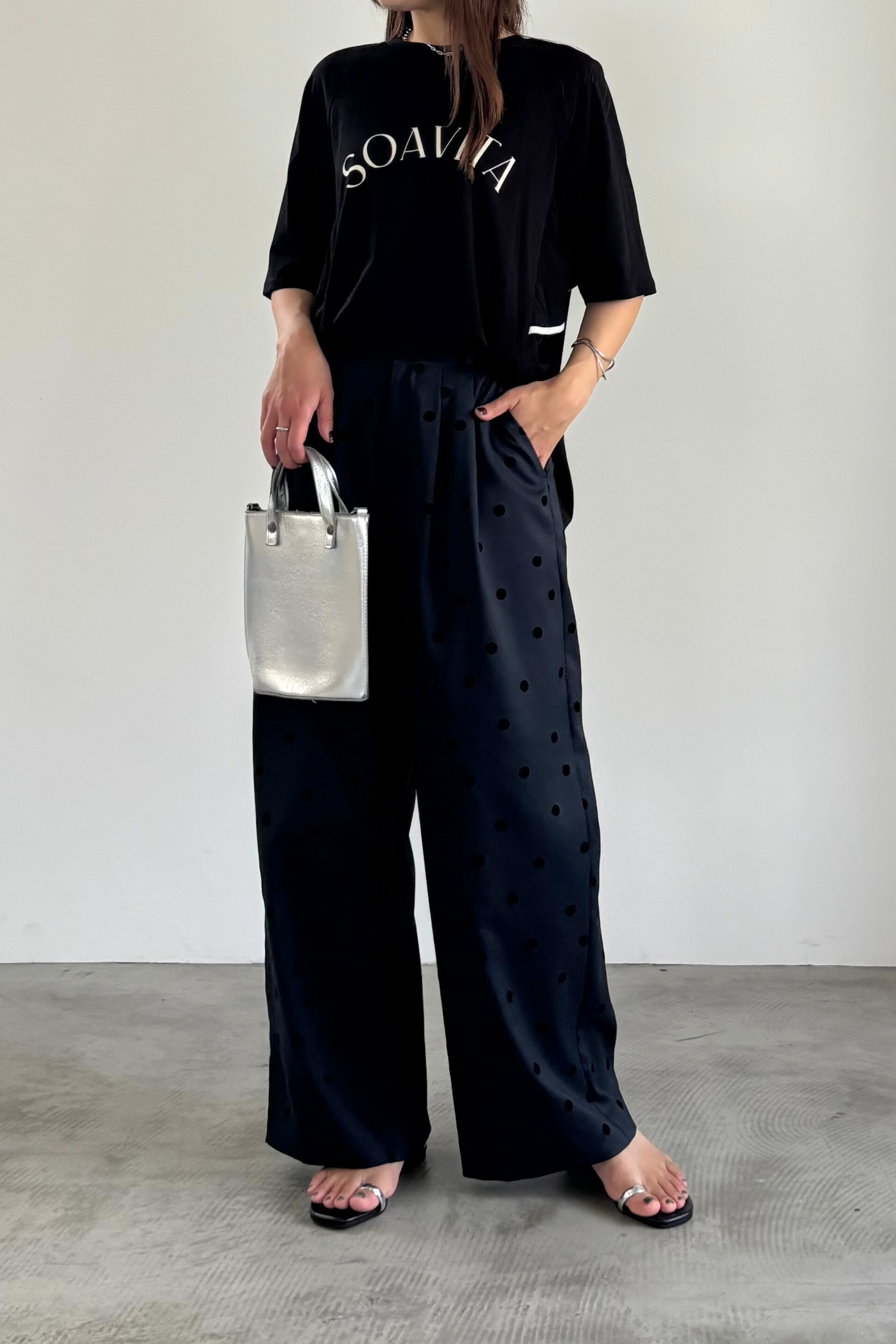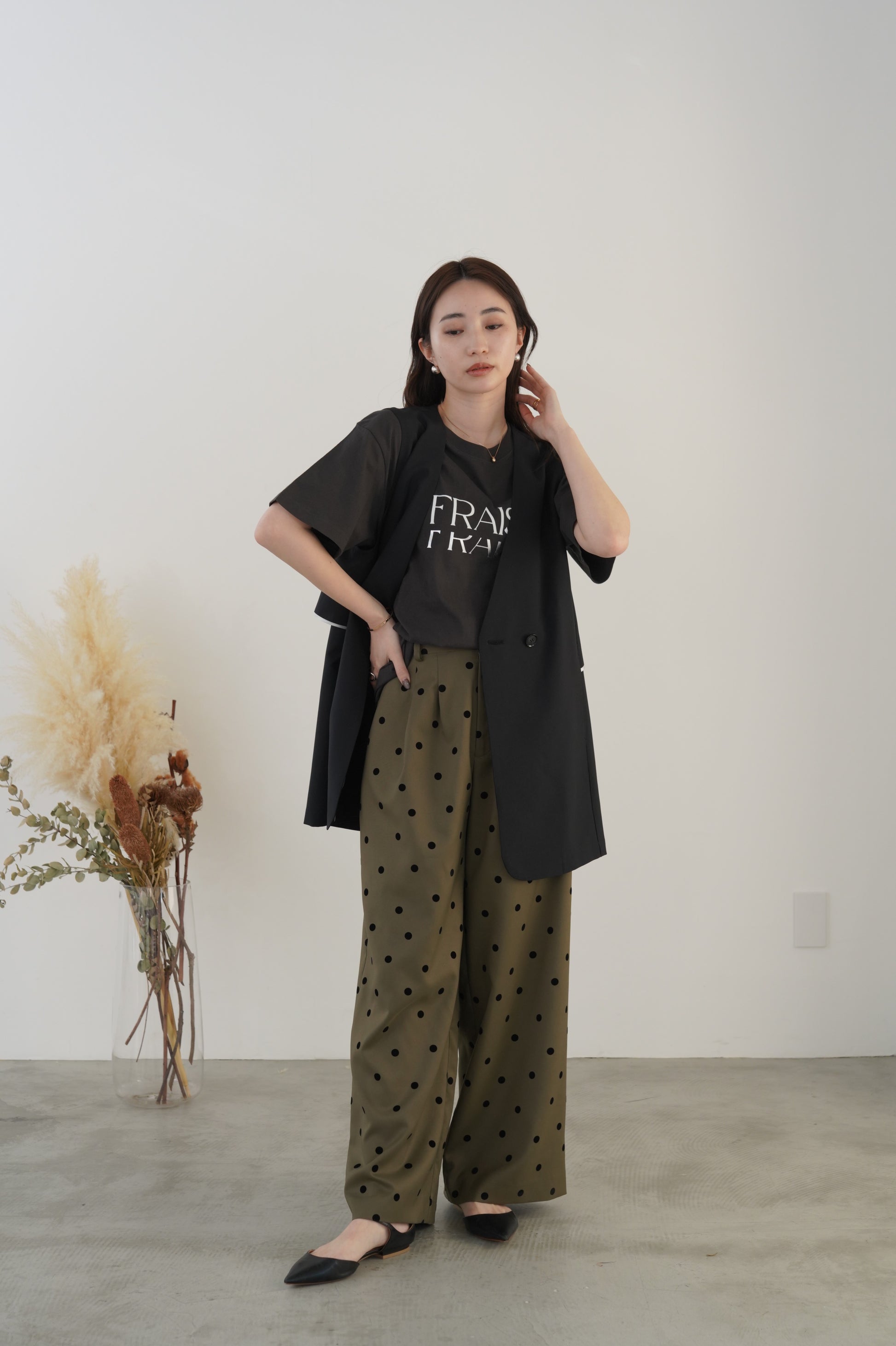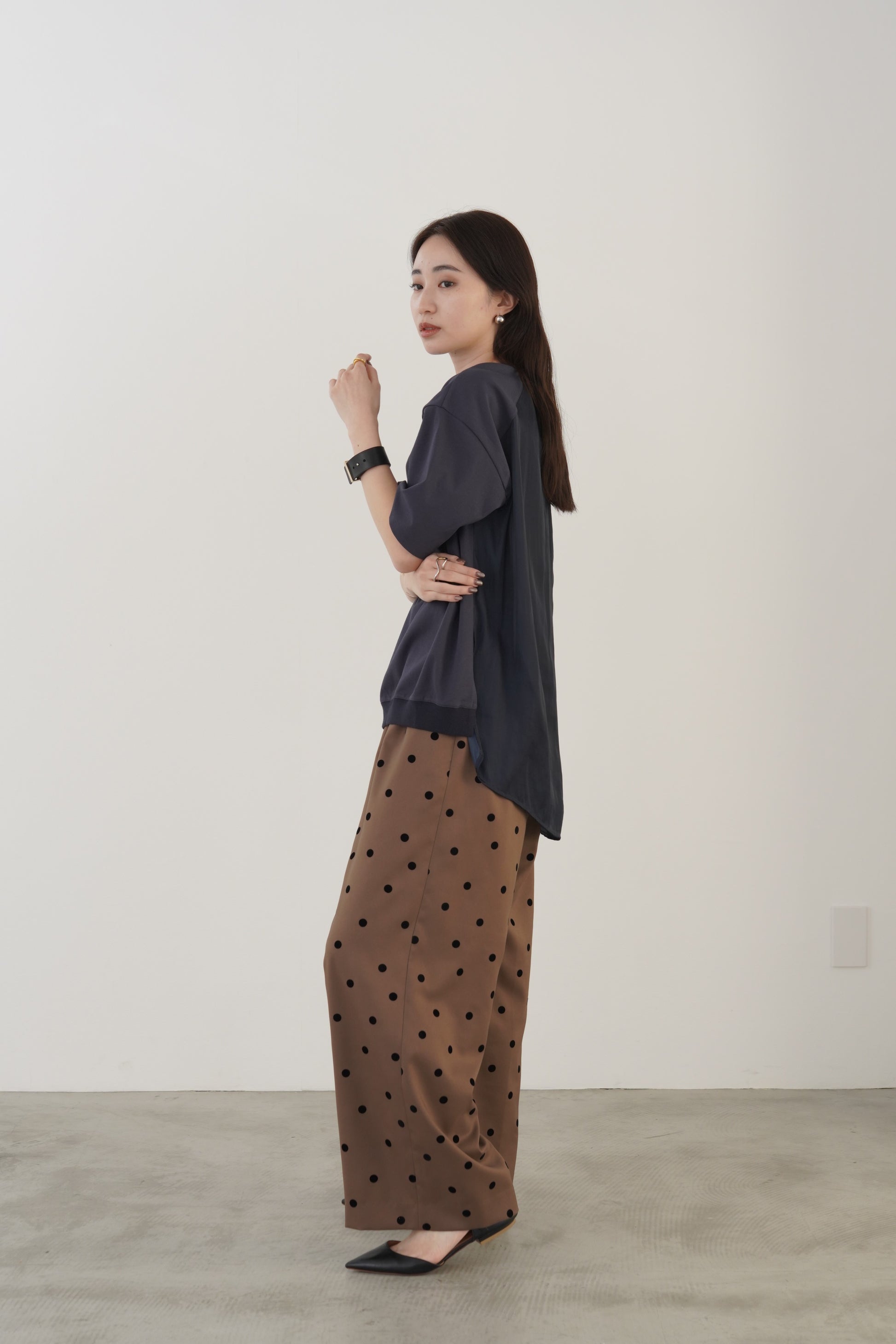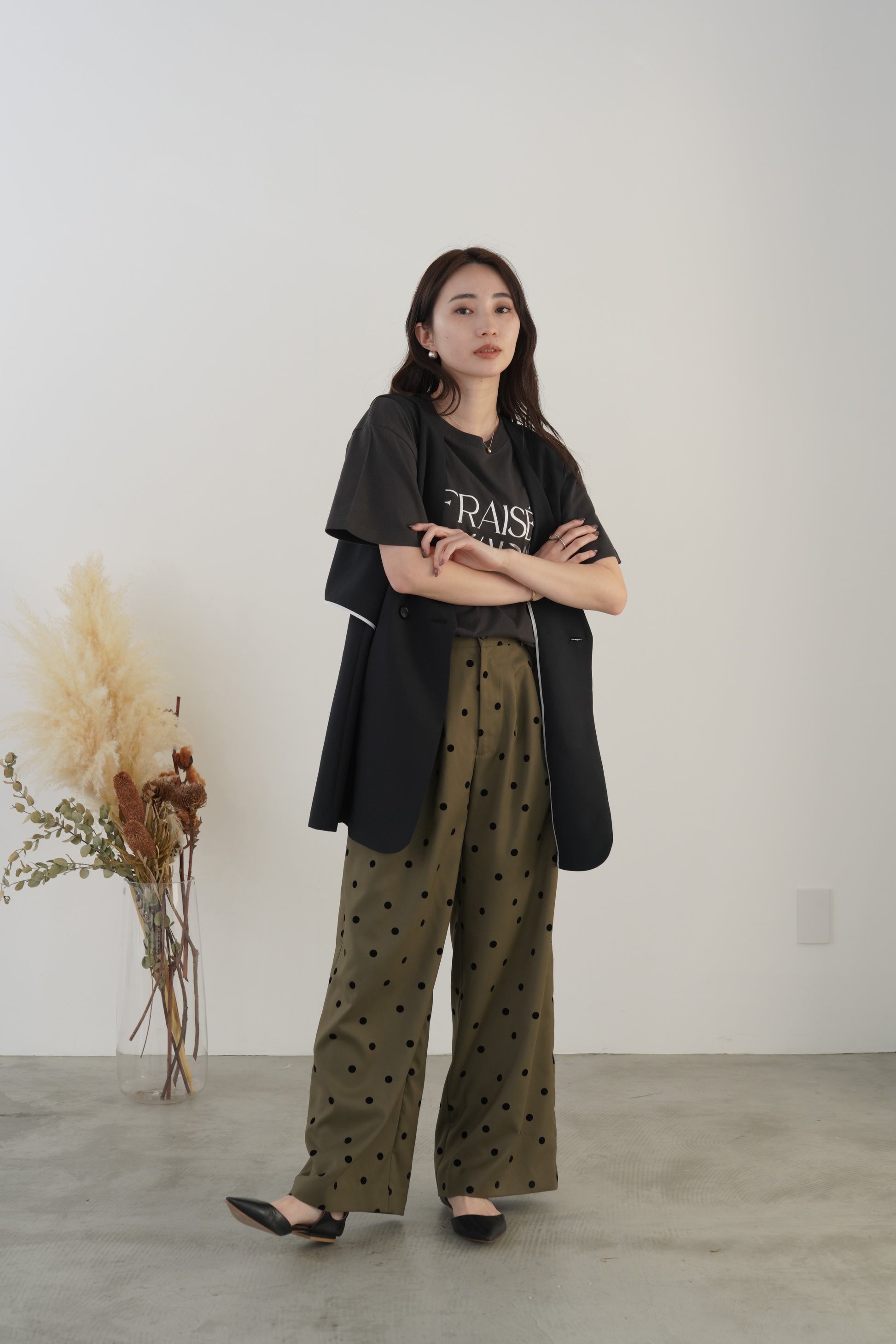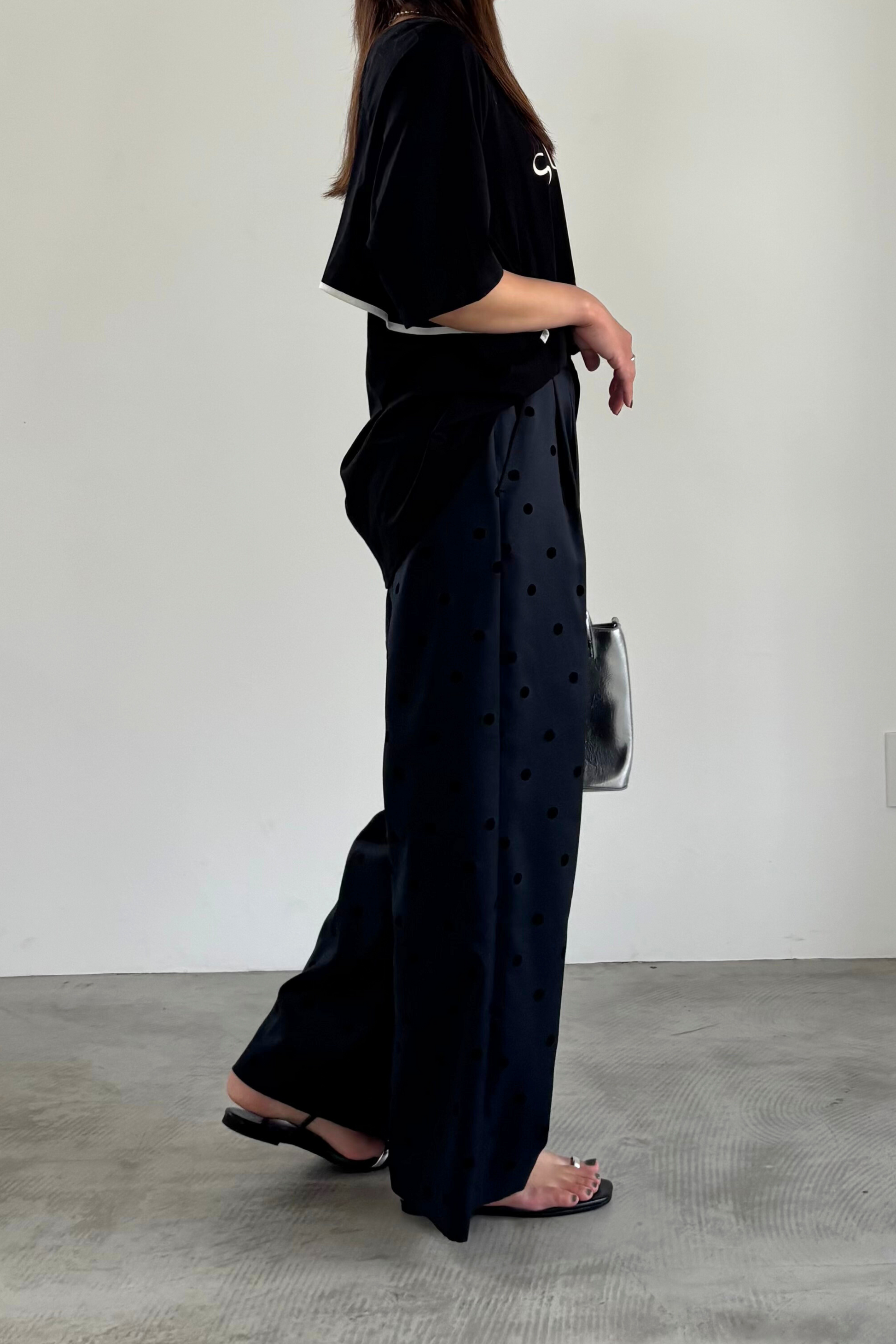 ツイルにプリントされたフロッキードットが目を惹く、ストレートシルエットのパンツ。柔らかく中肉のツイル素材はシワになりづらく、シーズンレスに履き回せる素材感。前身はタックですっきり、後身はゴム仕様のウエストに仕上げました。