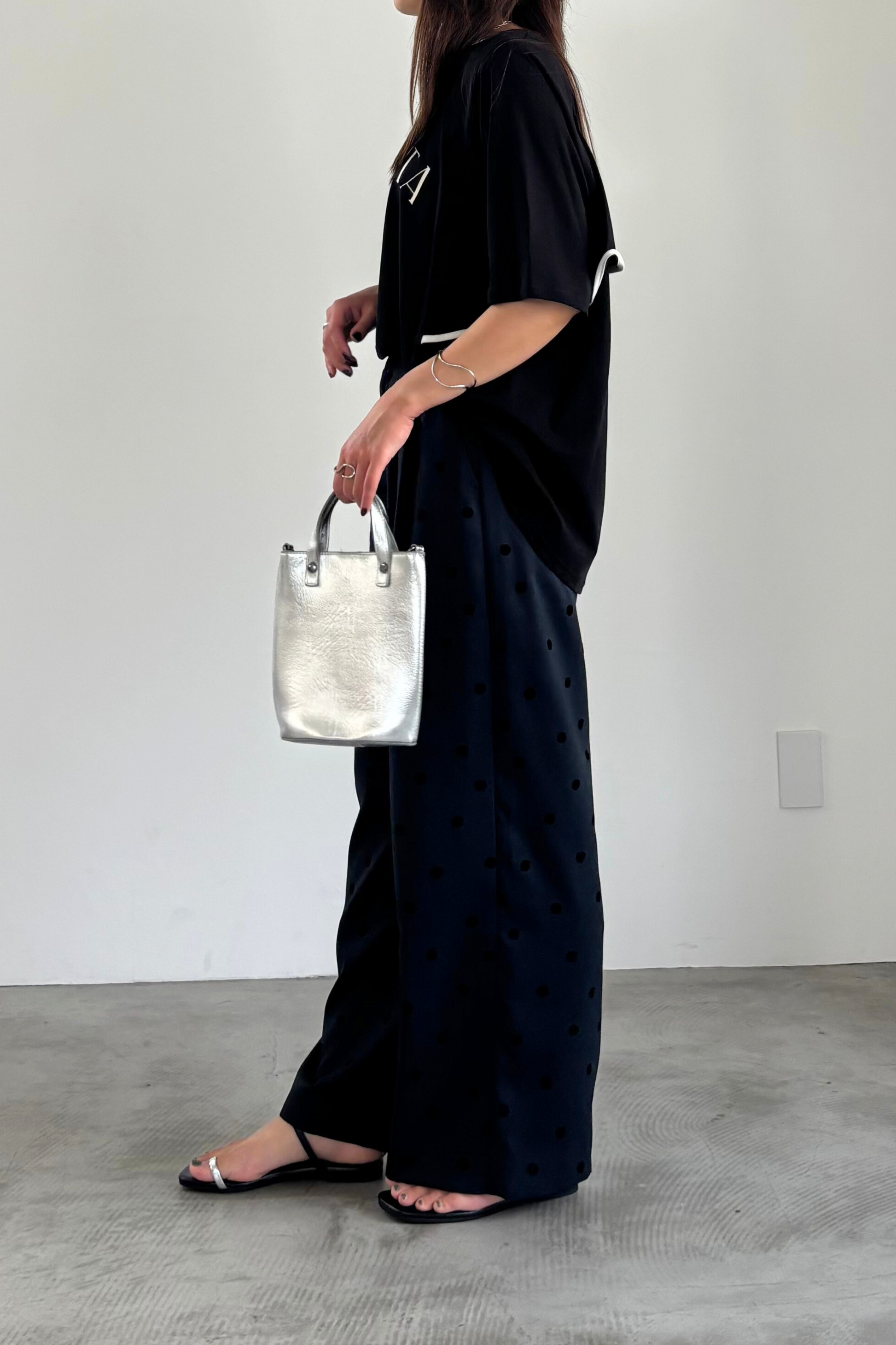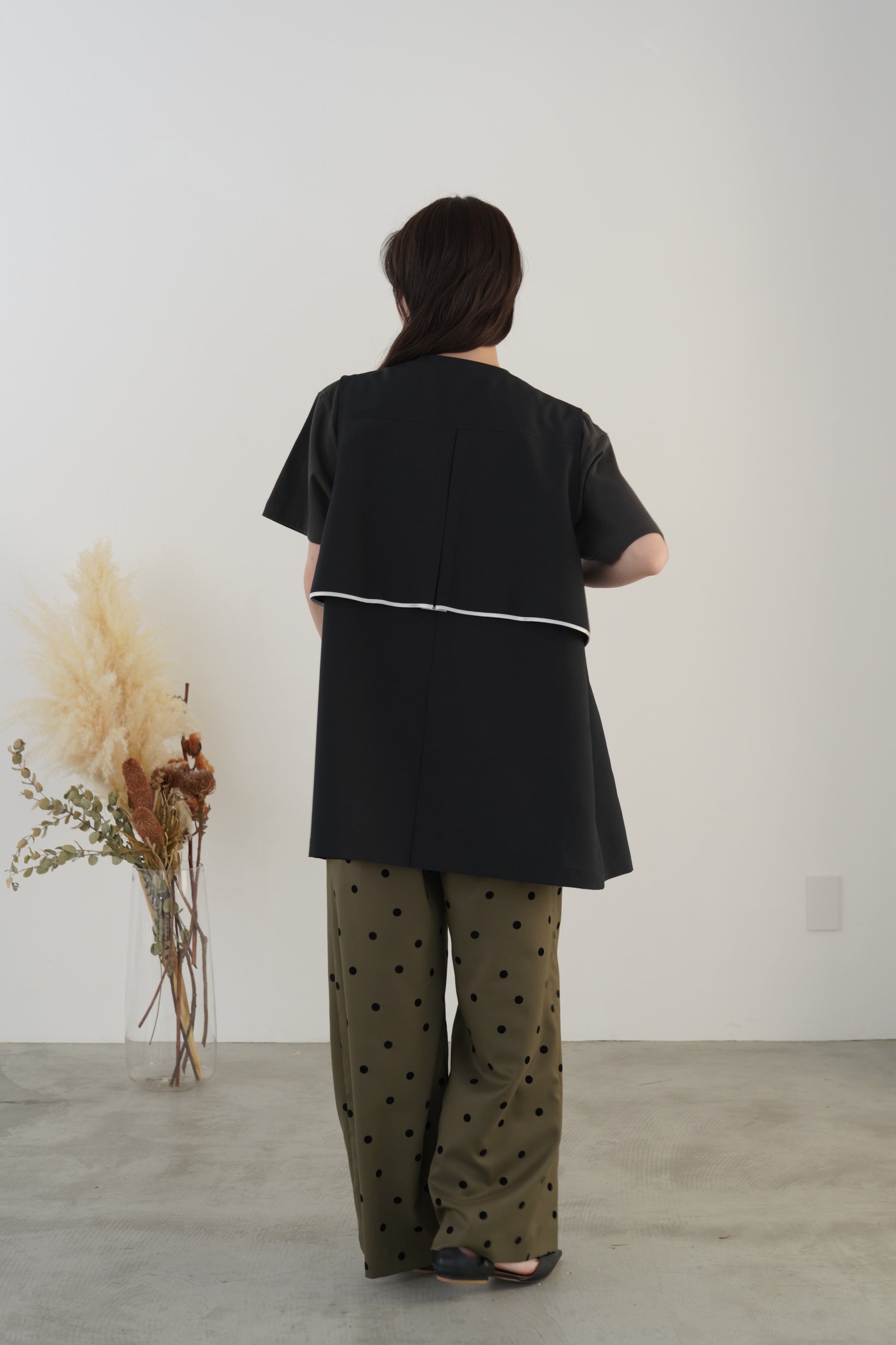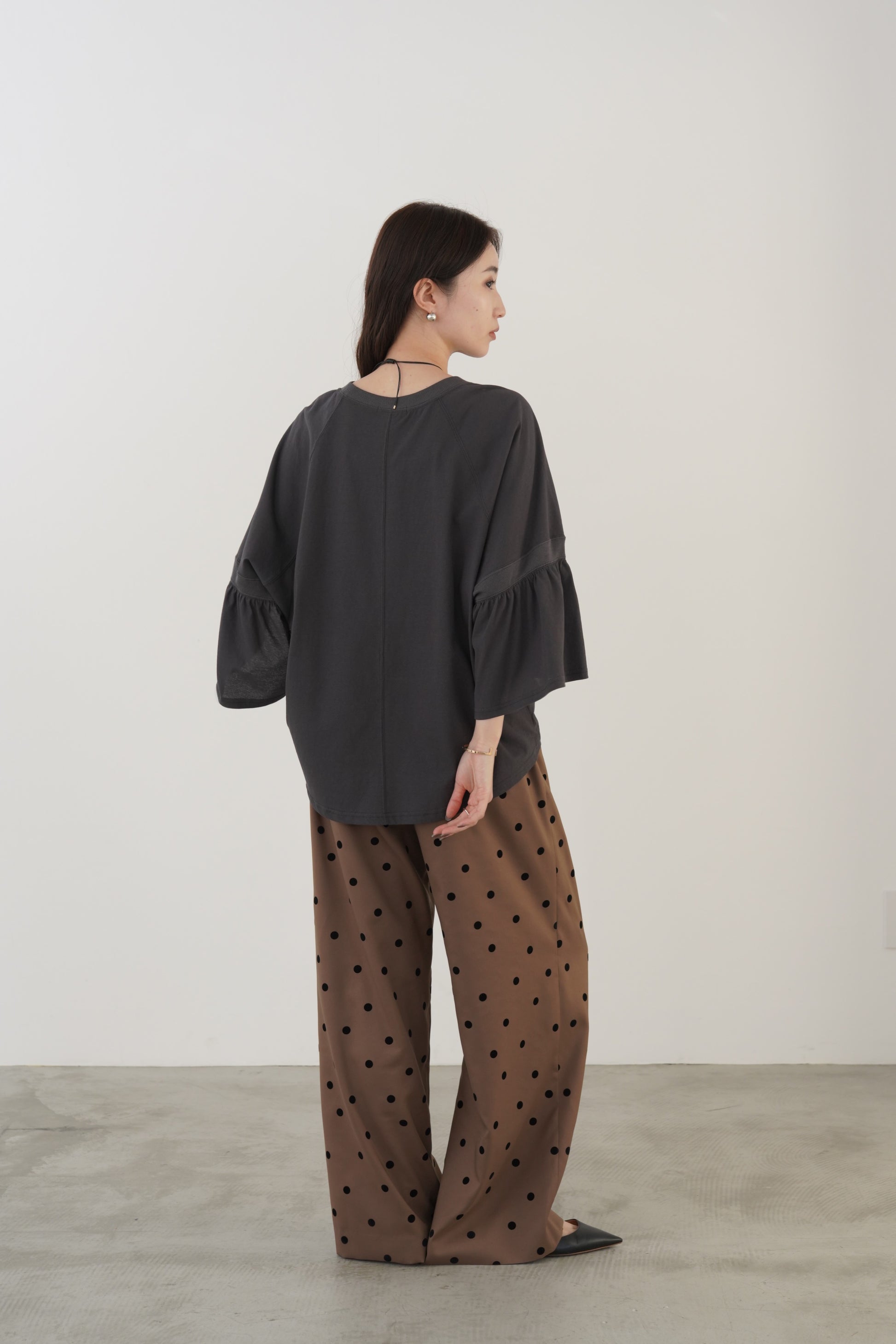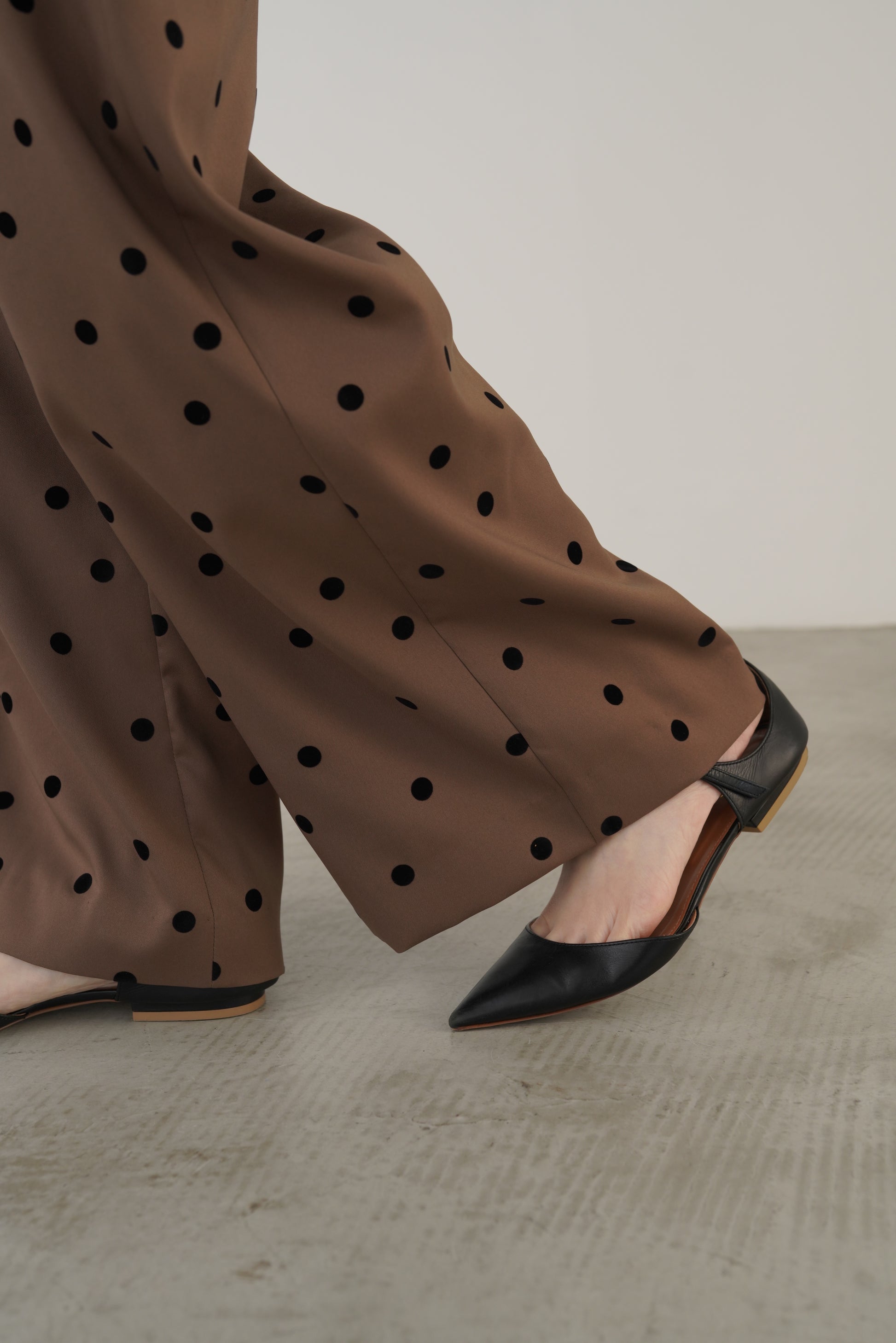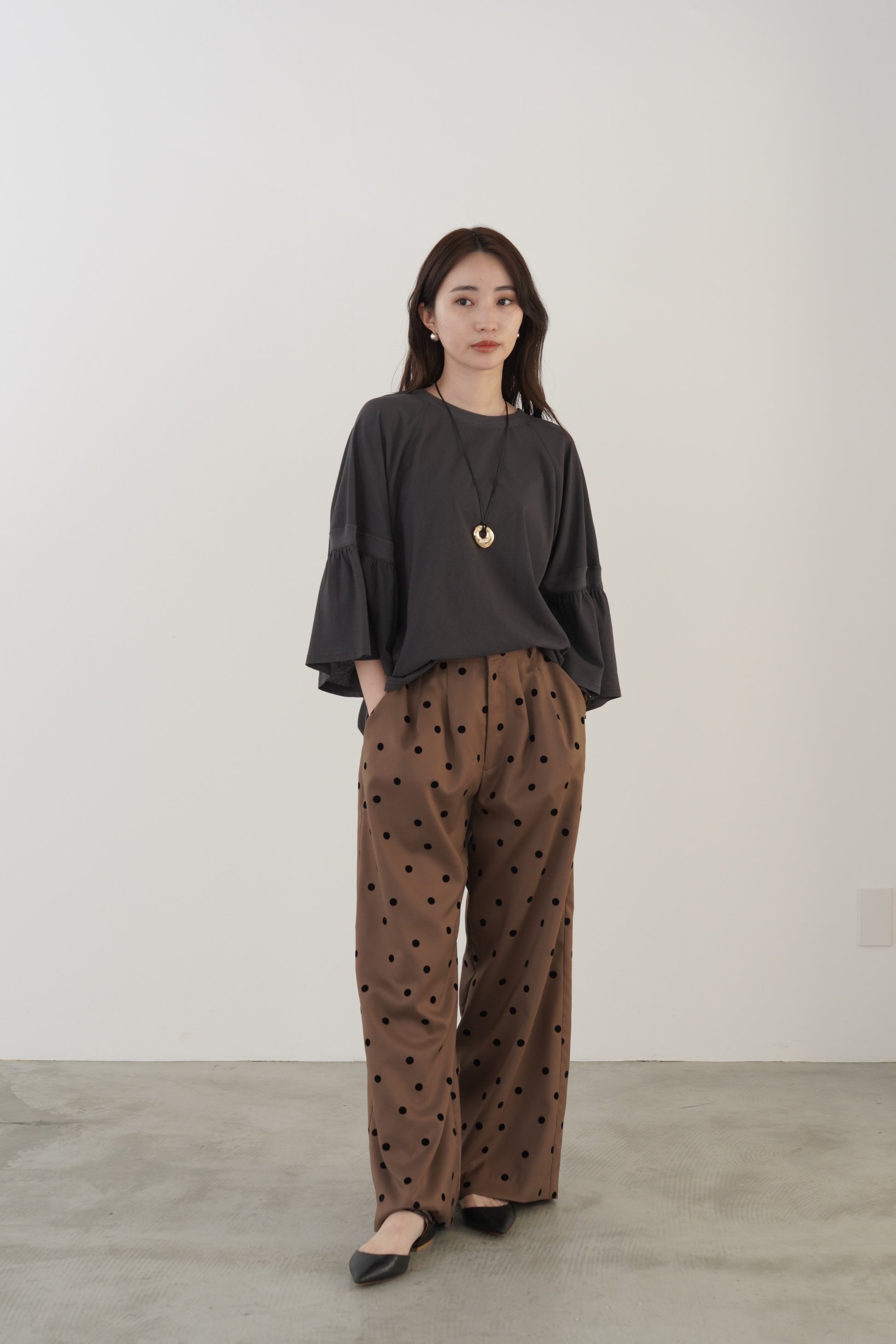 ツイルにプリントされたフロッキードットが目を惹く、ストレートシルエットのパンツ。柔らかく中肉のツイル素材はシワになりづらく、シーズンレスに履き回せる素材感。前身はタックですっきり、後身はゴム仕様のウエストに仕上げました。