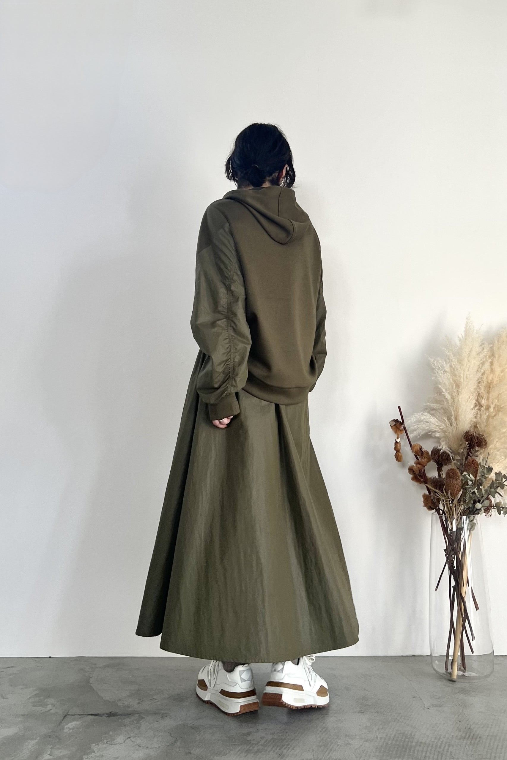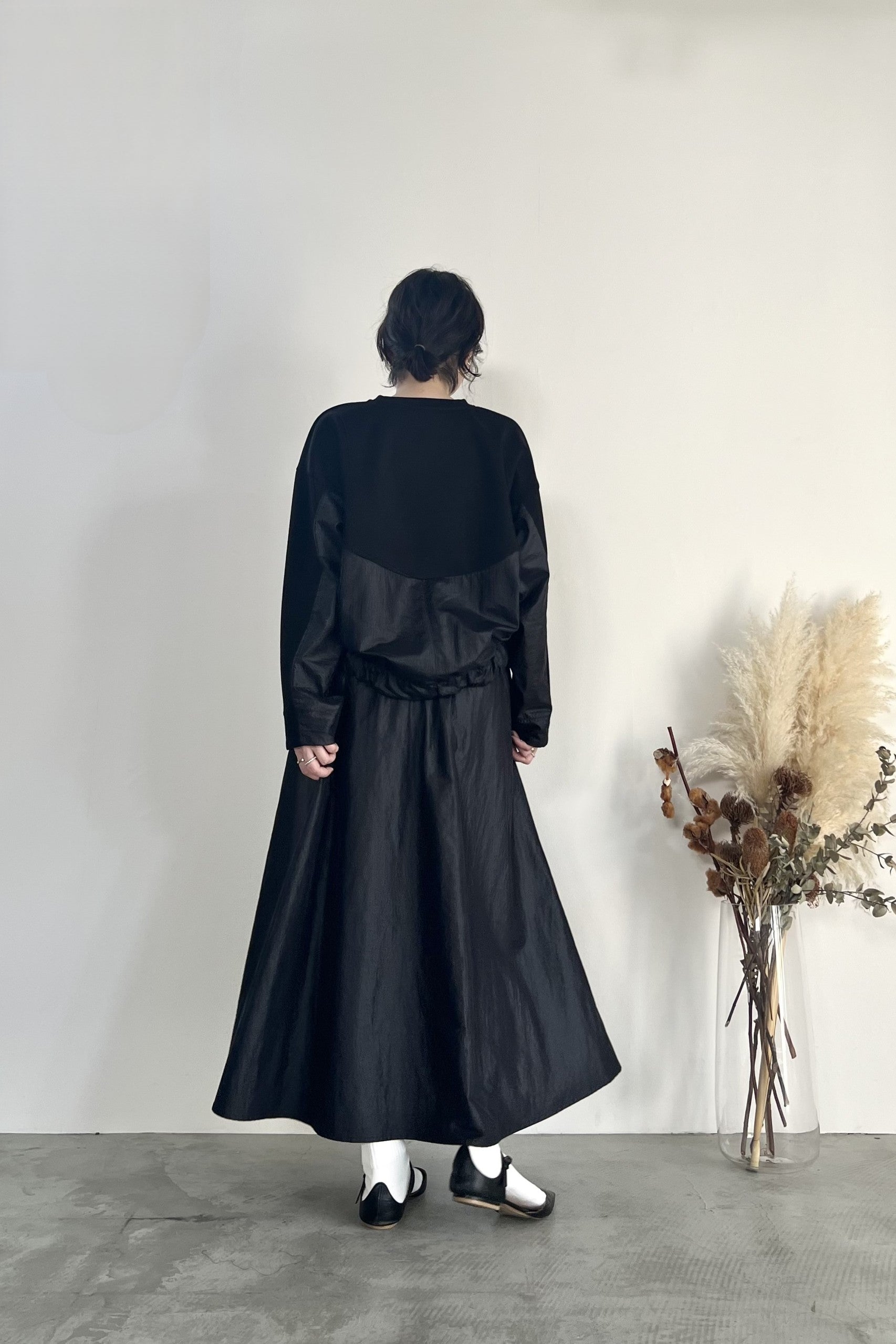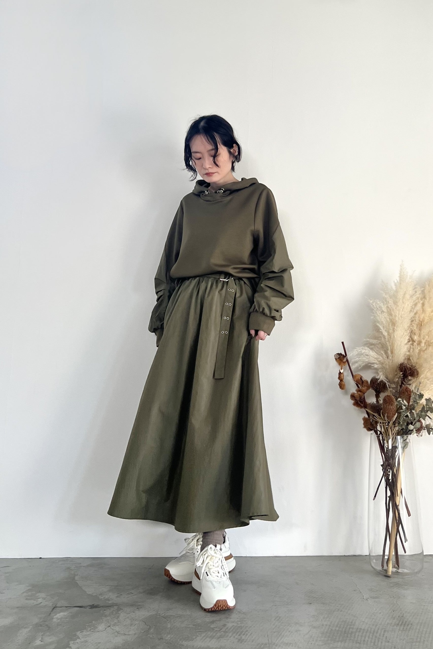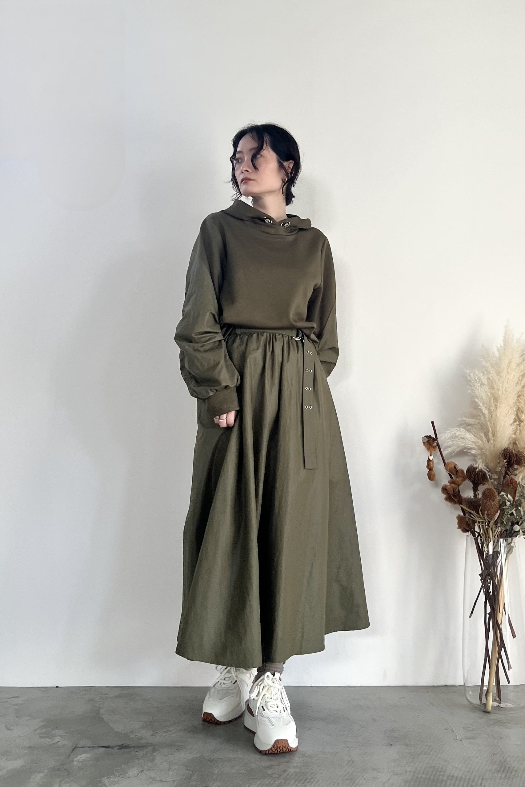 ナイロン素材にチンツ加工を施した光沢がある表面感が特徴のギャザーフレアスカートです。後ろウエストがゴム仕様なので履き心地が良く、取り外し可能のベルトでウエストマークして着用していただけます。