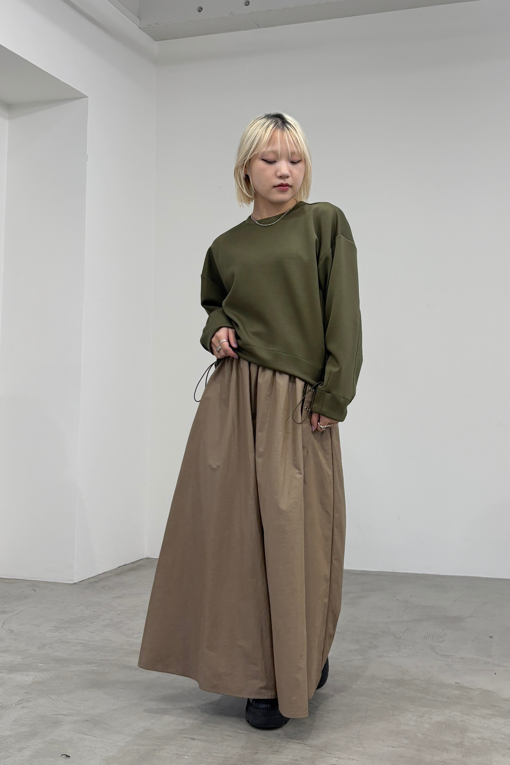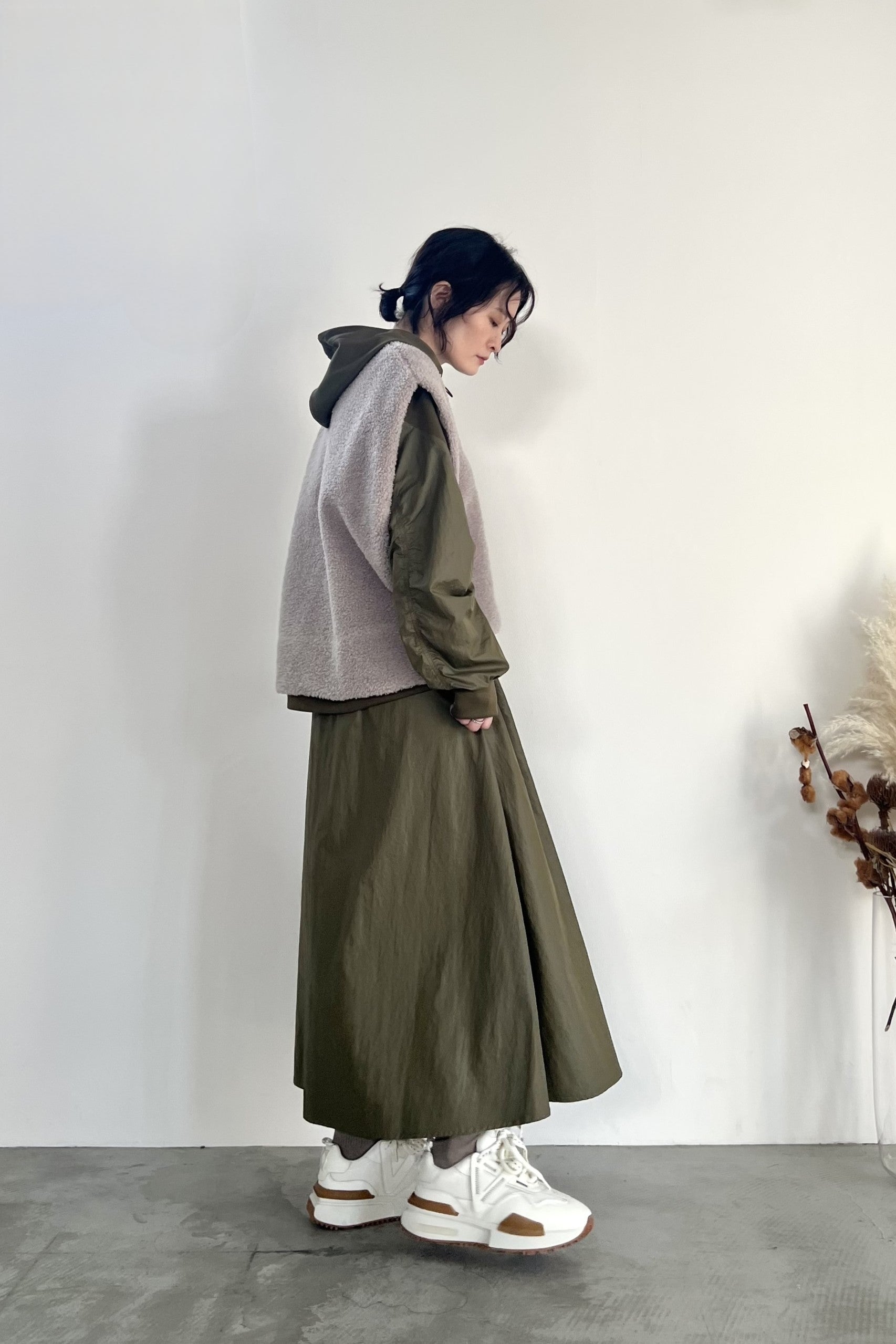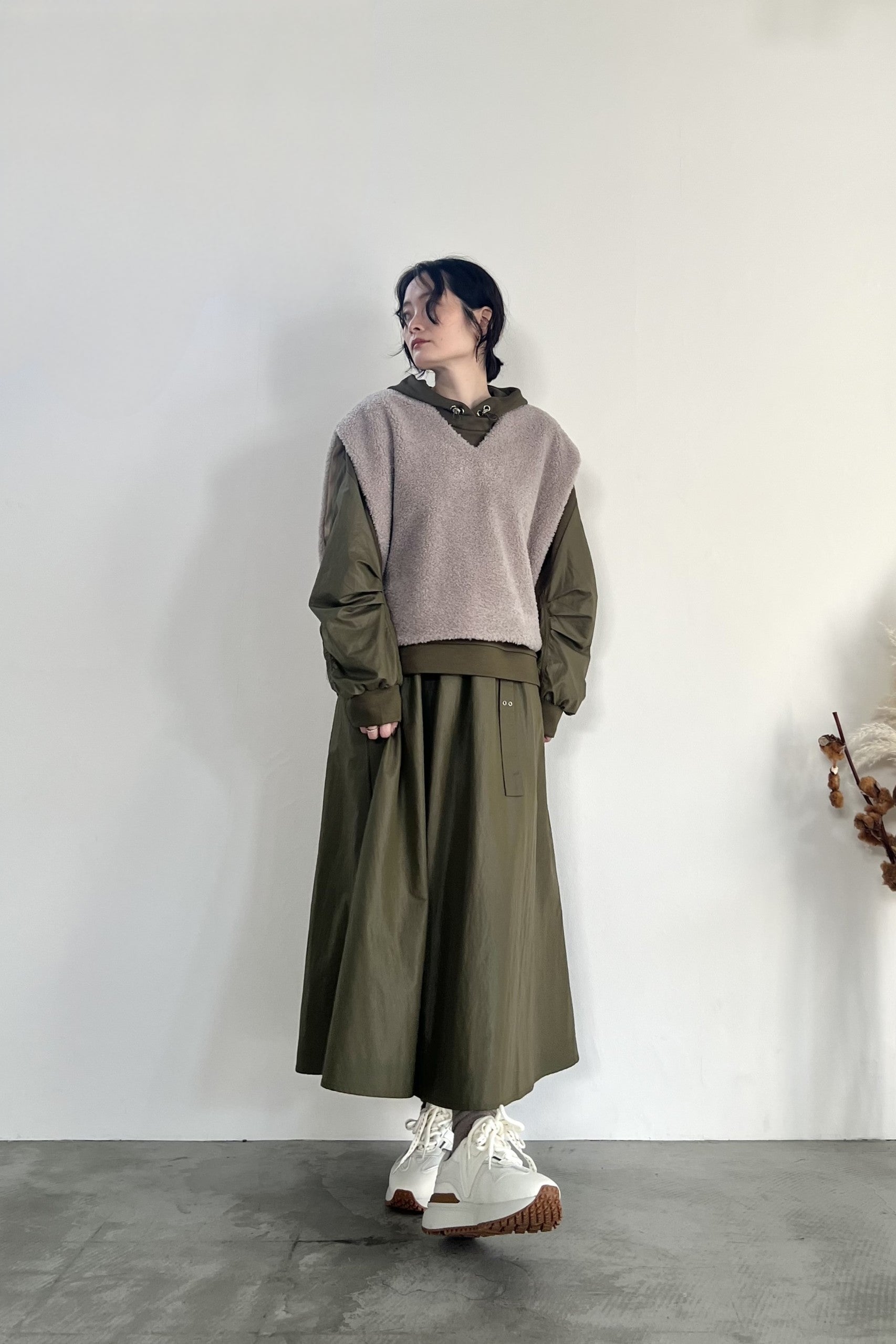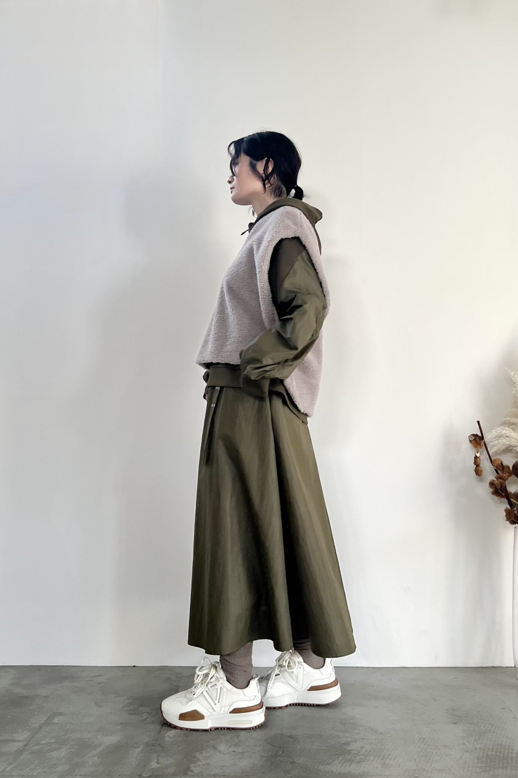 ナイロン素材にチンツ加工を施した光沢がある表面感が特徴のギャザーフレアスカートです。後ろウエストがゴム仕様なので履き心地が良く、取り外し可能のベルトでウエストマークして着用していただけます。