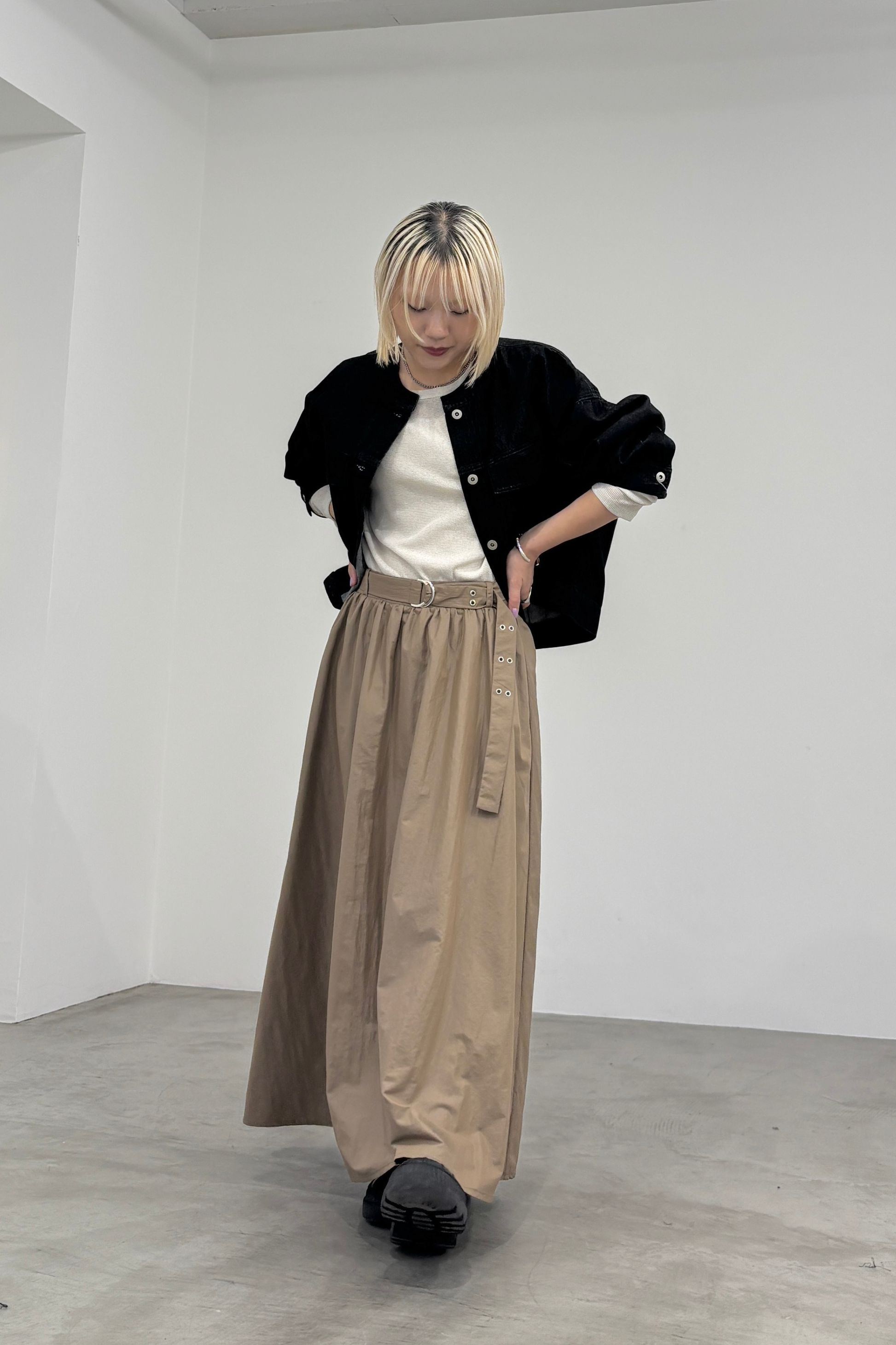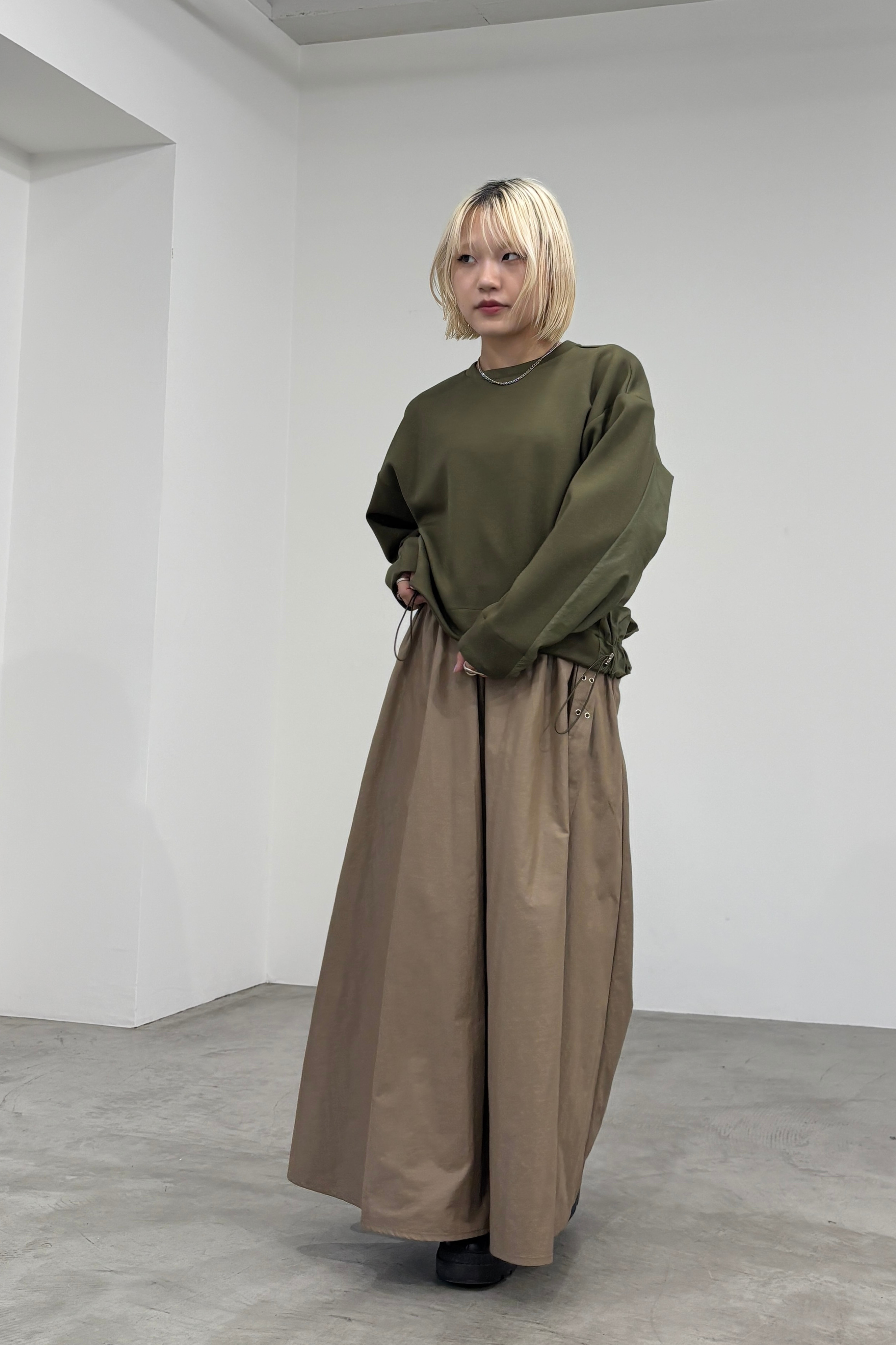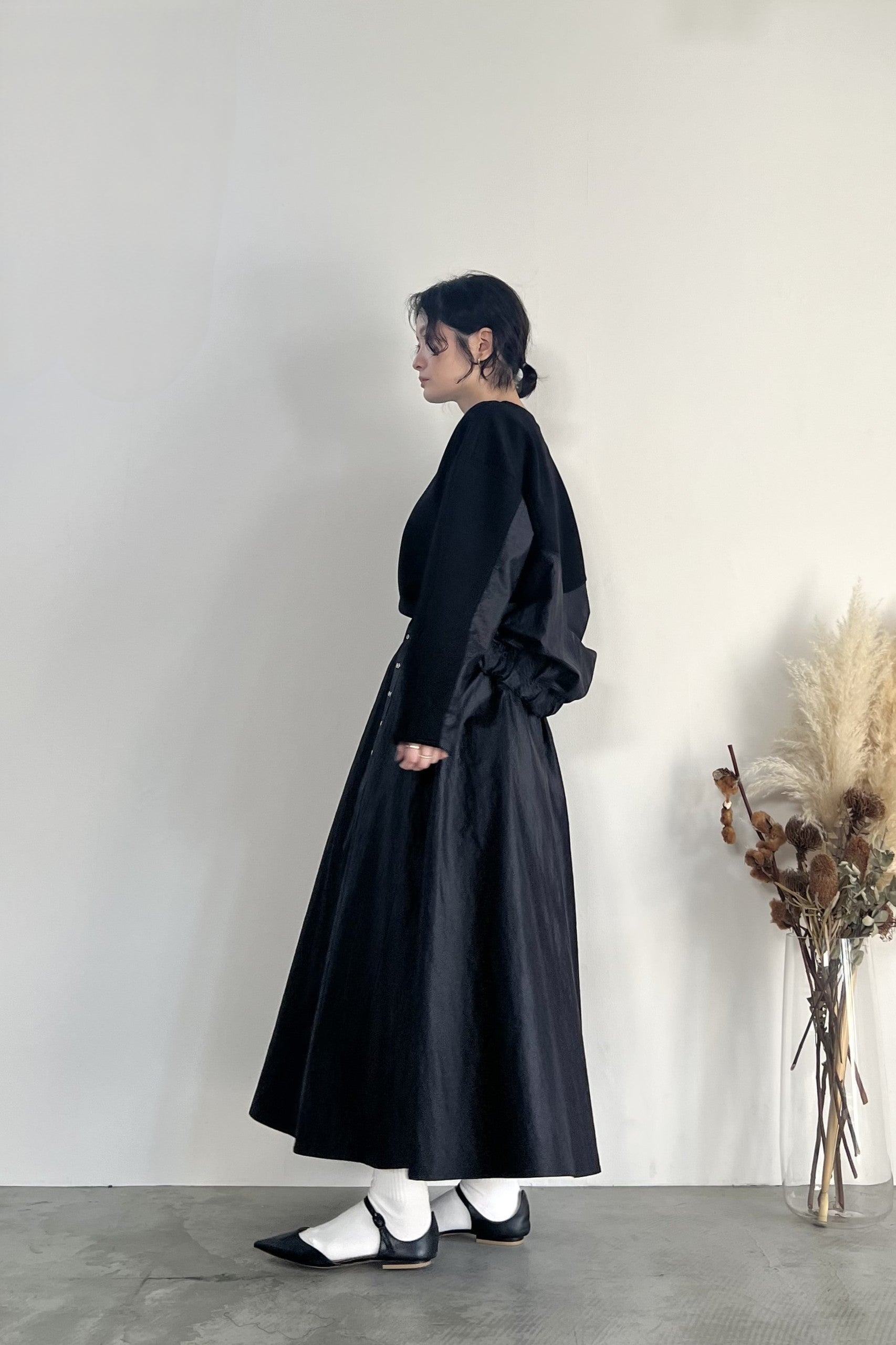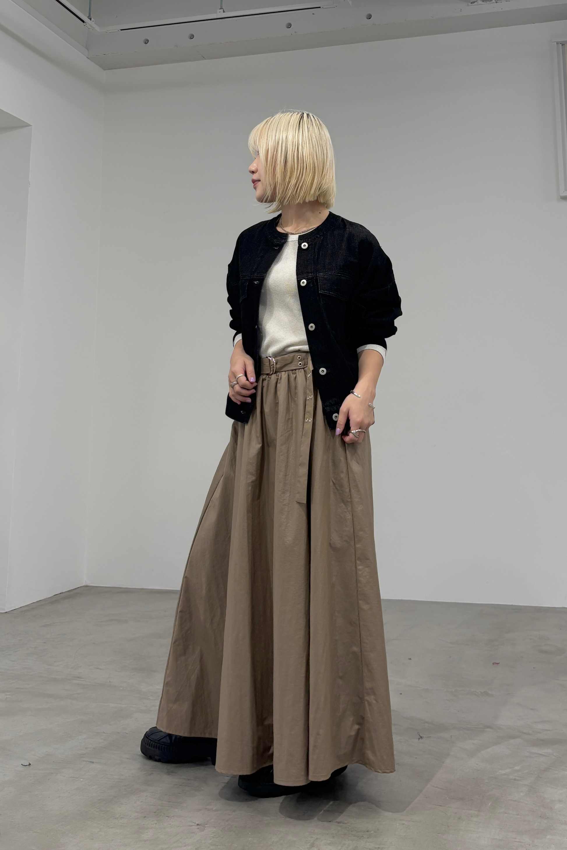 ナイロン素材にチンツ加工を施した光沢がある表面感が特徴のギャザーフレアスカートです。後ろウエストがゴム仕様なので履き心地が良く、取り外し可能のベルトでウエストマークして着用していただけます。
