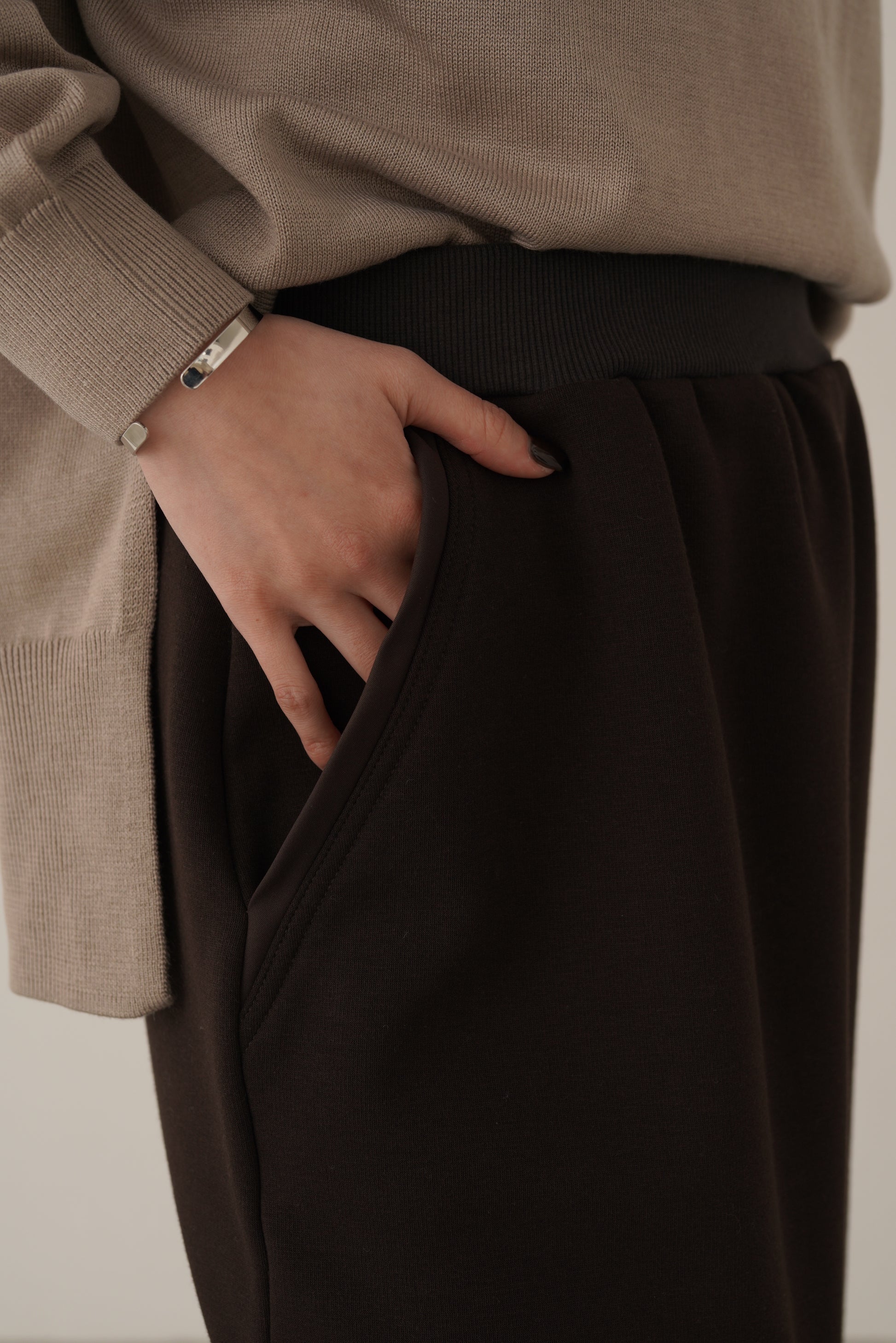 ウエストはゴムで、ストレッチ性が高くリラックスした履き心地。ポケット口のテープがスタイリングのアクセントになります。