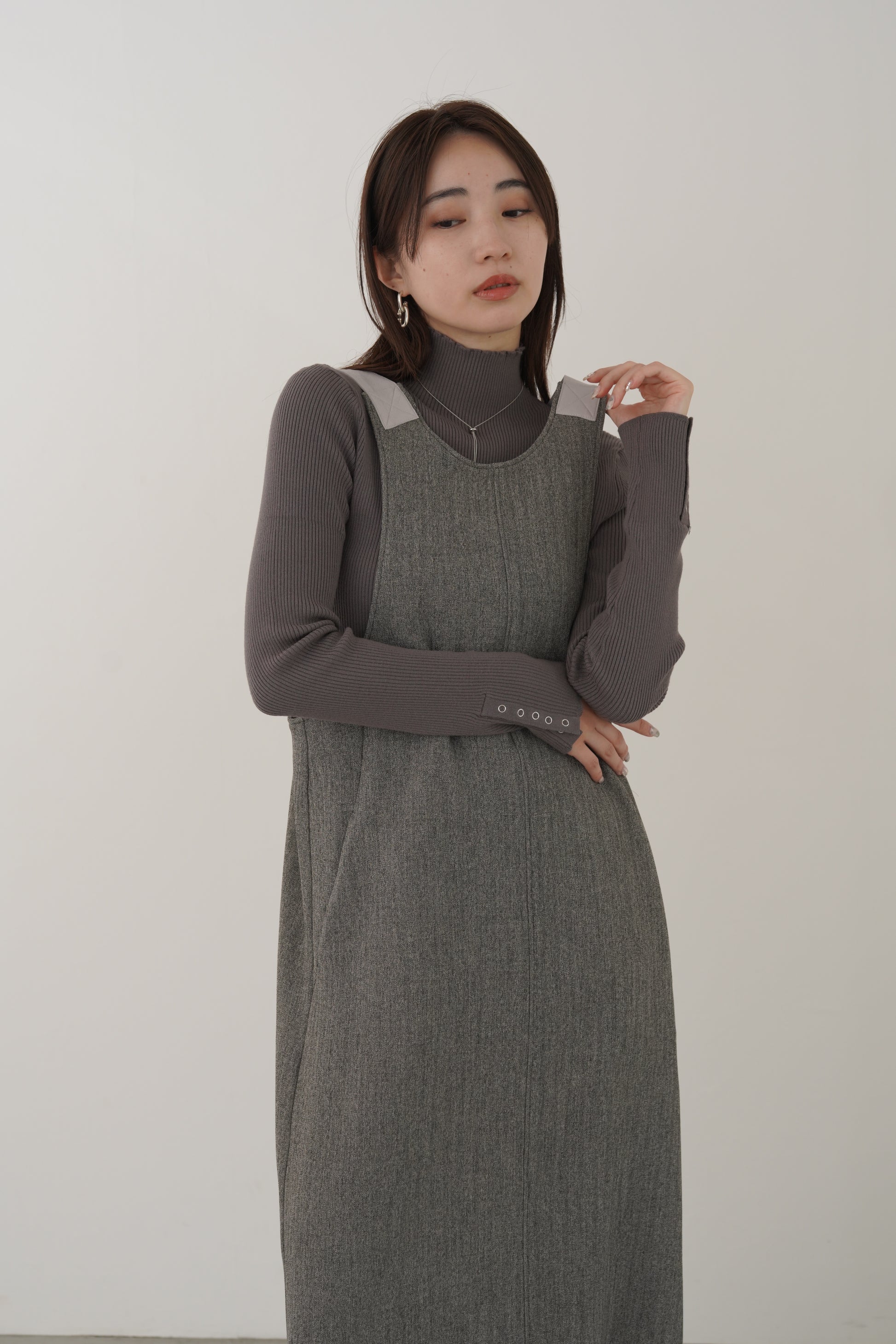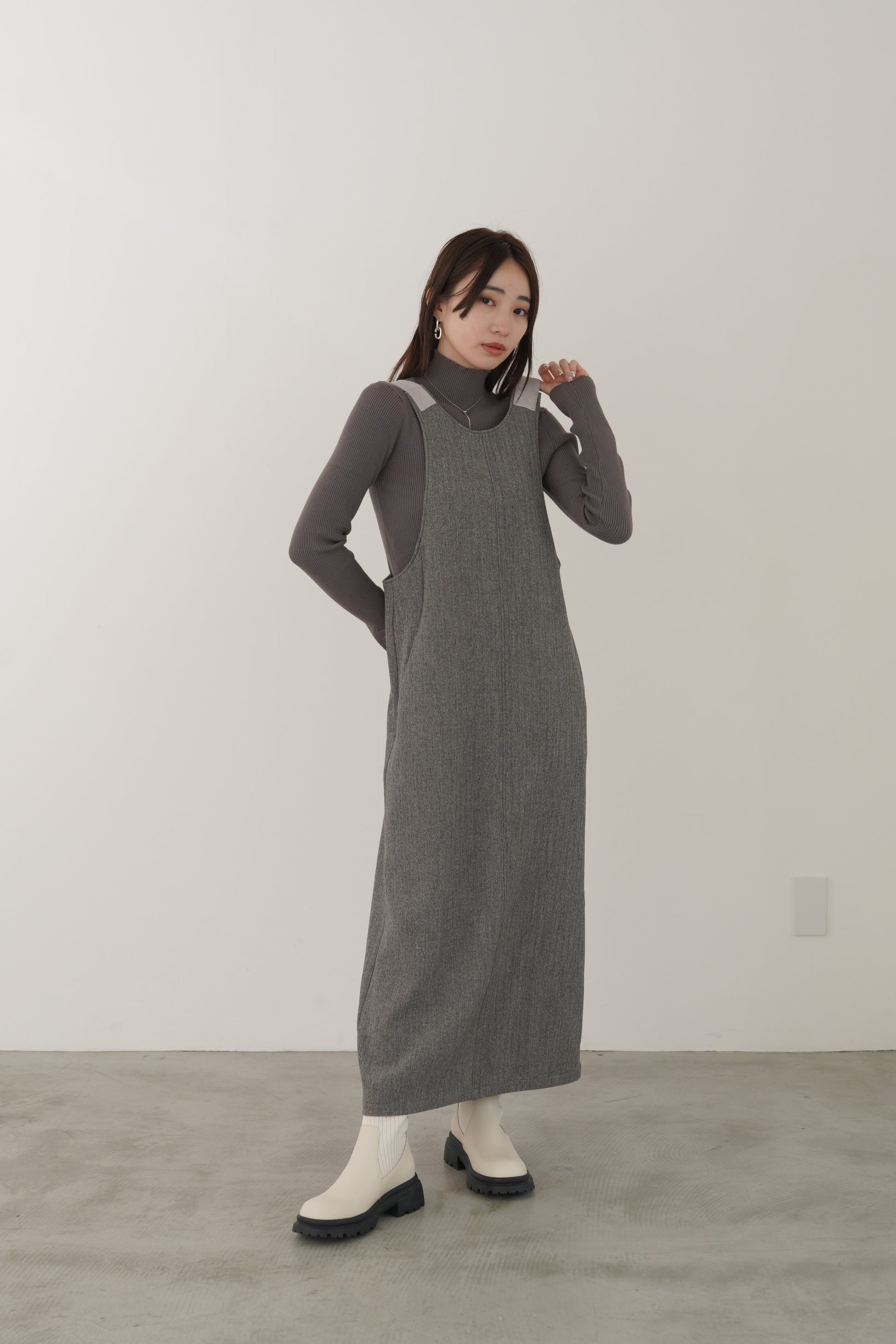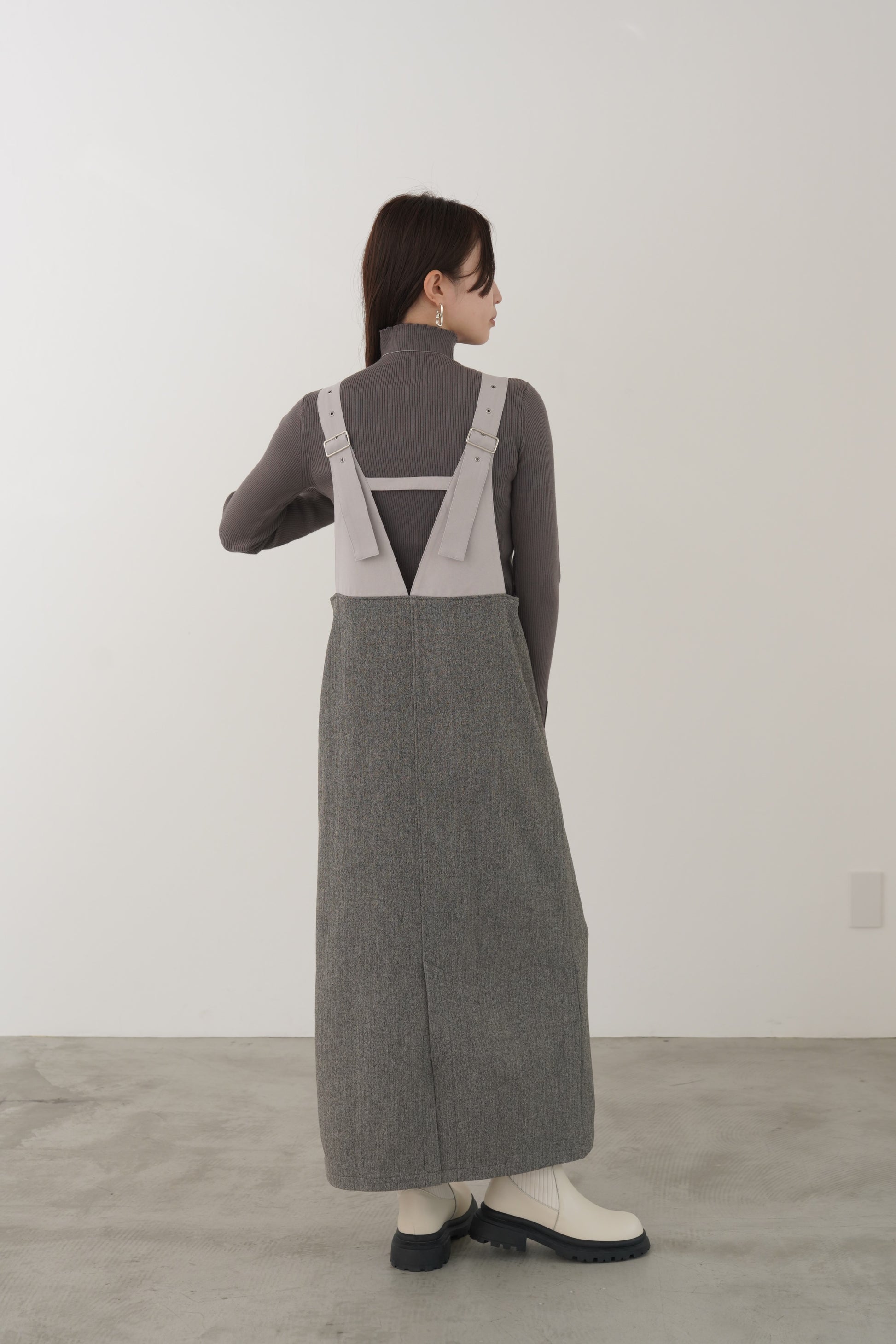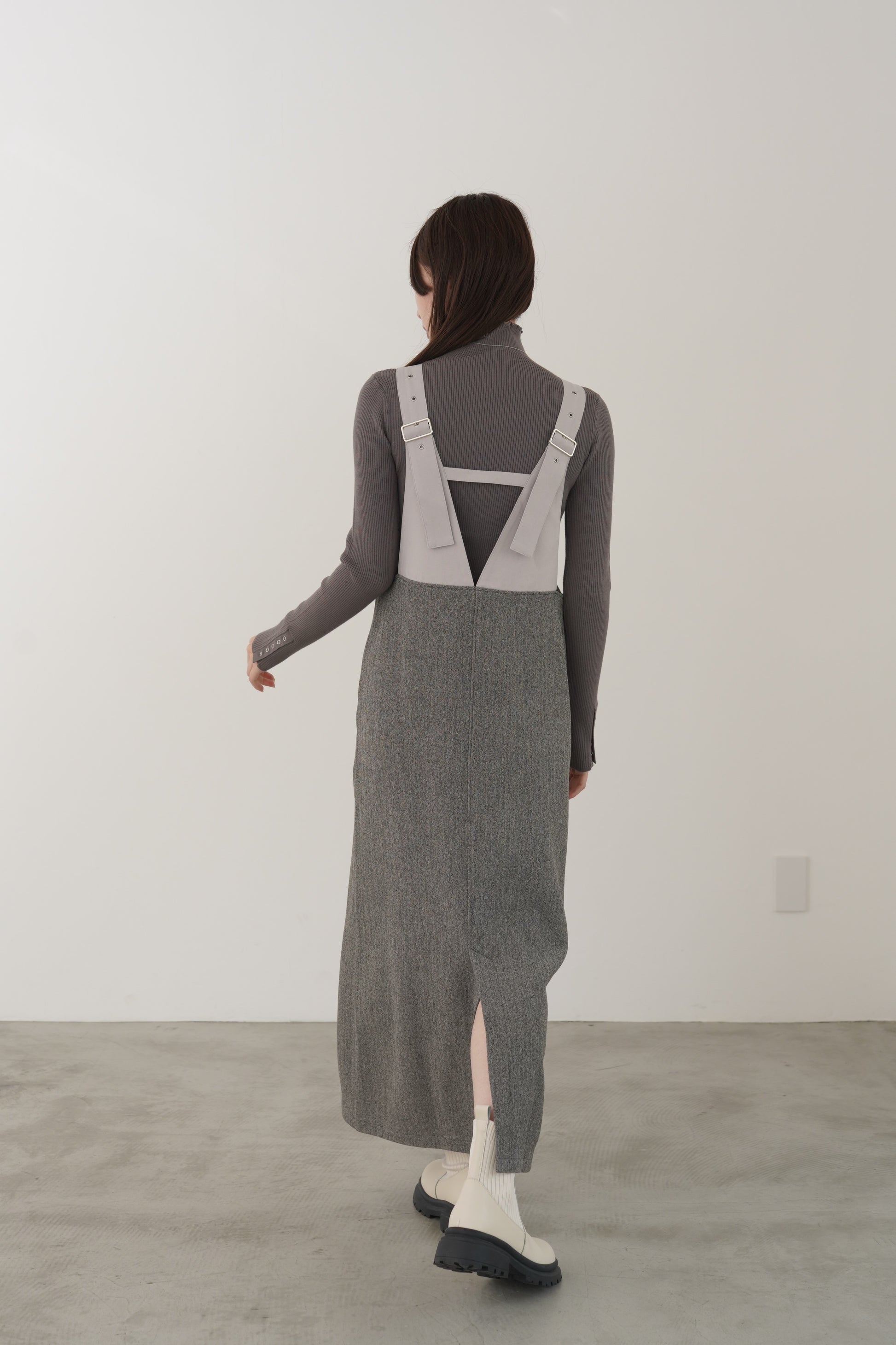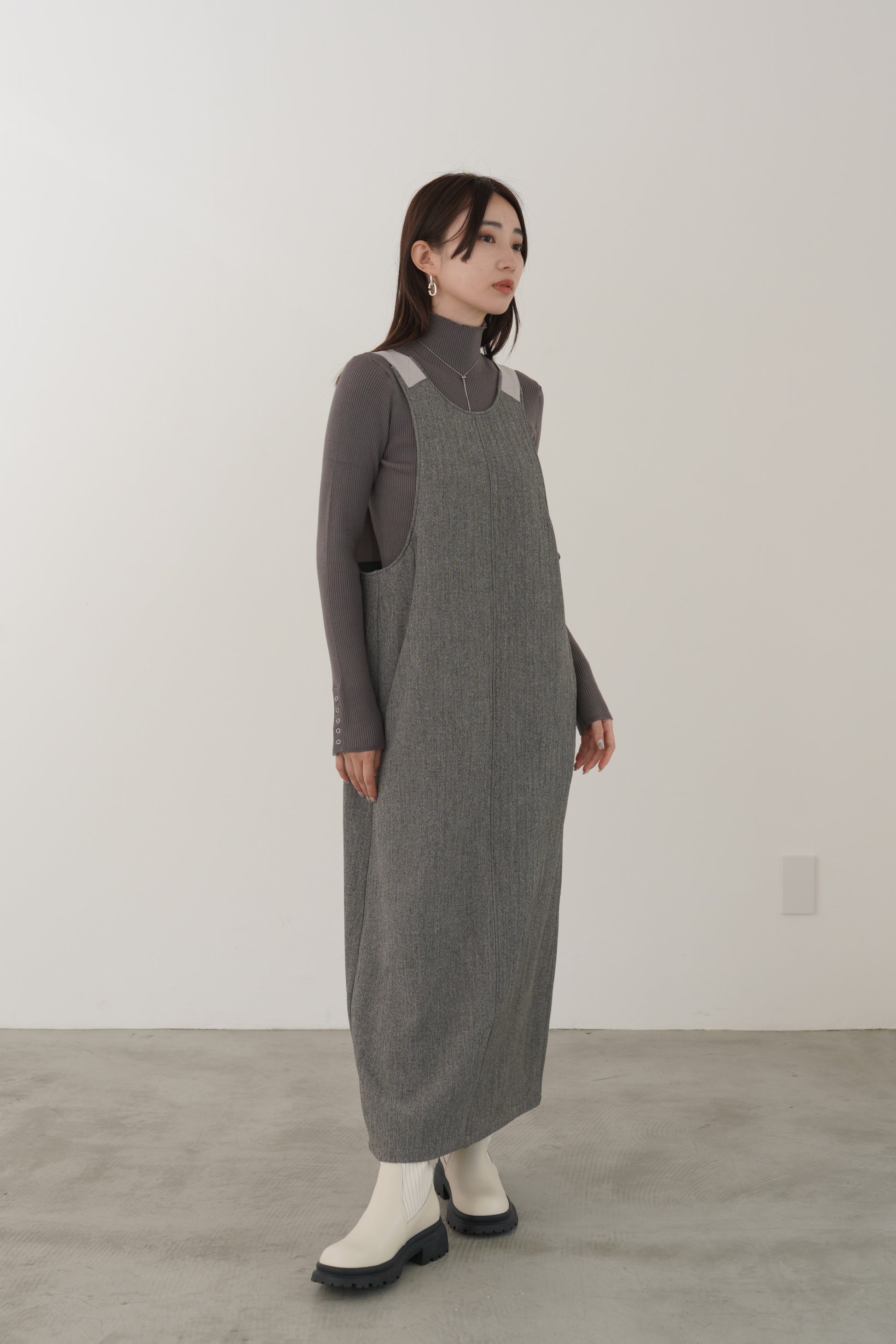 ストレッチの効いたウール調ツイード素材を使用した、ジャンパースカート。Iラインシルエットとアメリカンスリーブが華奢見えを叶えてくれます。異素材で切り替えたバックスタイルもポイント。肩紐で着丈の調節が可能です。