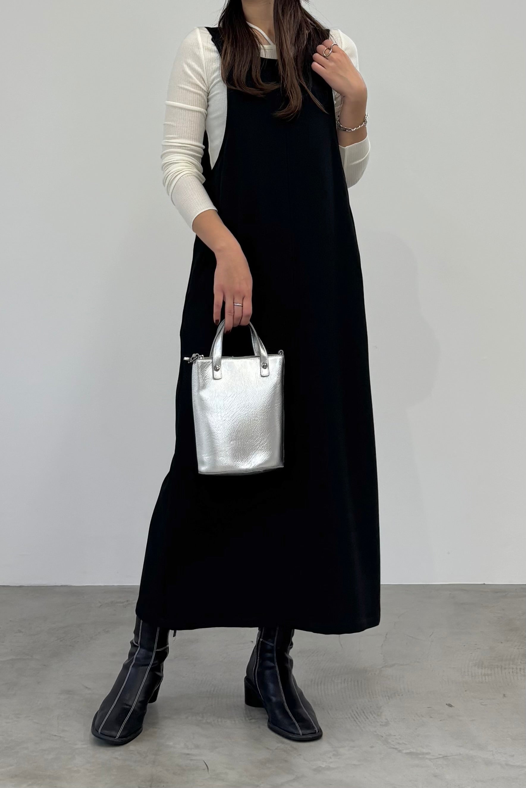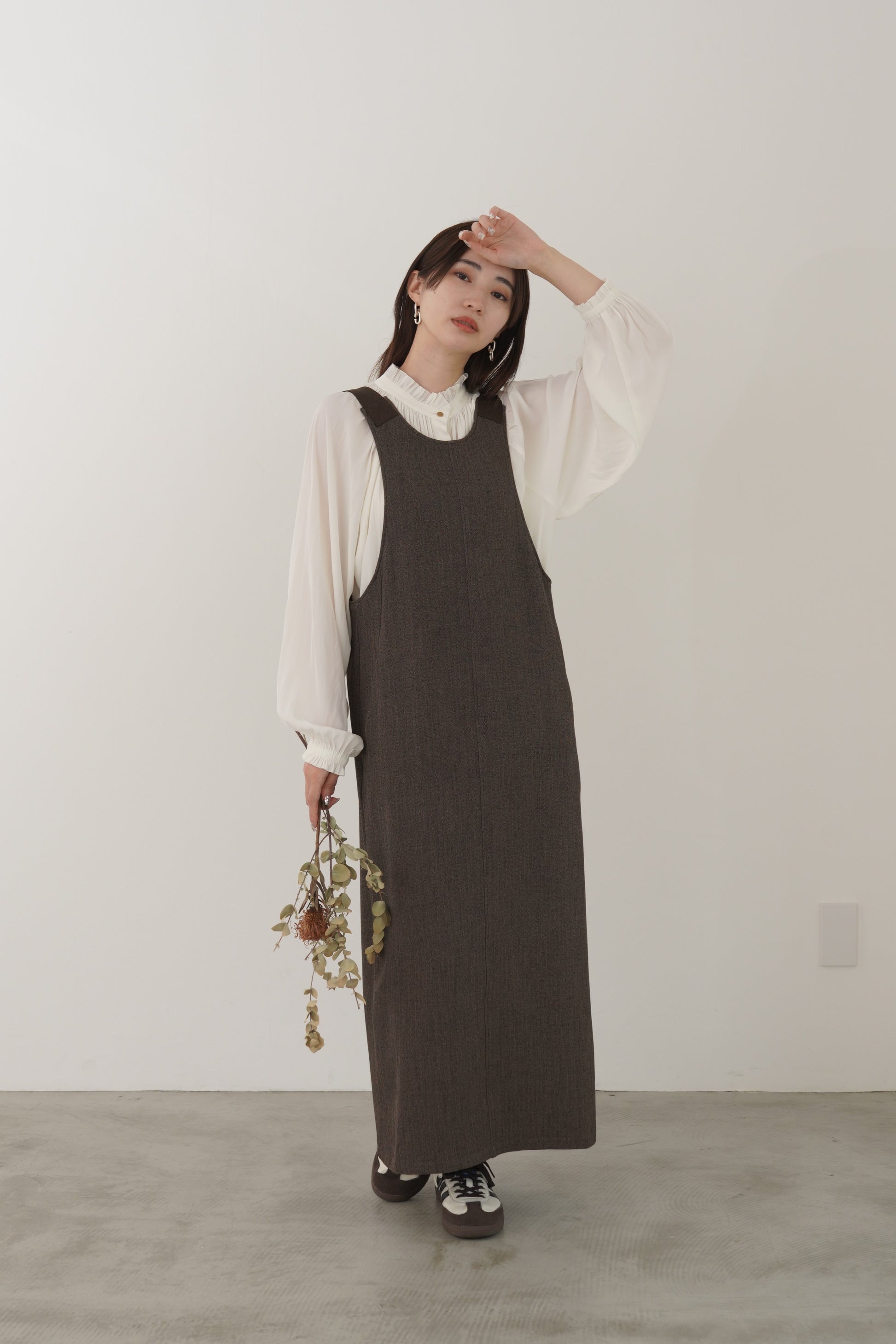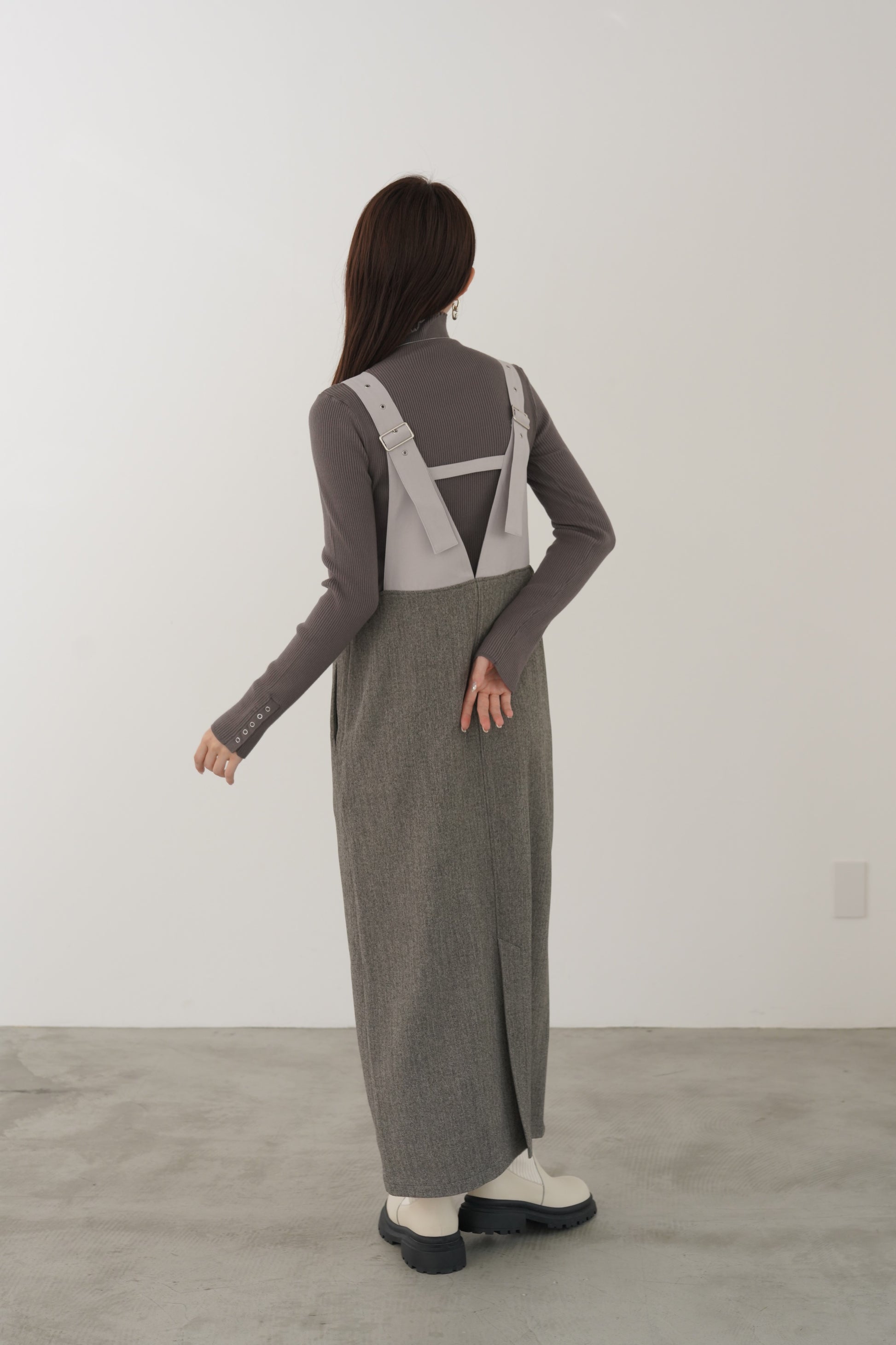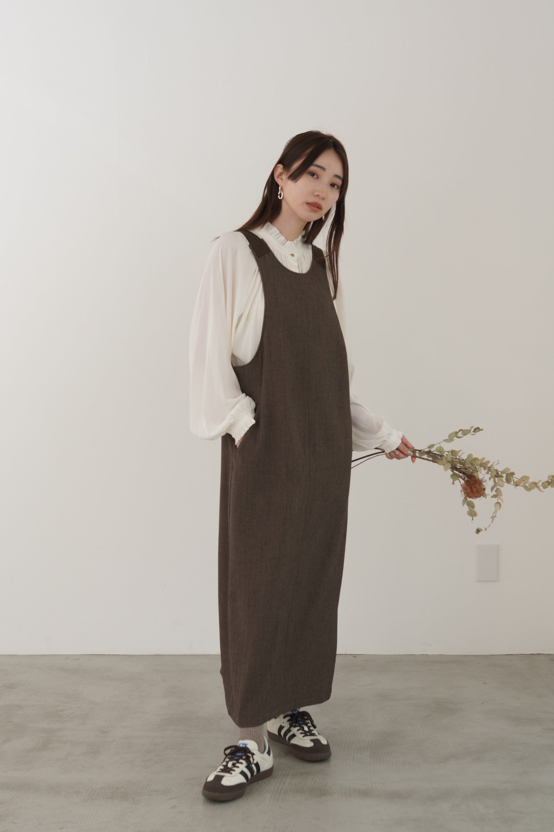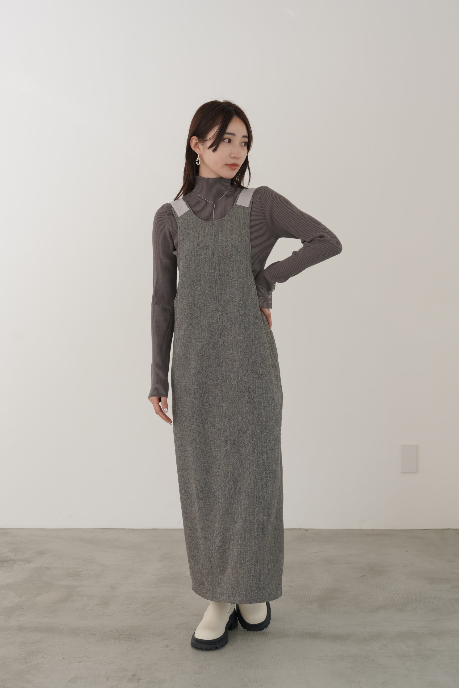 ストレッチの効いたウール調ツイード素材を使用した、ジャンパースカート。Iラインシルエットとアメリカンスリーブが華奢見えを叶えてくれます。異素材で切り替えたバックスタイルもポイント。肩紐で着丈の調節が可能です。