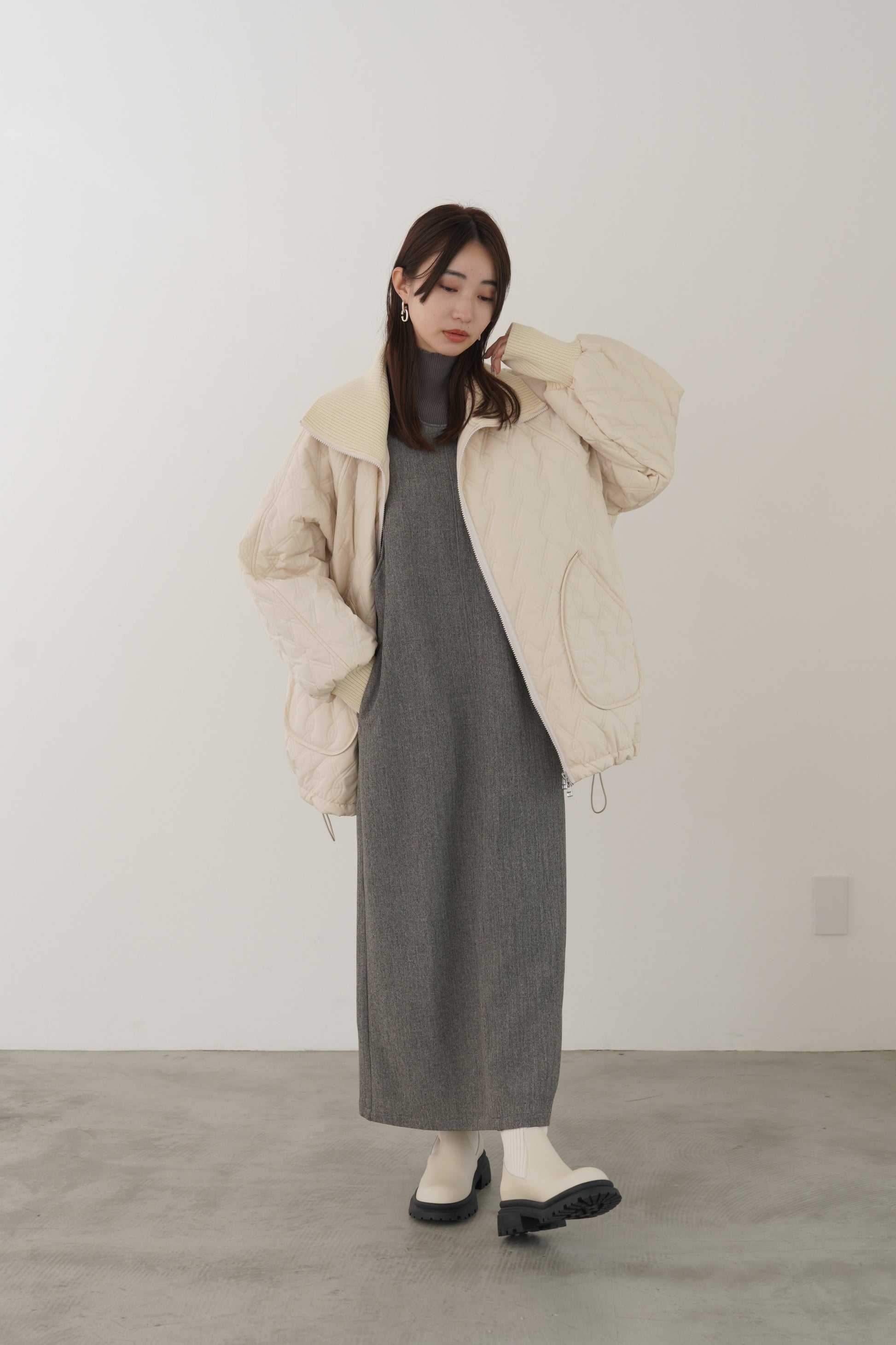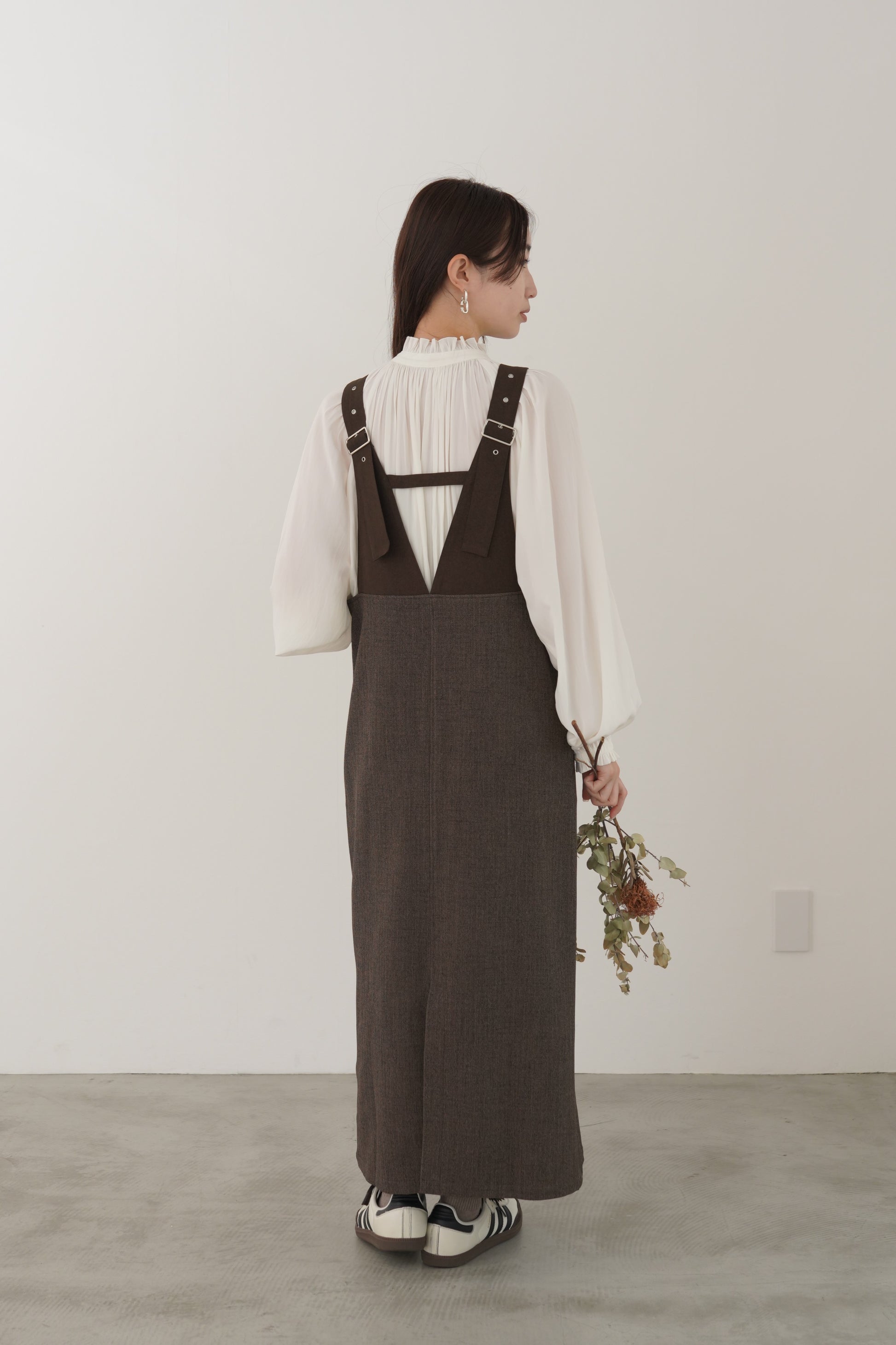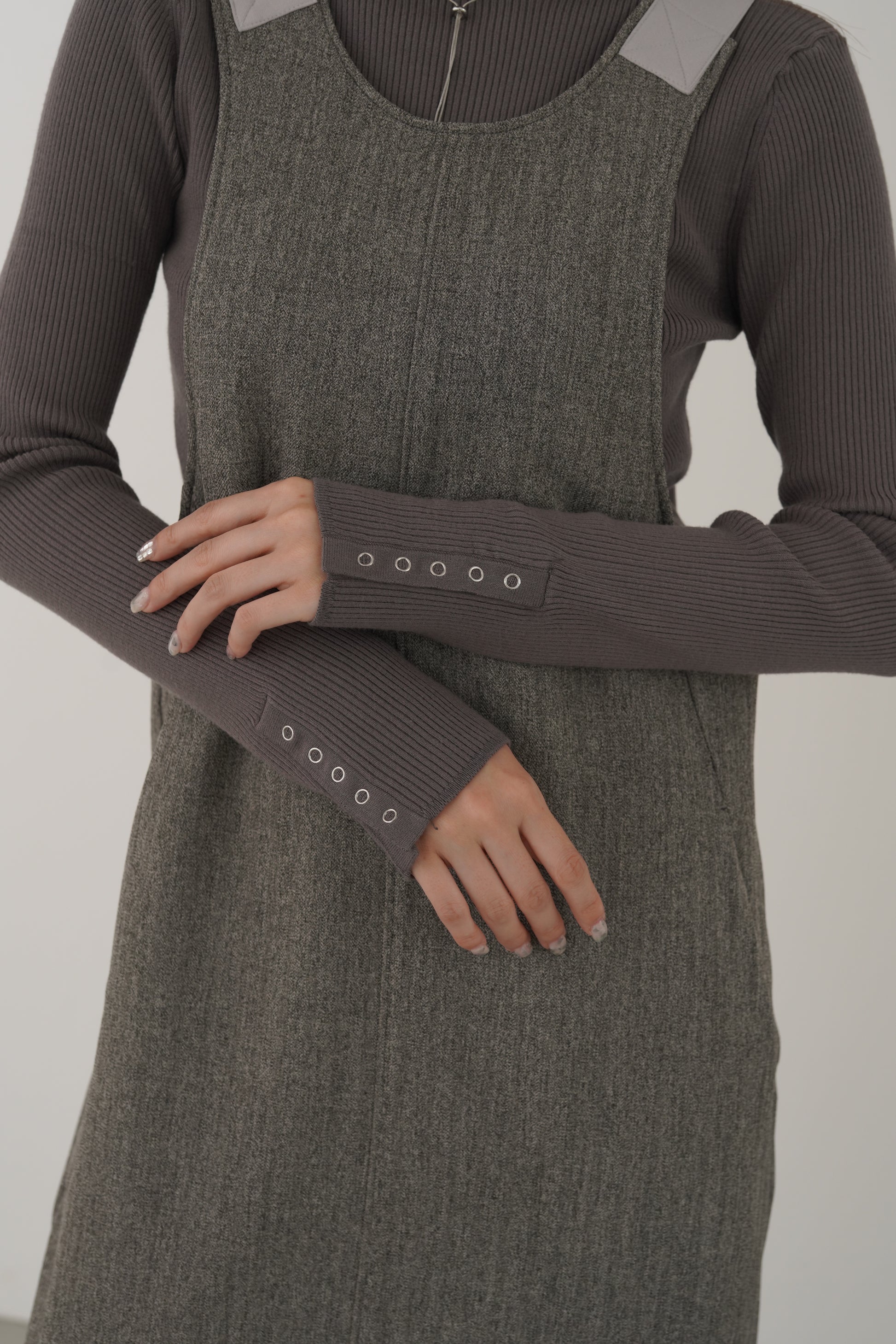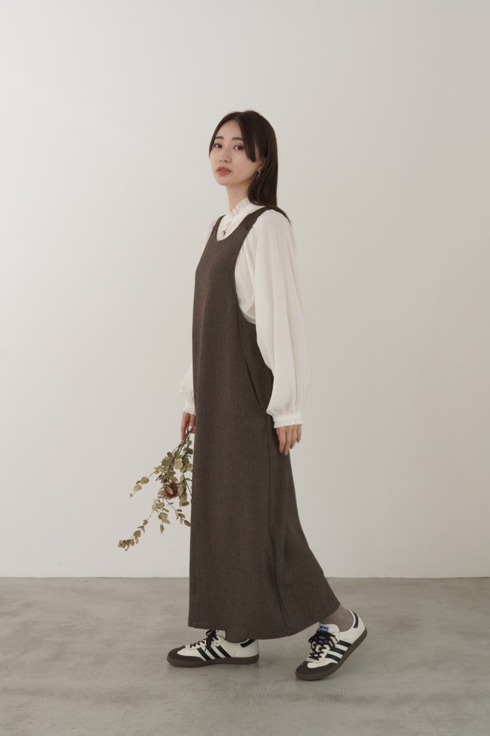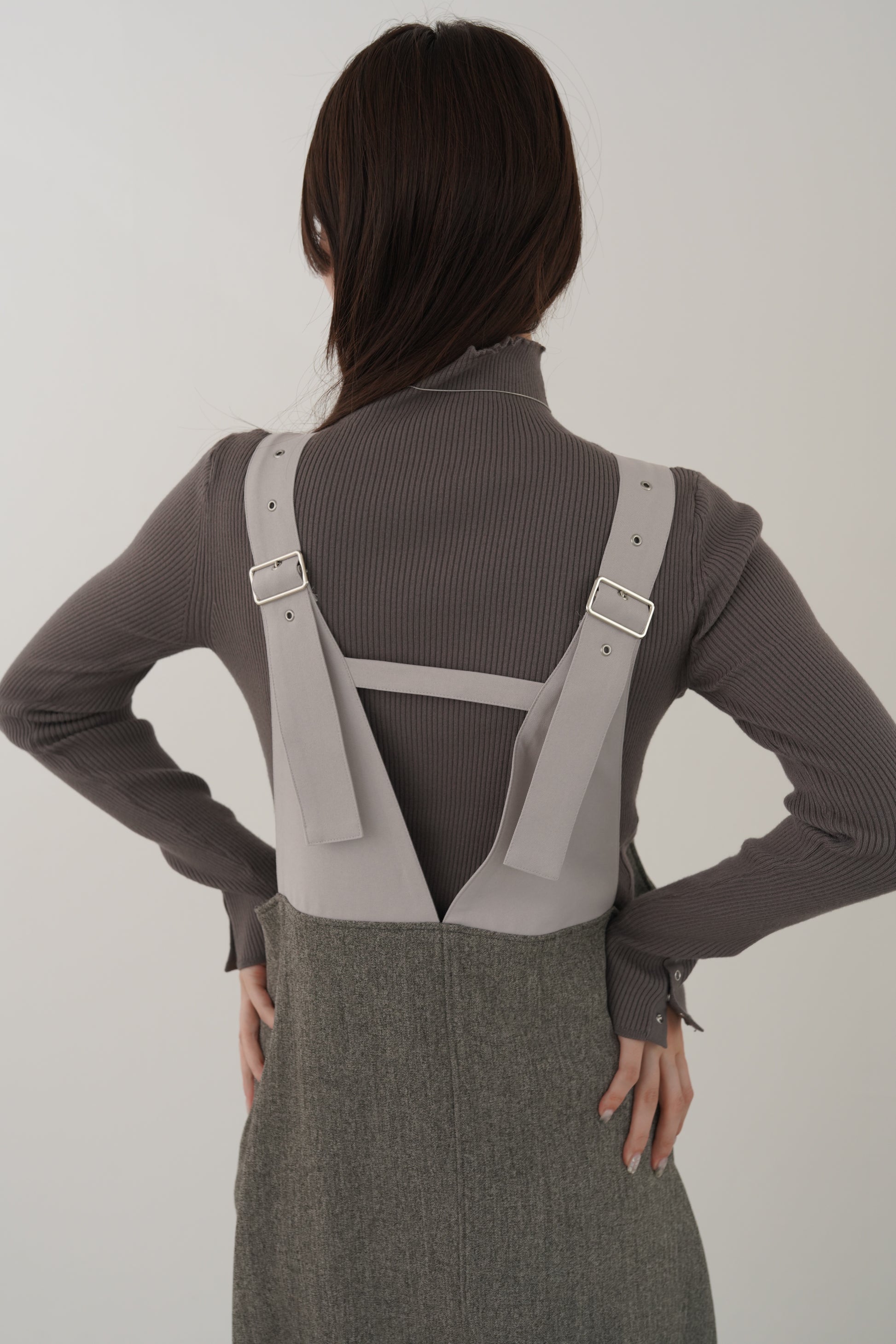 ストレッチの効いたウール調ツイード素材を使用した、ジャンパースカート。Iラインシルエットとアメリカンスリーブが華奢見えを叶えてくれます。異素材で切り替えたバックスタイルもポイント。肩紐で着丈の調節が可能です。