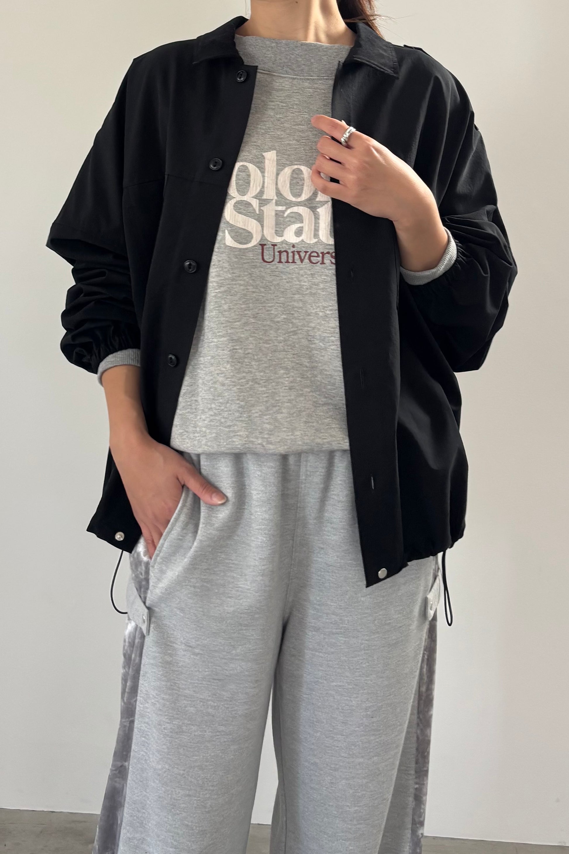 シャツ感覚でラフに羽織れるライトブルゾン。ストレッチ性、撥水性、防しわ性を備えたミニリップストップ素材を使用しています。袖口はたくし上げやすいゴム仕様、裾にはドローコードが付いており、身頃のボリューム感を調節可能です。同色のコーデュロイの衿元もポイント。